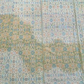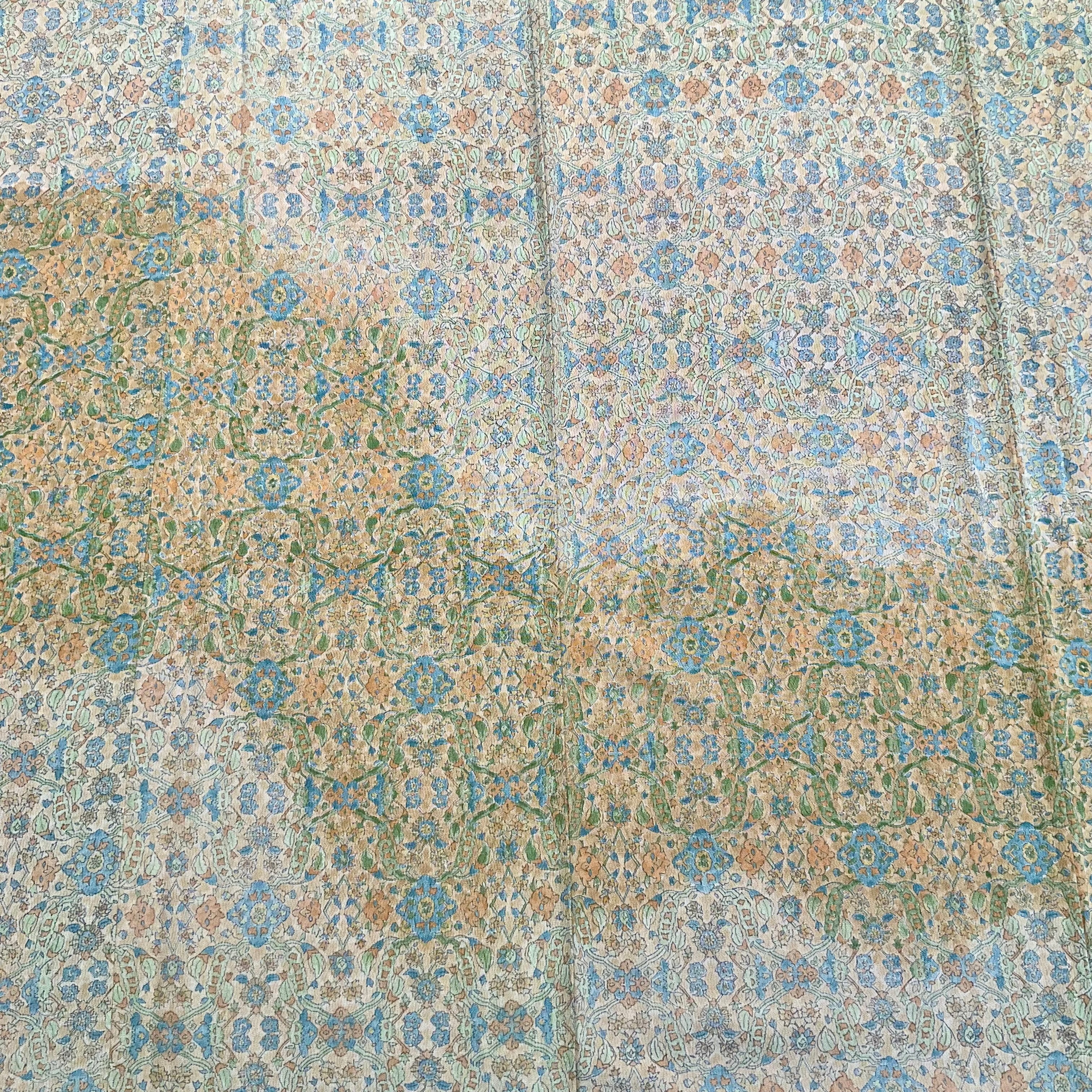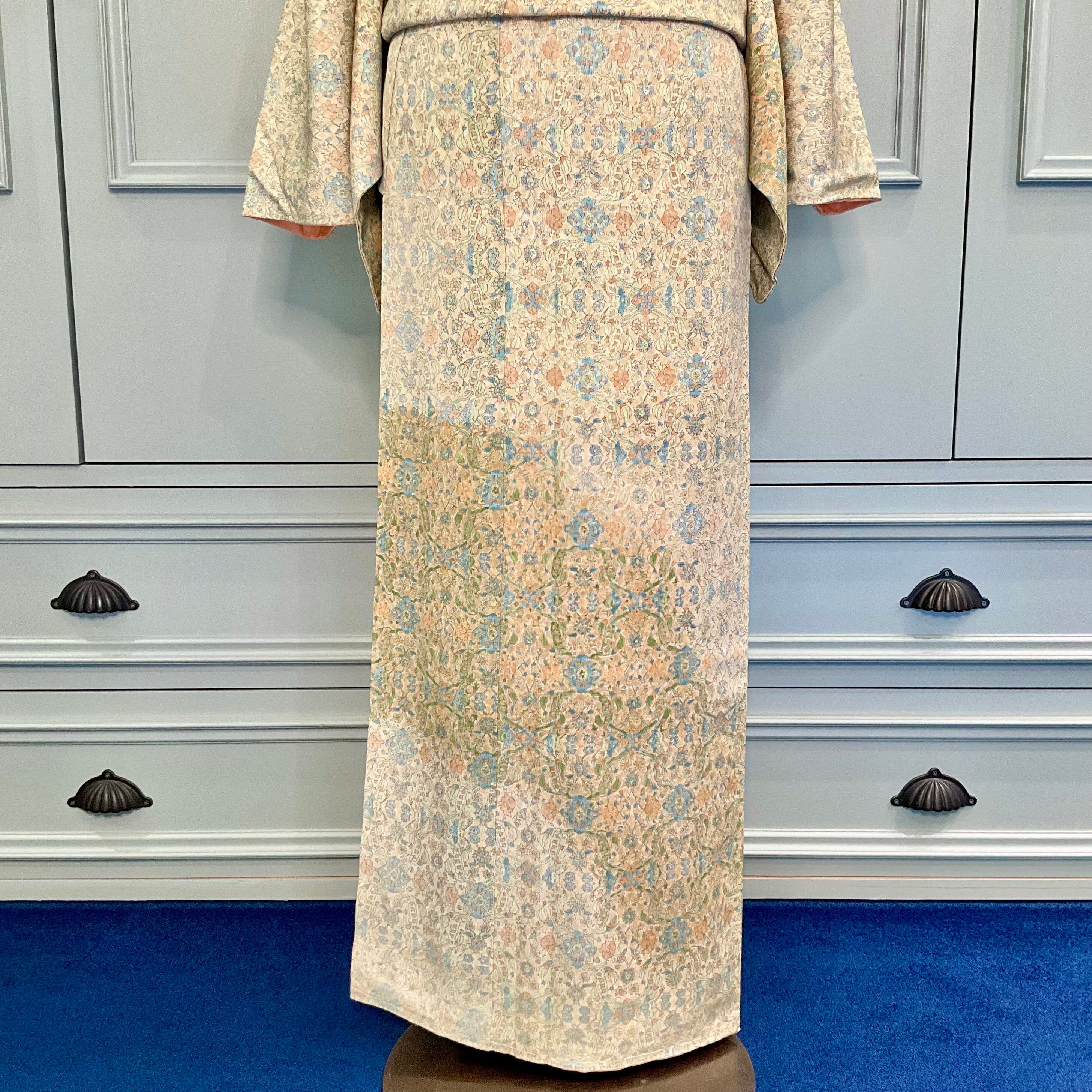更紗花影*未使用品 ワイド 身幅広め 更紗 小花 縮緬 ベージュ ブルー カジュアル付下げ小紋着物 B507