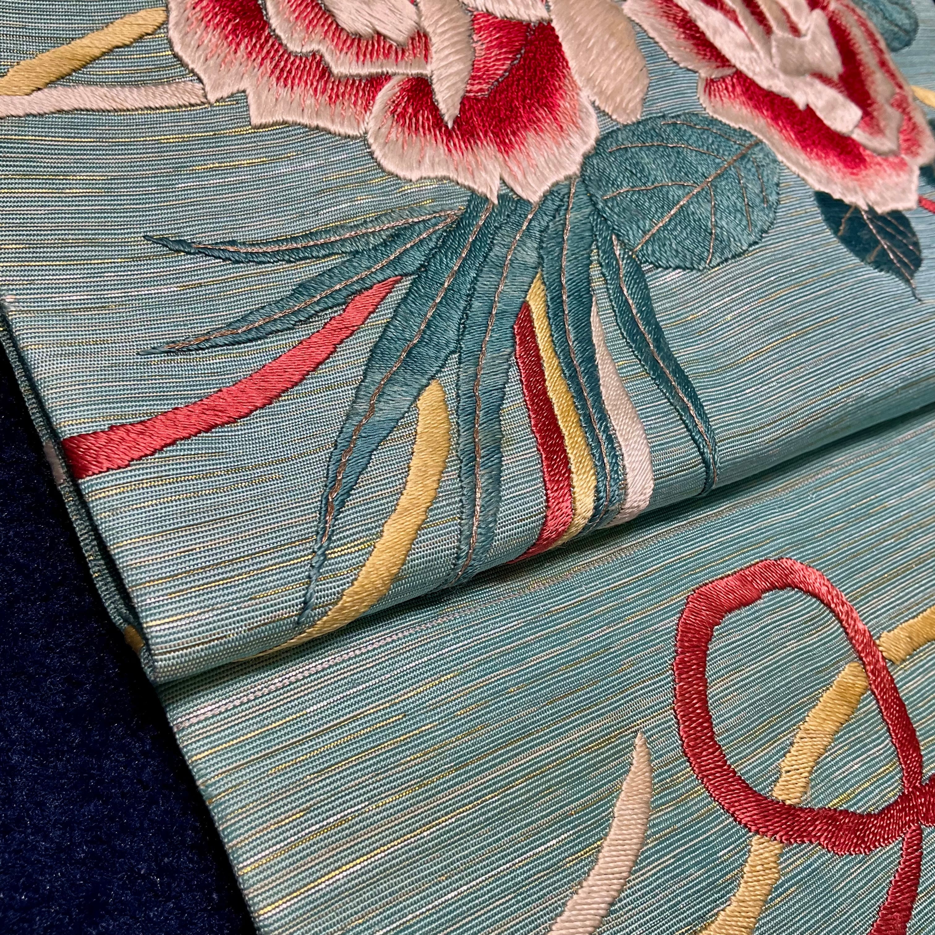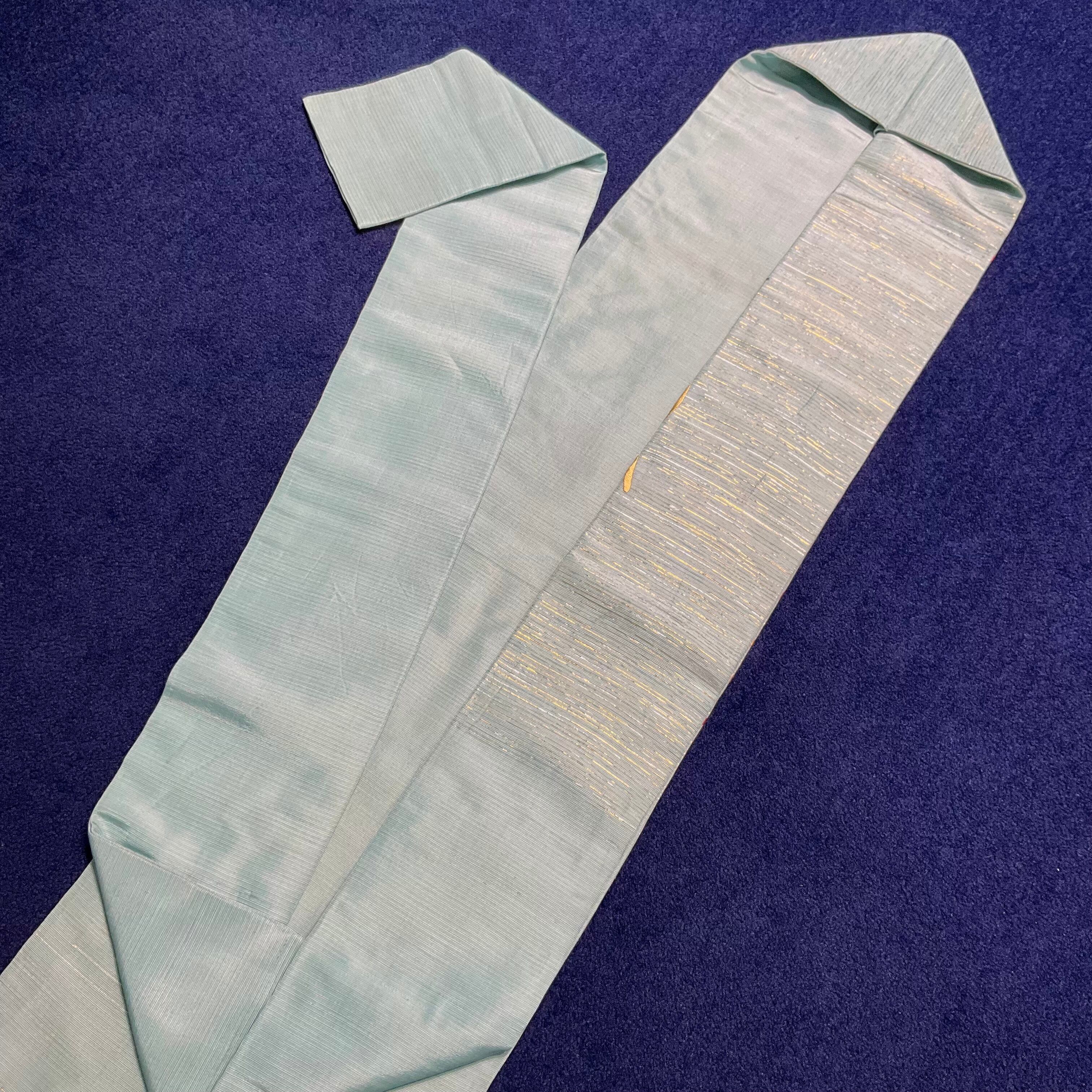 金糸と銀糸が織りまぜられた浅葱色の地色が