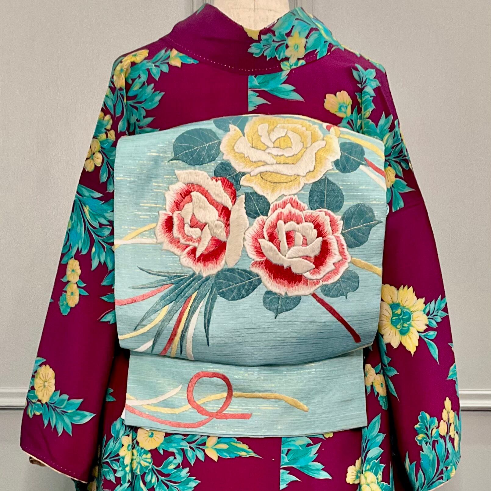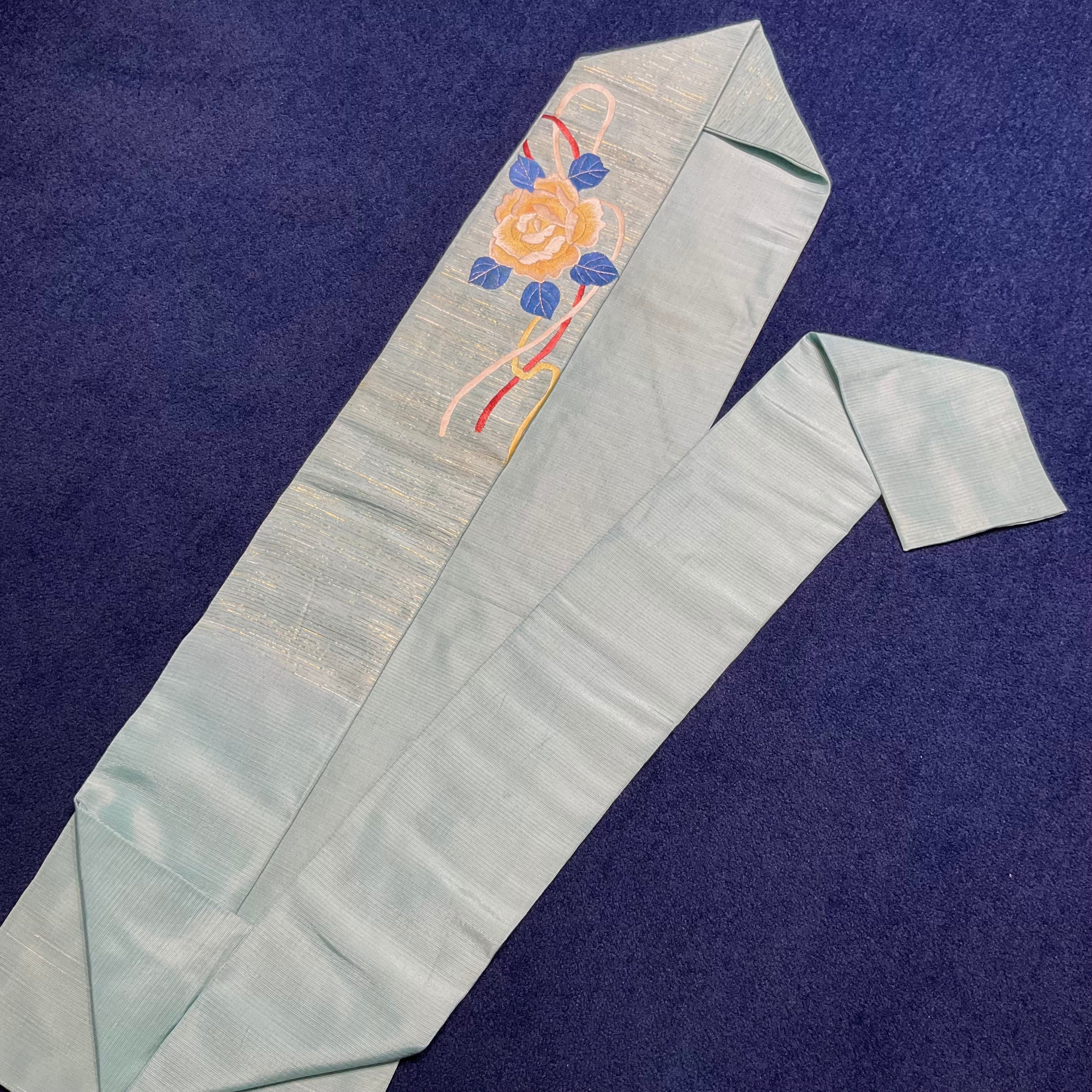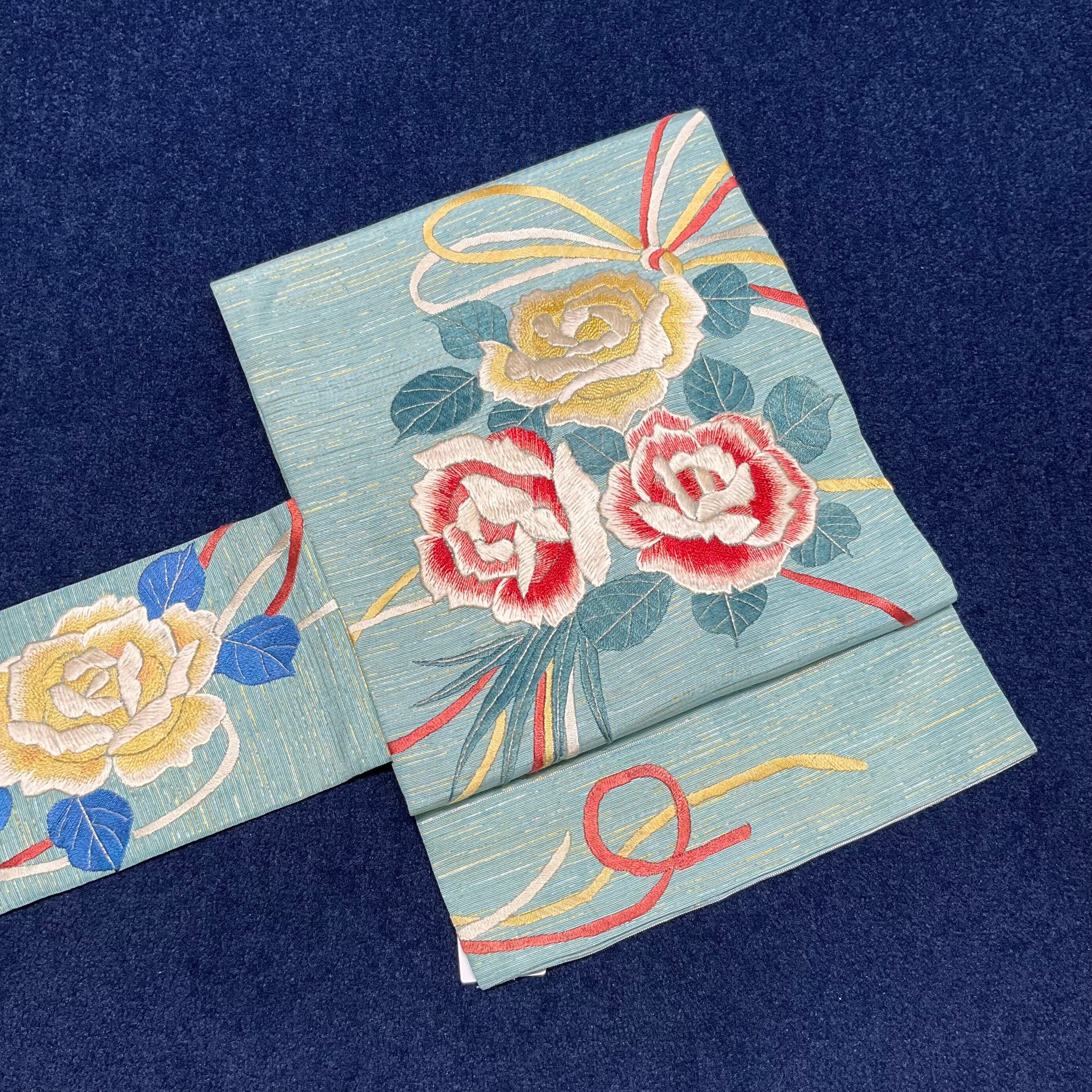 やさしい水色地に、大きな黄色と紅い薔薇の刺繍が美しいアンティーク名古屋帯です