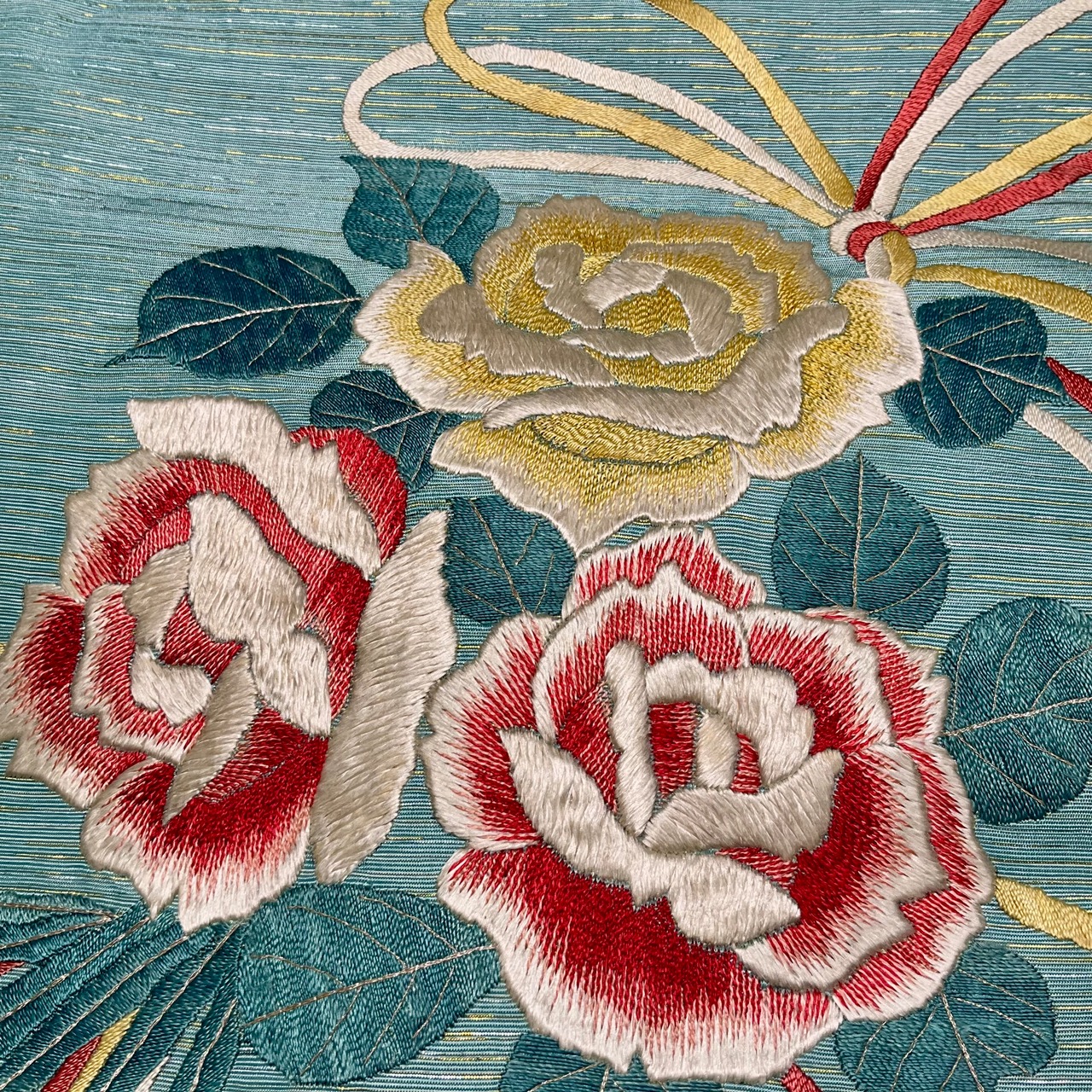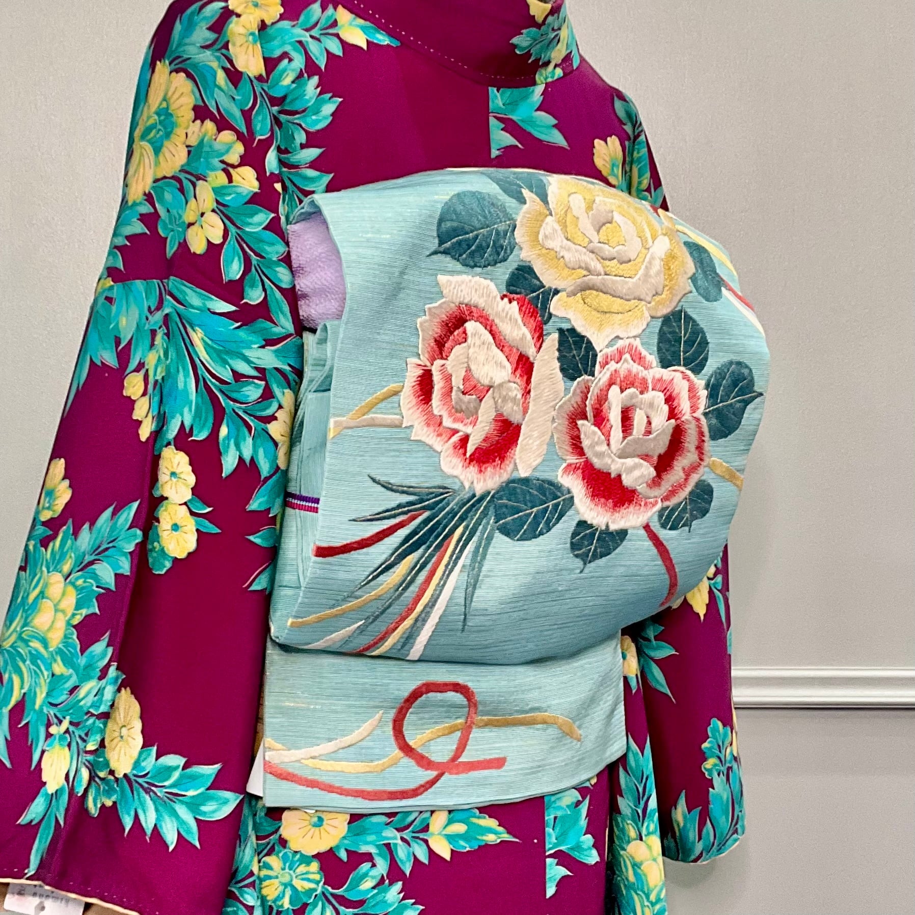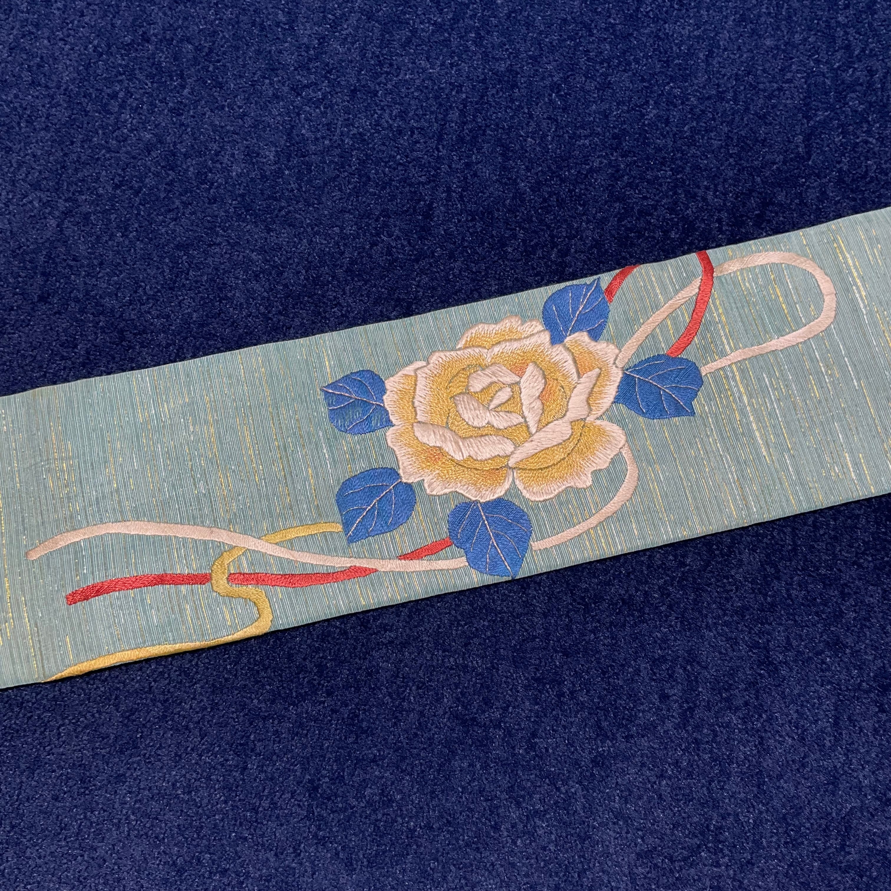 やさしい水色地に、大きな黄色と紅い薔薇の刺繍が美しいアンティーク名古屋帯です