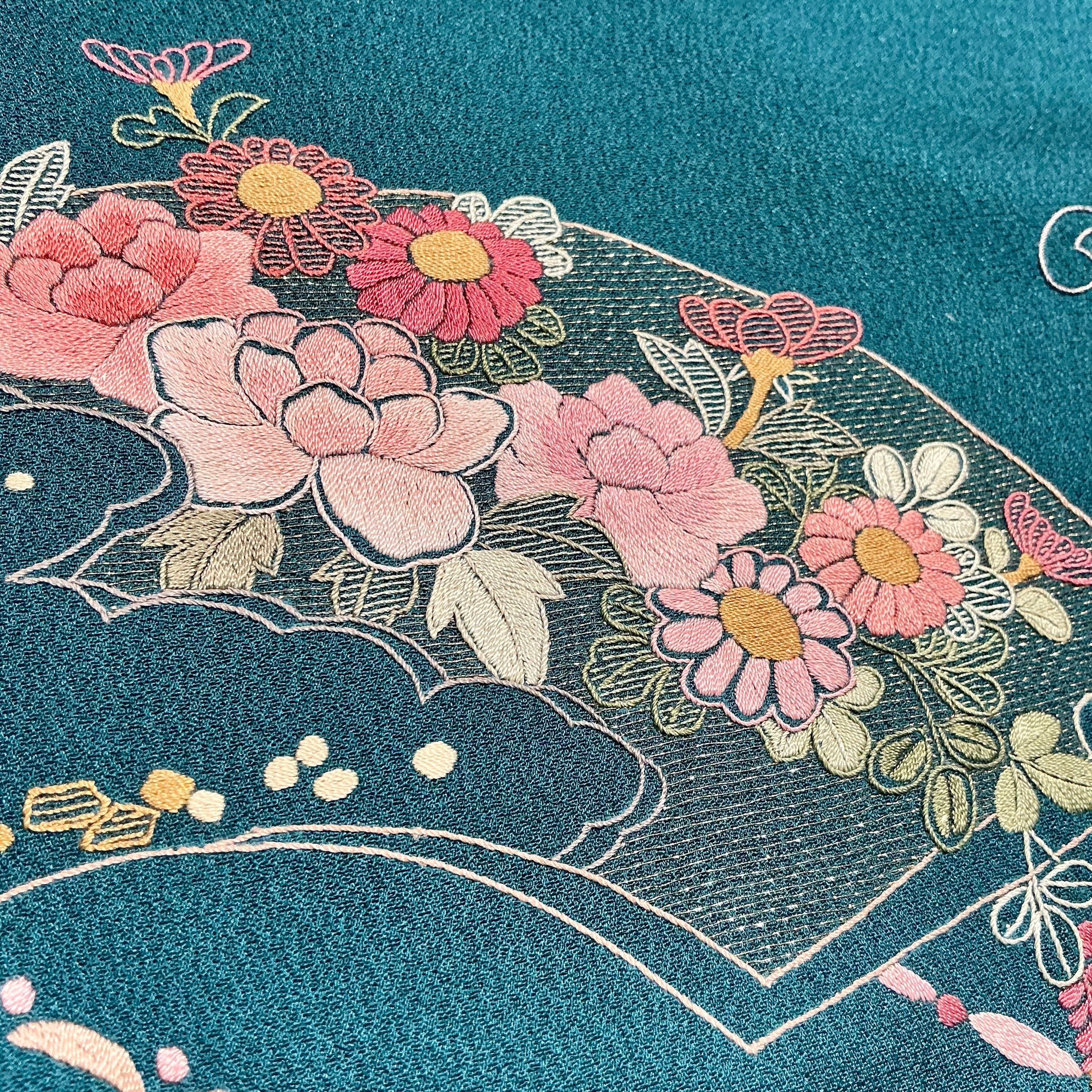 身頃から裾にかけて、扇面や熨斗を思わせるデザインに優美な流線や牡丹、菊、小花などの花々