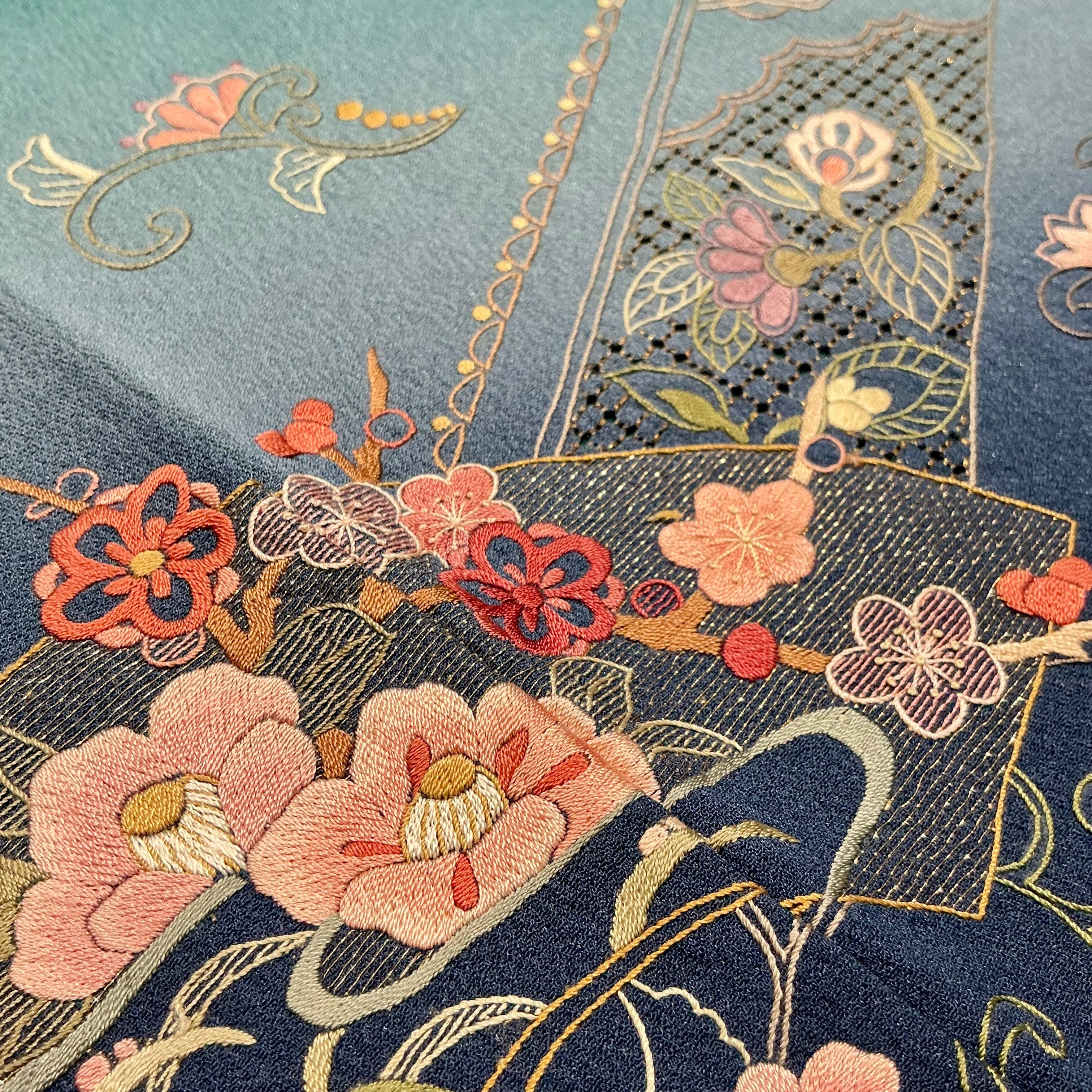 地色の深碧から紺青へのグラデーションも刺繍との掛け合わせで、気品漂う美しさ✨️
