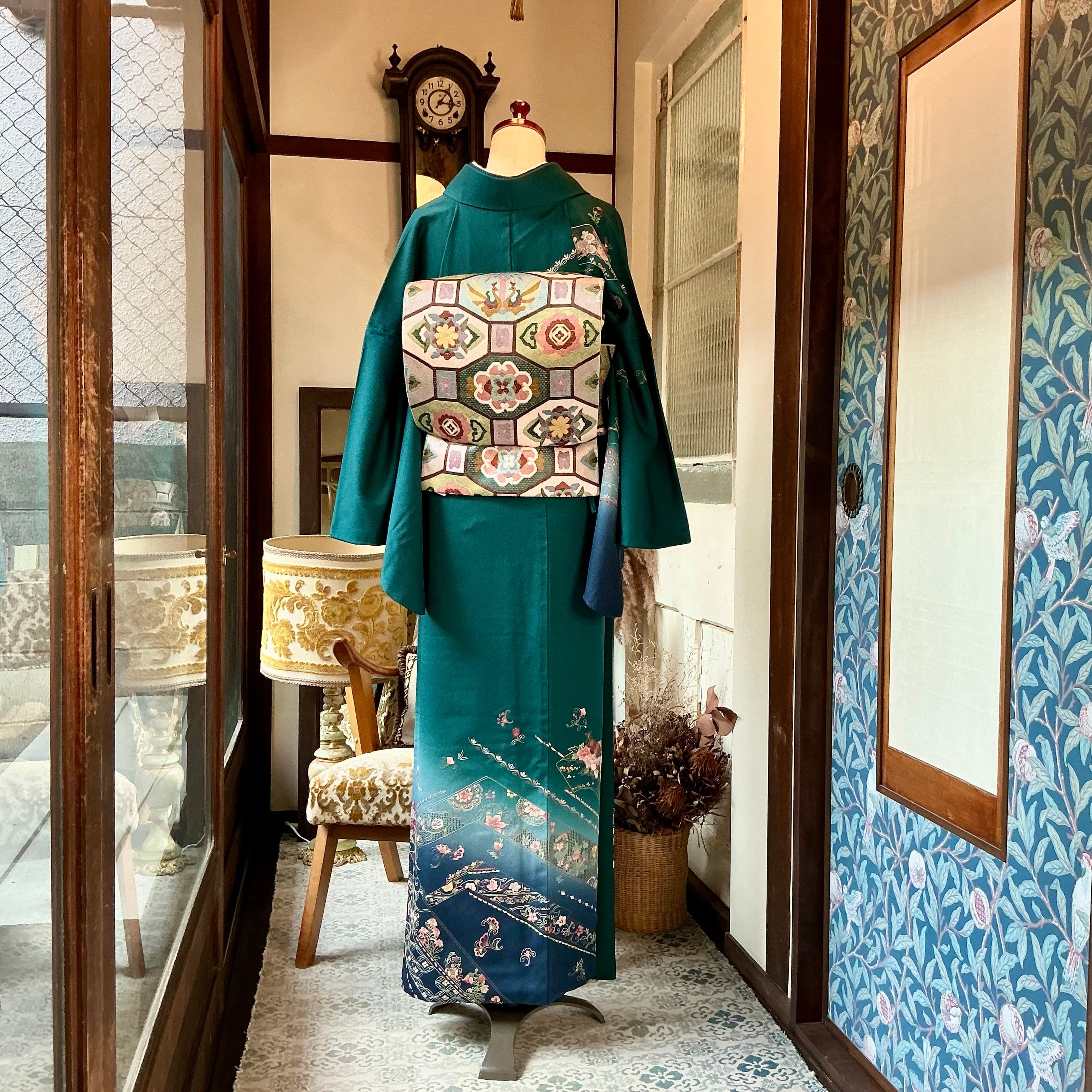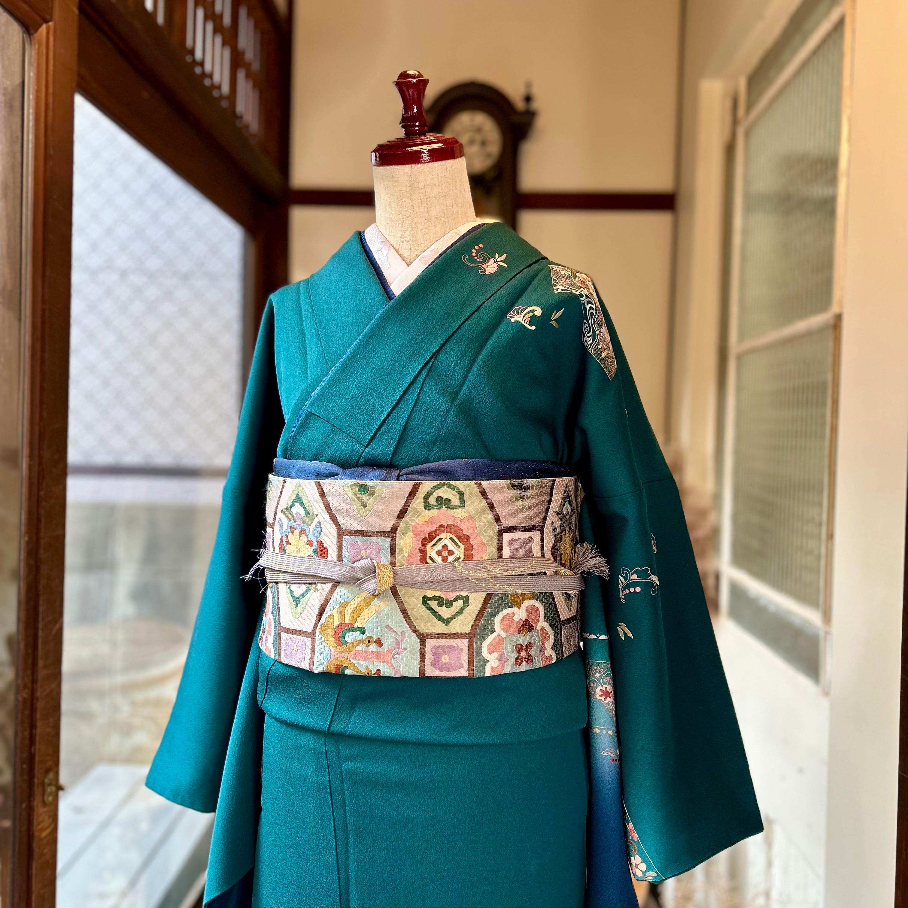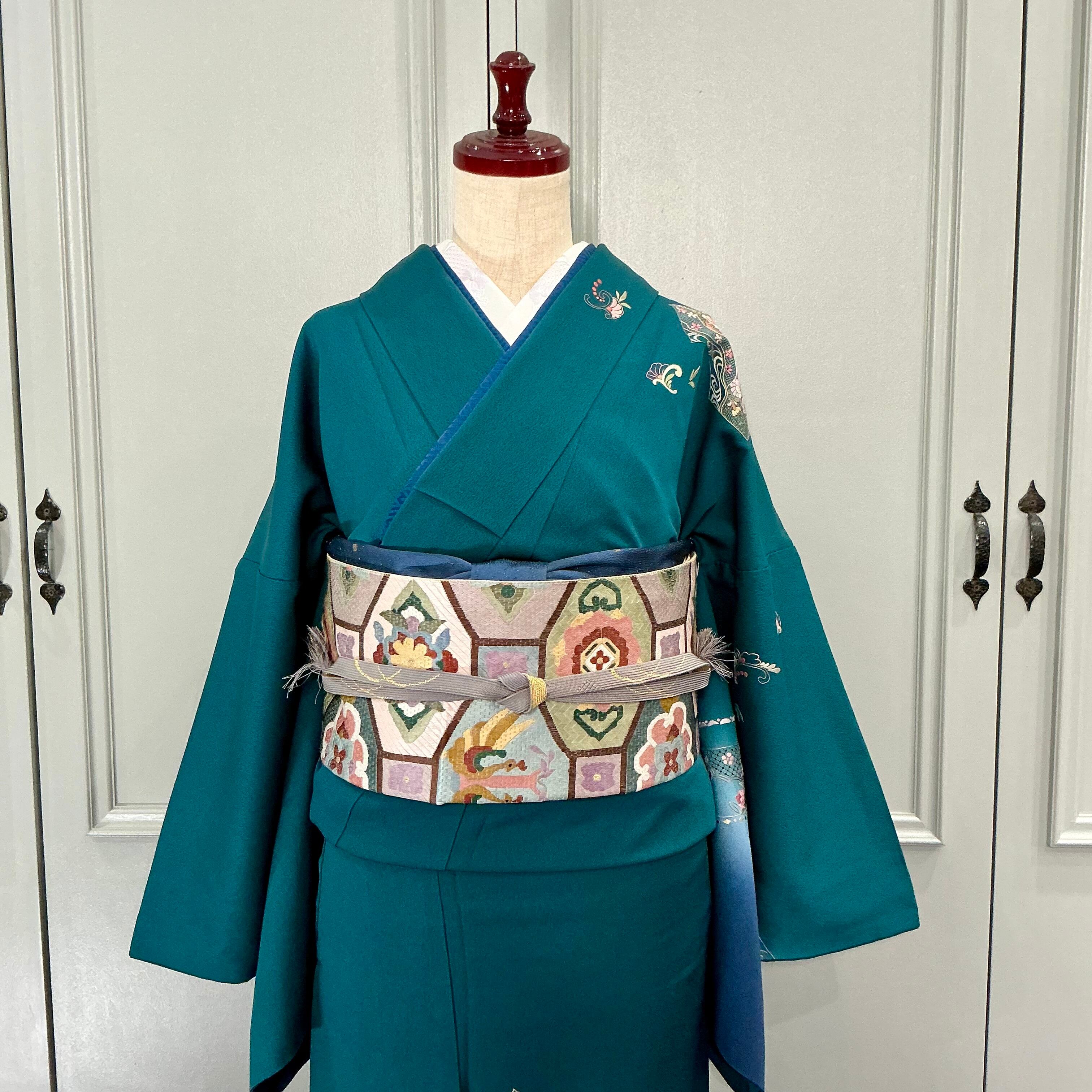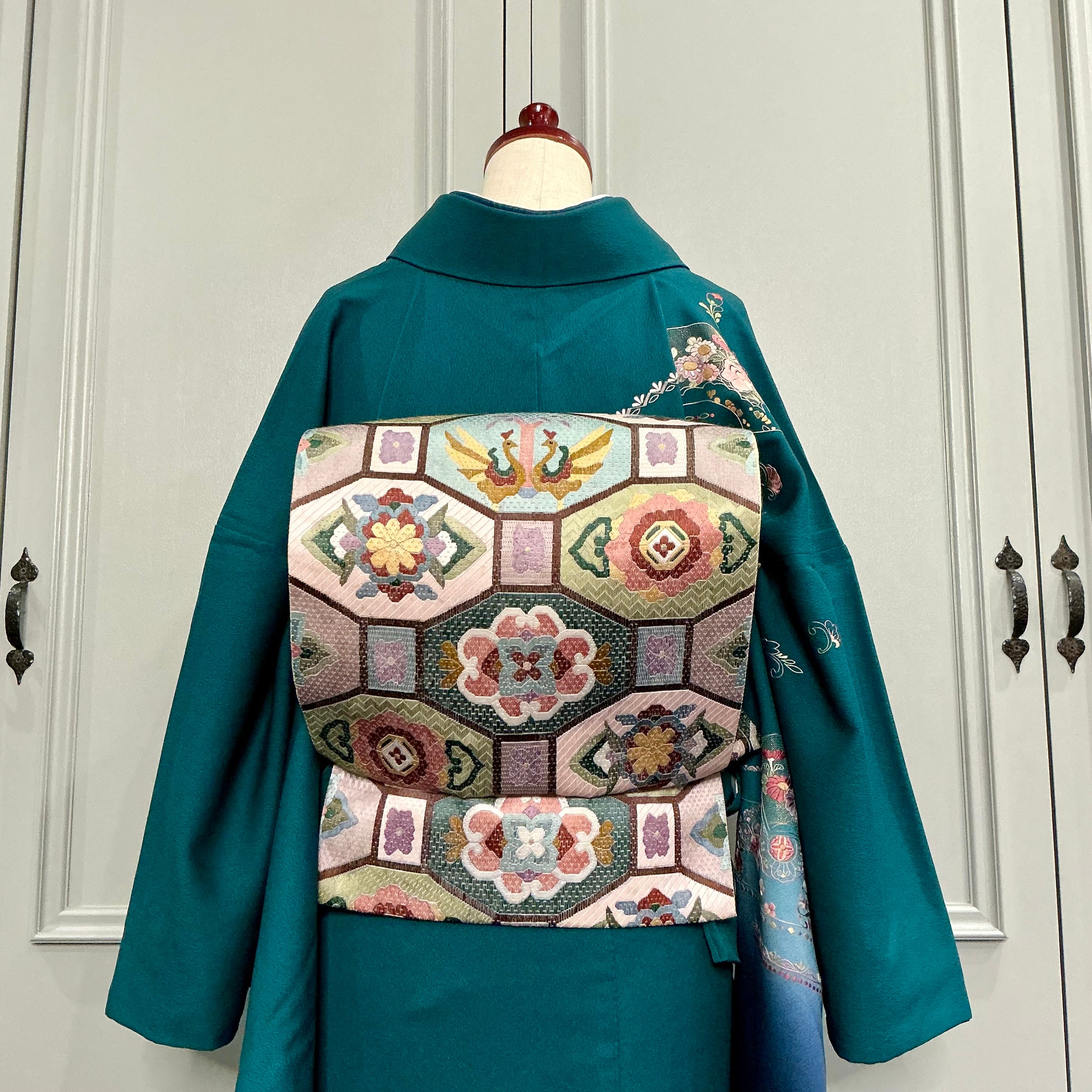 淡い藤色、薄緑、深緑、くすみ桃、水色を基調とした配色は主張しすぎず着物に馴染み