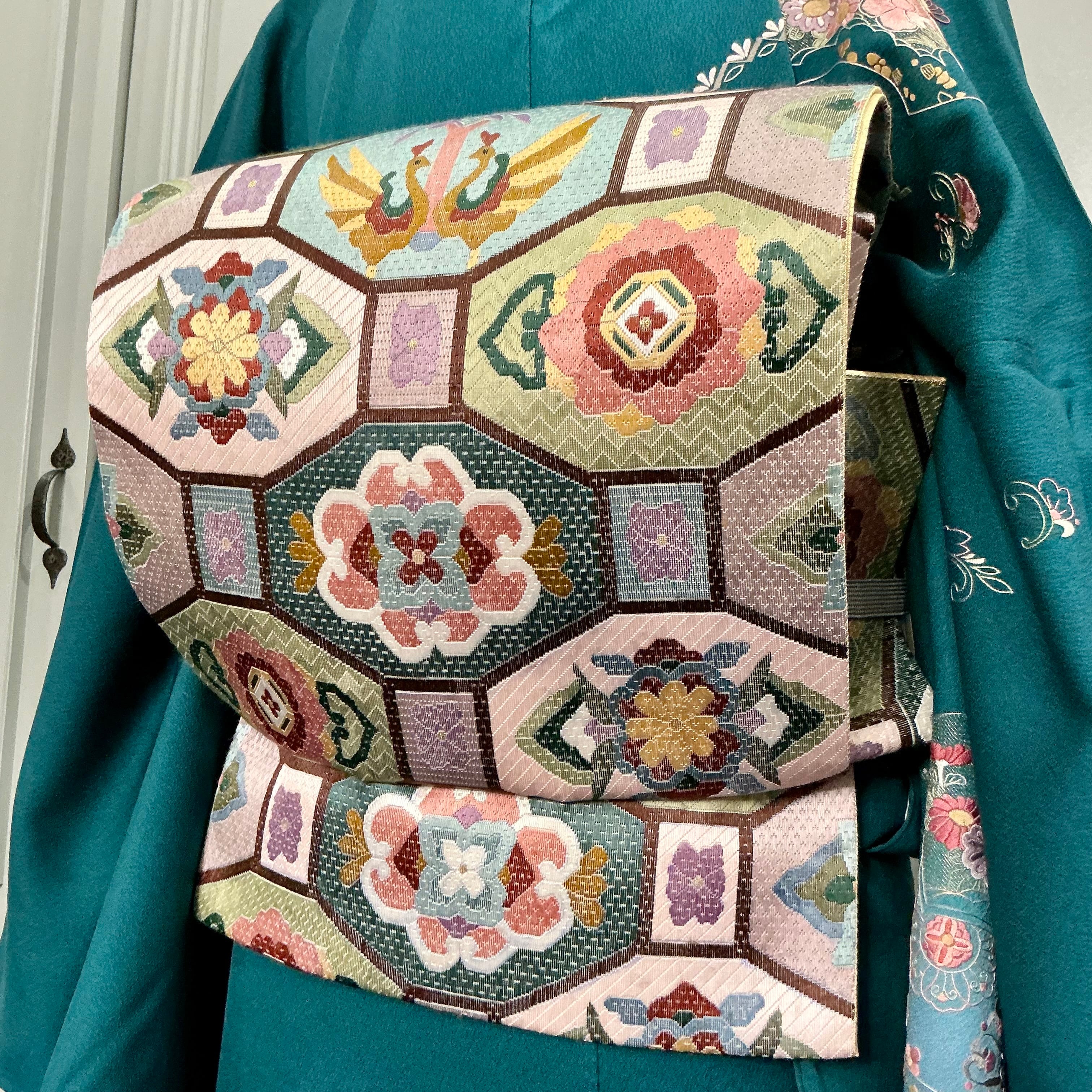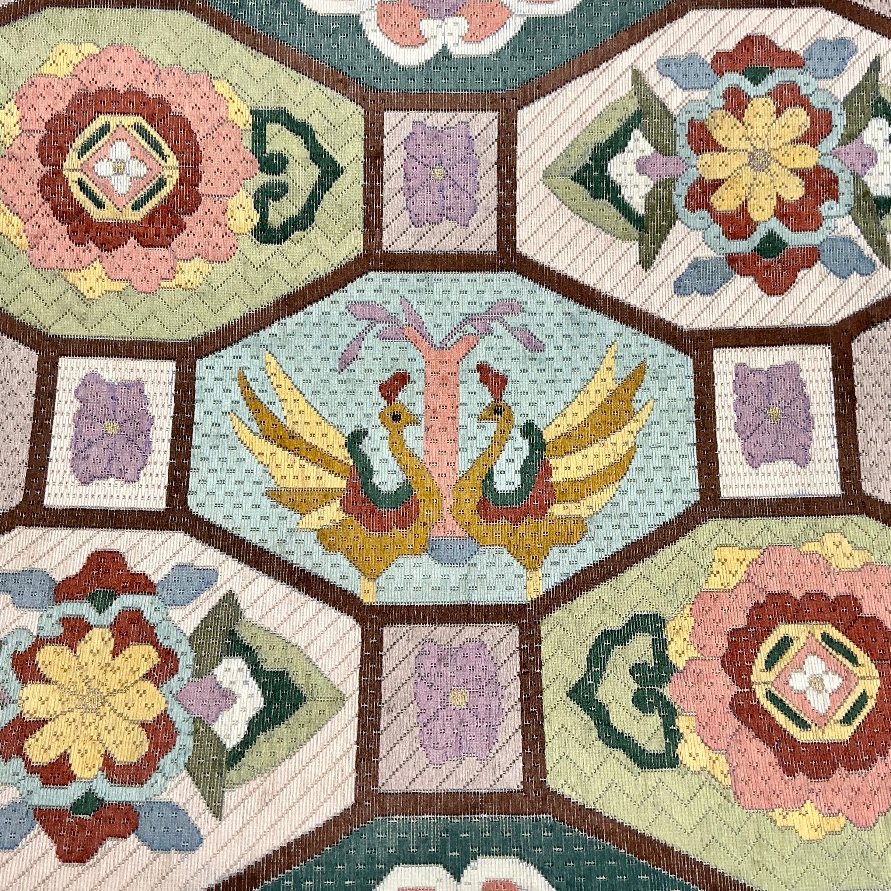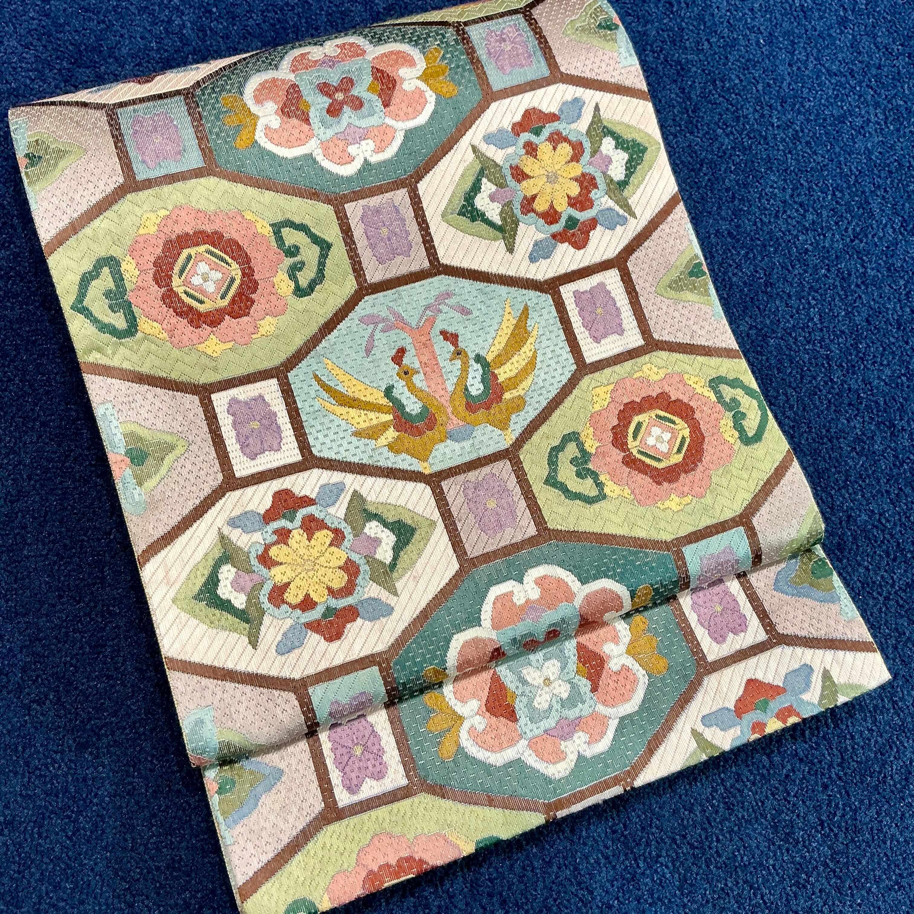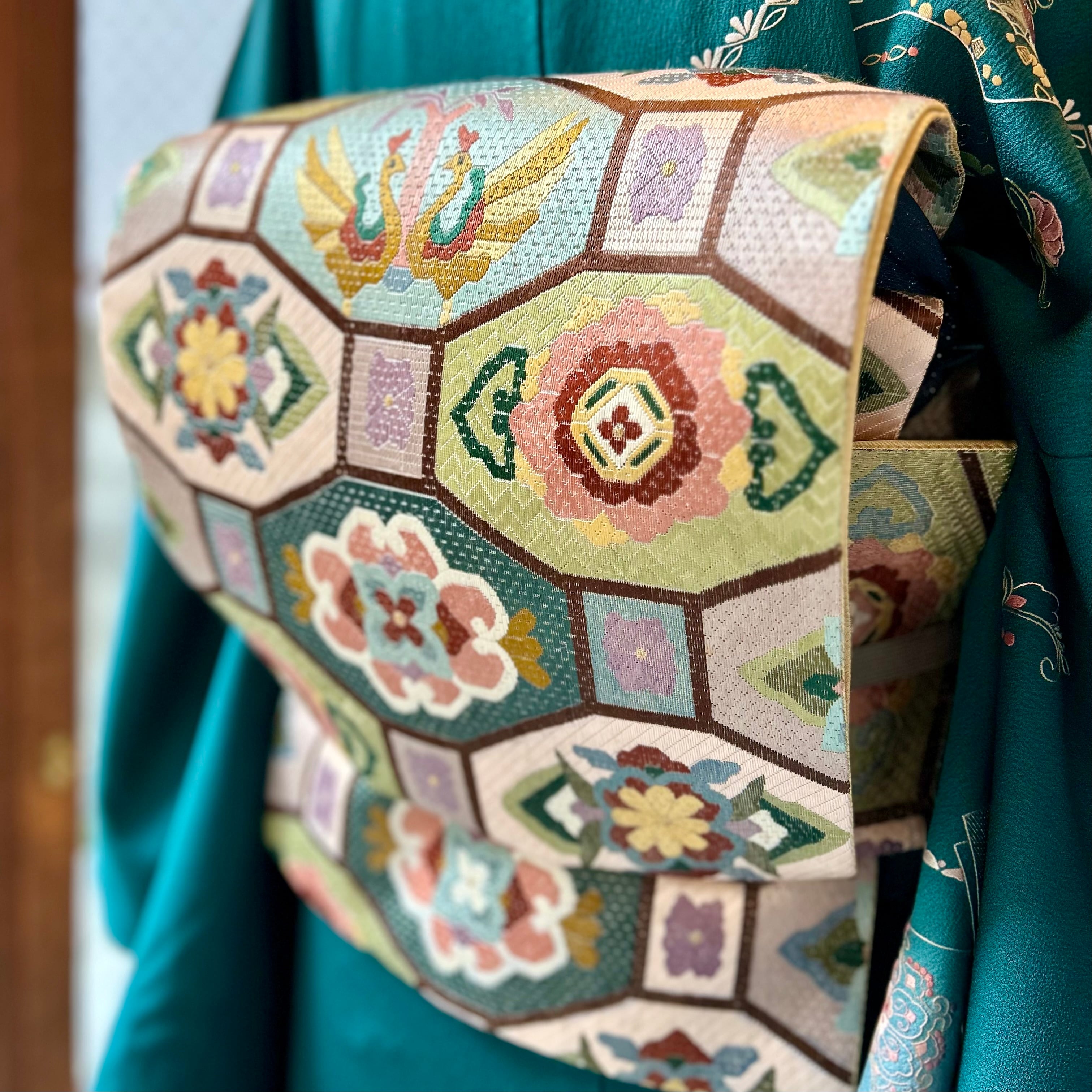 六角の枠の中には、花菱や宝相華、向かい合う瑞鳥♡古典の吉祥文様でありながらも、色合いが今っぽくモダンで、どこか愛らしさと軽やかさを感じさせますね