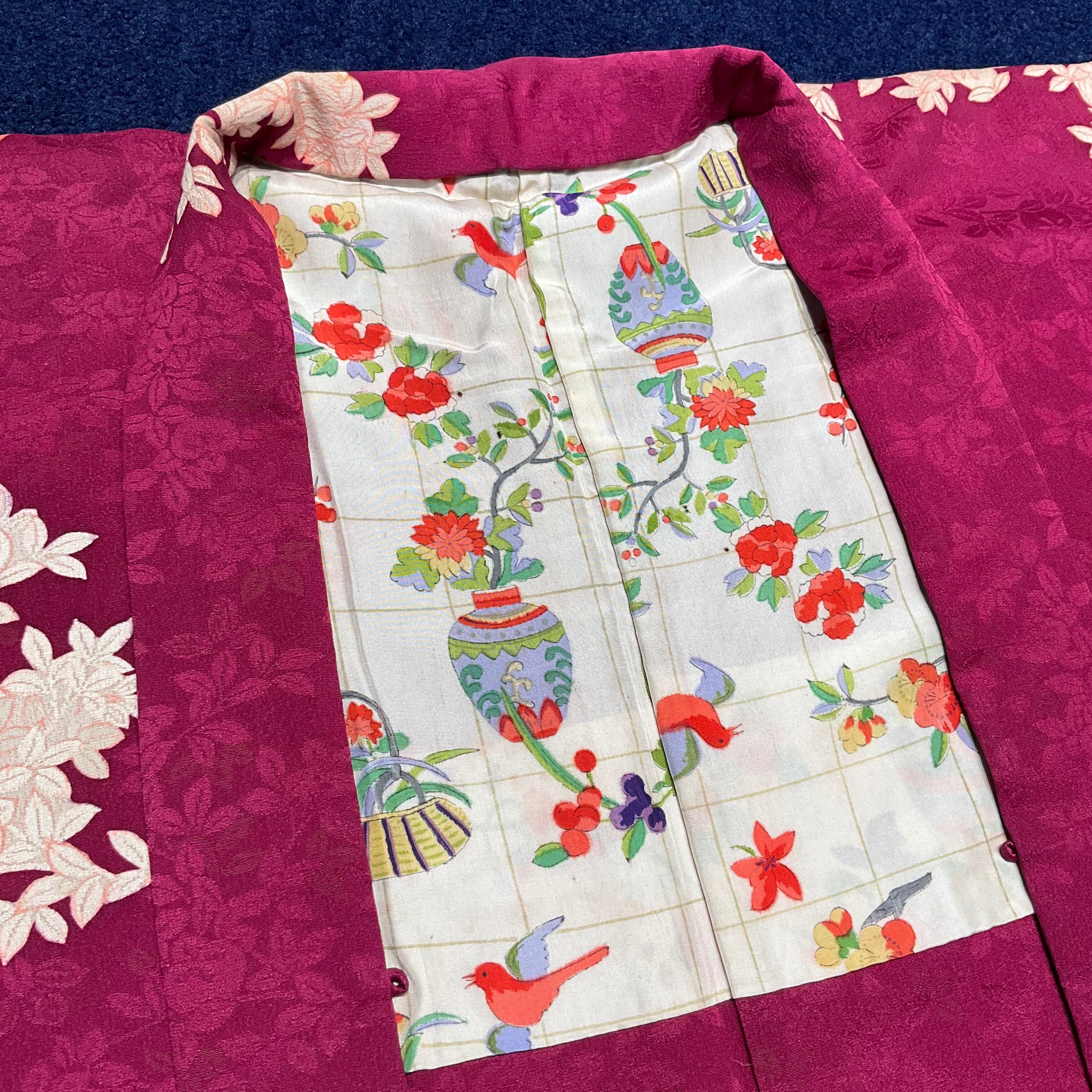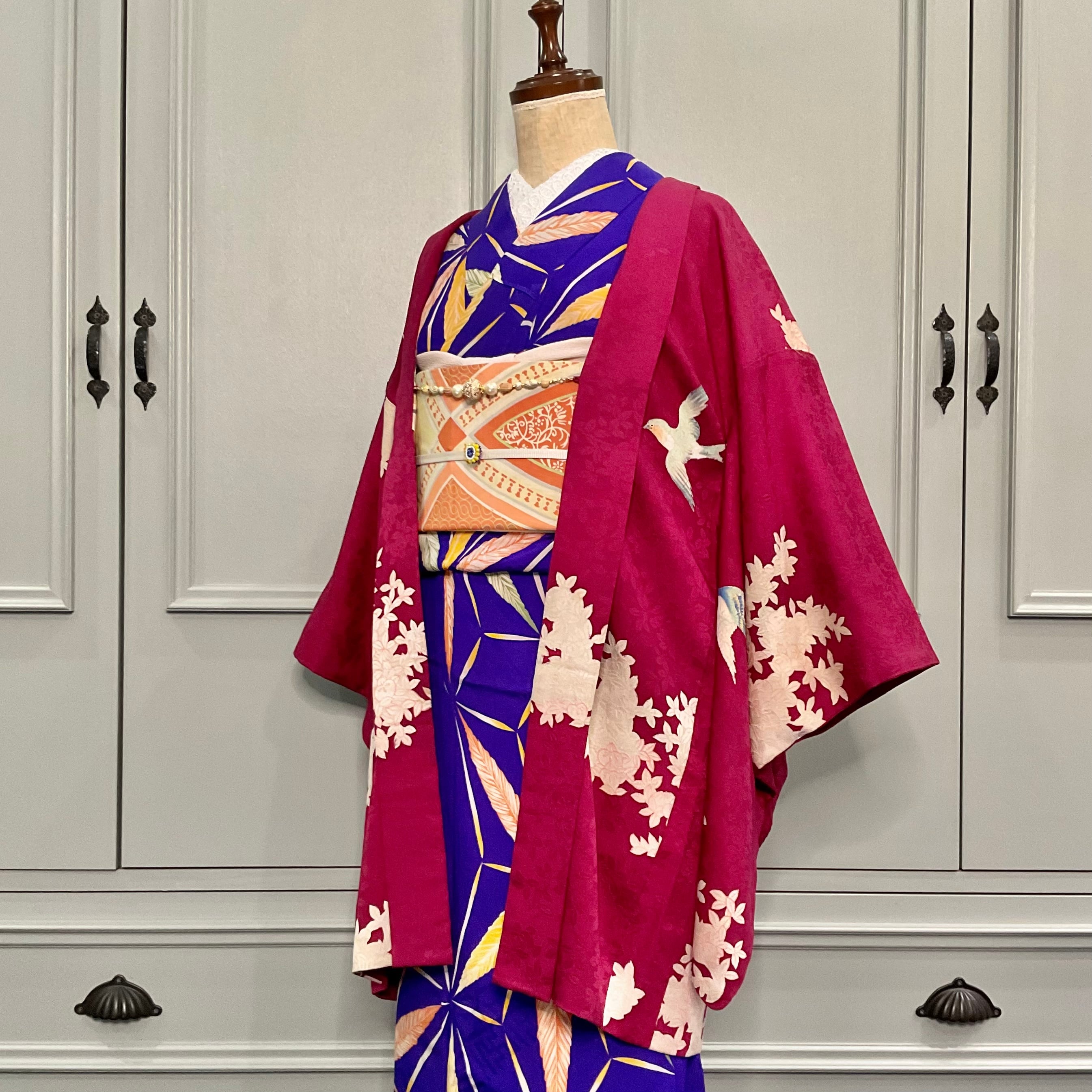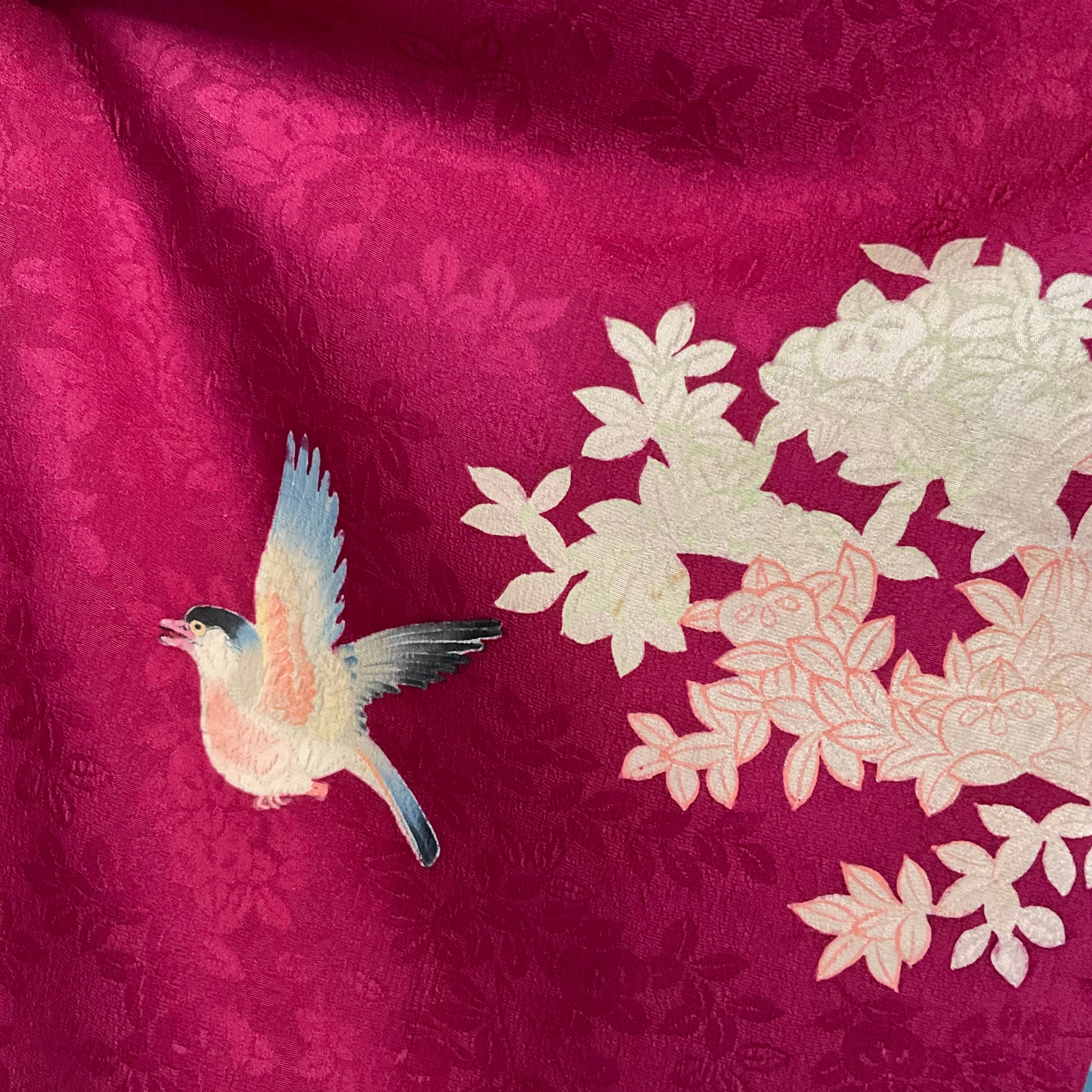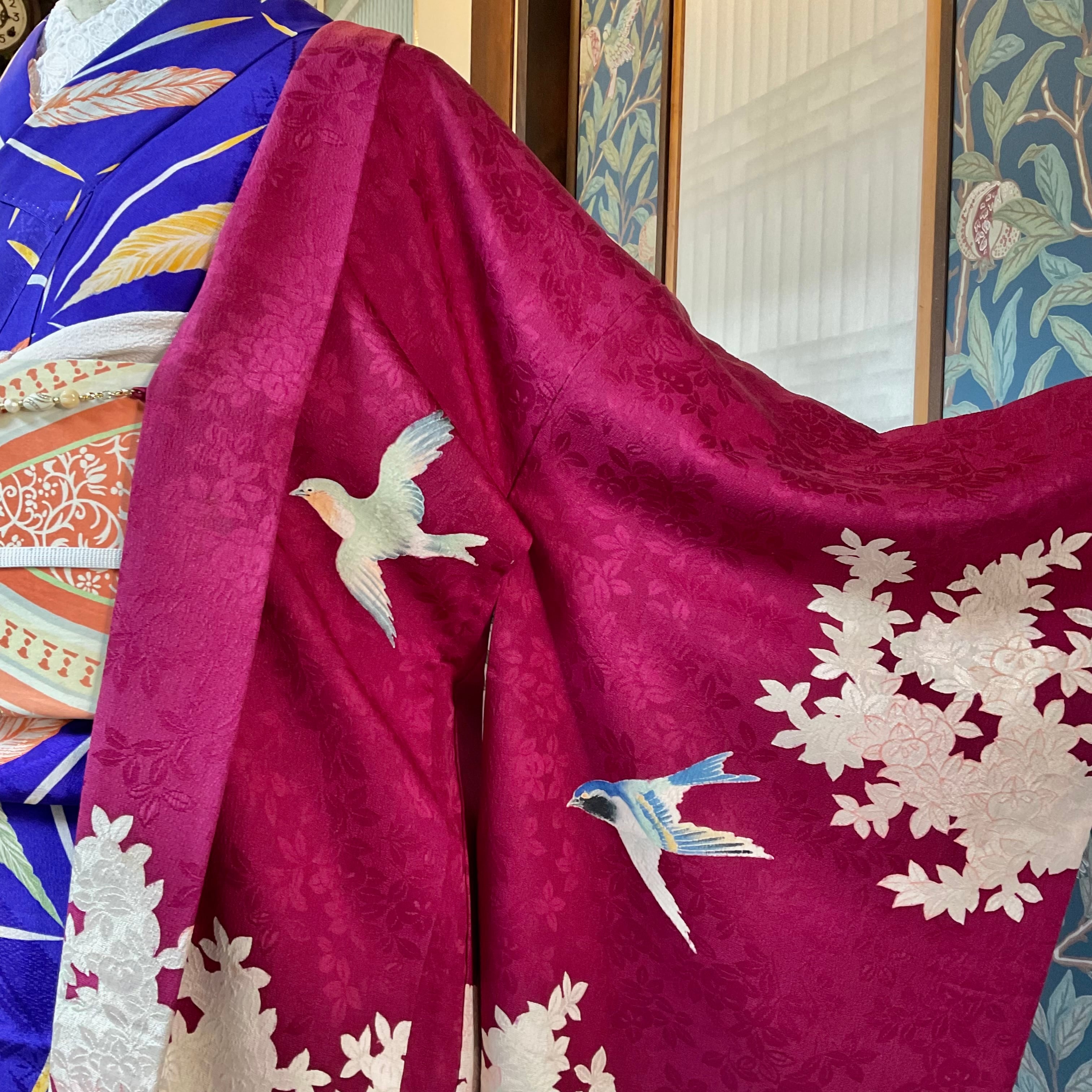 紅に夢見鳥*白橘 立花 深紅 真紅 臙脂 ローズレッド ラズベリーレッド ワイン ボルドー 赤 紅白 アンティーク長羽織 B523