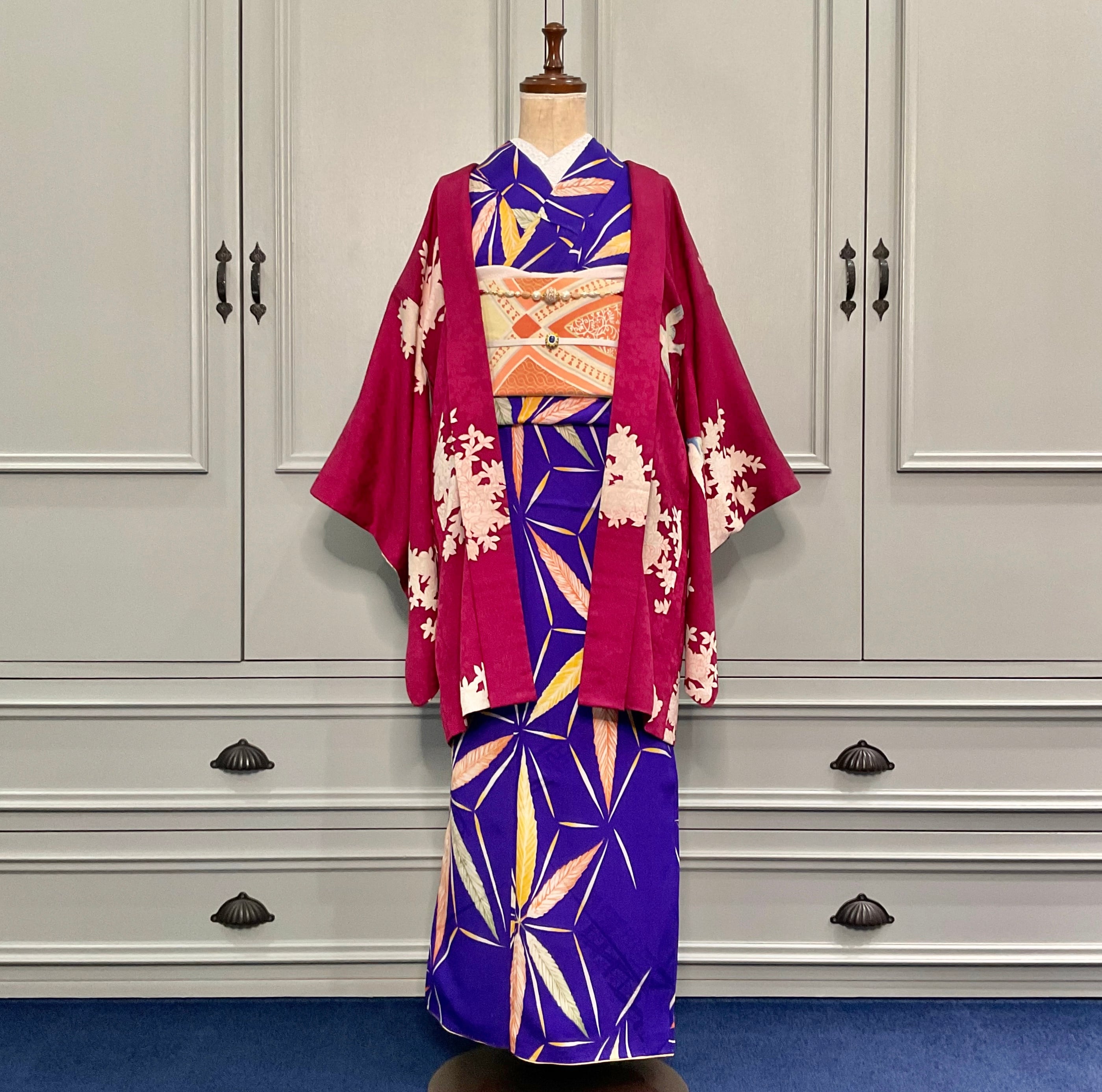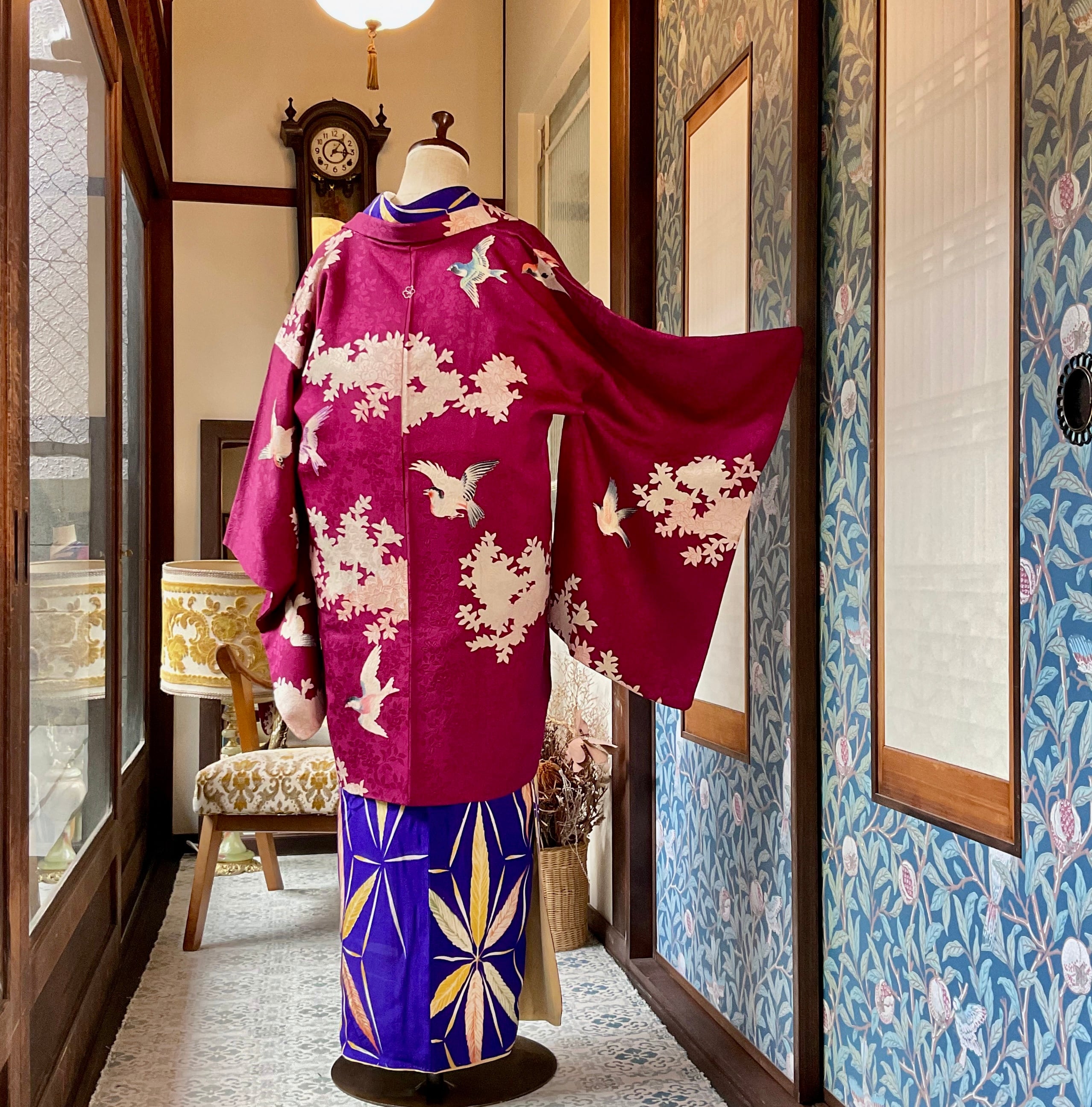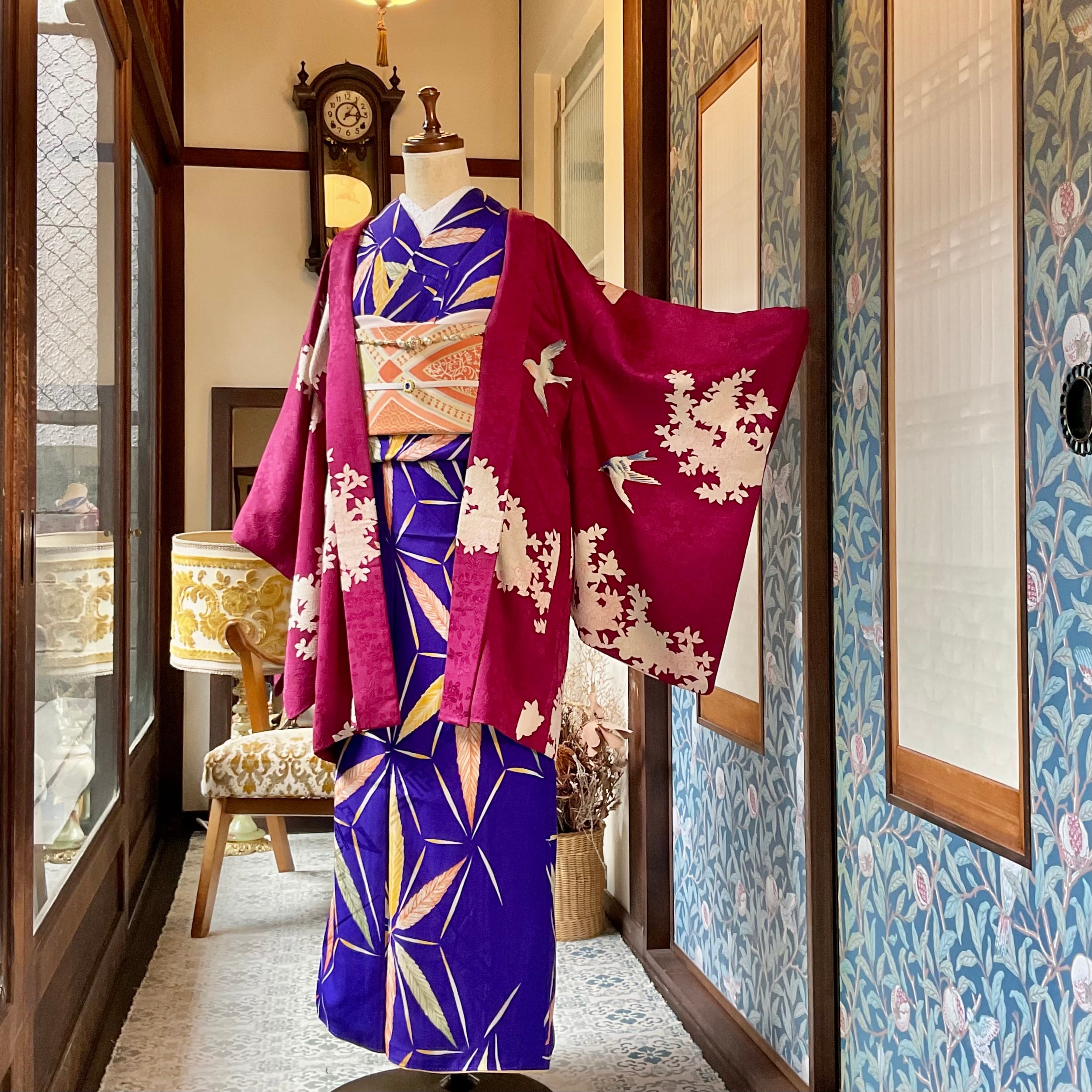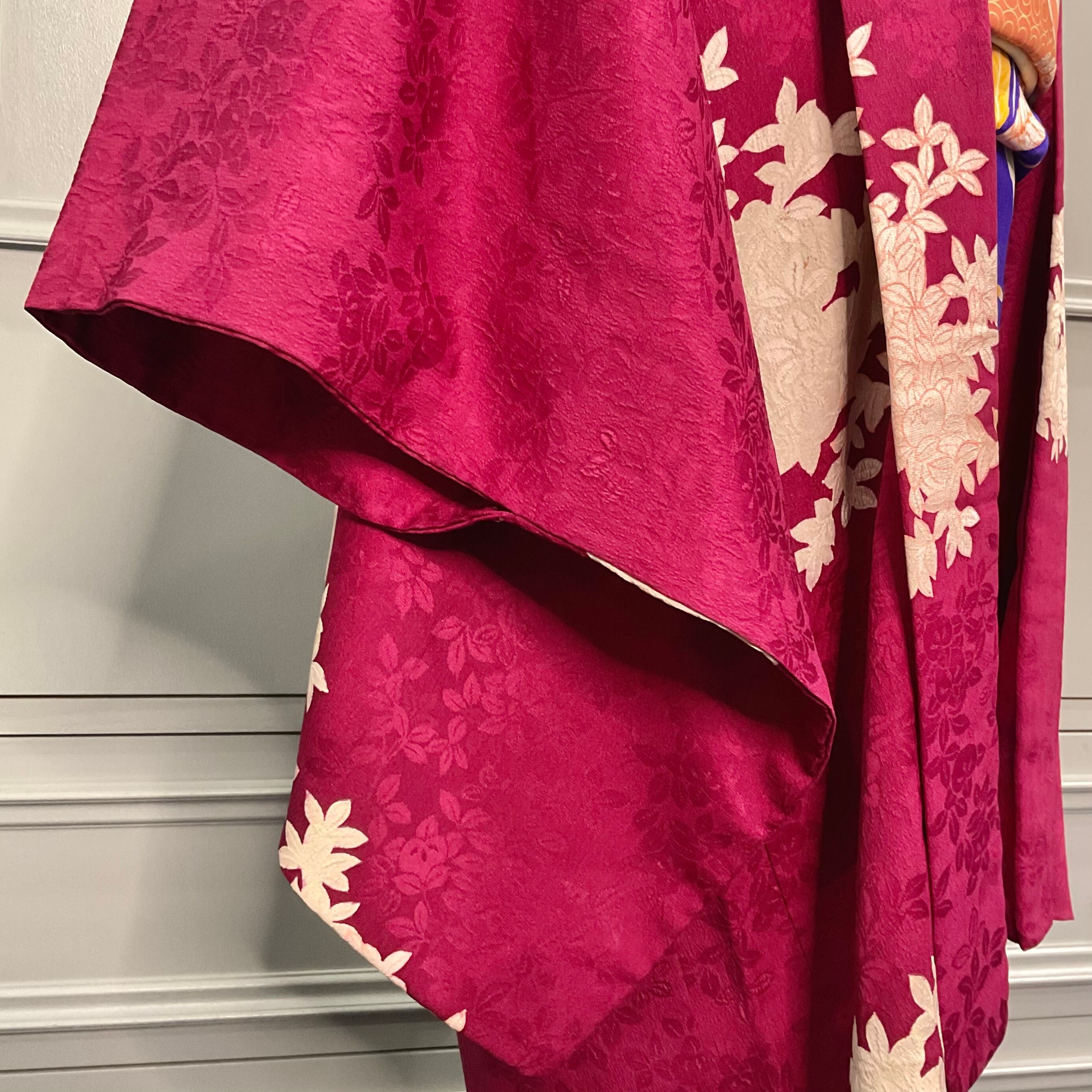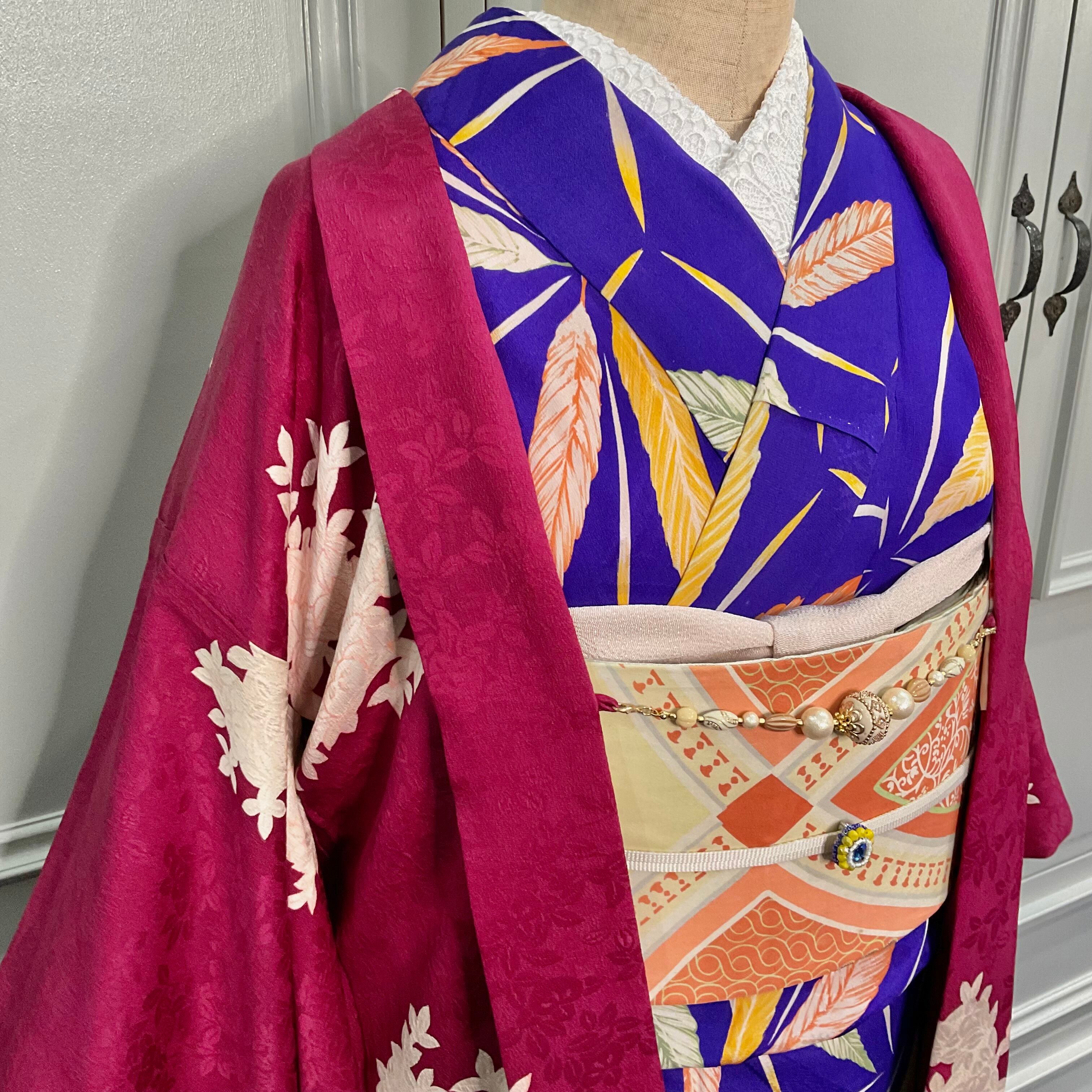 紅に夢見鳥*白橘 立花 深紅 真紅 臙脂 ローズレッド ラズベリーレッド ワイン ボルドー 赤 紅白 アンティーク長羽織 B523