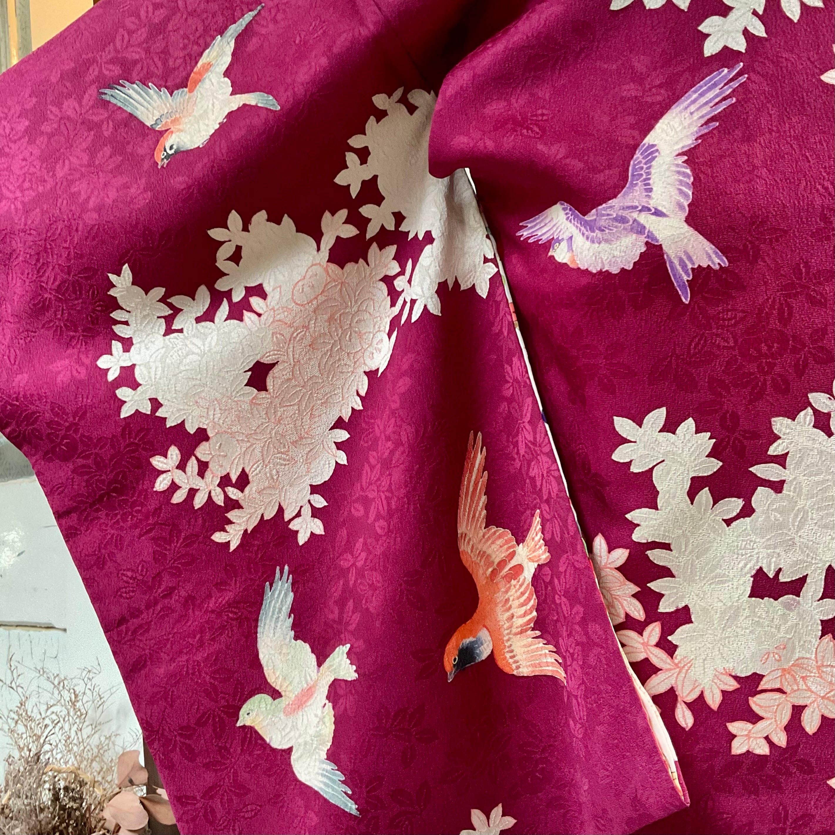 ローズレッド地に、白い橘と色とりどりの鳥たちが羽ばたく模様が描かれたアンティーク羽織です