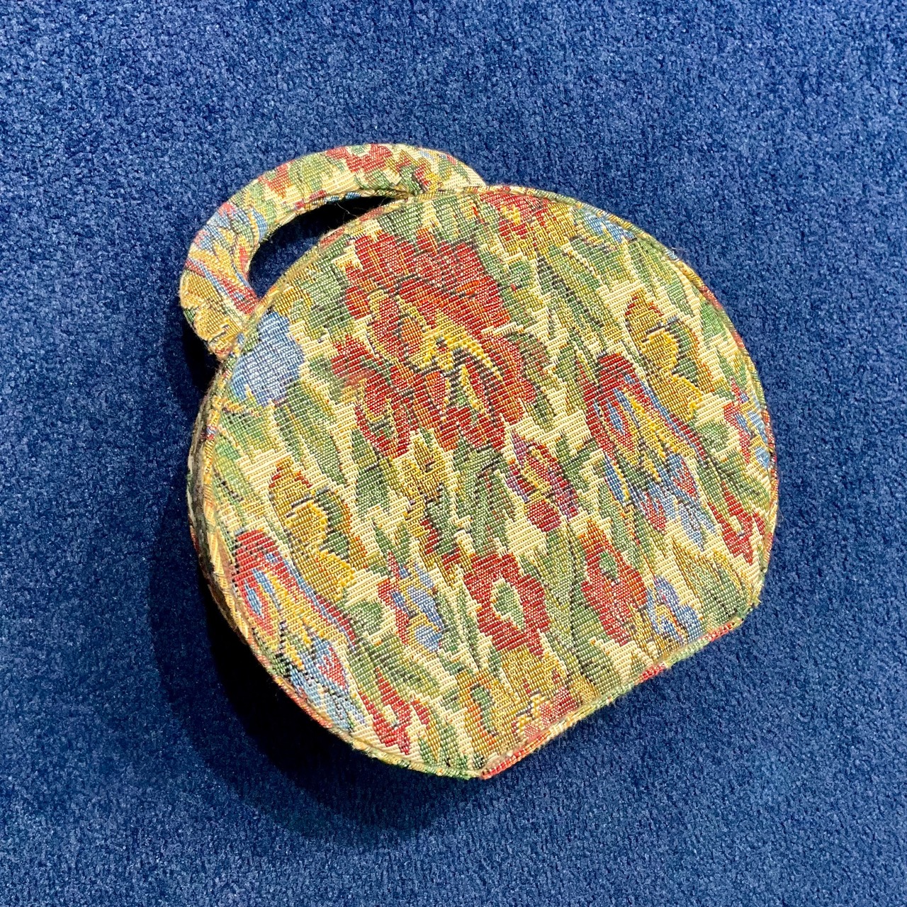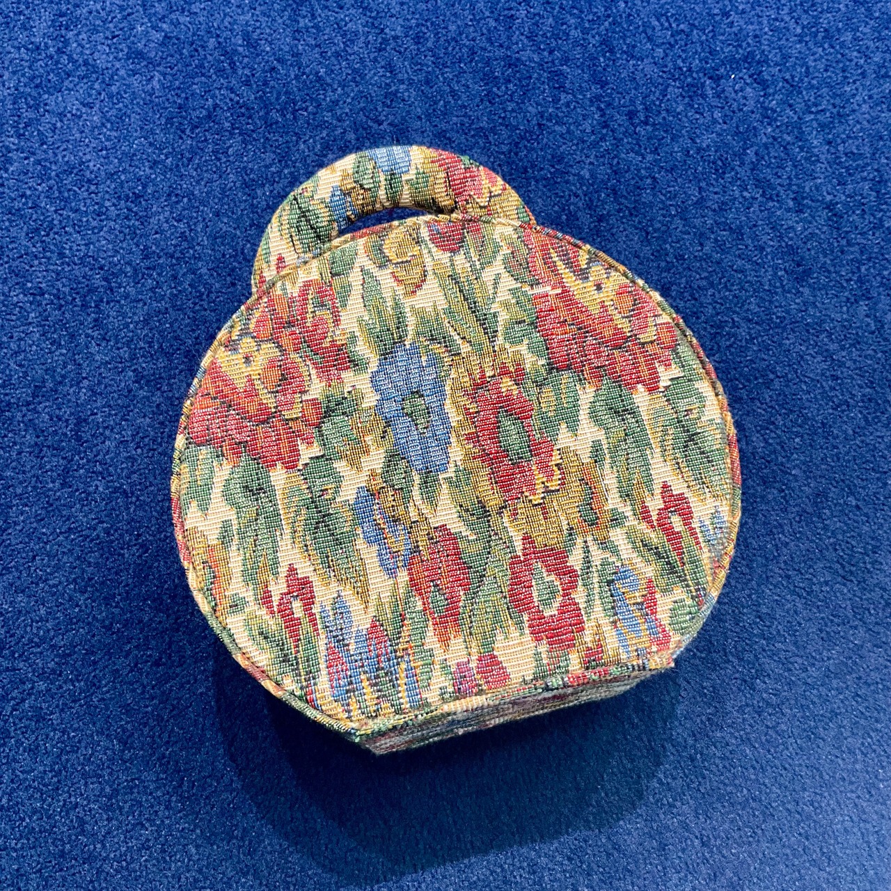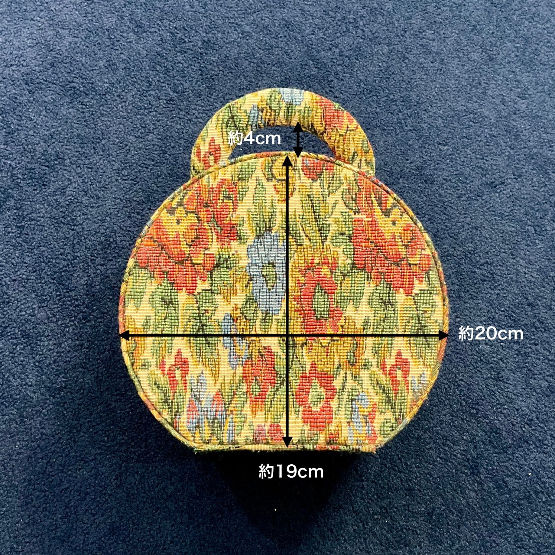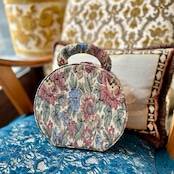 落ち着いた生成り地に、花模様がステキなゴブラン織りのクラシカルな丸型のボックスバッグです