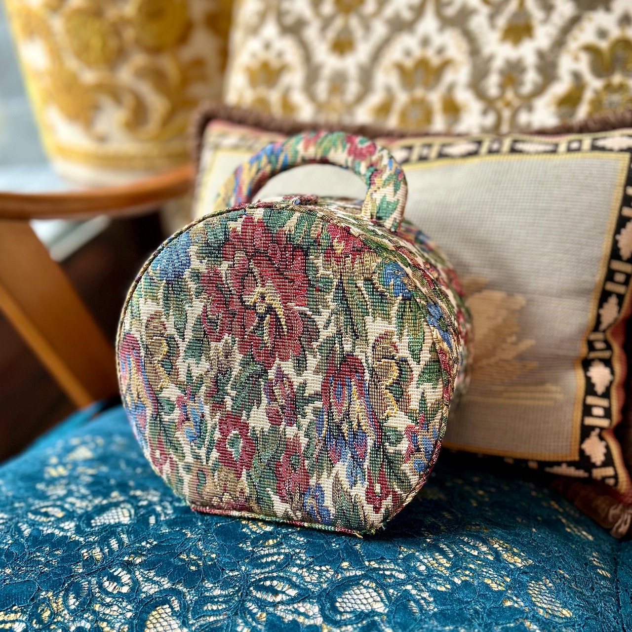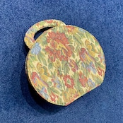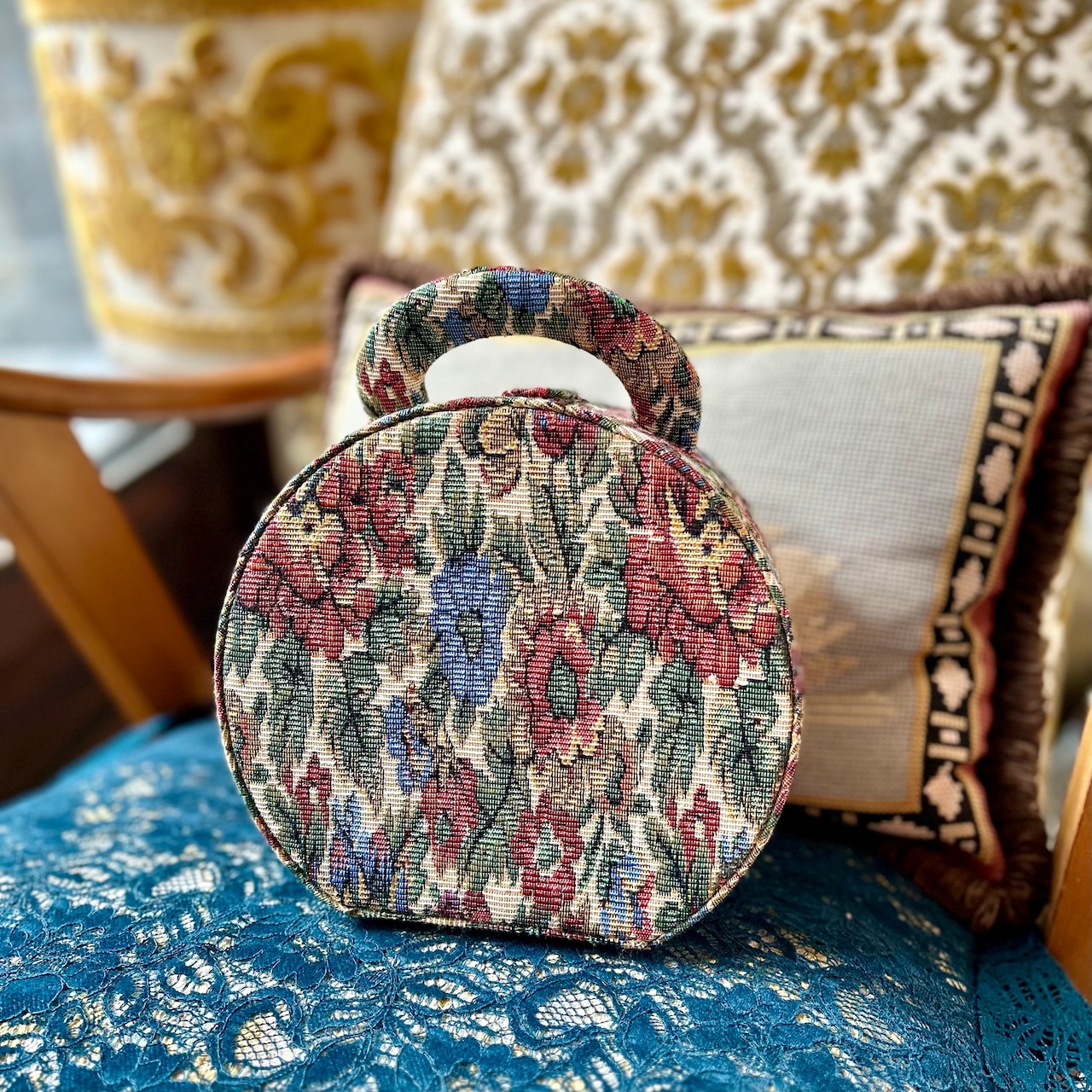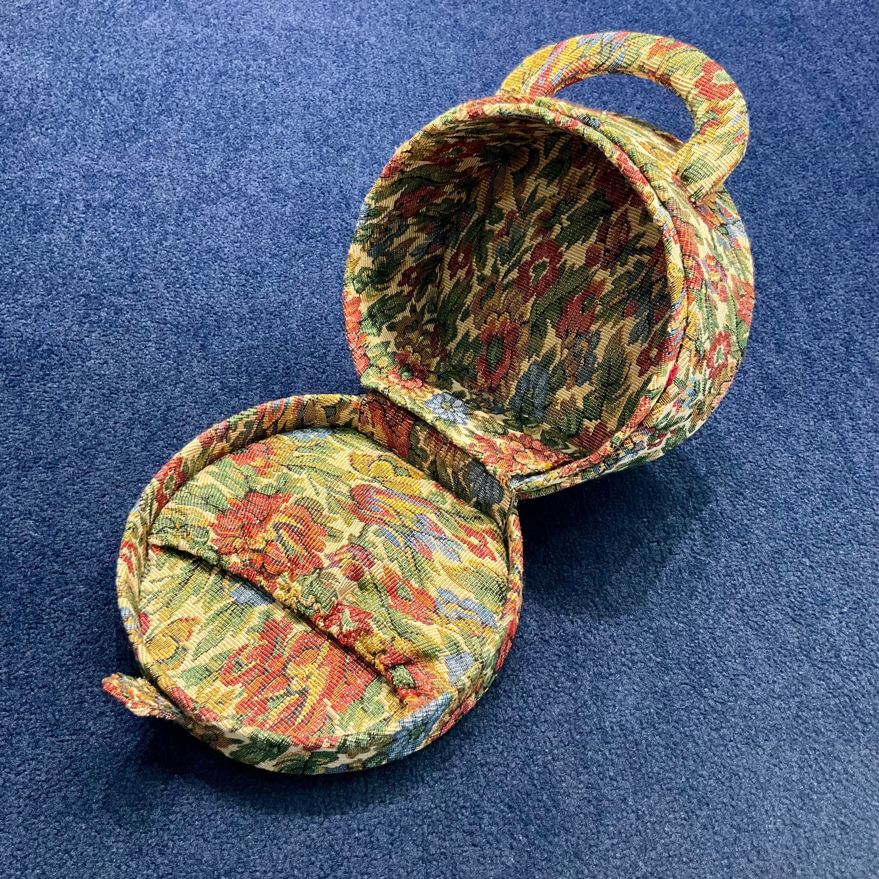 落ち着いた生成り地に、花模様がステキなゴブラン織りのクラシカルな丸型のボックスバッグです