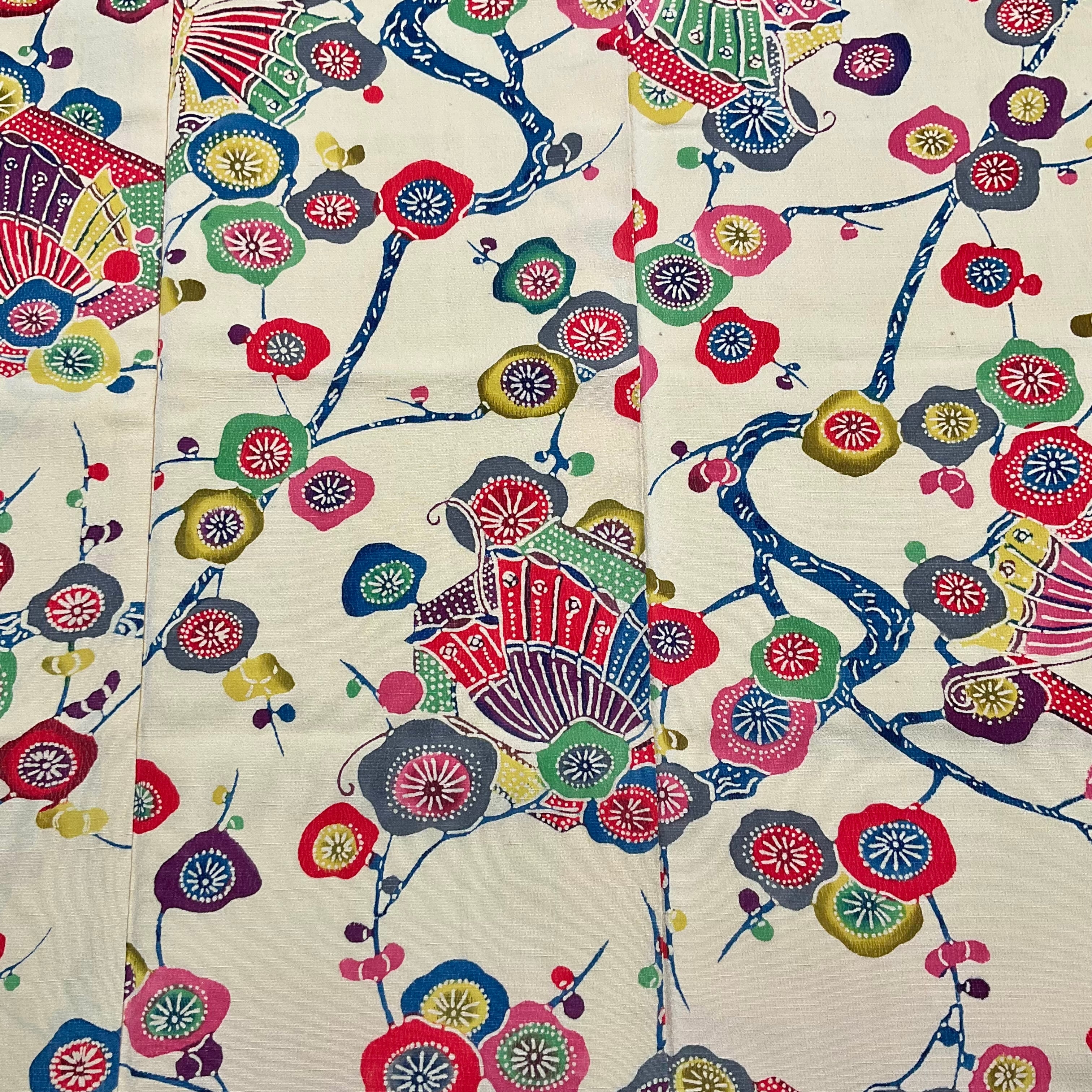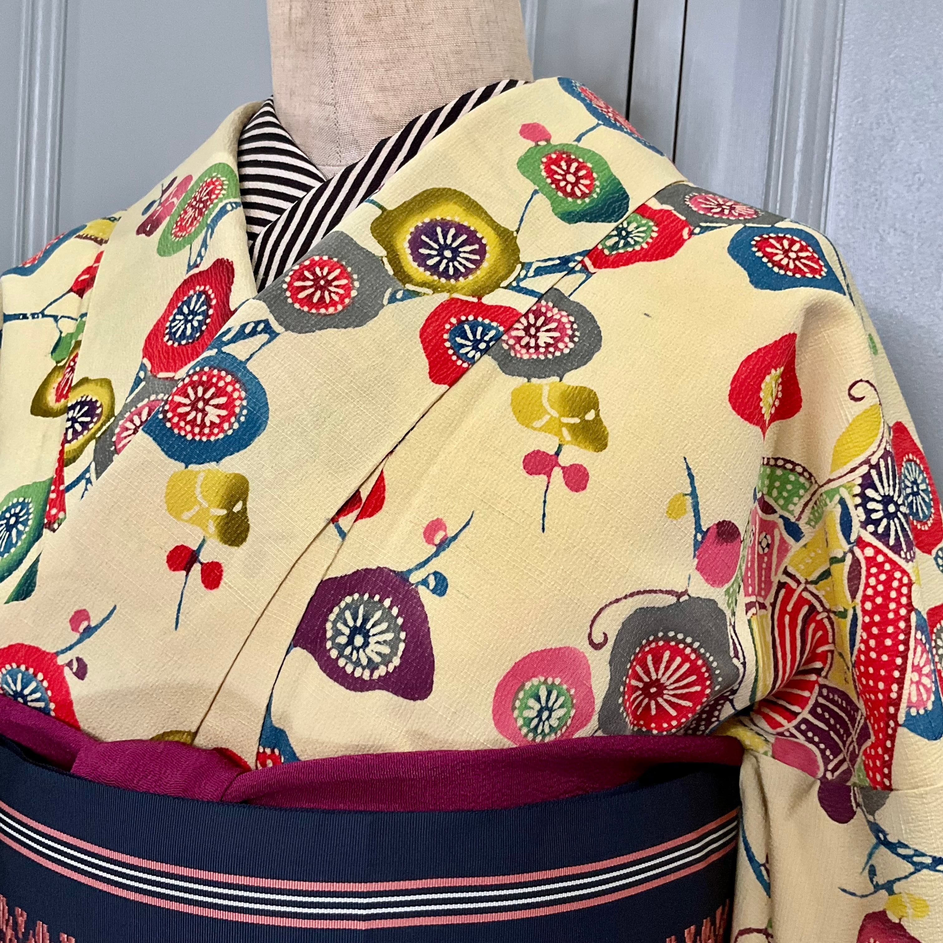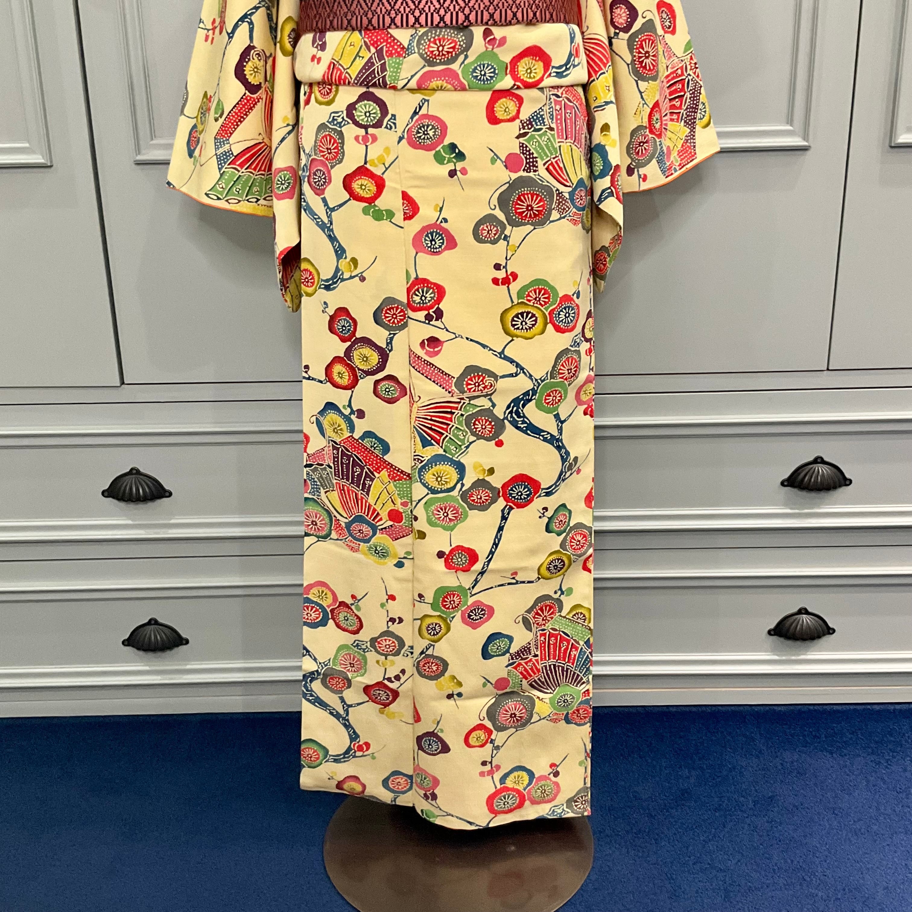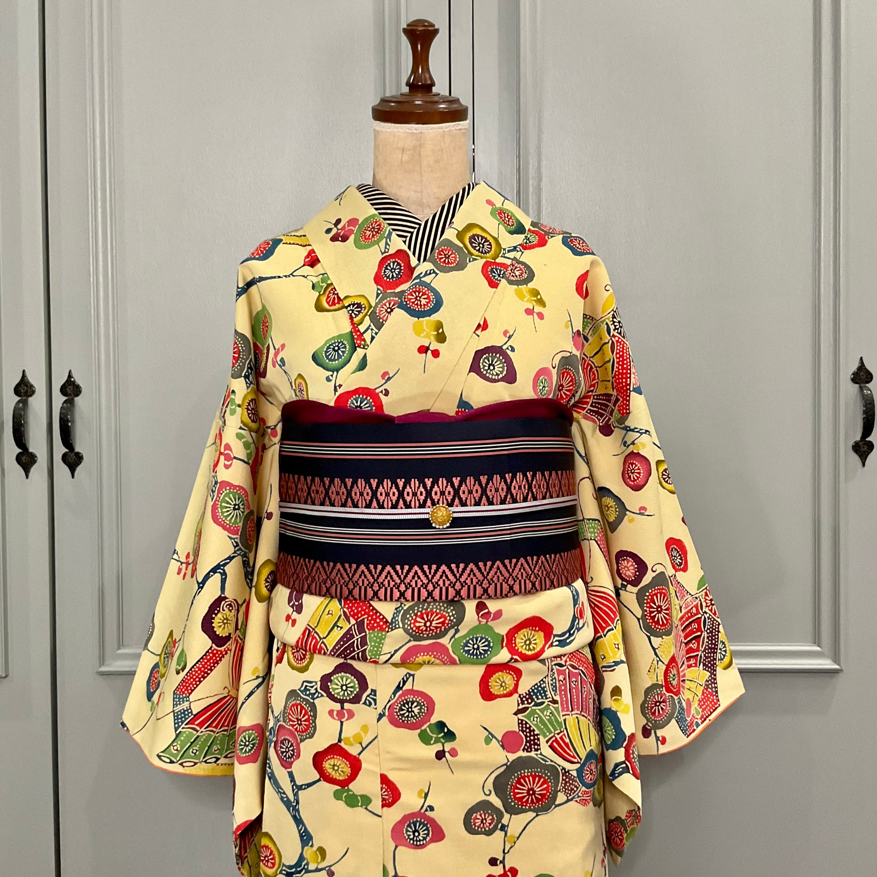 やわらかな淡黄色の地色に、色鮮やかな花や枝模様が紅型調に描かれた袷着物です