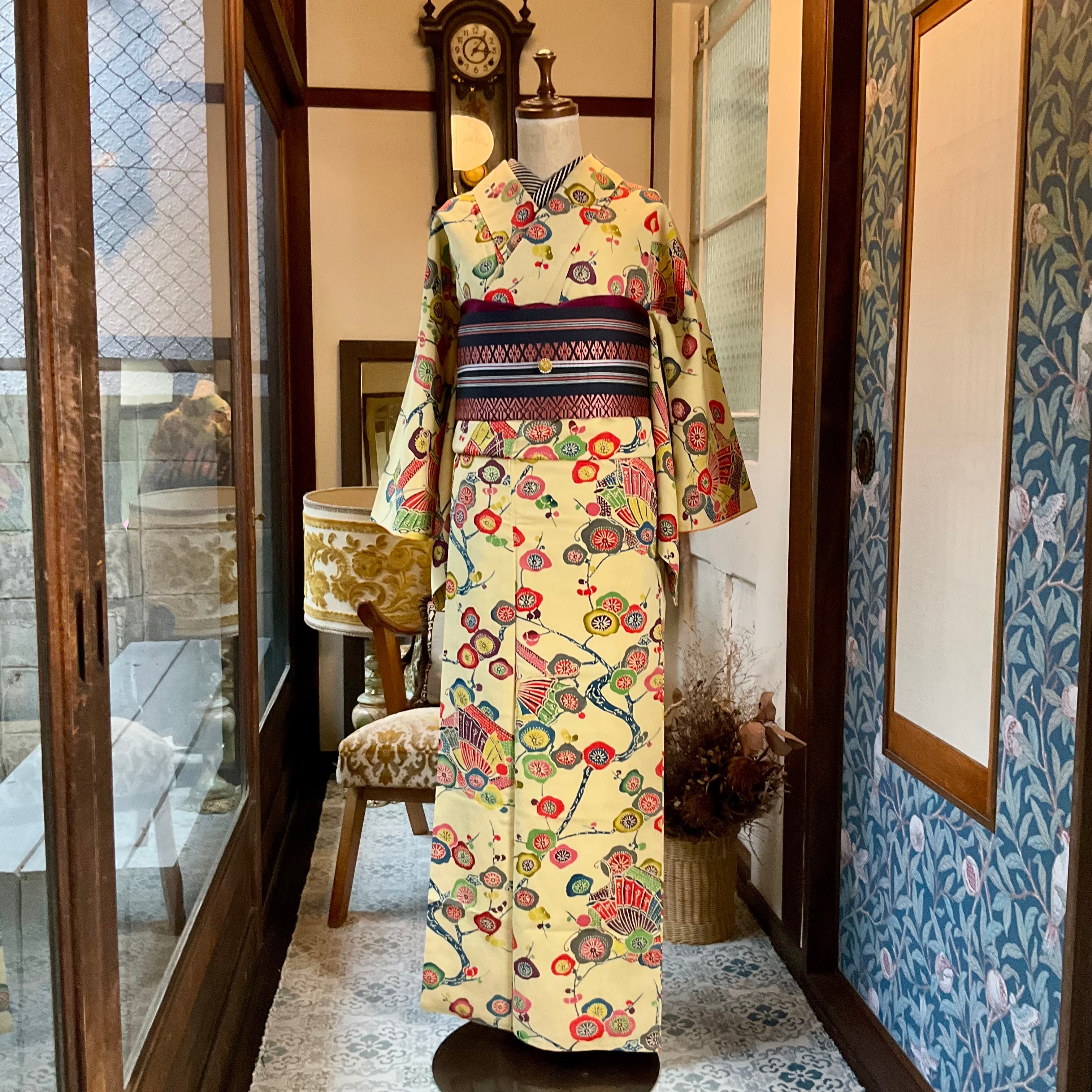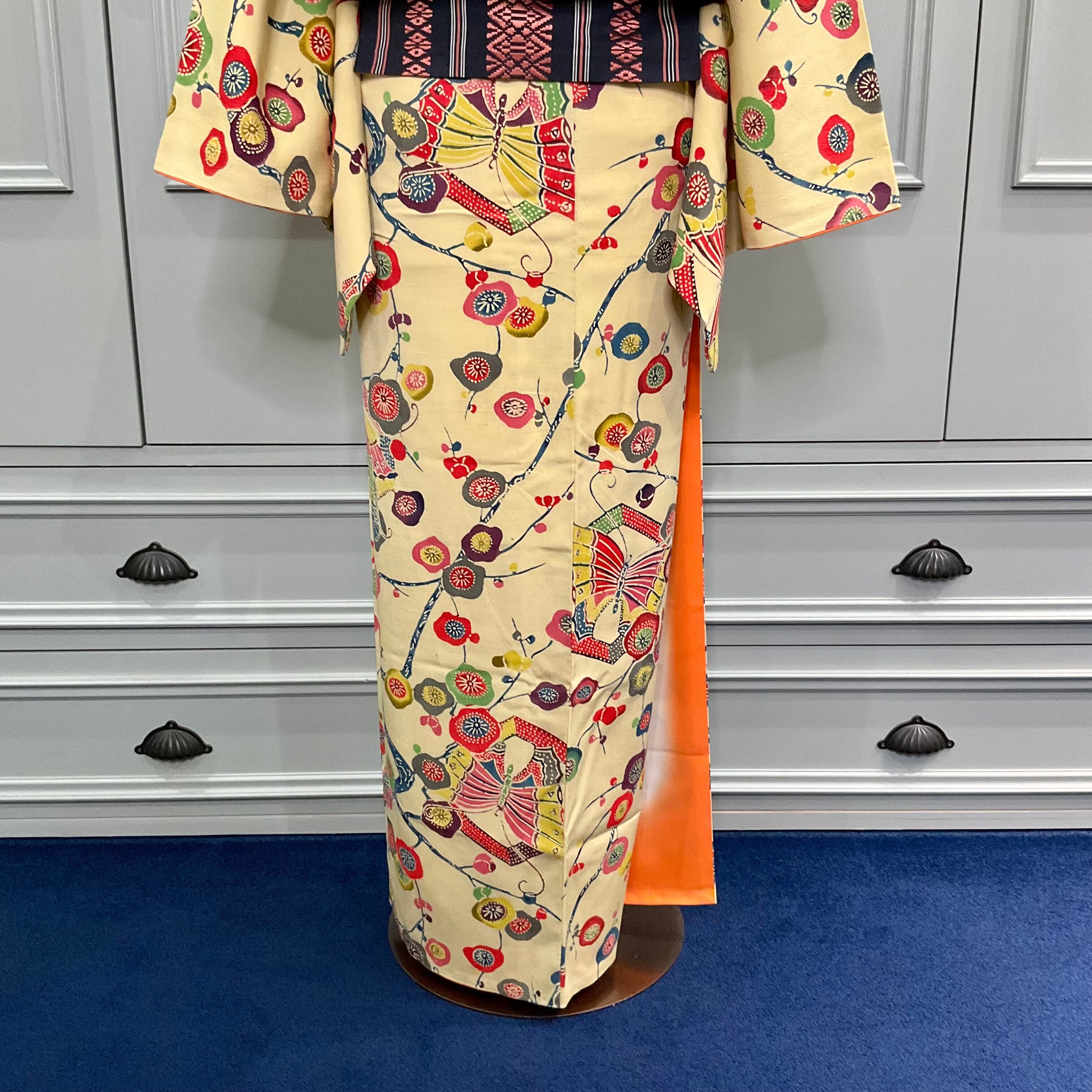 long*琉球ロマン*紅型調 縮緬 梅 蝶 ちょうちょ 淡黄 イエロー ボタニカル 袷着物 B528