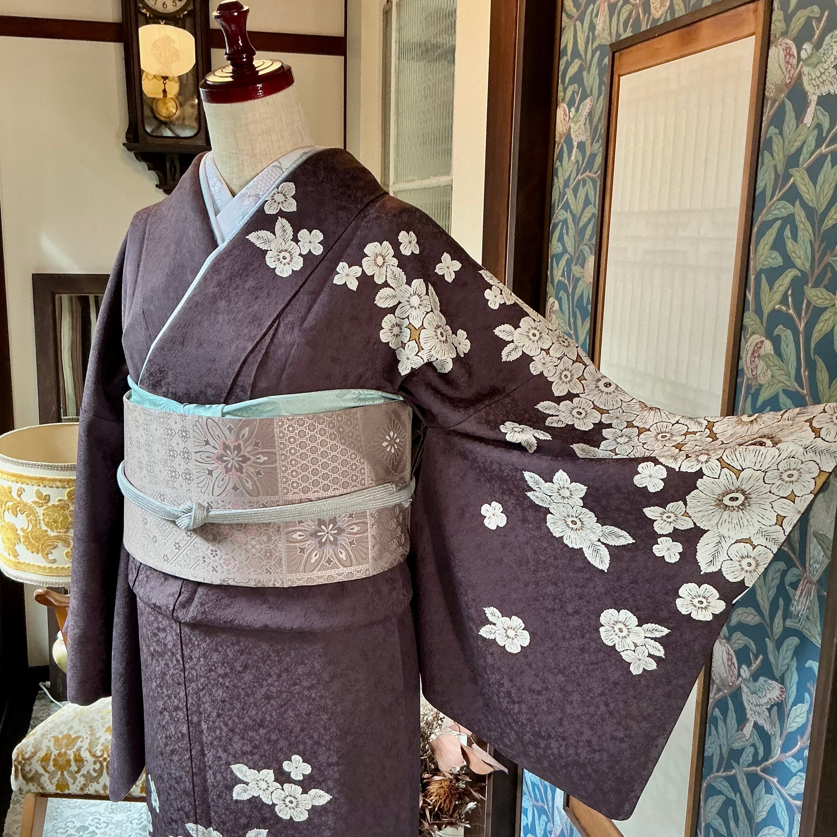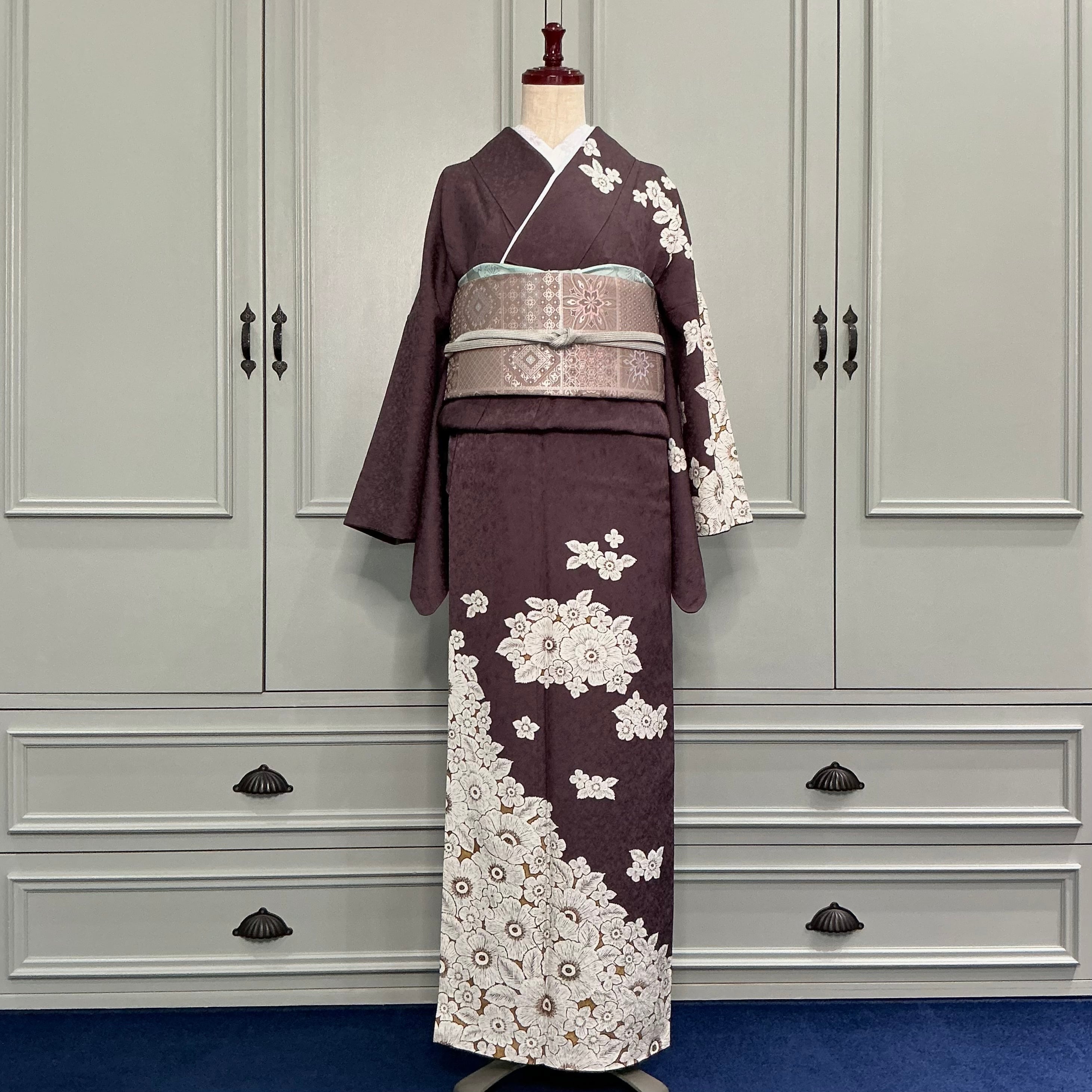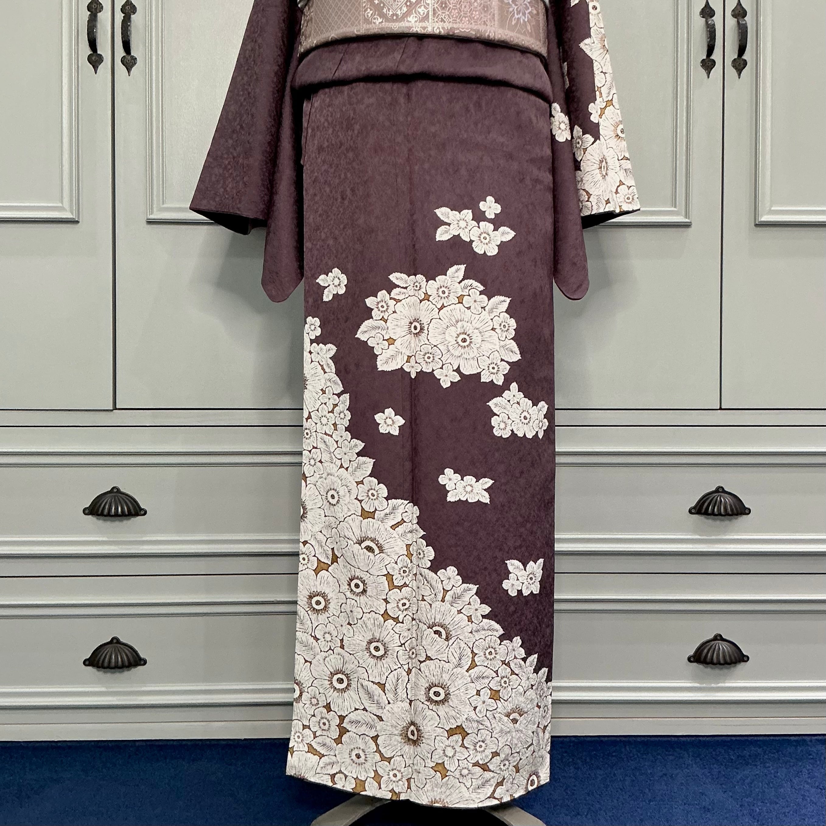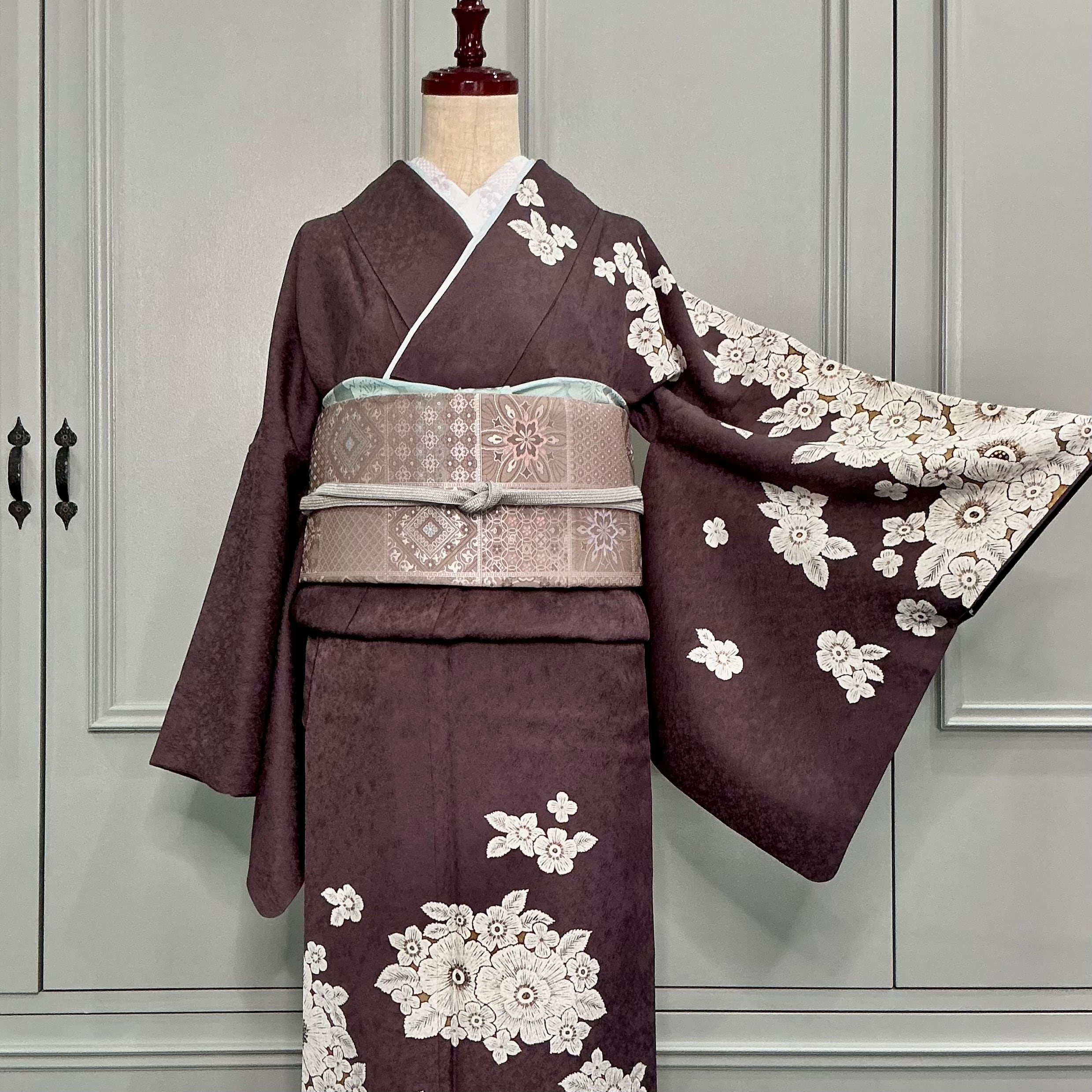 訪問着は、チャコールブラウンの地色に、白いお花の模様が描かれた上品で華やかなデザインです