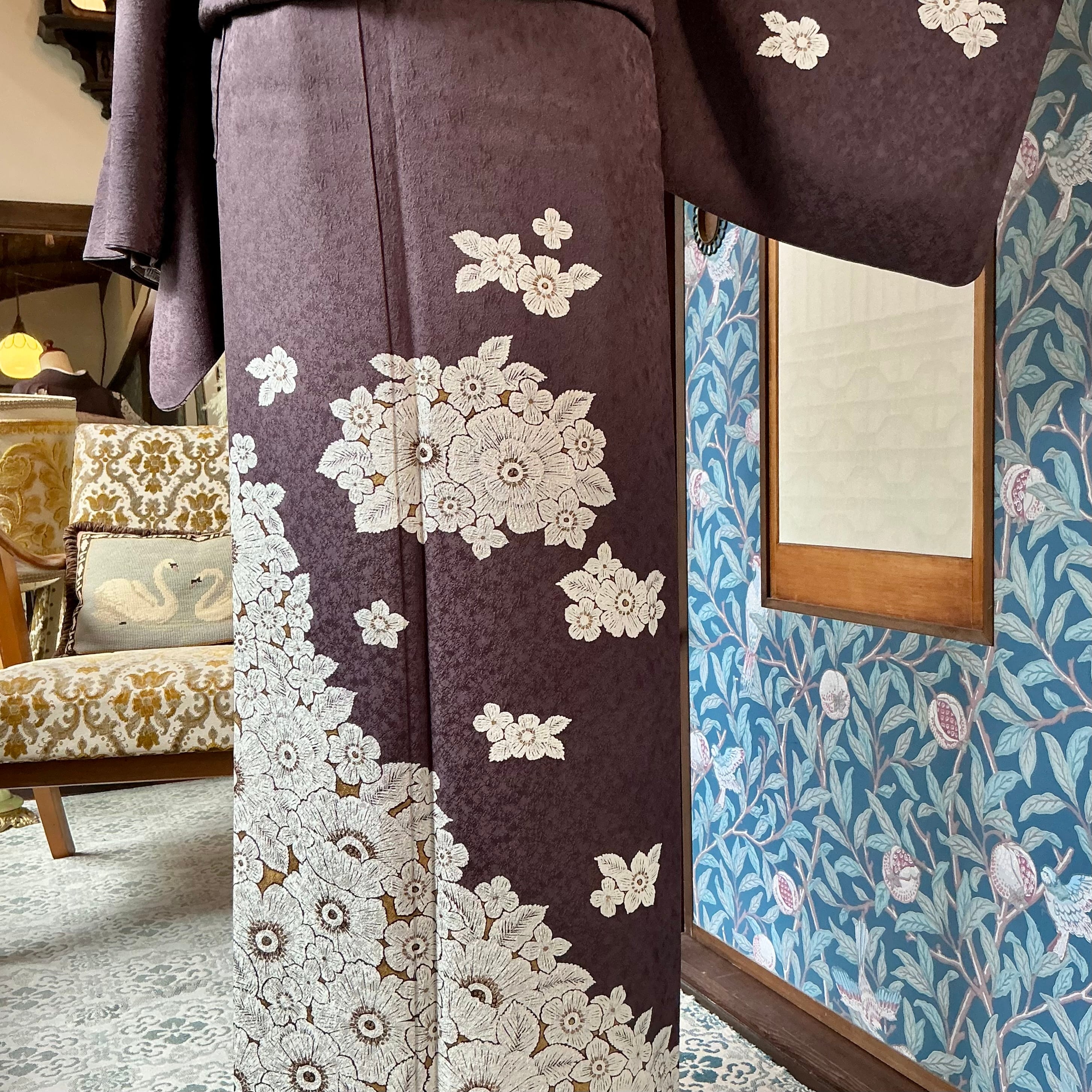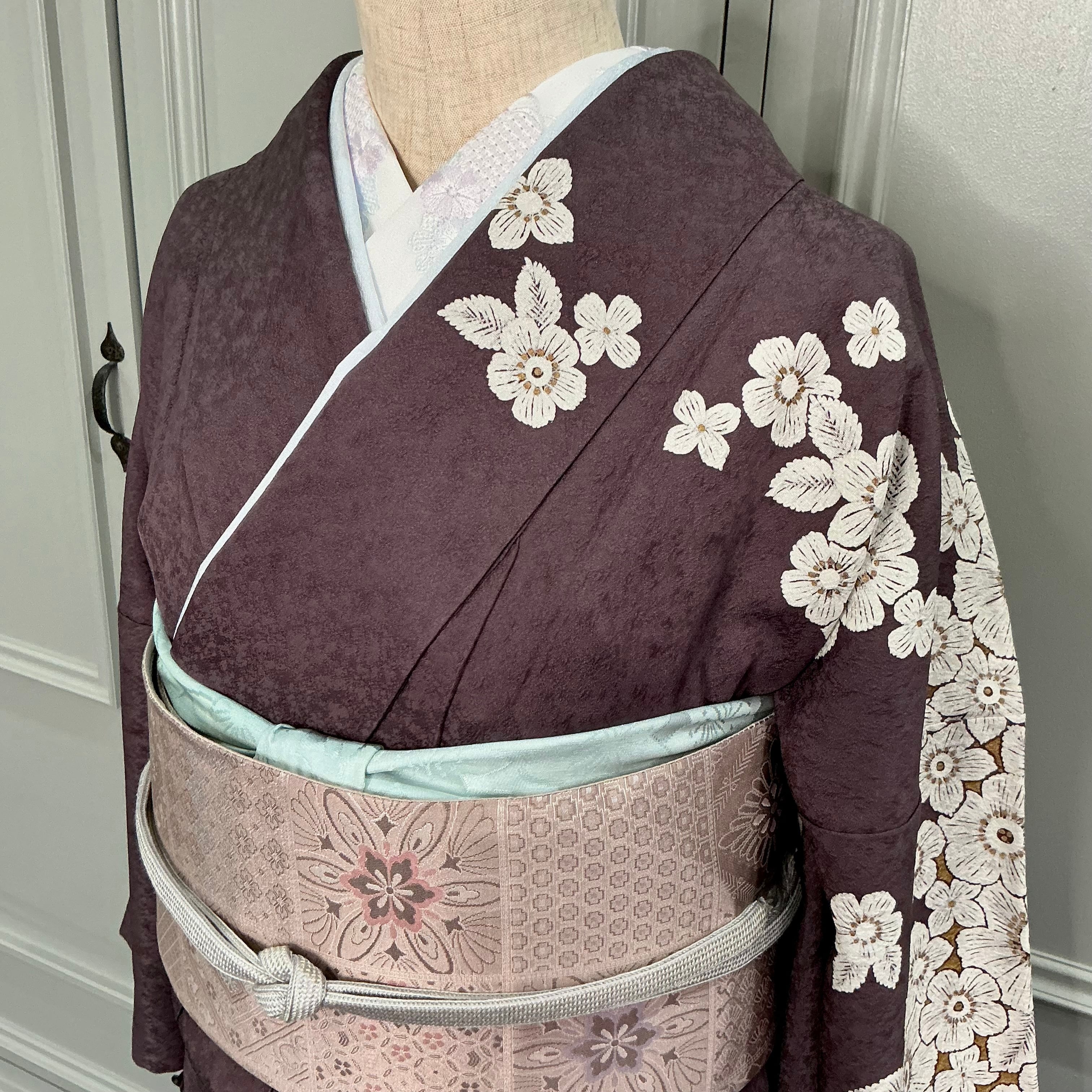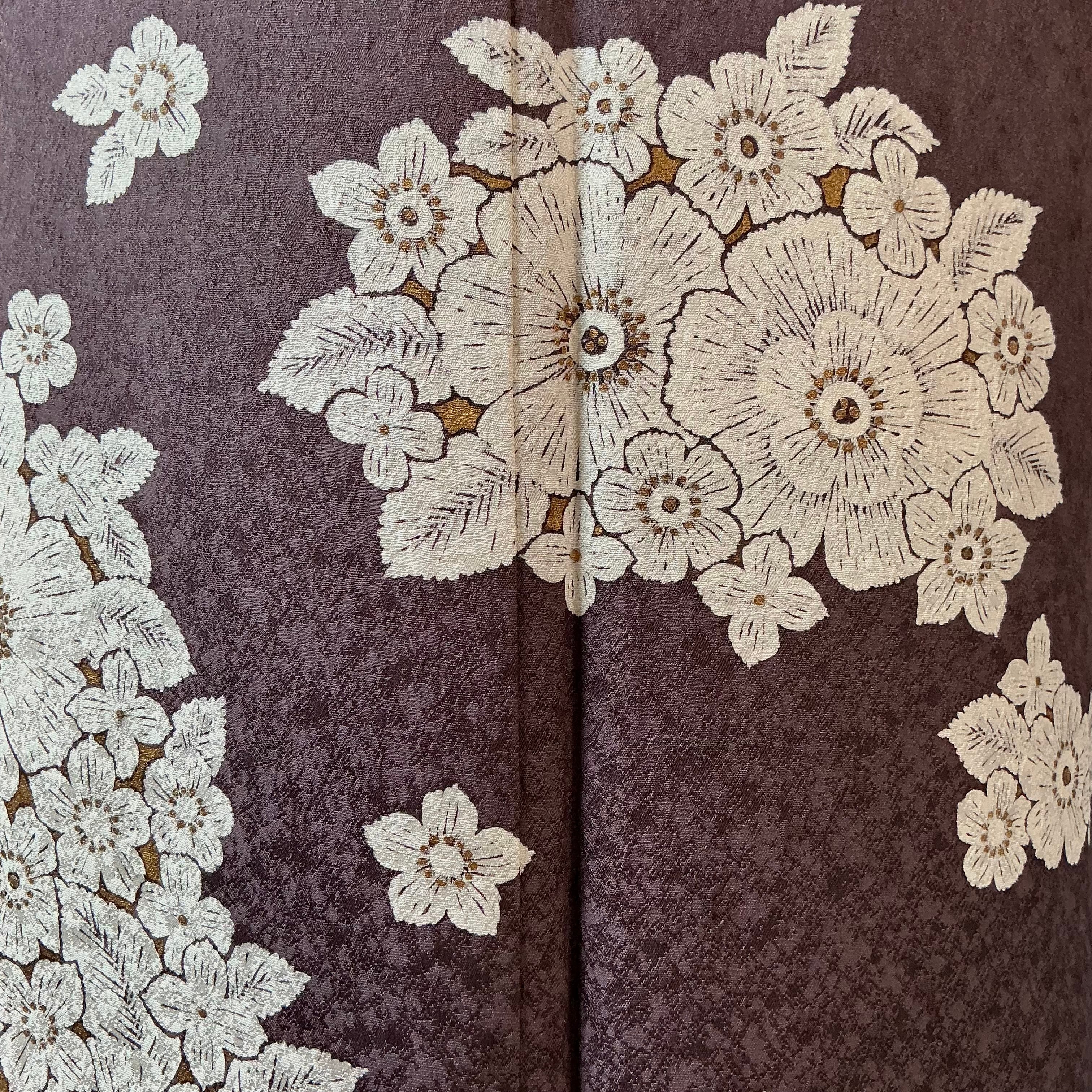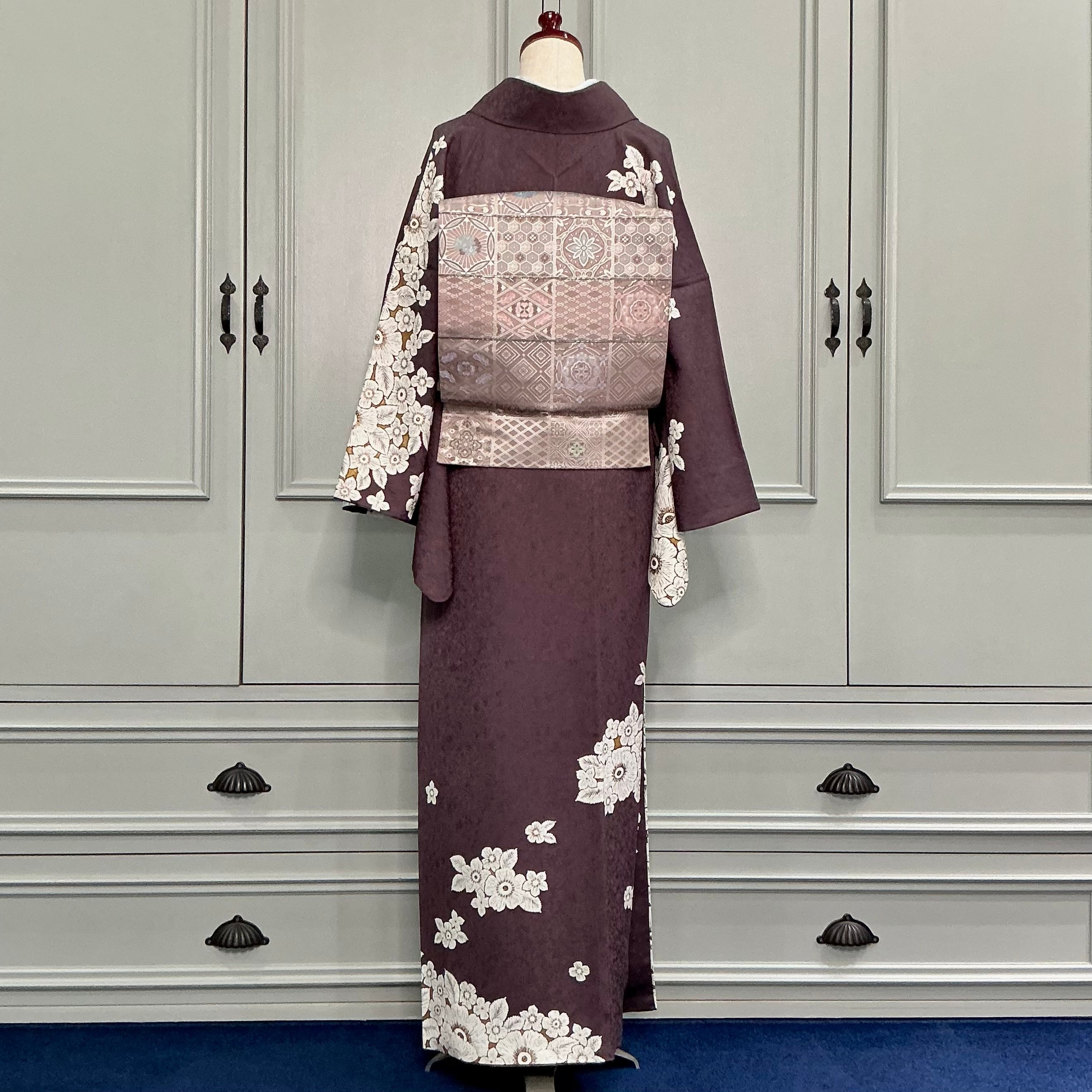 訪問着は、チャコールブラウンの地色に、白いお花の模様が描かれた上品で華やかなデザインです