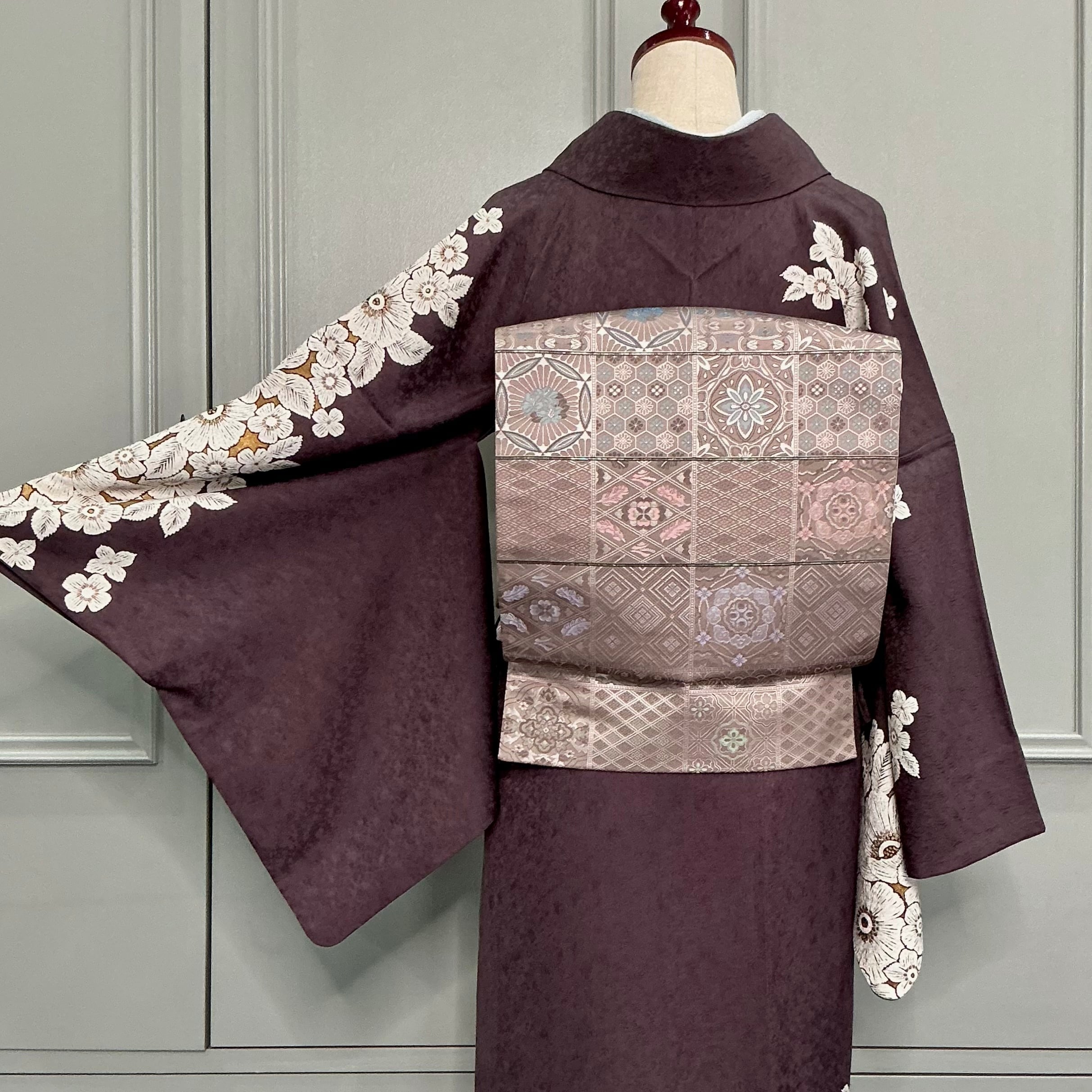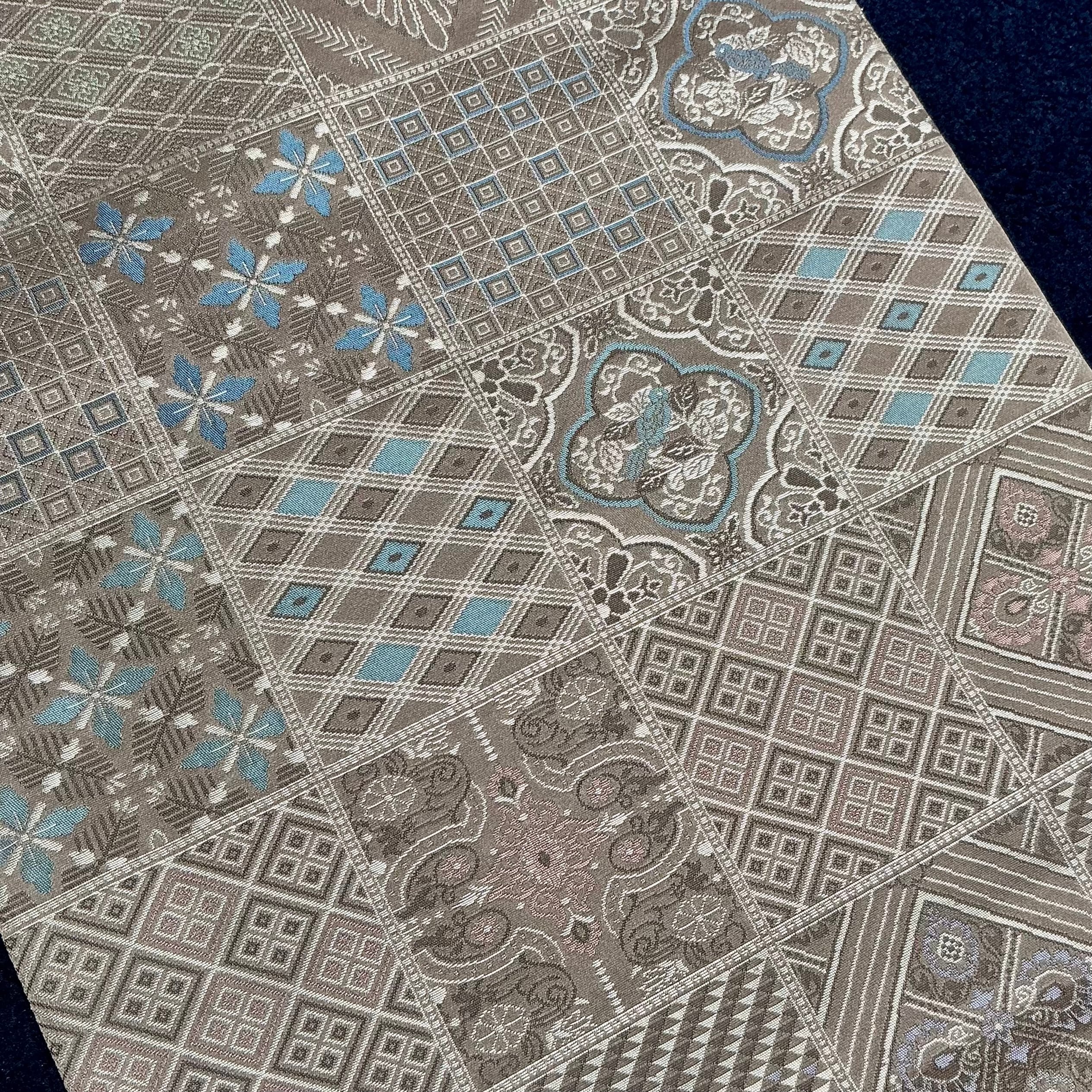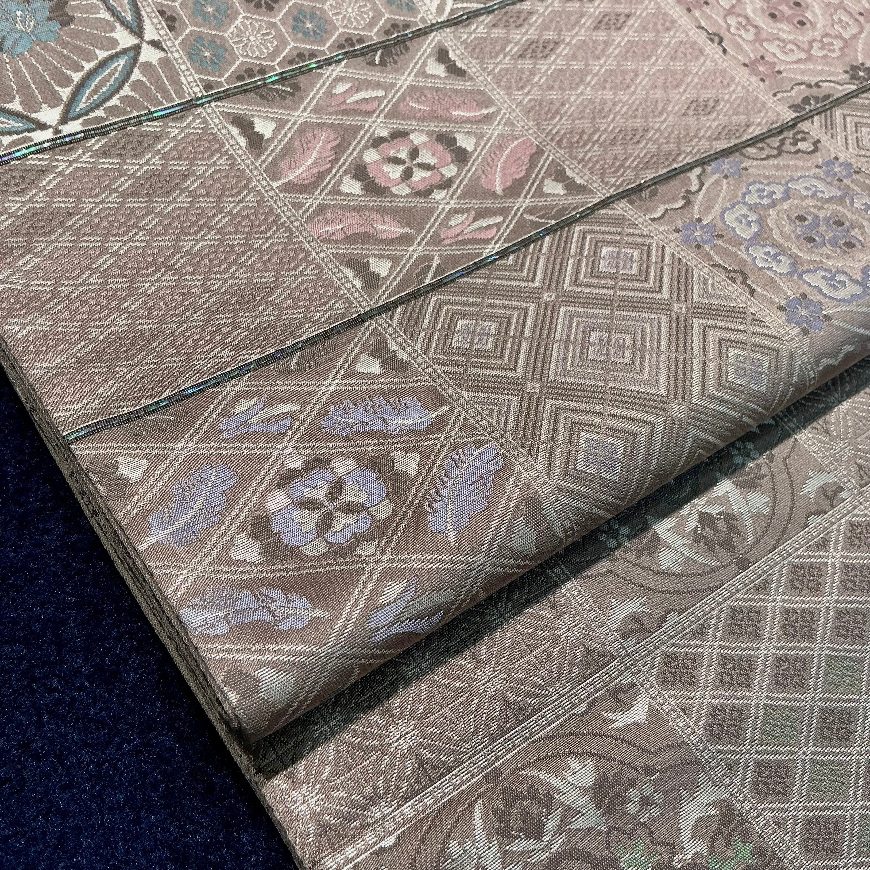 袋帯は、ほんのり紫を感じるライトグレージュ系の地色で、格子の中に中東のタイルのような雰囲気の模様がデザインされています*