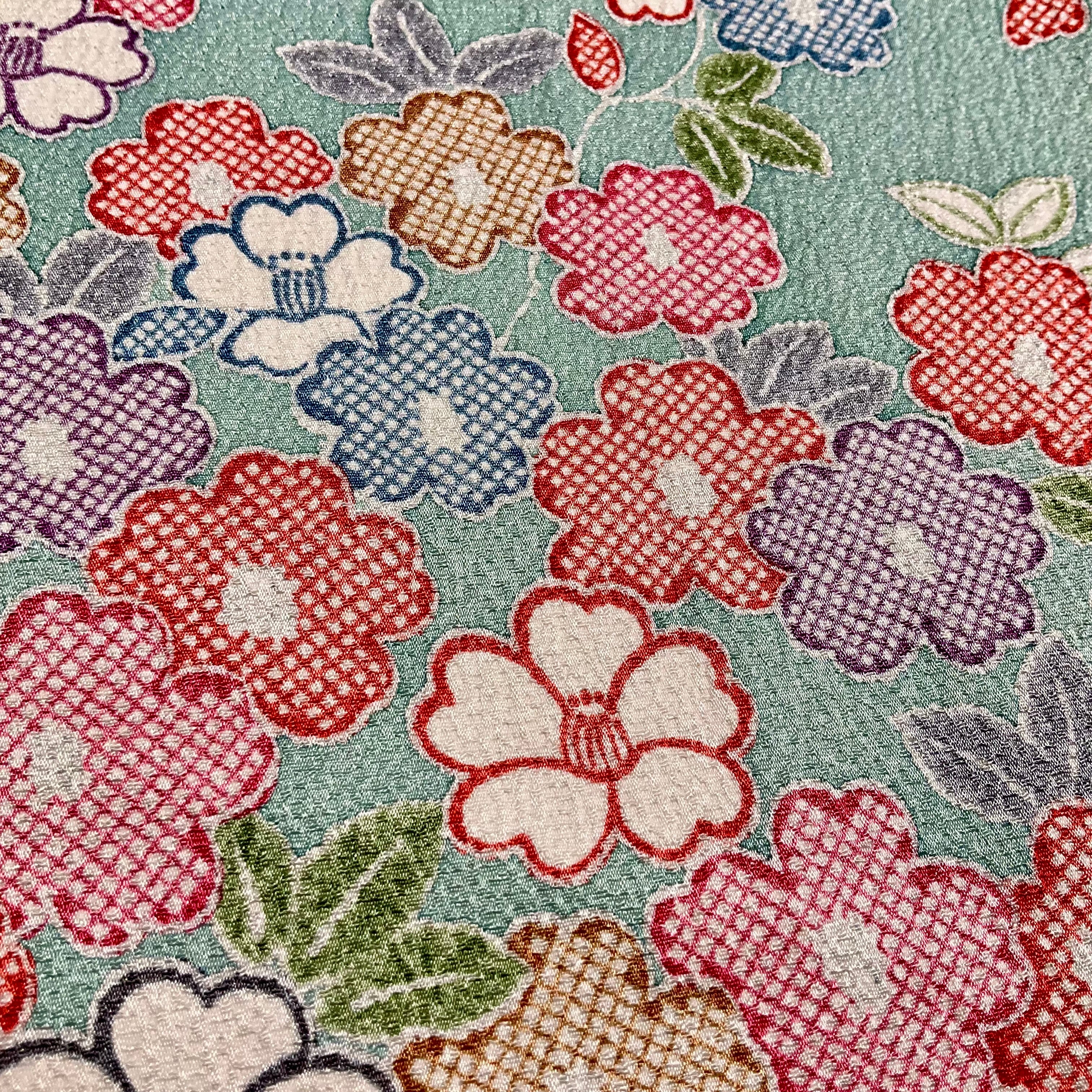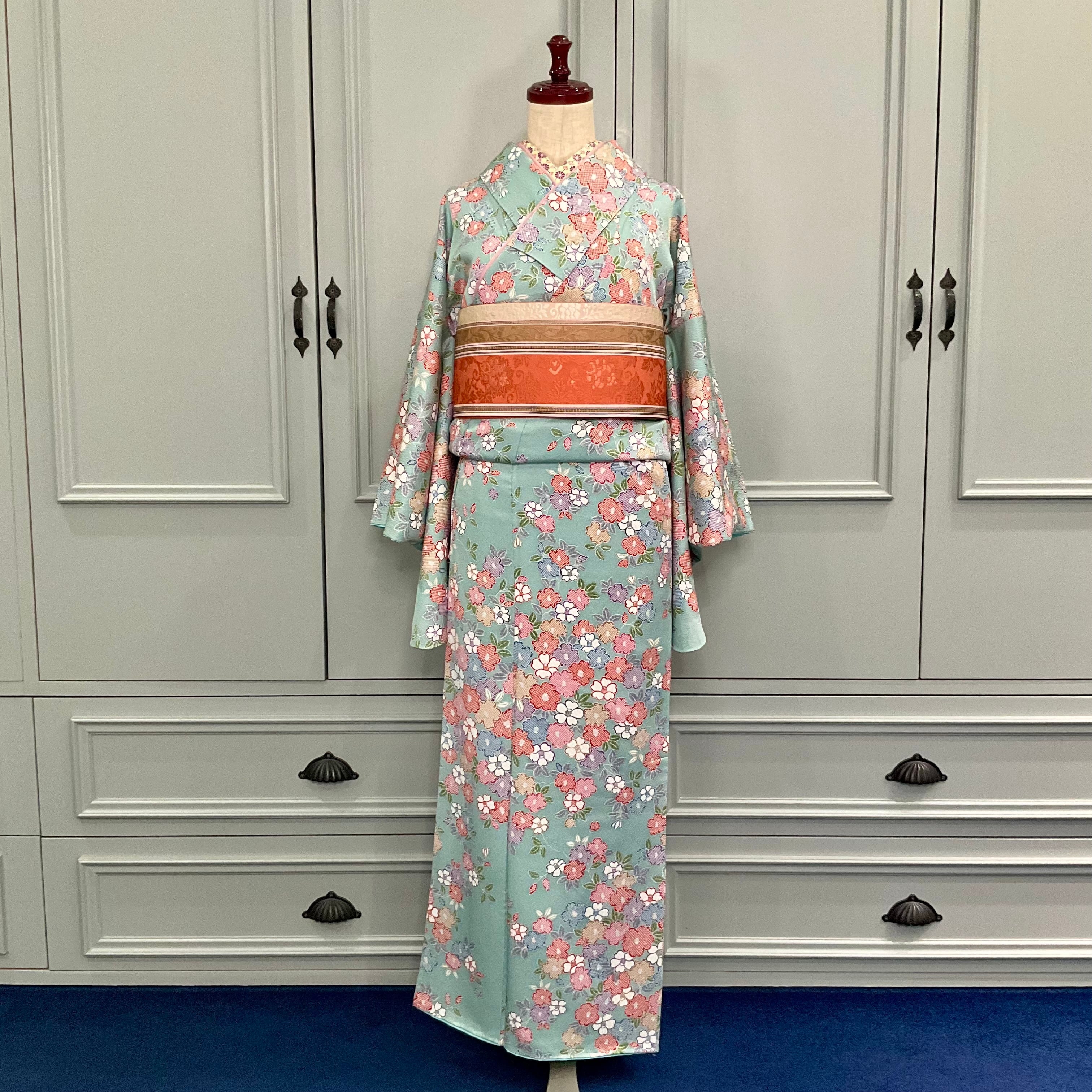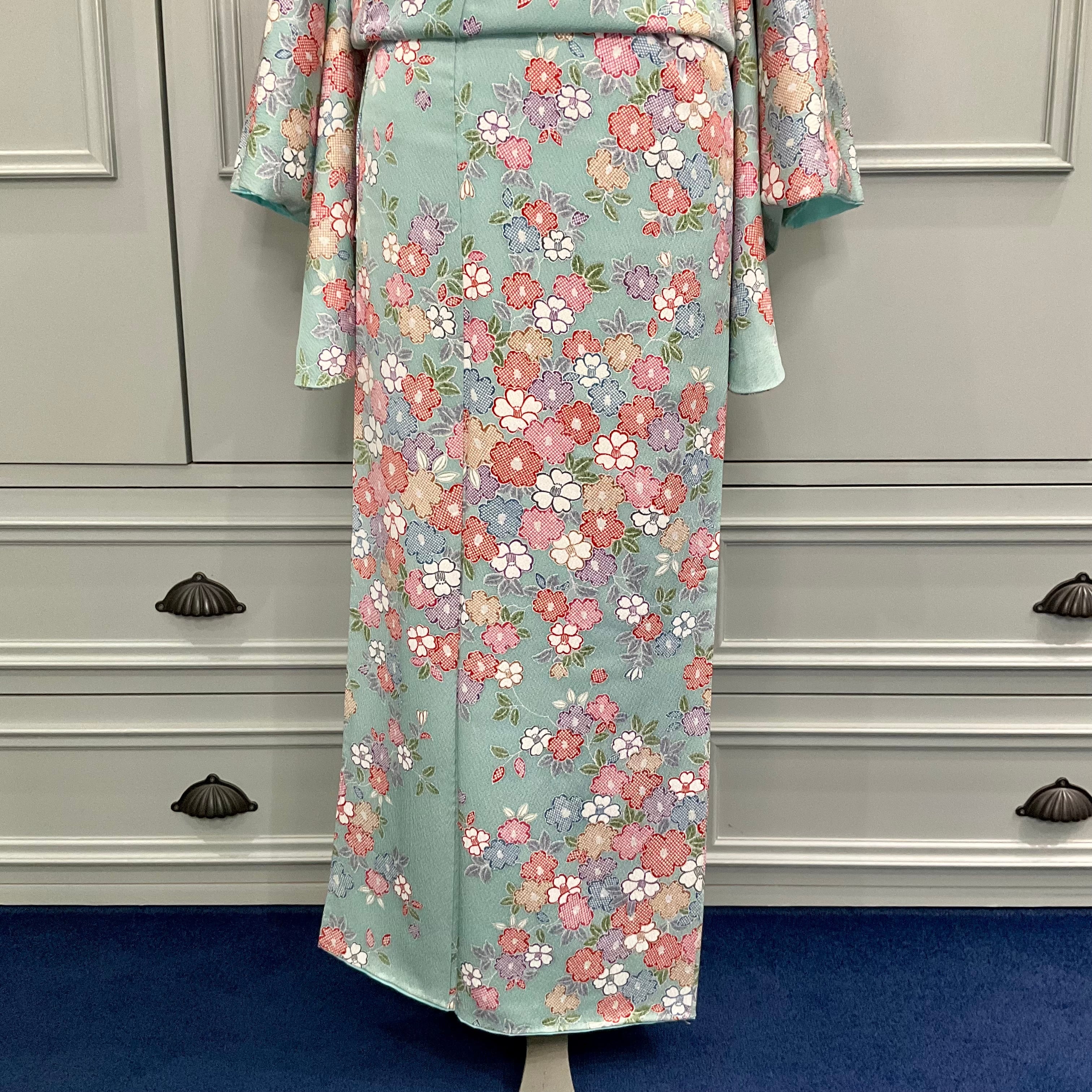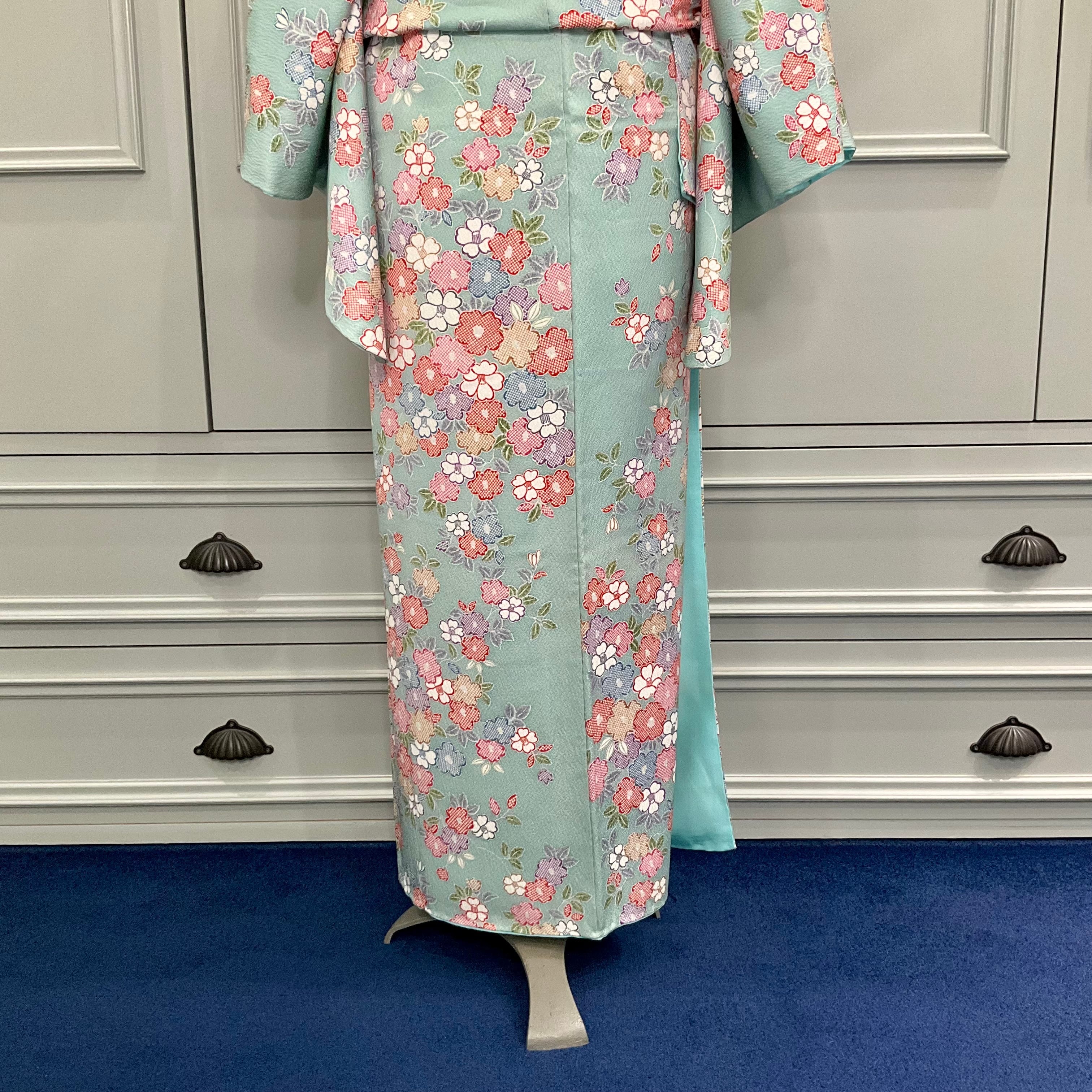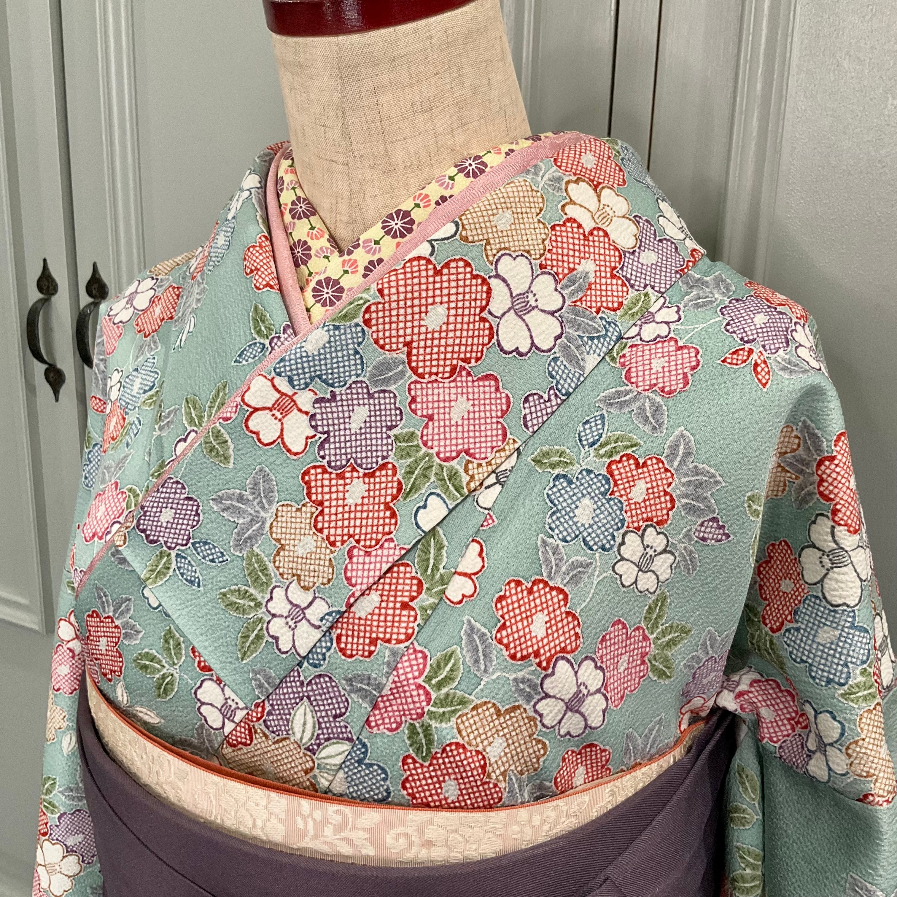 着物は、色鮮やかな花模様がブルーグリーンの地色によく映え、お顔周りがパッと華やぐデザイン♡