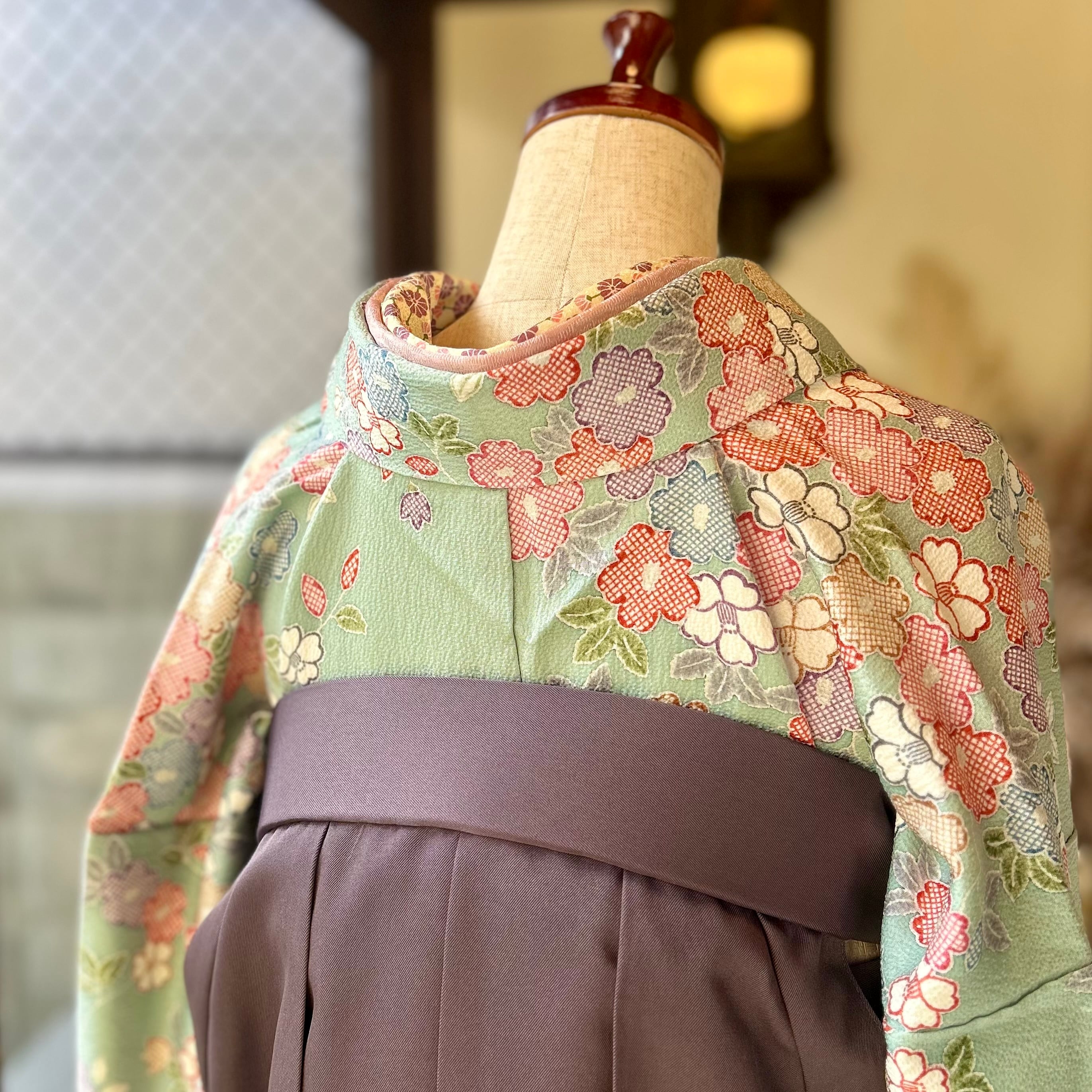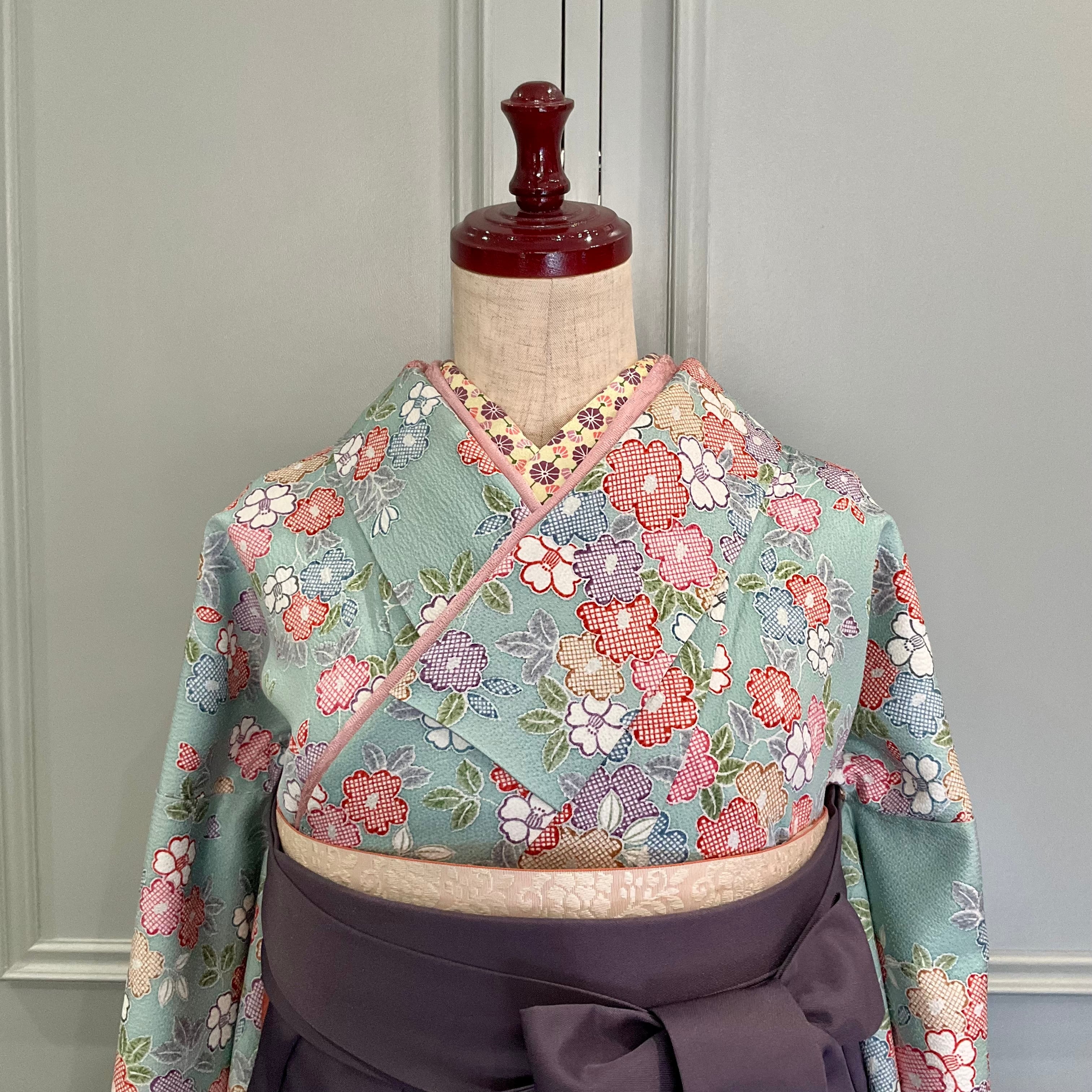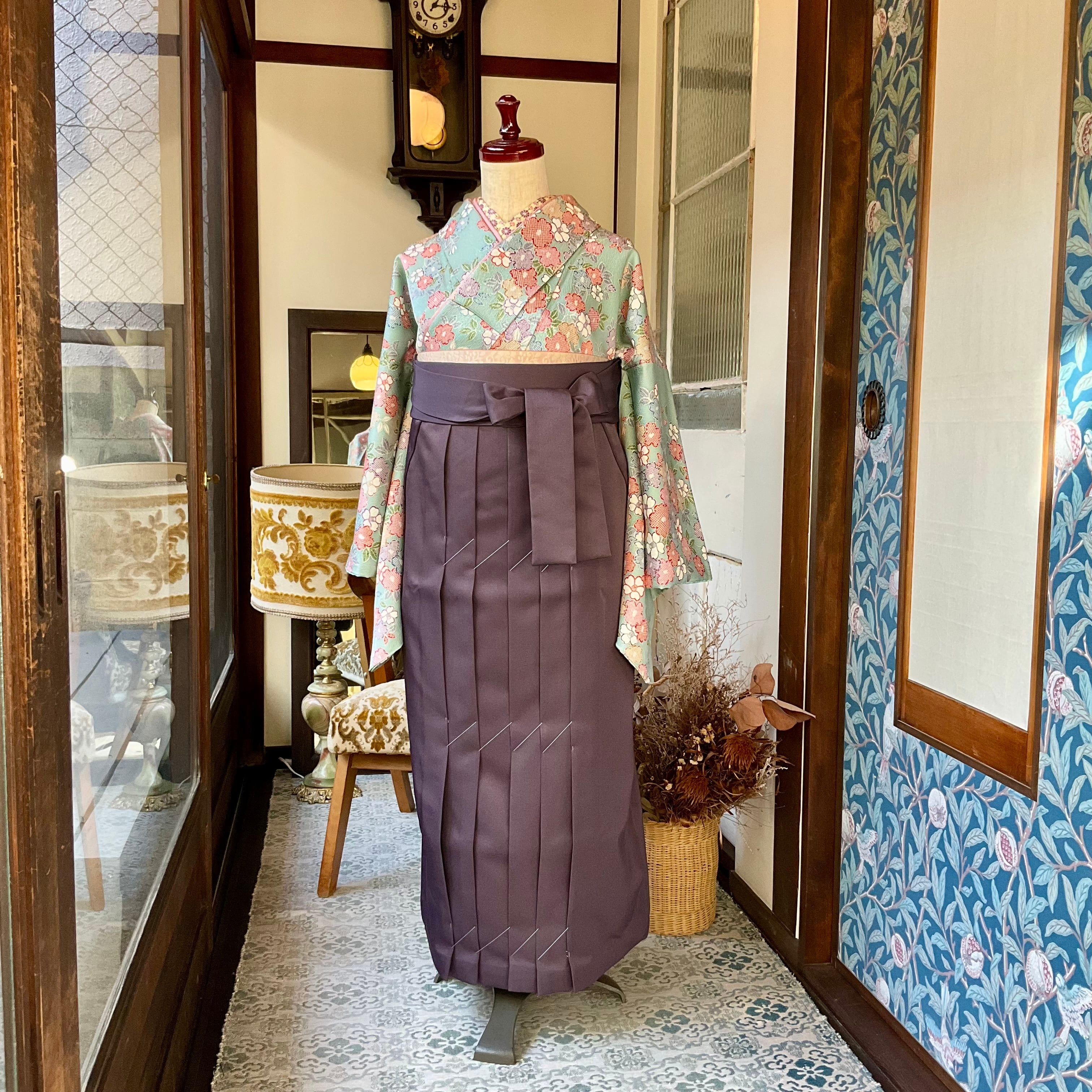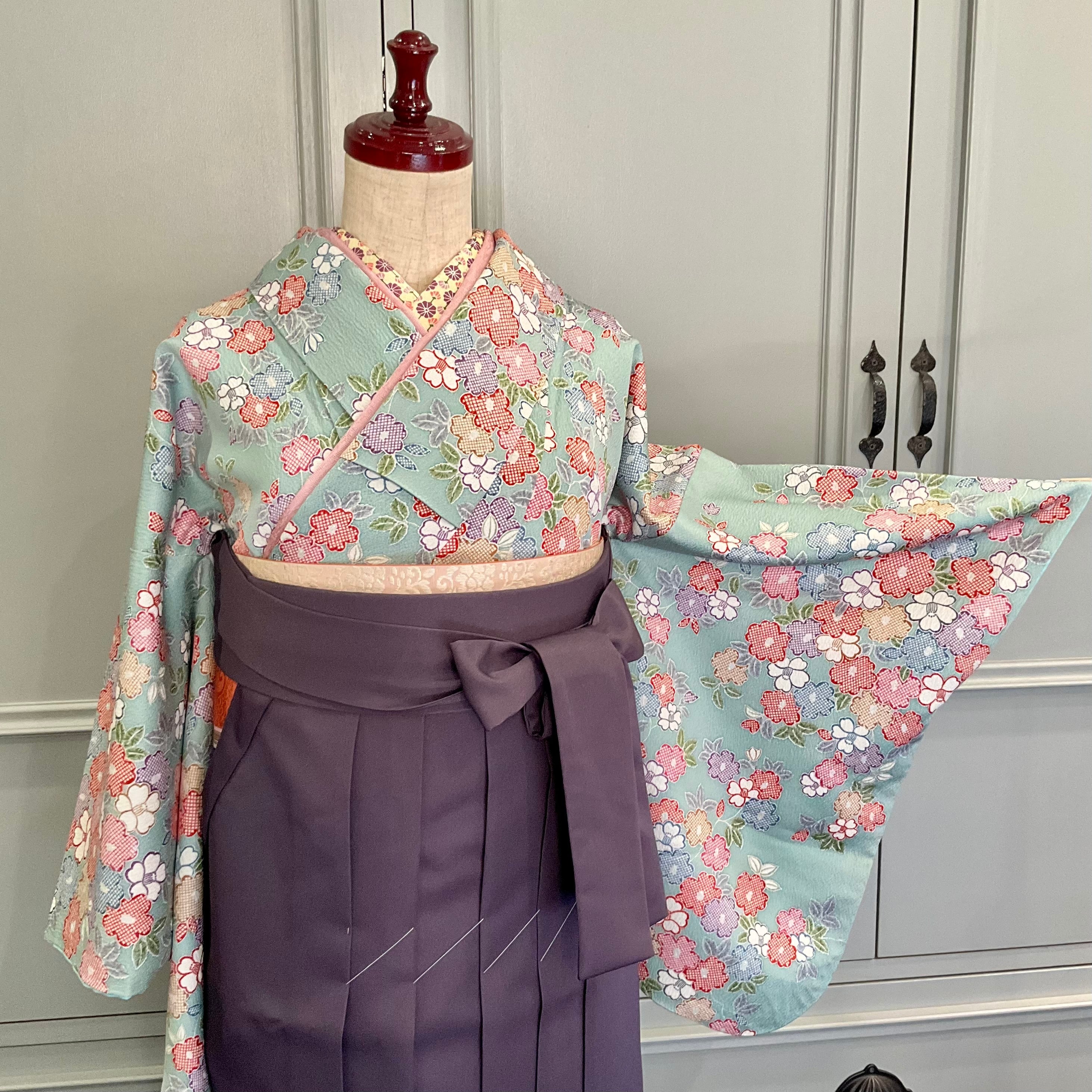 淡めのブルーグリーンの地色に、色とりどりの花模様が可憐でかわいらしい袷の小紋着物にパープルブラウン(葡萄鼠)の大人カラーの袴を合わせました♩