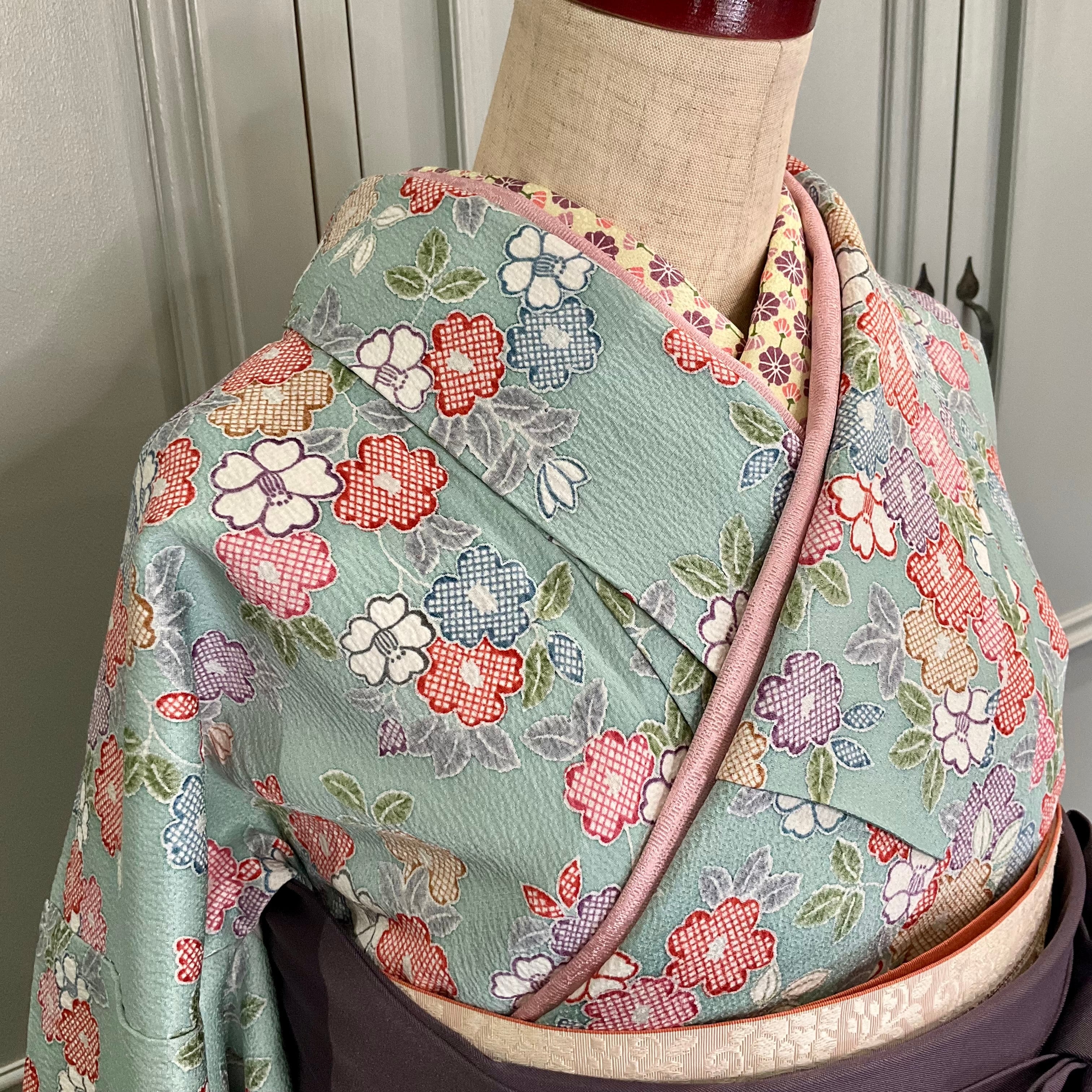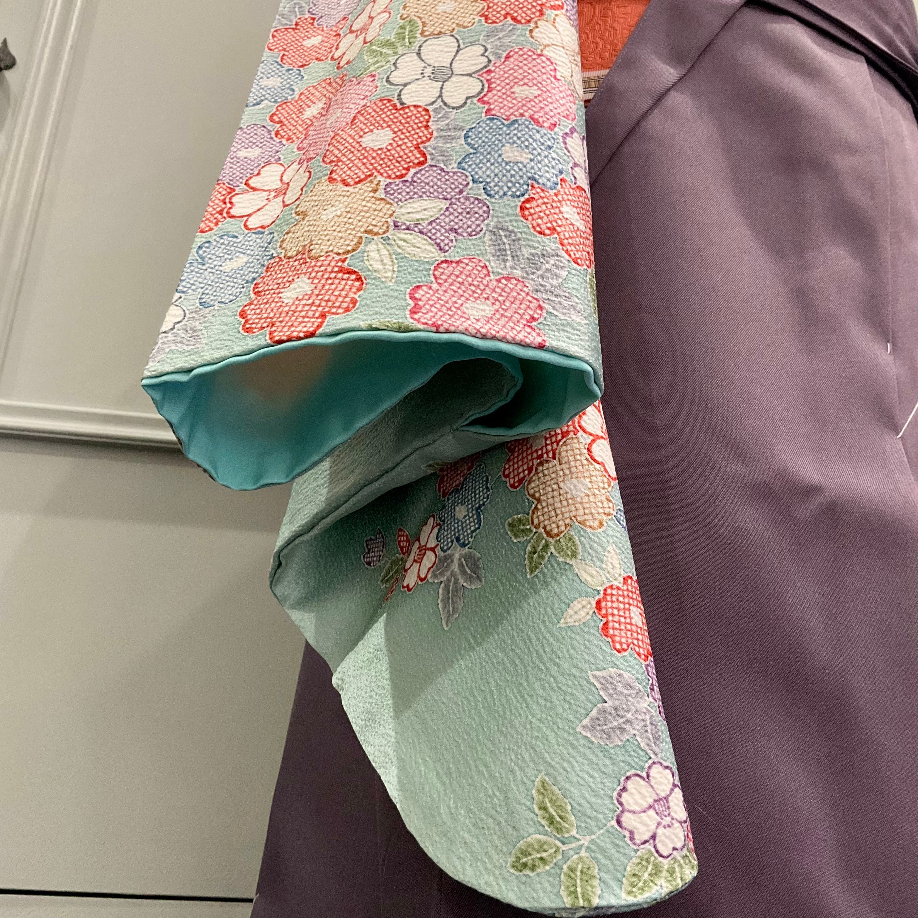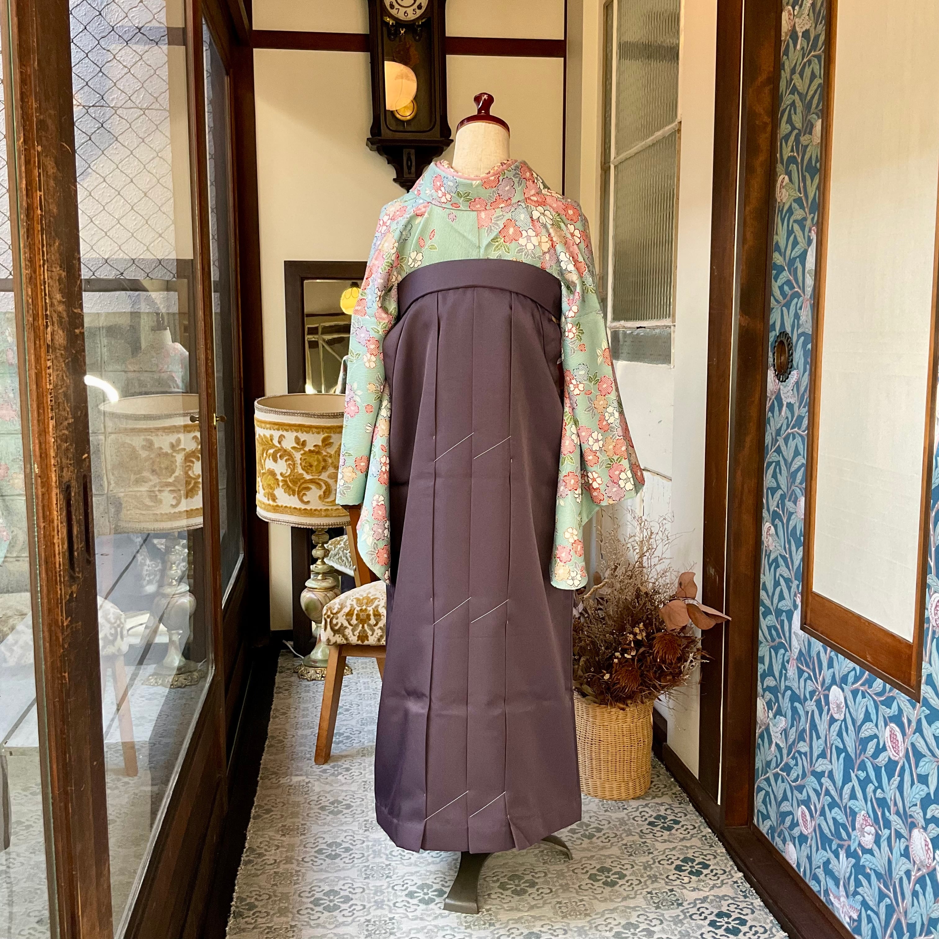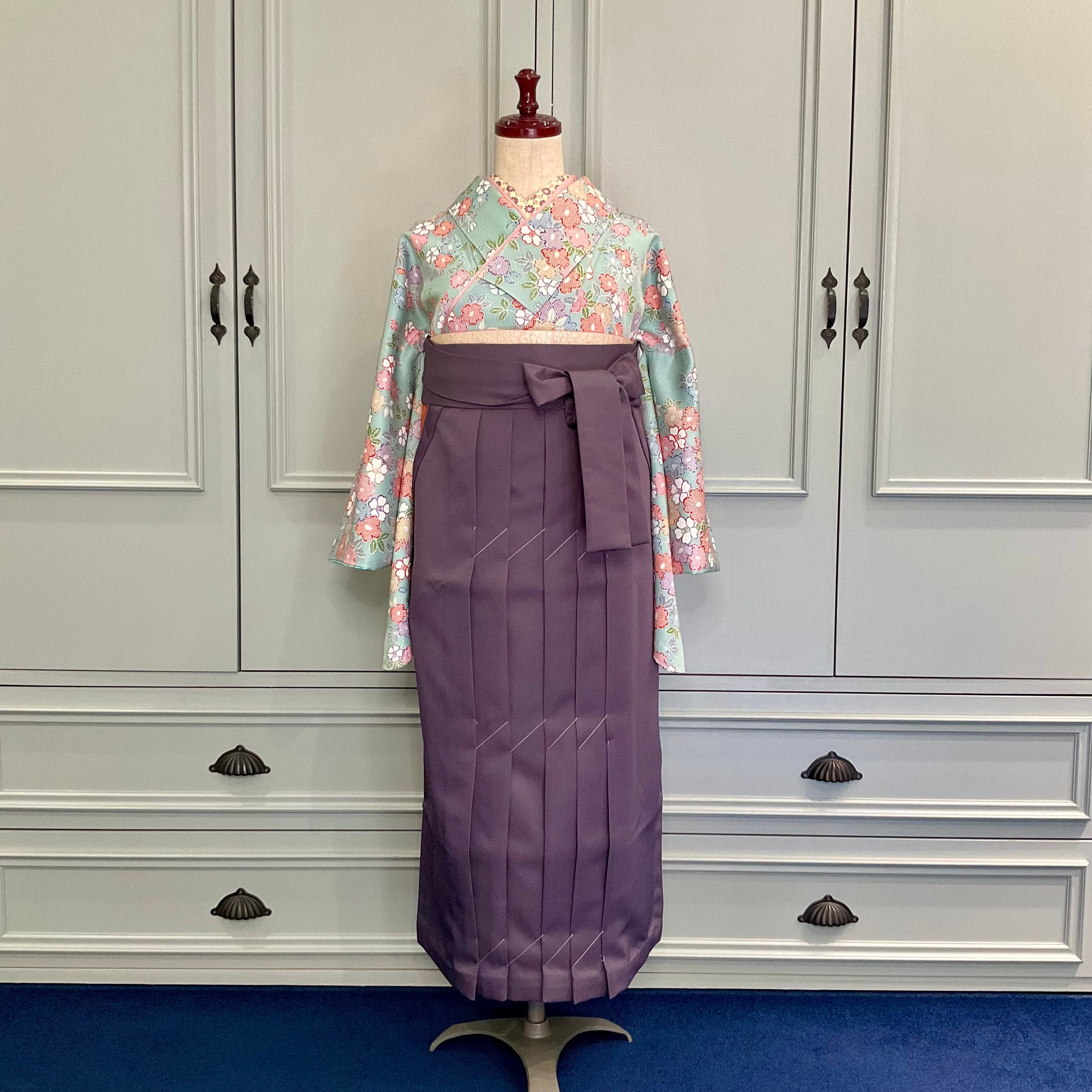 淡めのブルーグリーンの地色に、色とりどりの花模様が可憐でかわいらしい袷の小紋着物にパープルブラウン(葡萄鼠)の大人カラーの袴を合わせました♩