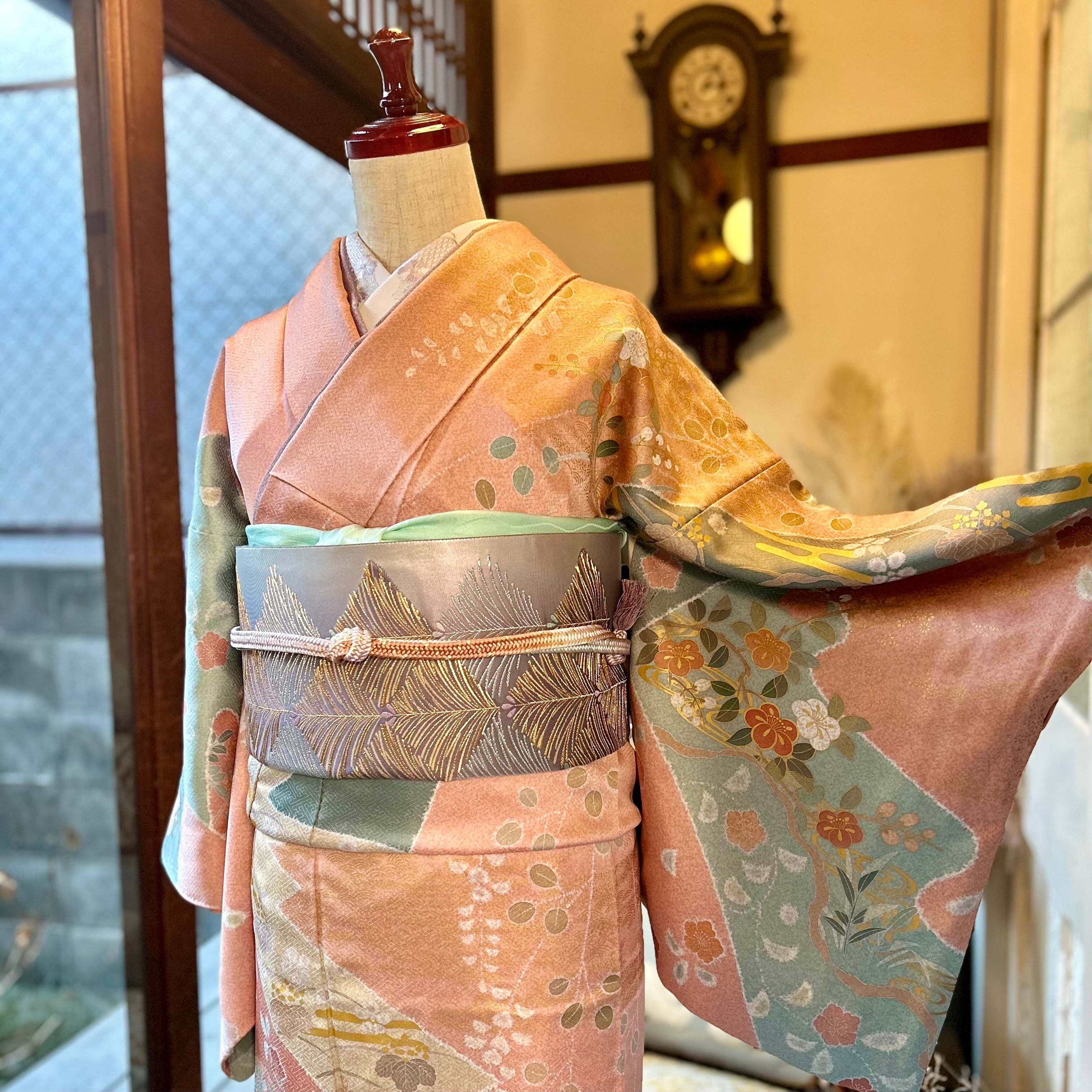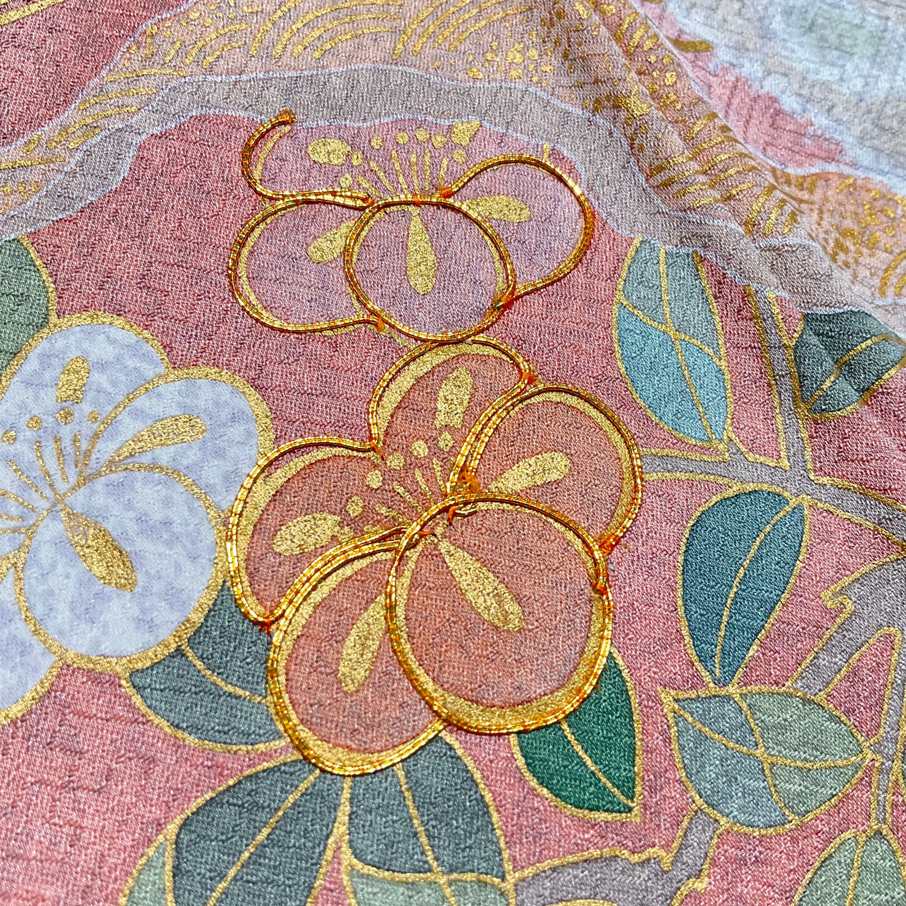 やわらかな珊瑚色の地色に浮かぶ、やさしい風合いの藤や梅の花模様