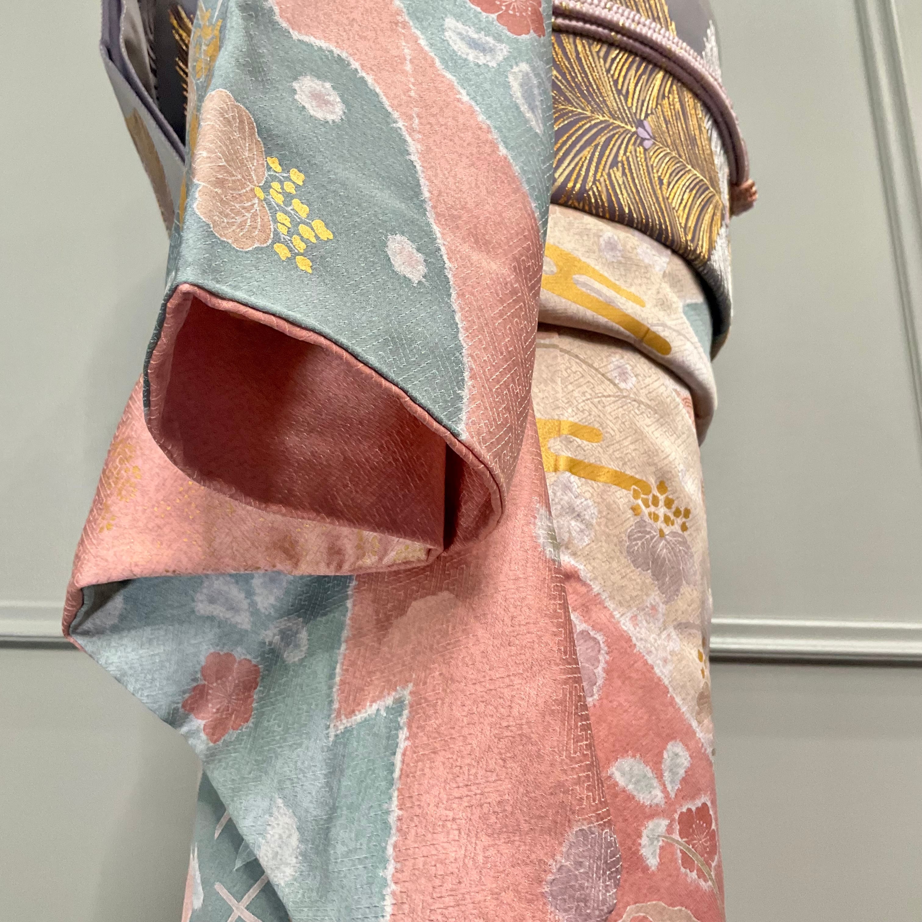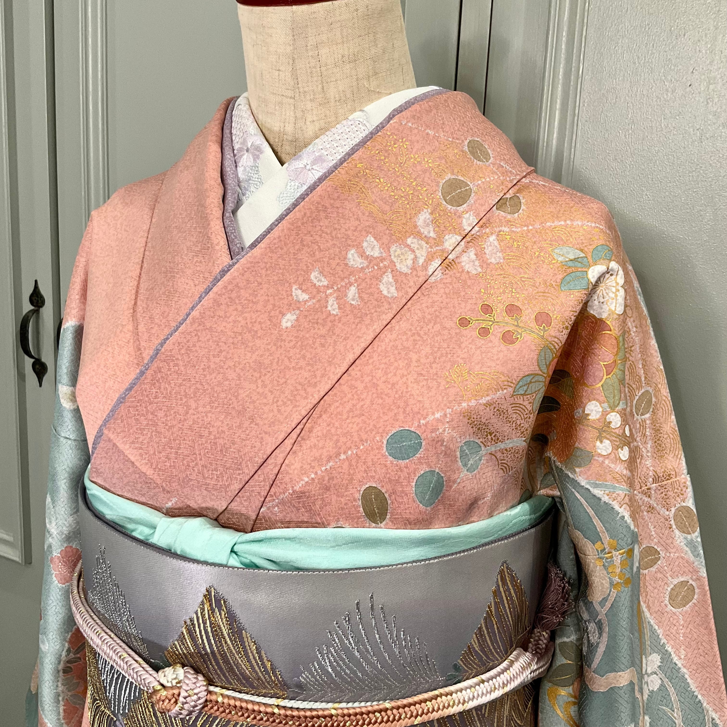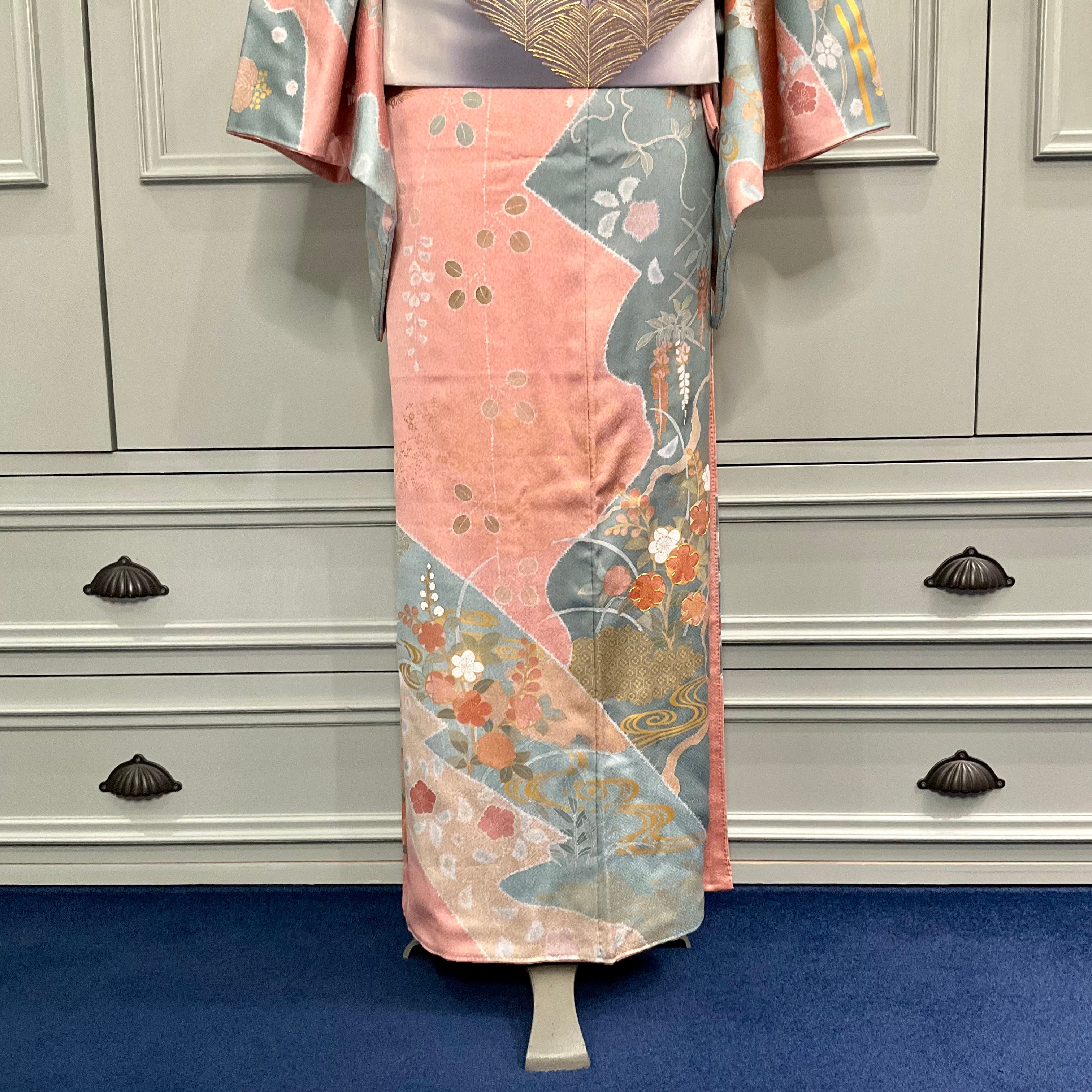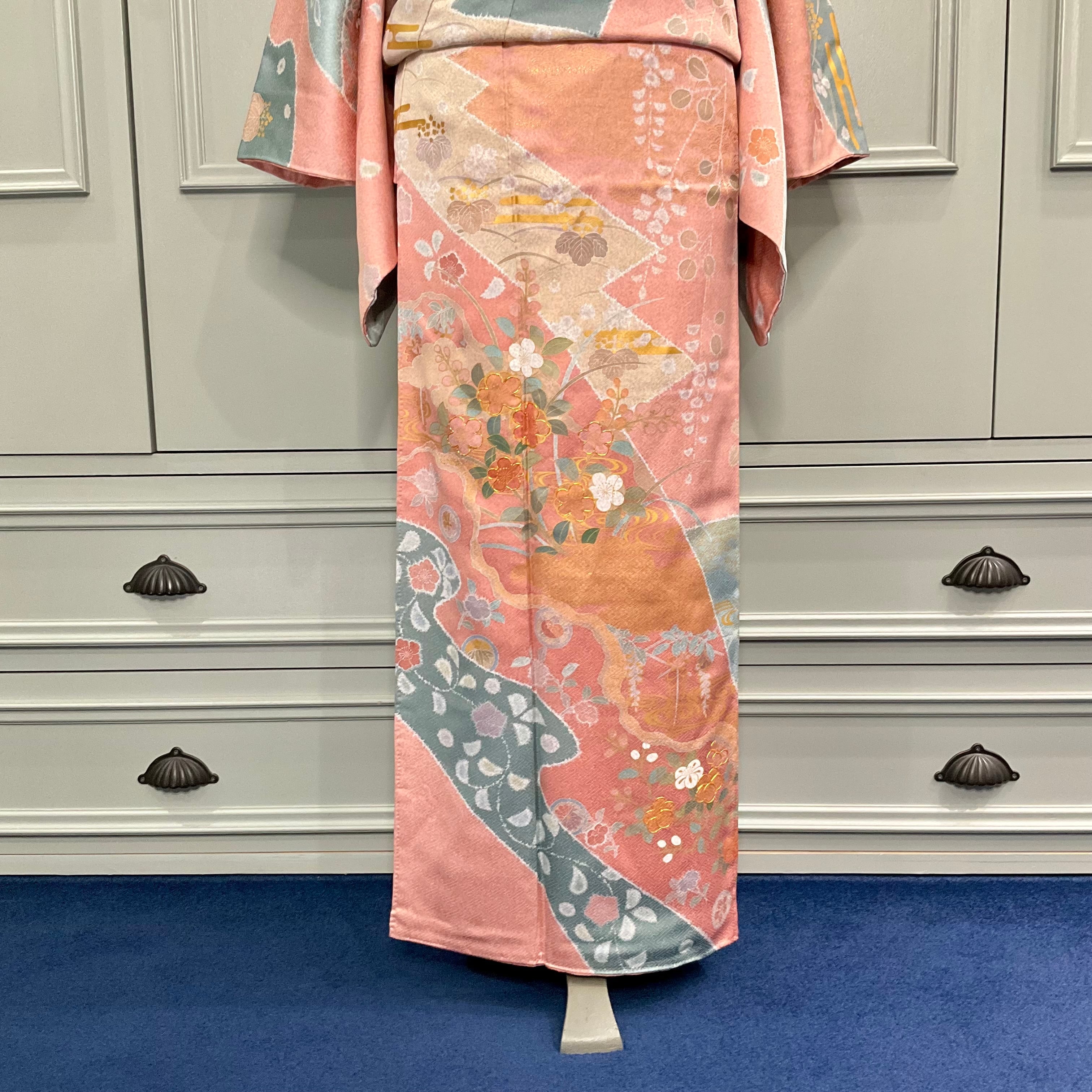 訪問着は、珊瑚色の地色に青碧色の切替、やわらかな花模様に金彩のきらめきが、彩りやさしく華やかに描かれた上品な訪問着です