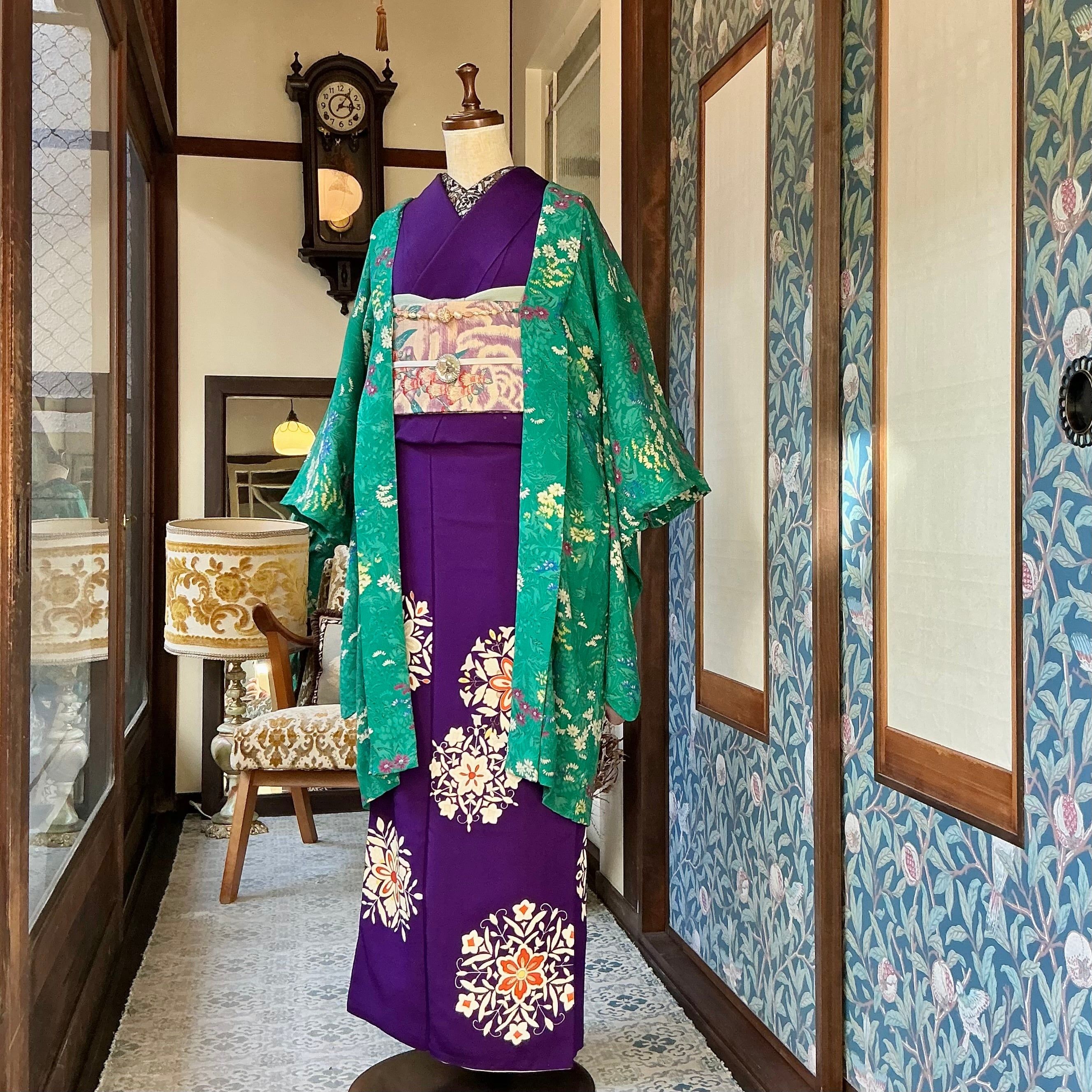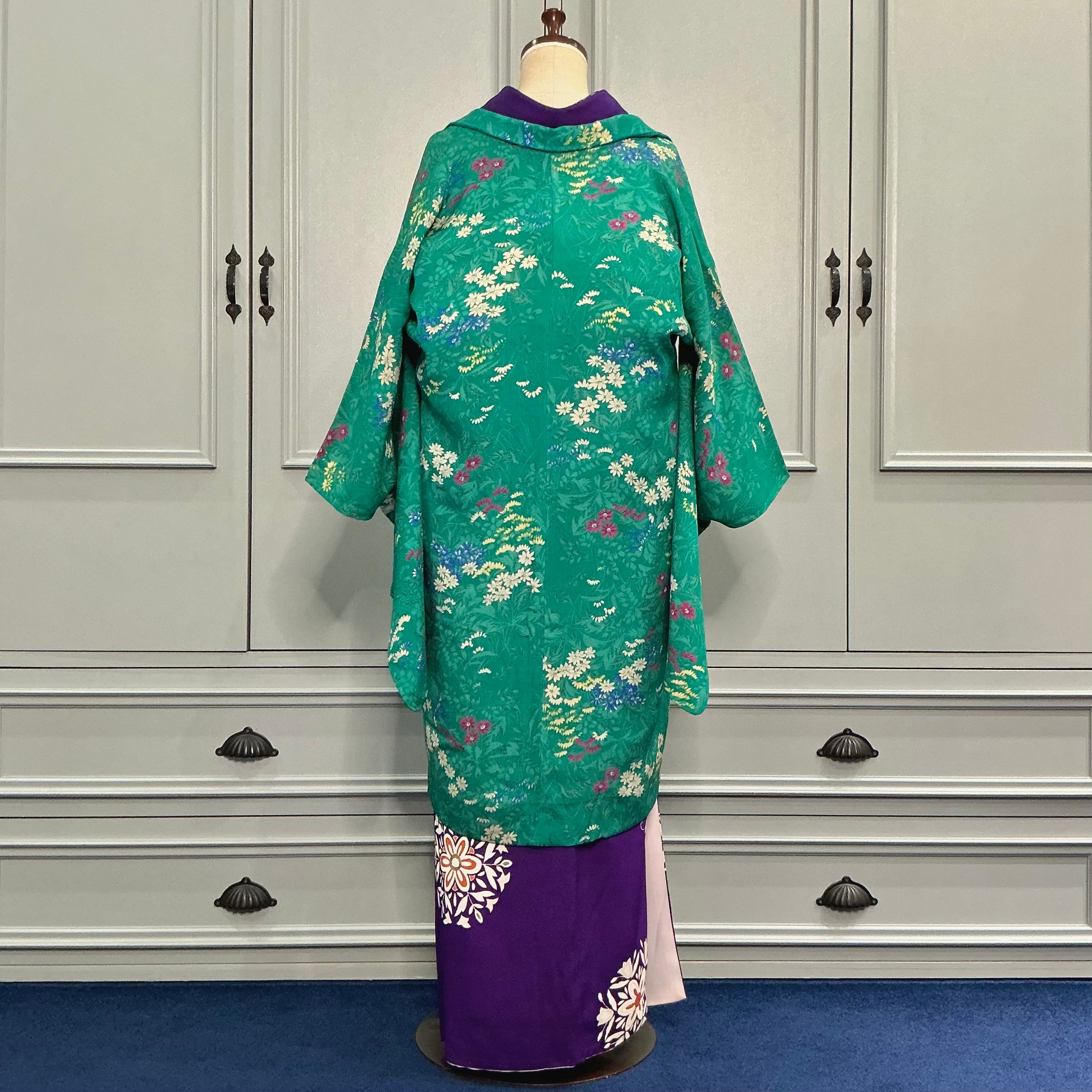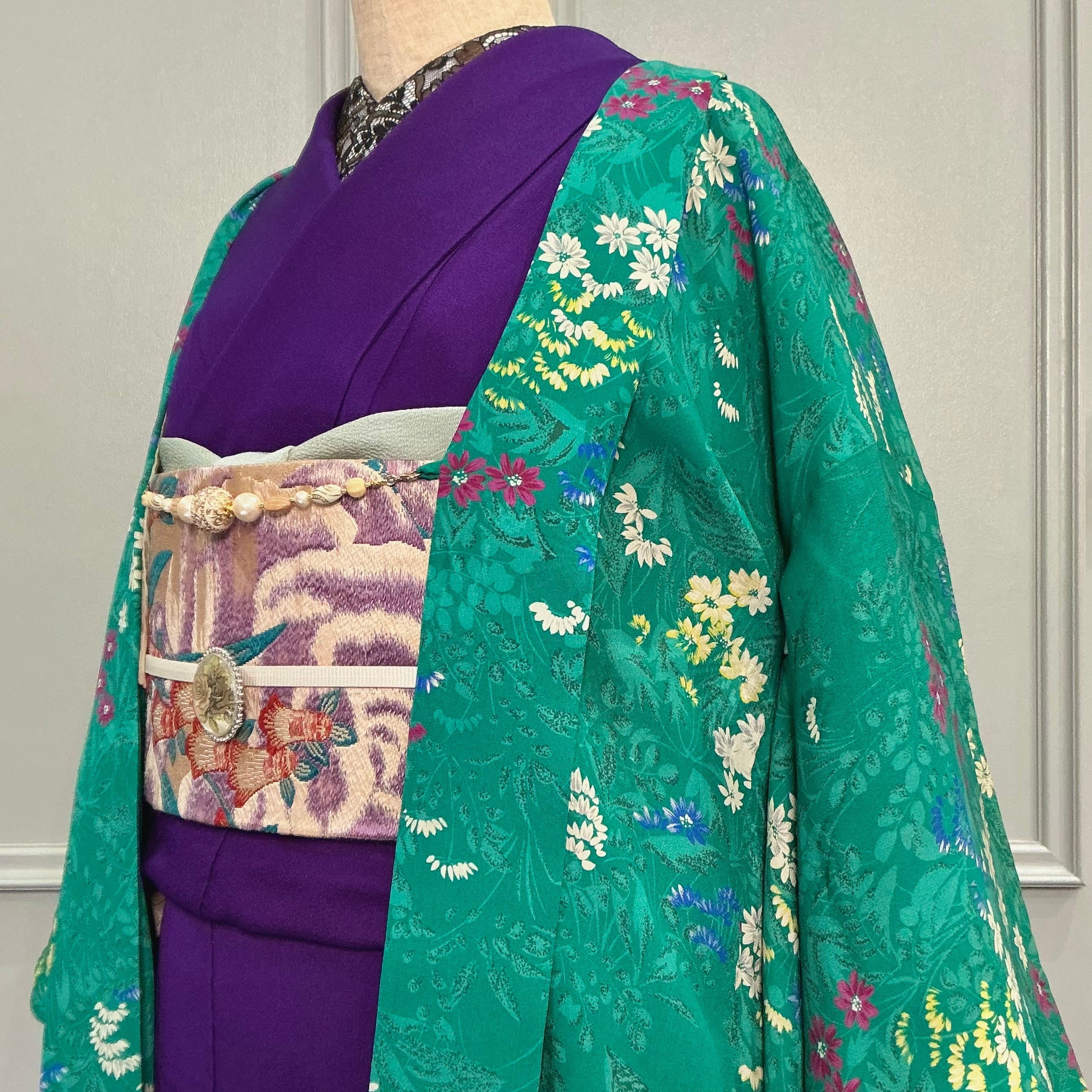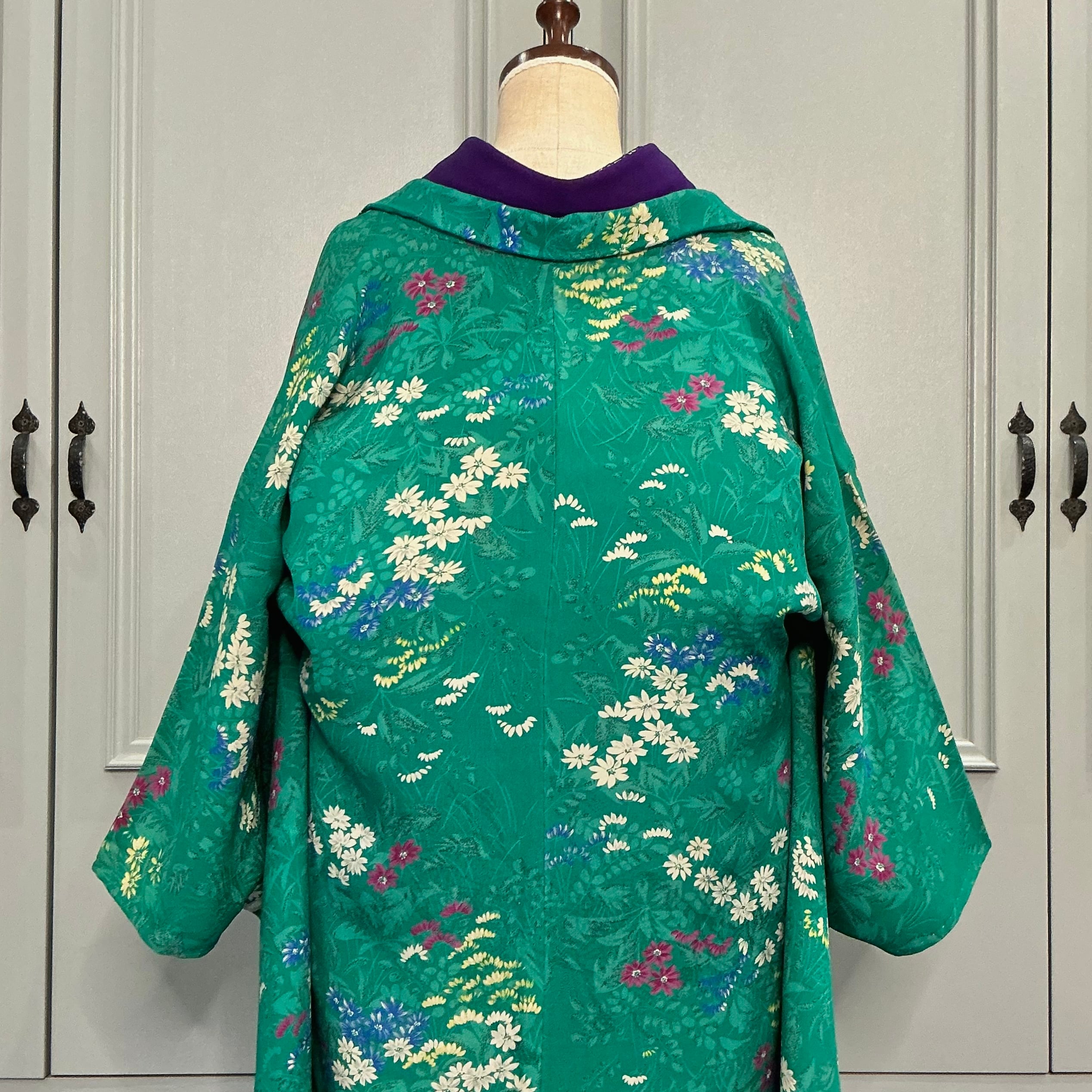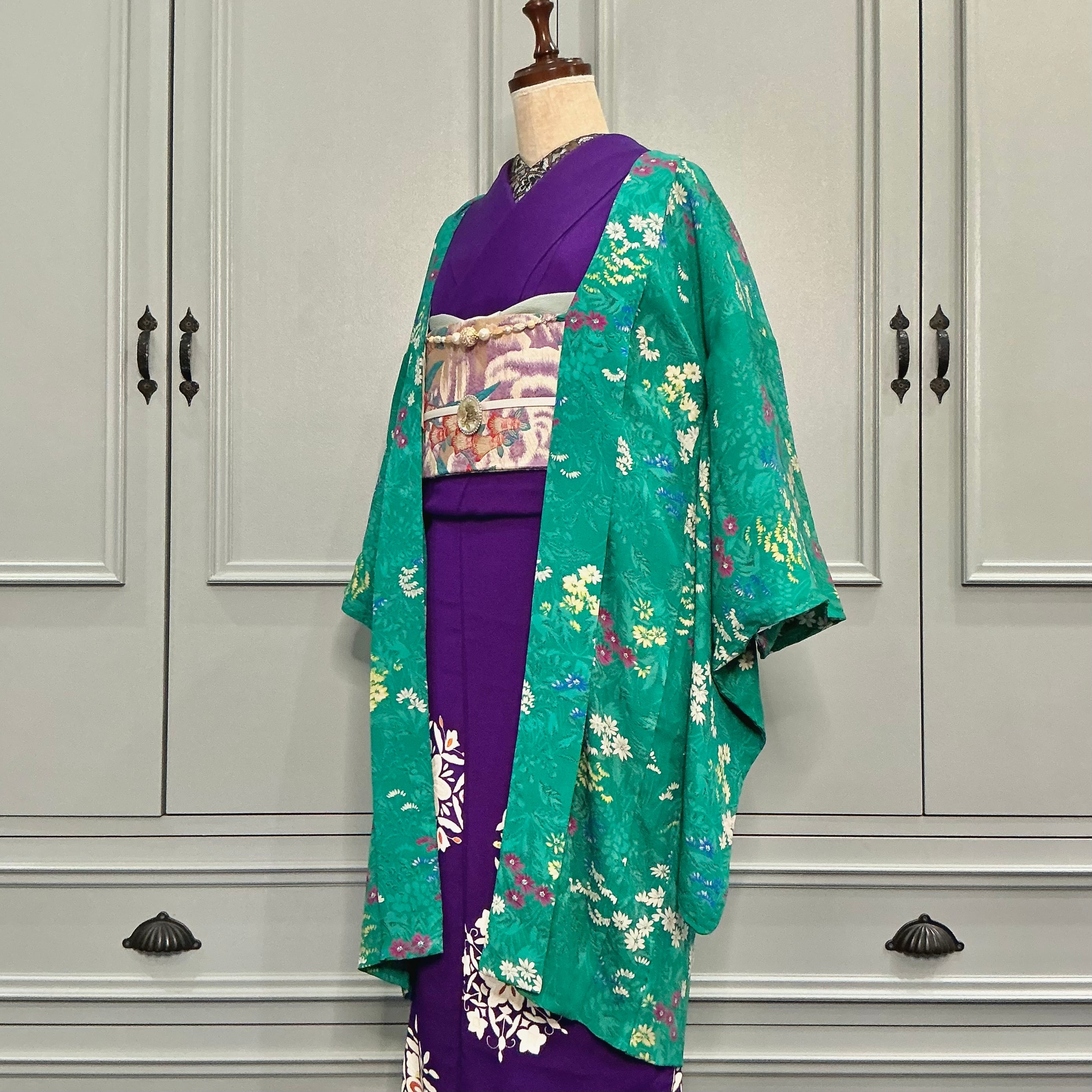 綺麗なグリーン地に小花が描かれたアンティーク長羽織です