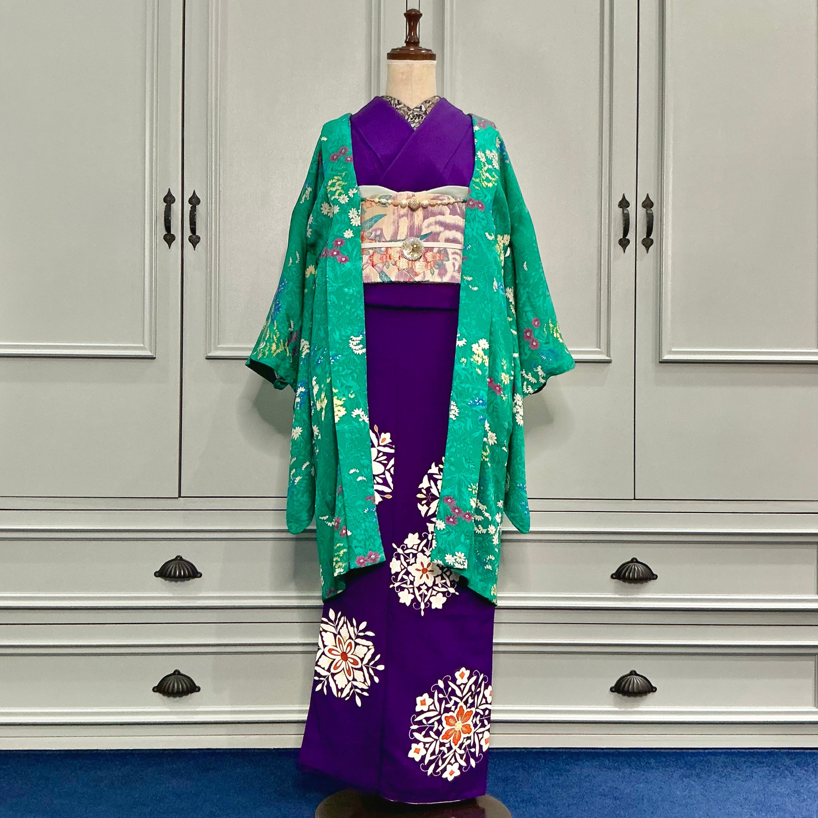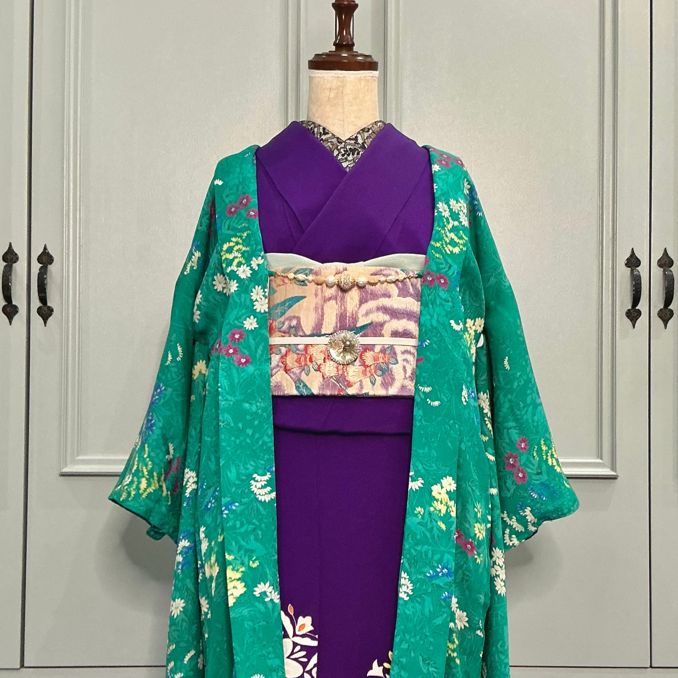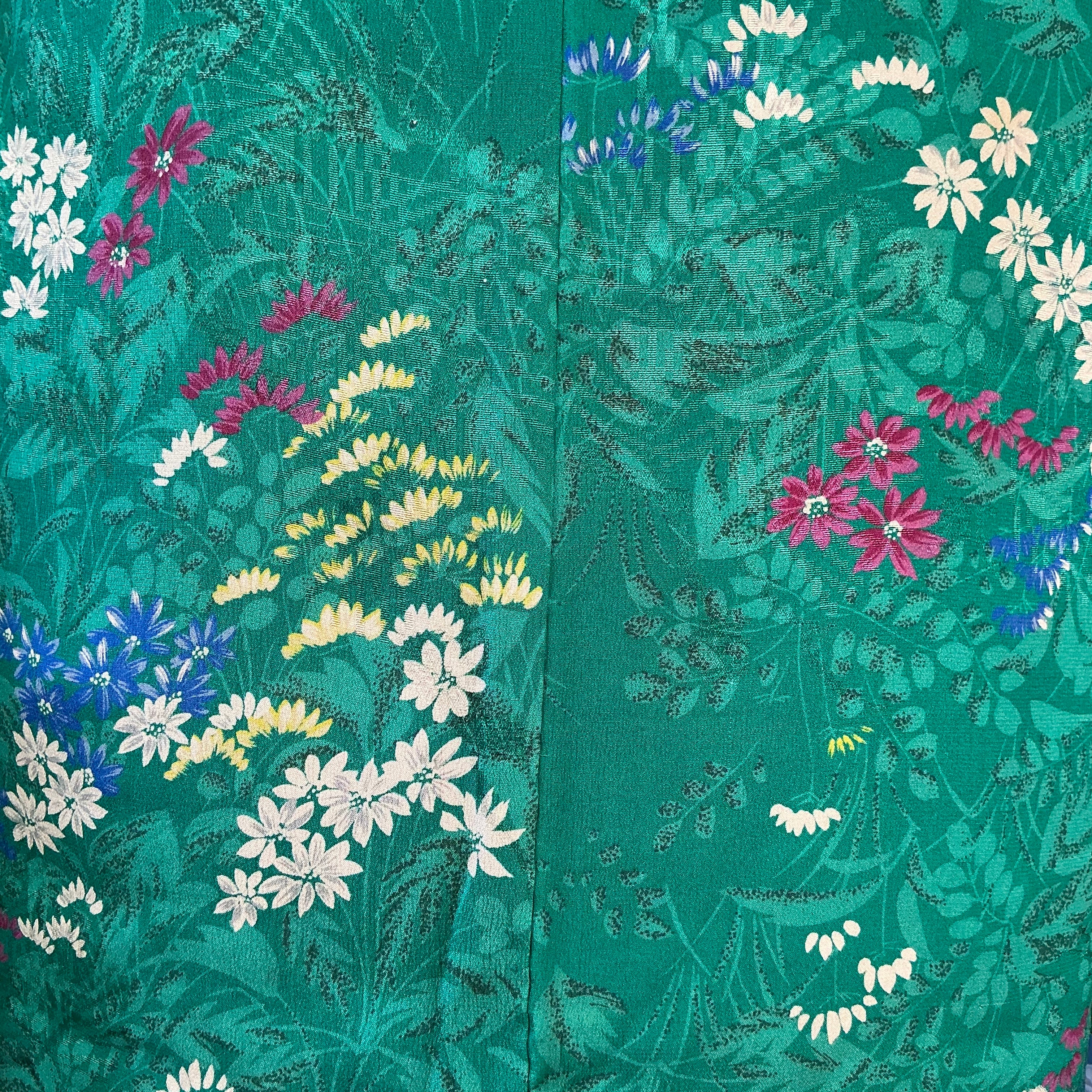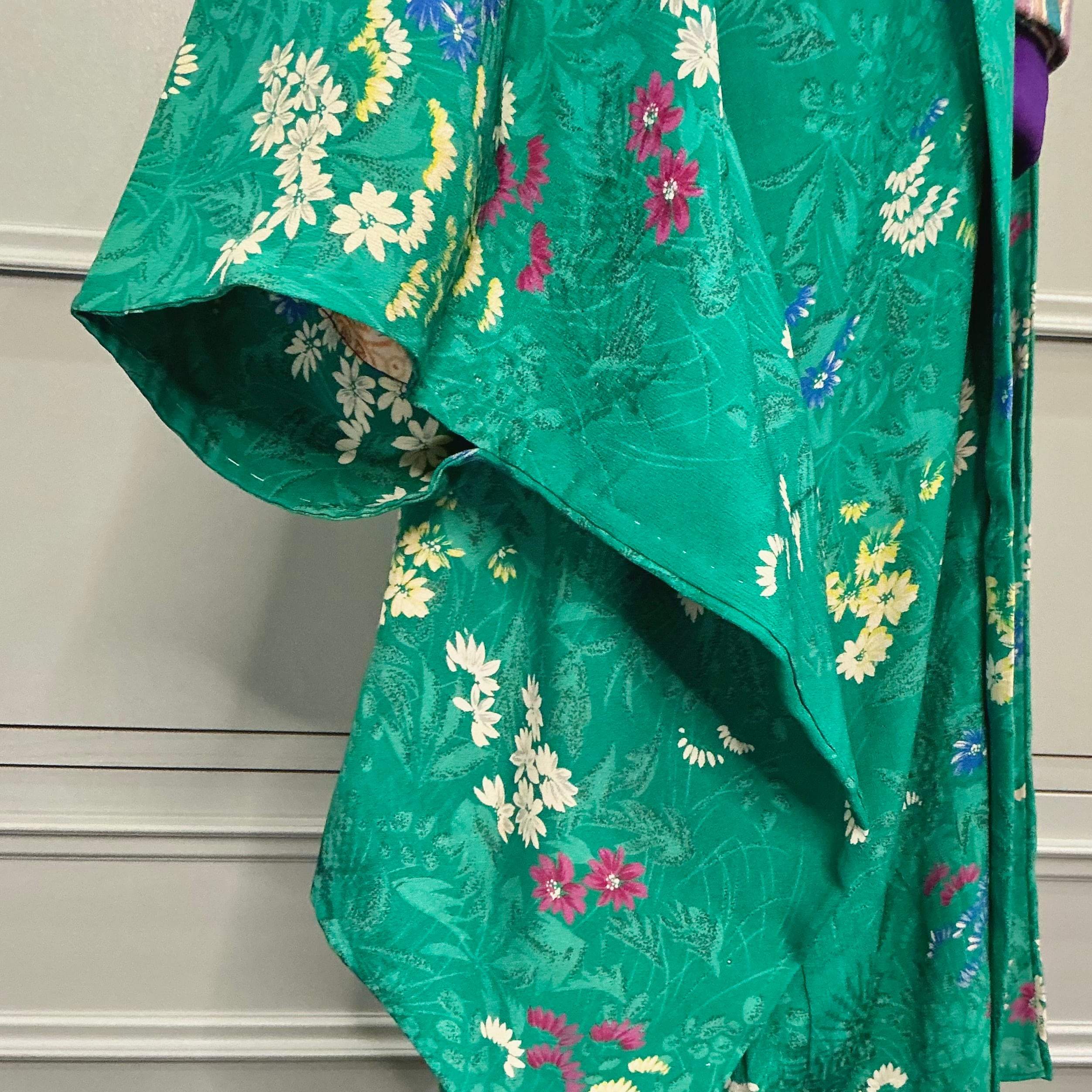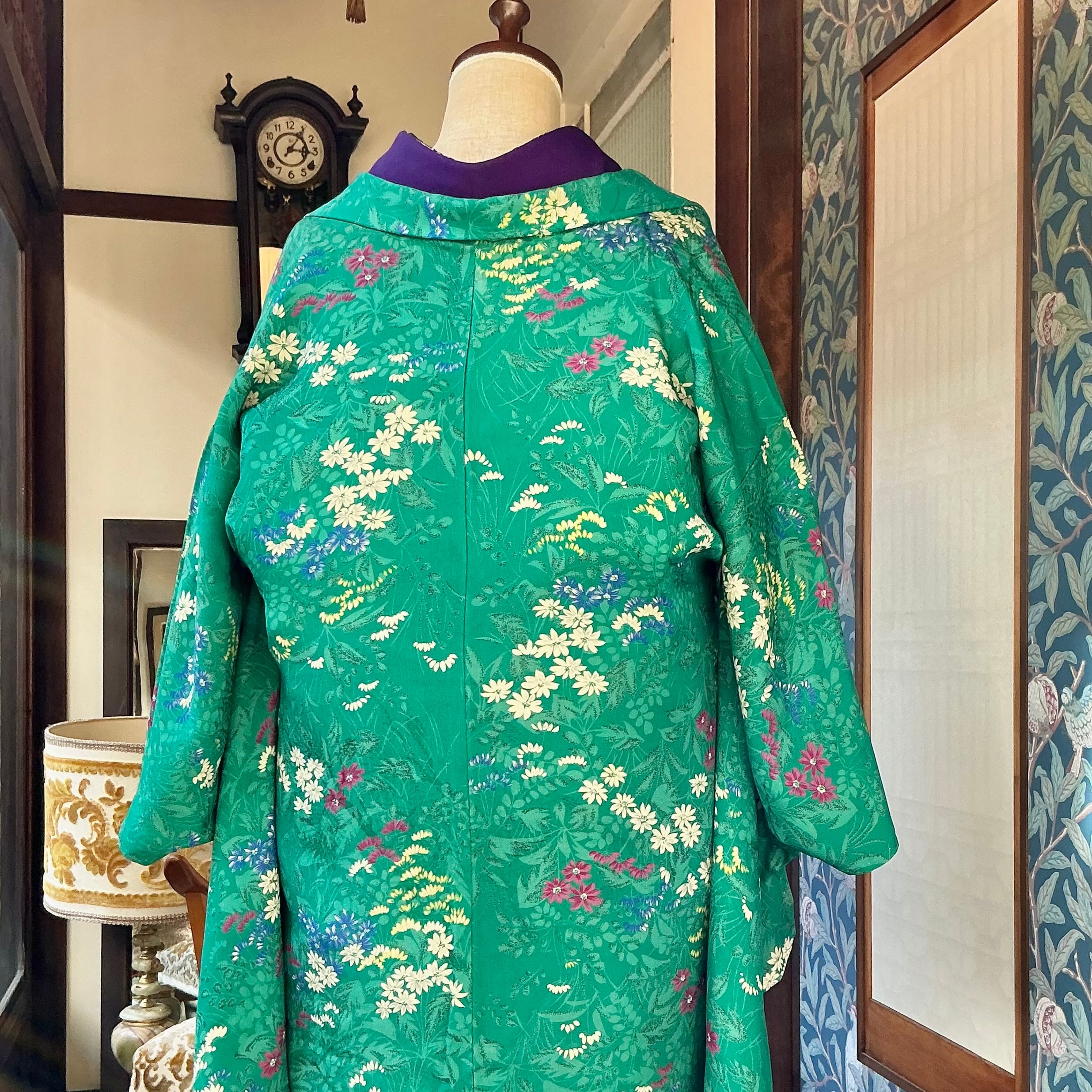 綺麗なグリーン地に小花が描かれたアンティーク長羽織です