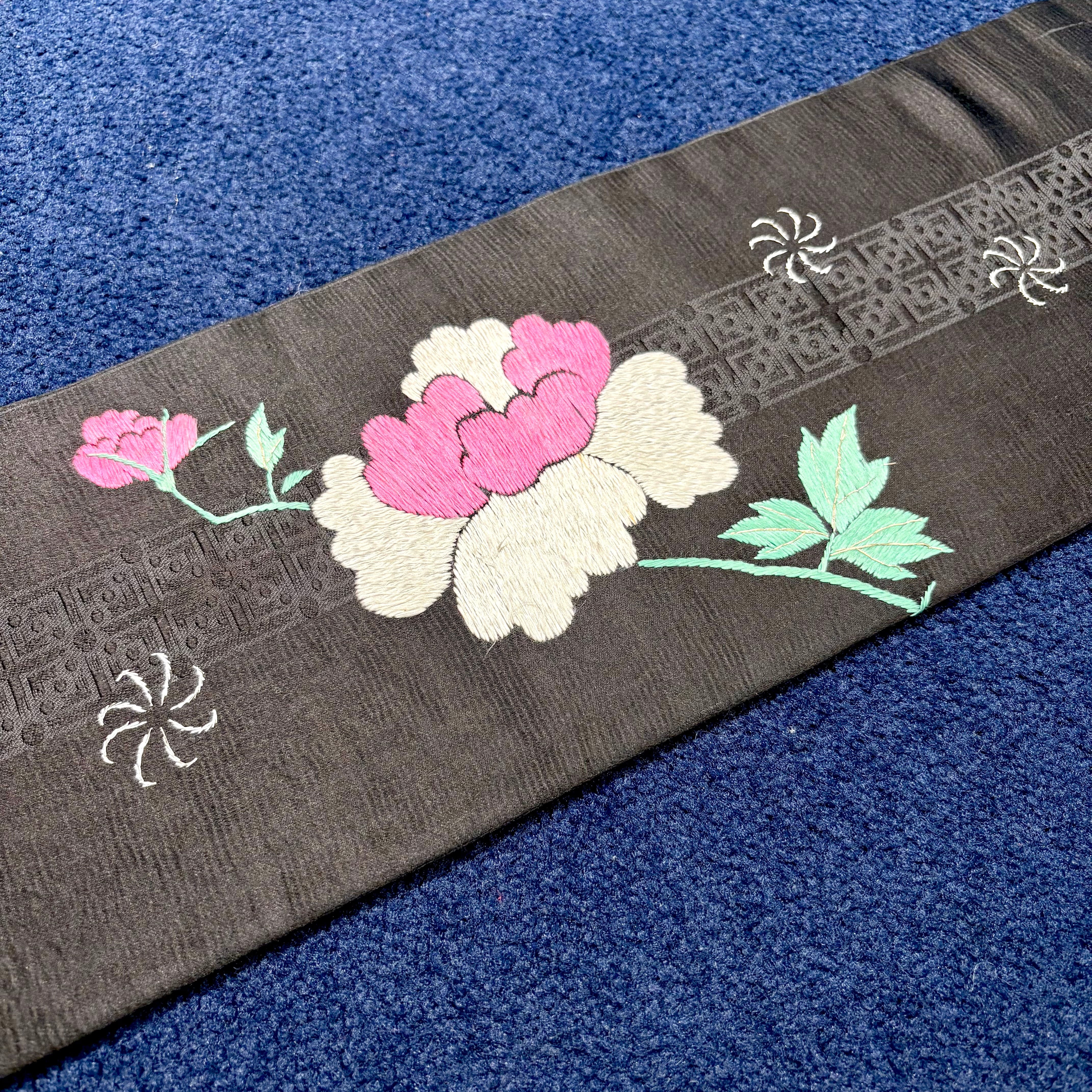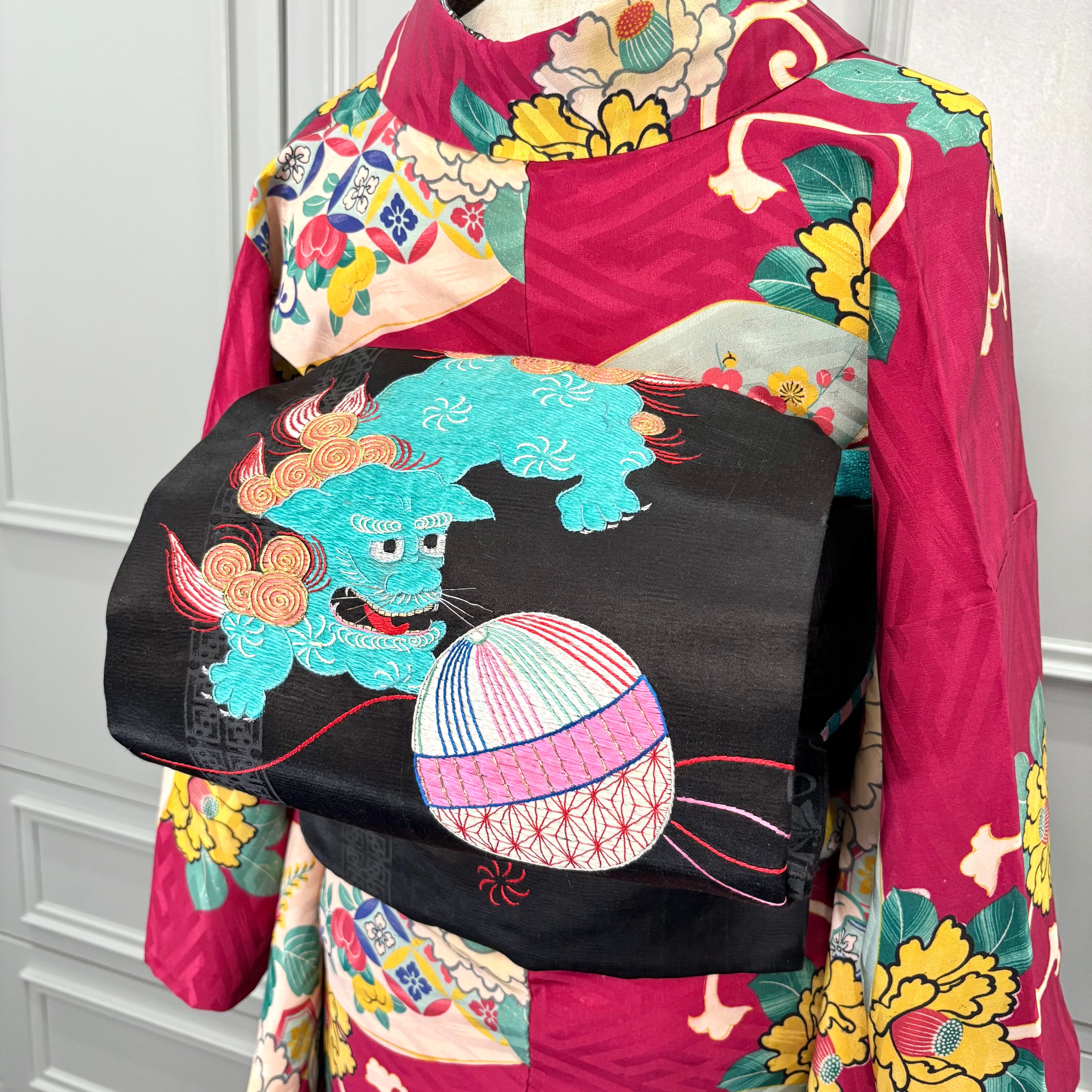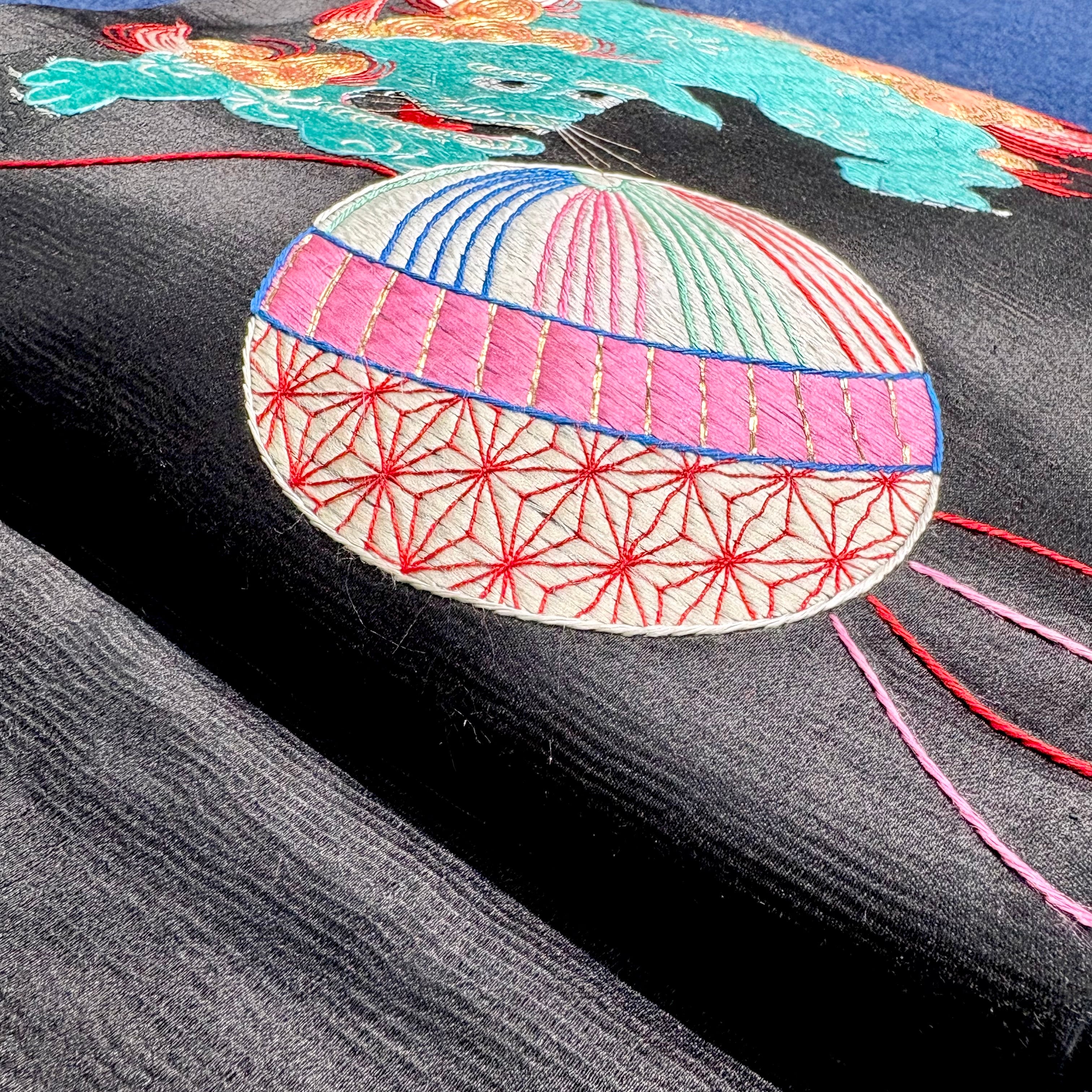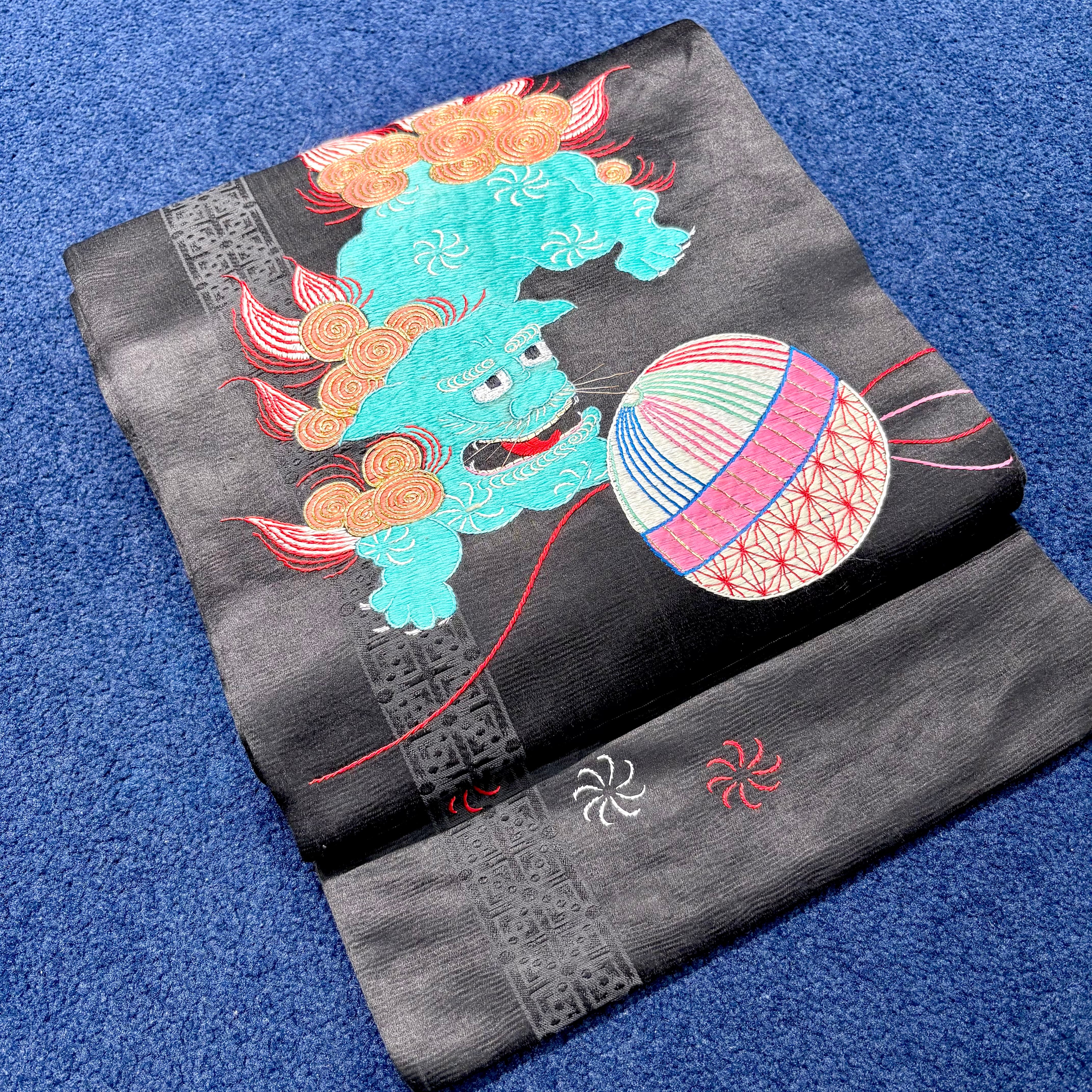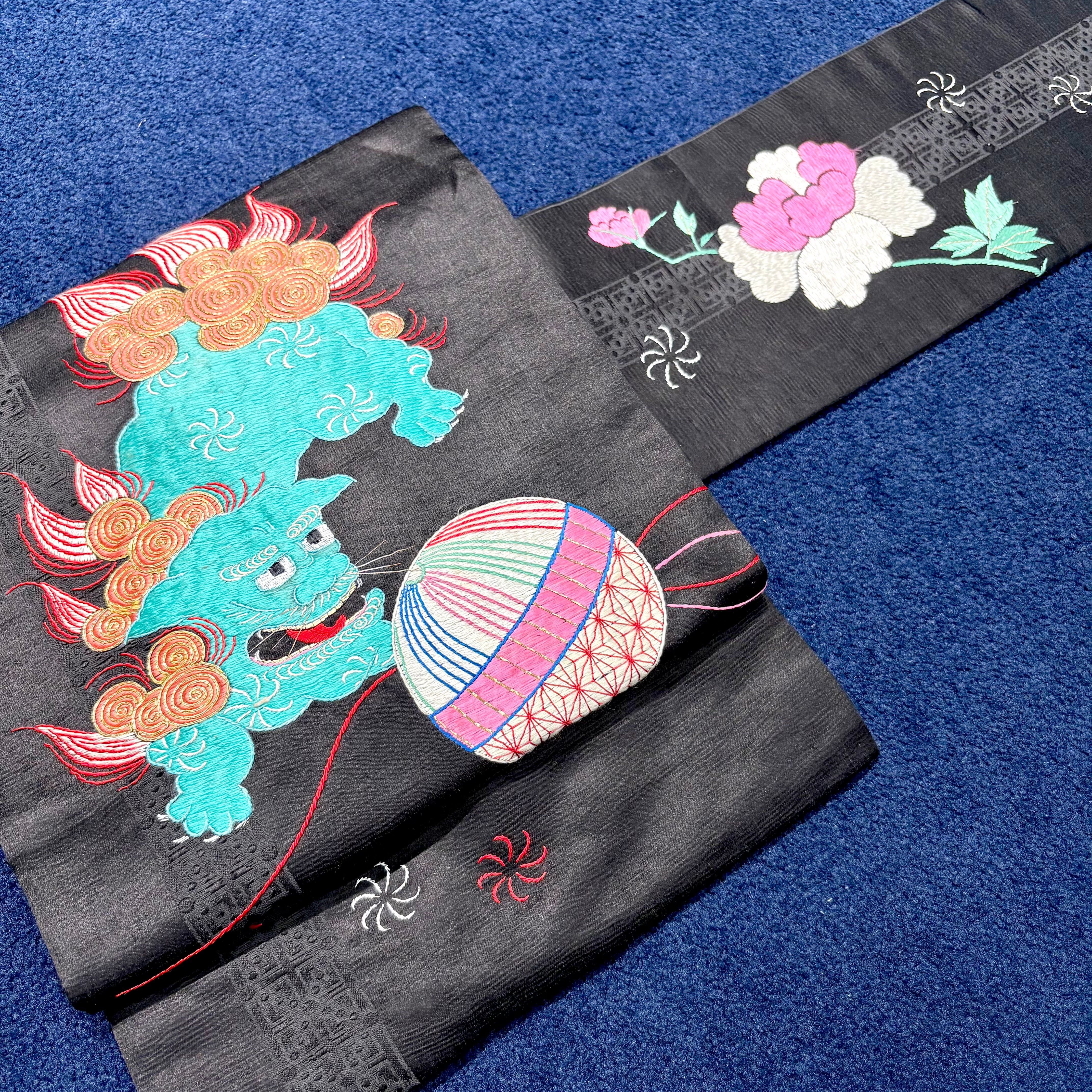 獅子のお遊び*鞠 毬 まり 牡丹 刺繍 黒繻子 アンティーク名古屋帯 B541