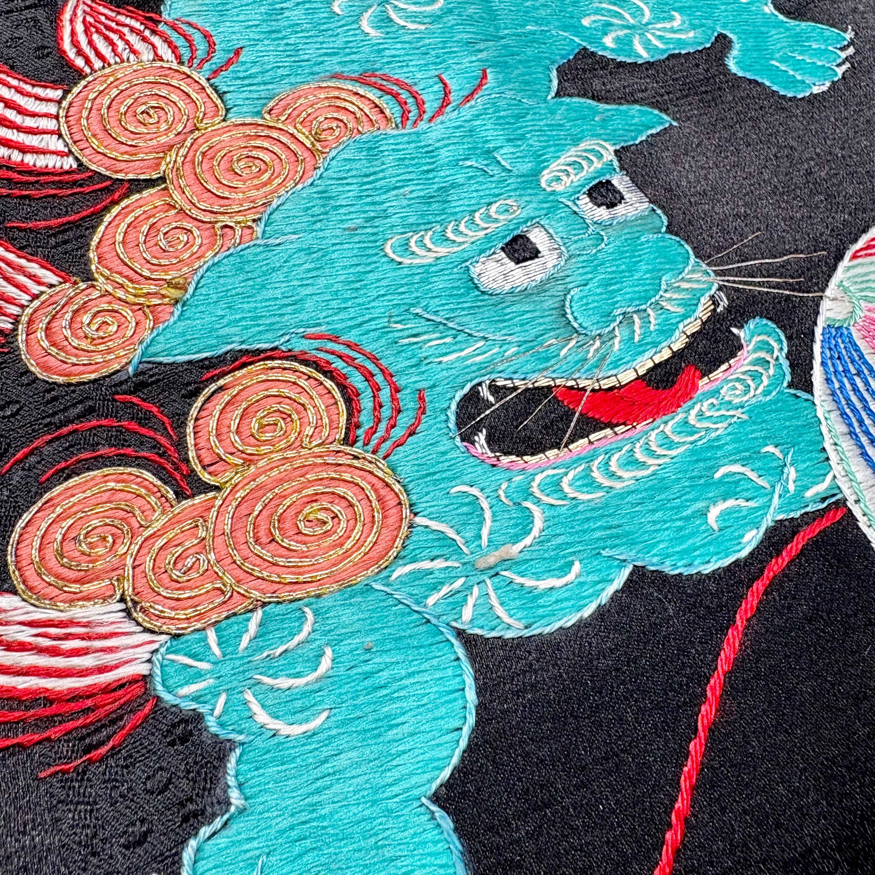 黒繻子の地に、獅子と鞠、牡丹の刺繍が施された名古屋帯です