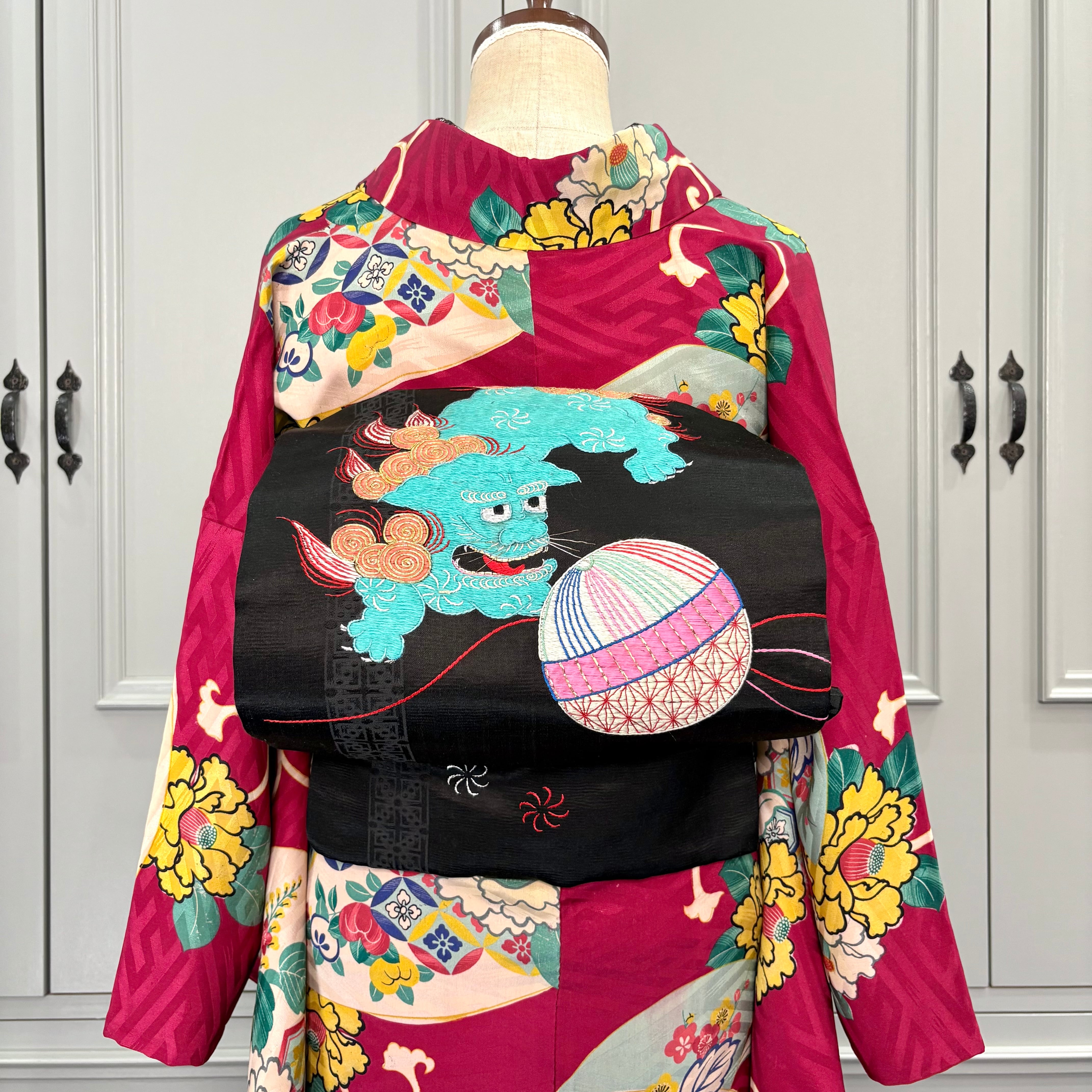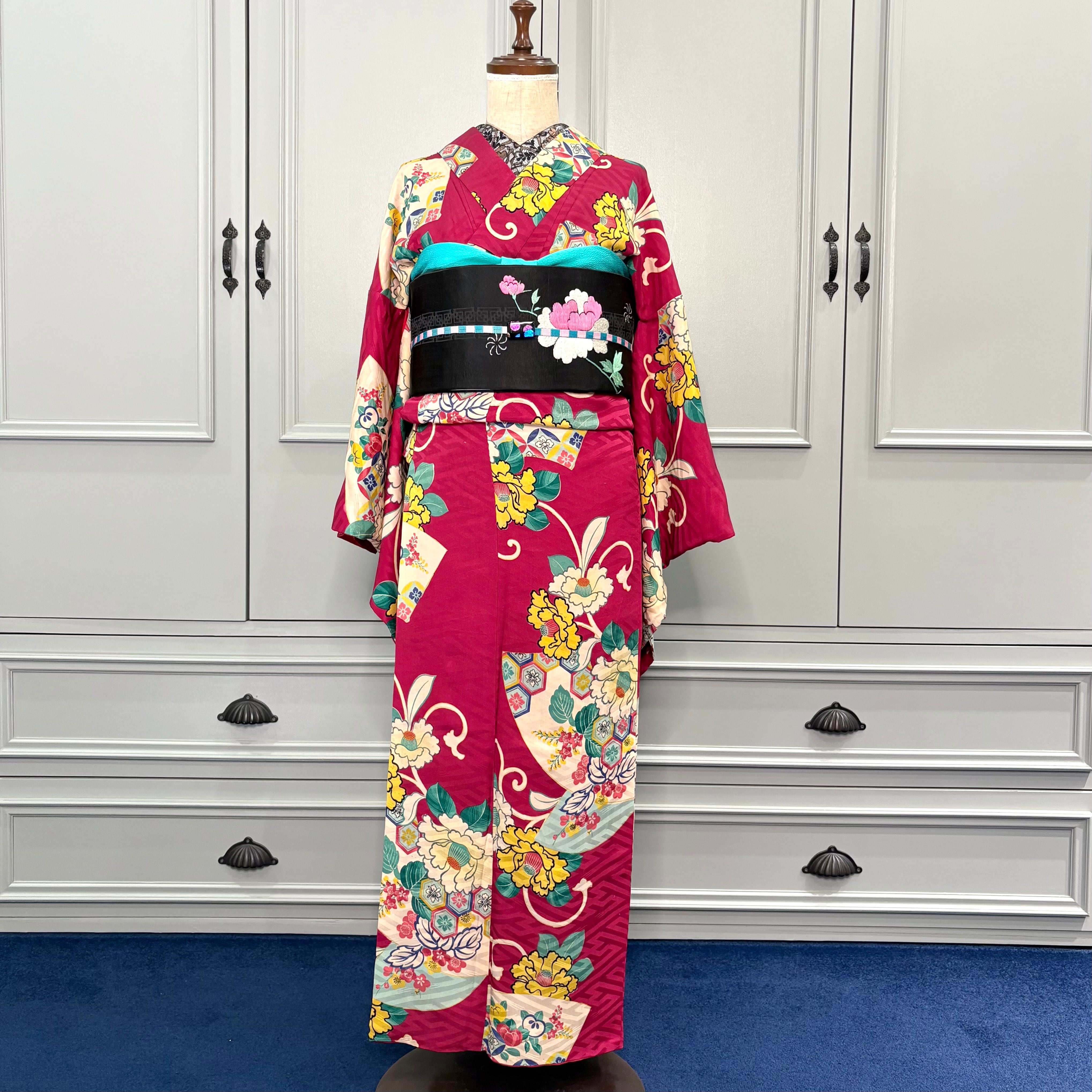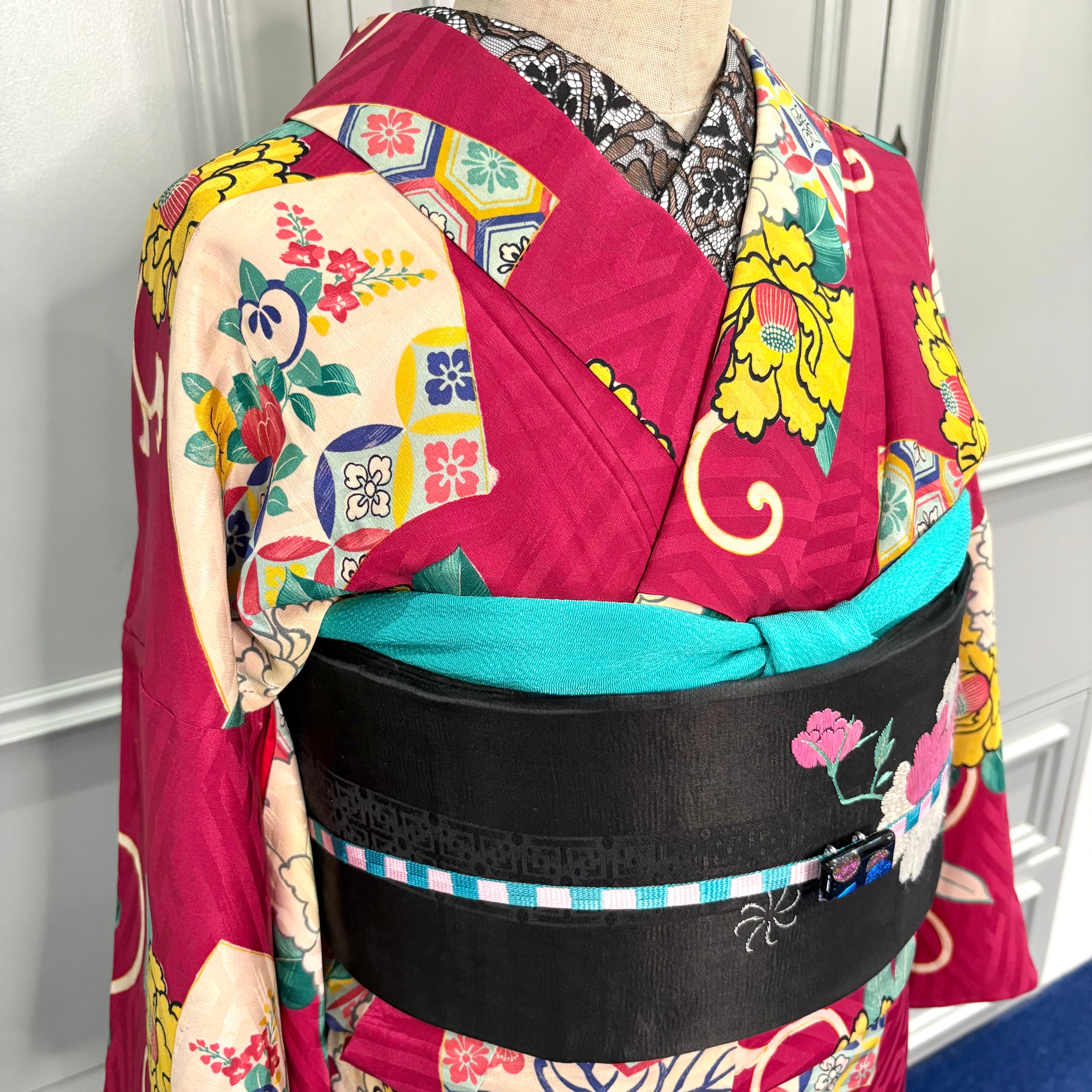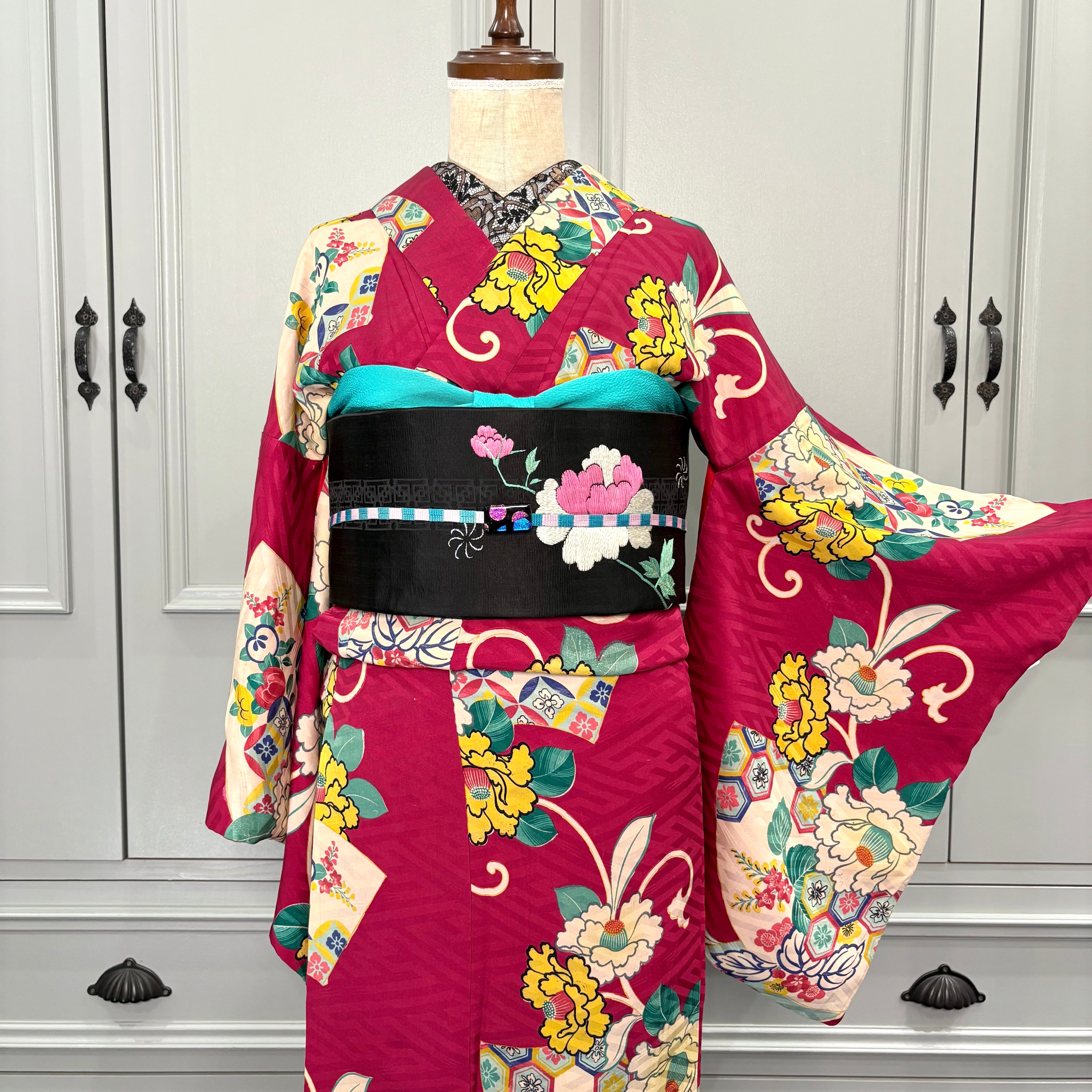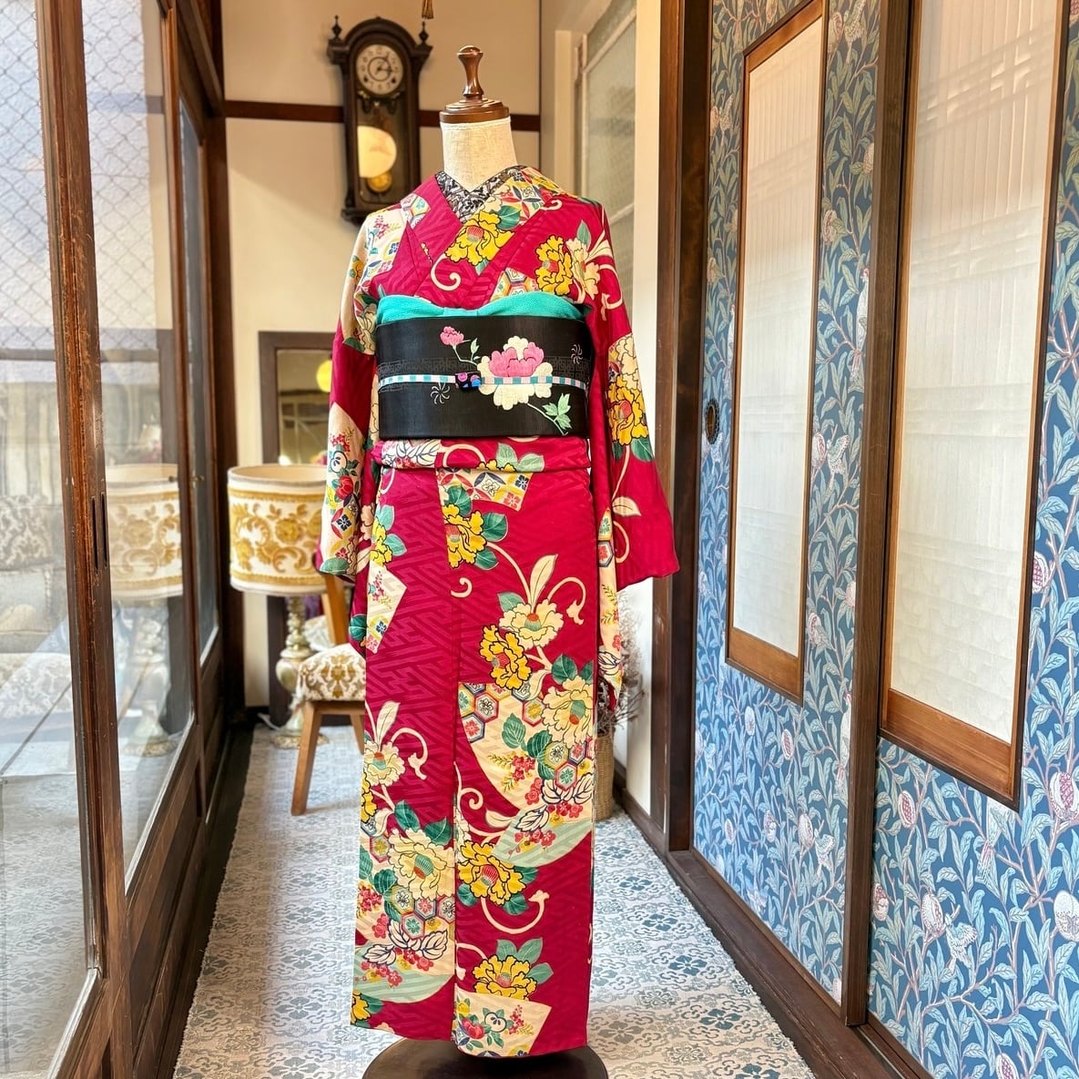 華やかなアンティークの帯や羽織を合わせて、こってりアンティークコーディネートで、クリスマスシーズンにも、初詣コーデなどもオススメです♩