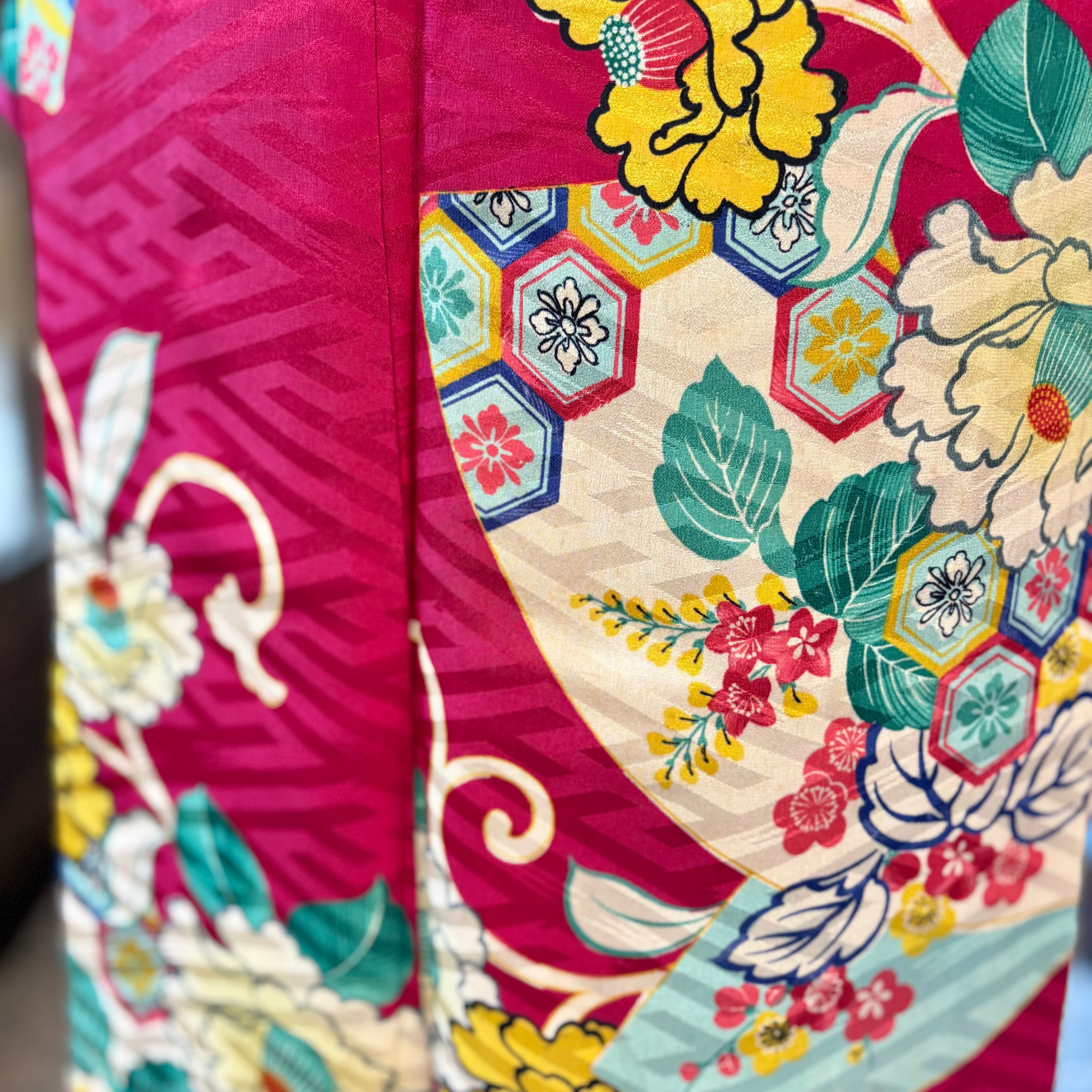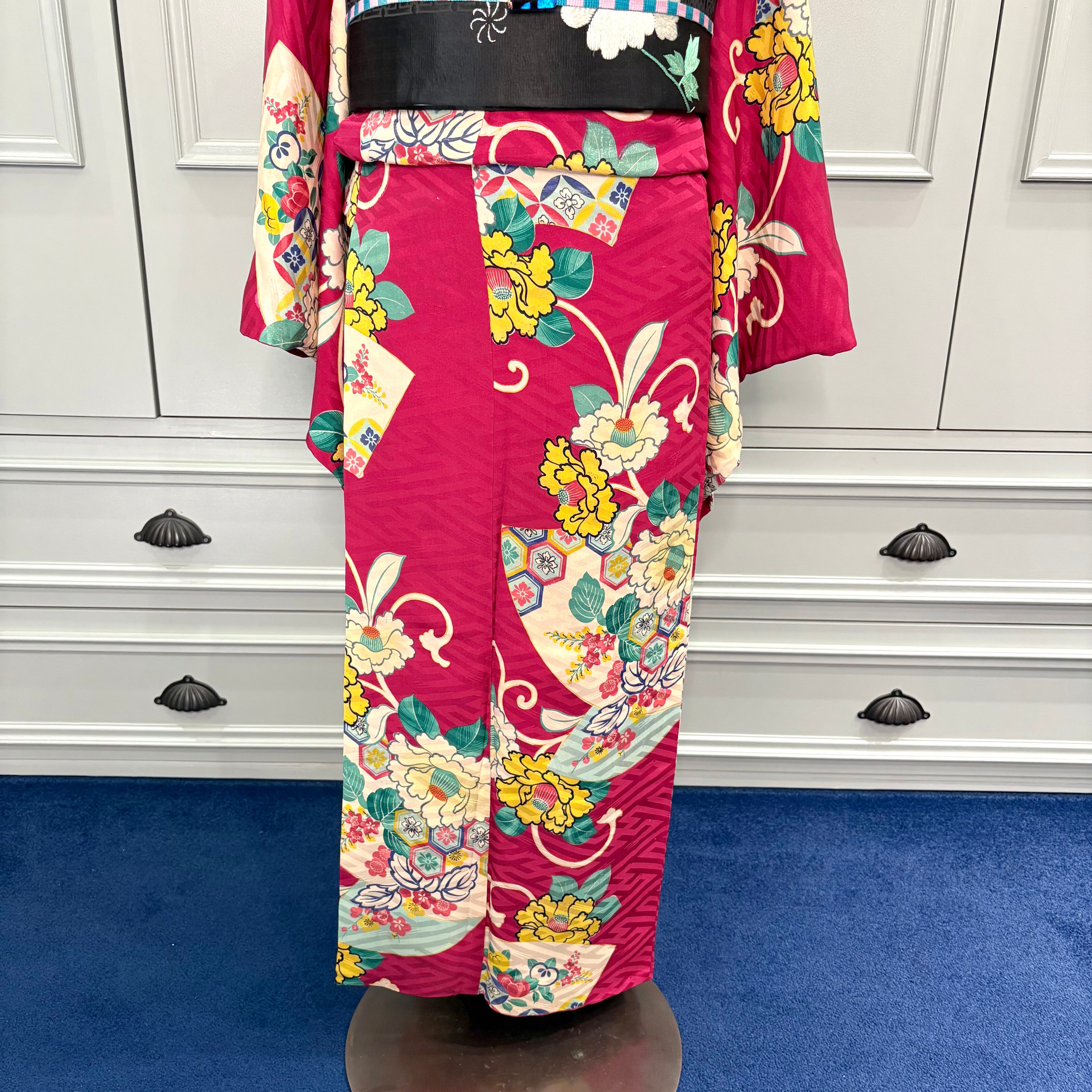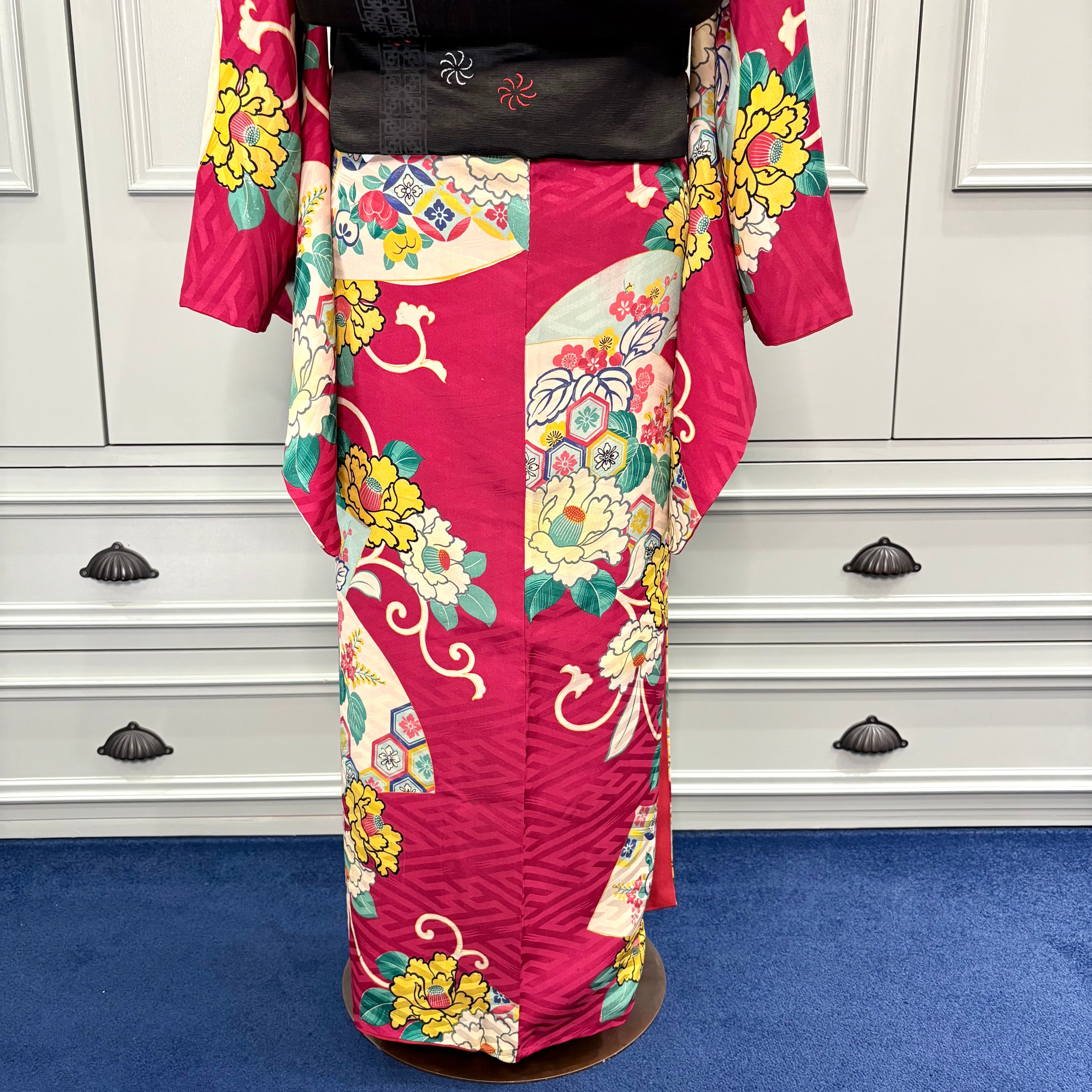 ラズベリーレッドの地色に、扇面と椿の花が描かれた袷のアンティーク小紋着物です