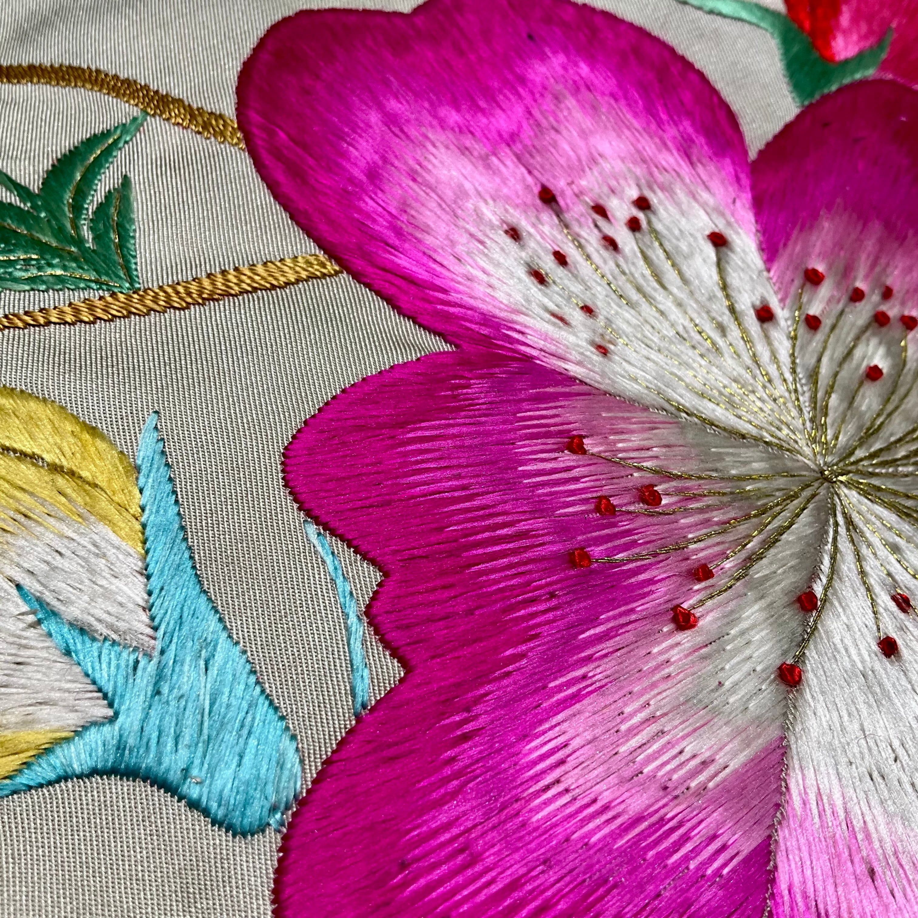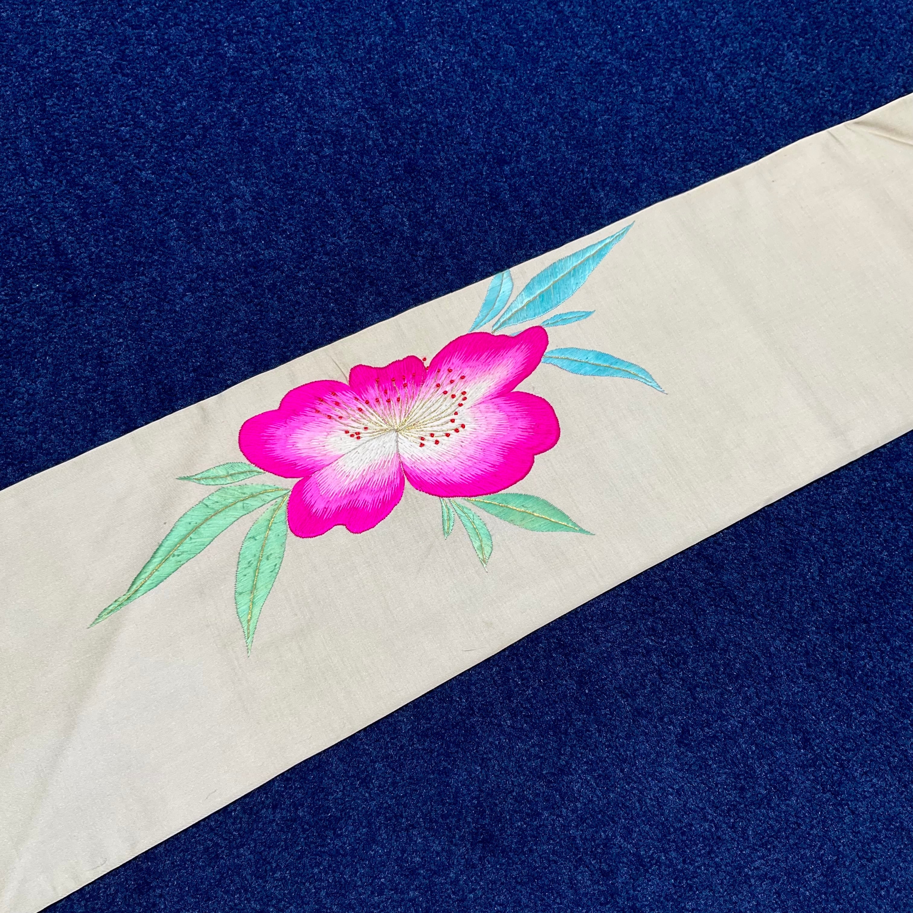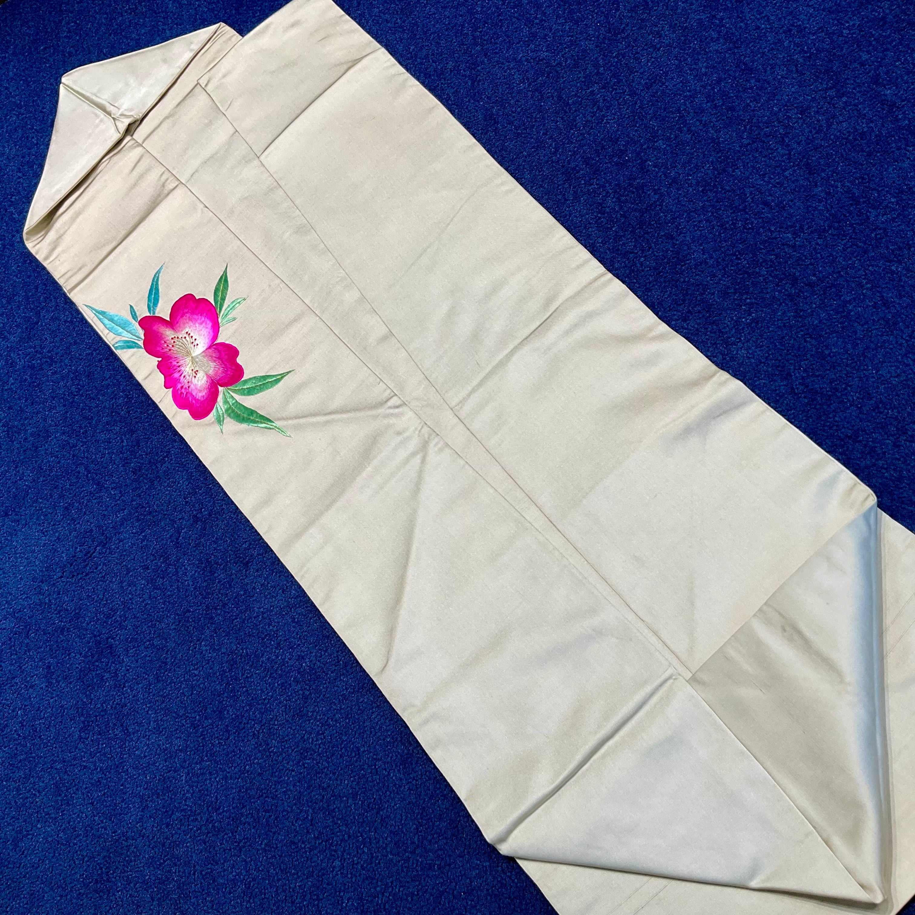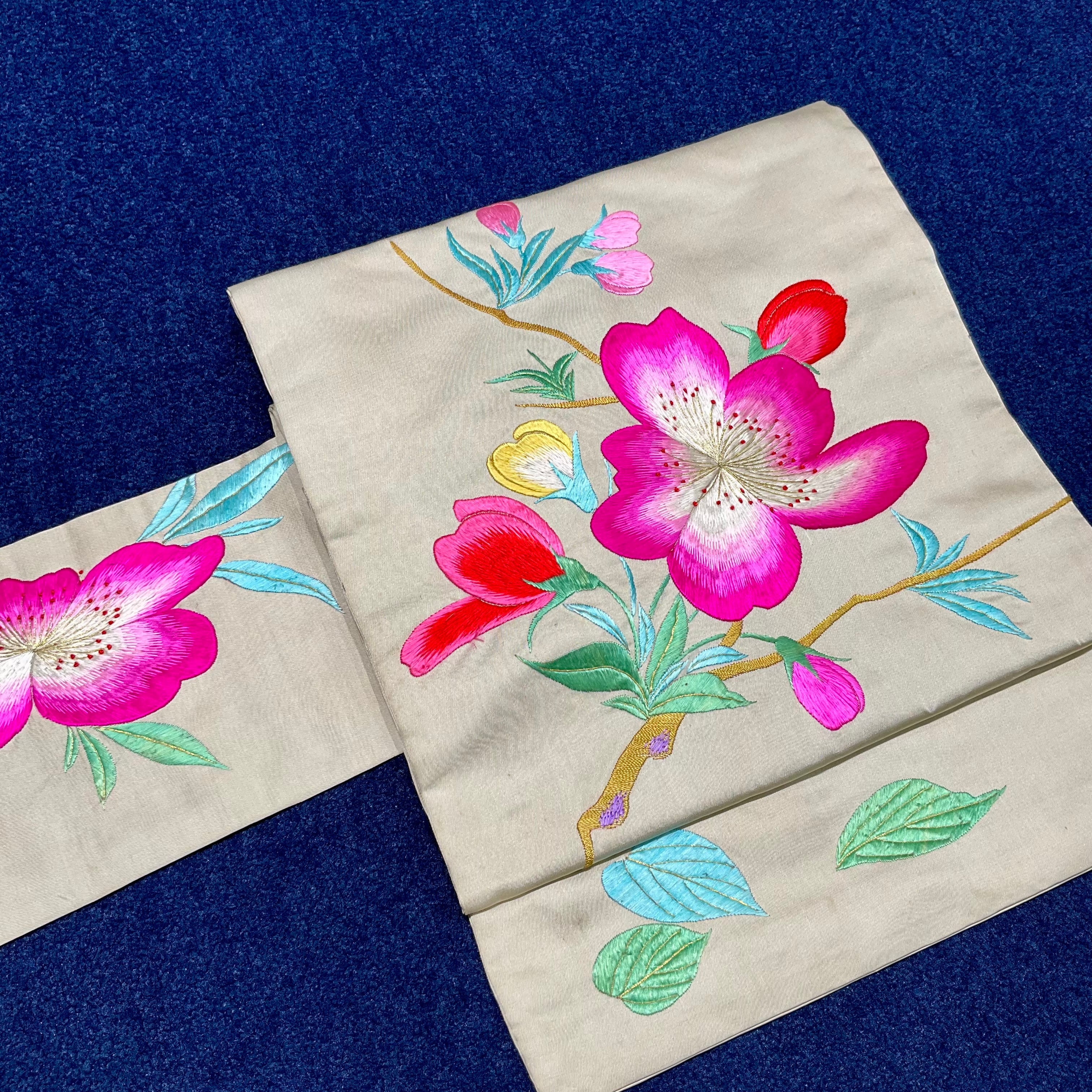 アイボリーの地色に、紅やピンクの緋桜が刺繍されたアンティーク名古屋帯です