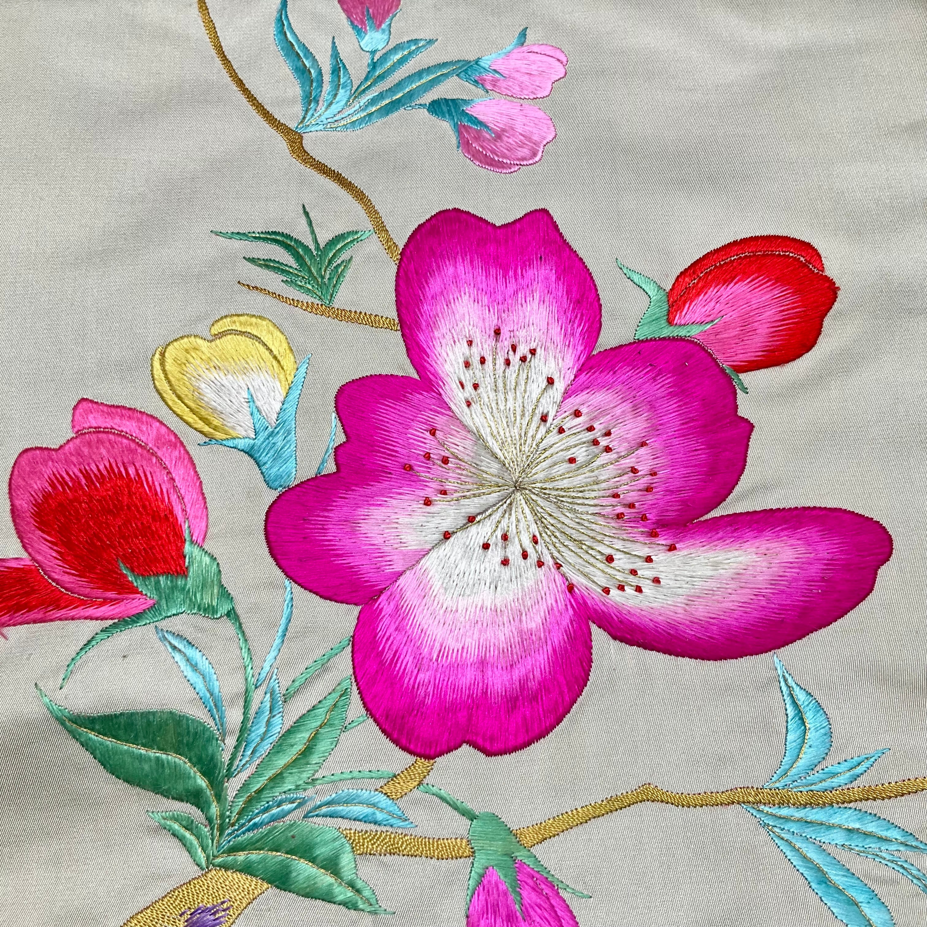 緋桜の春*刺繍帯 繻子 桜 台湾桜 緋桜 ヒカンサクラ 生成り アンティーク名古屋帯 B543