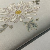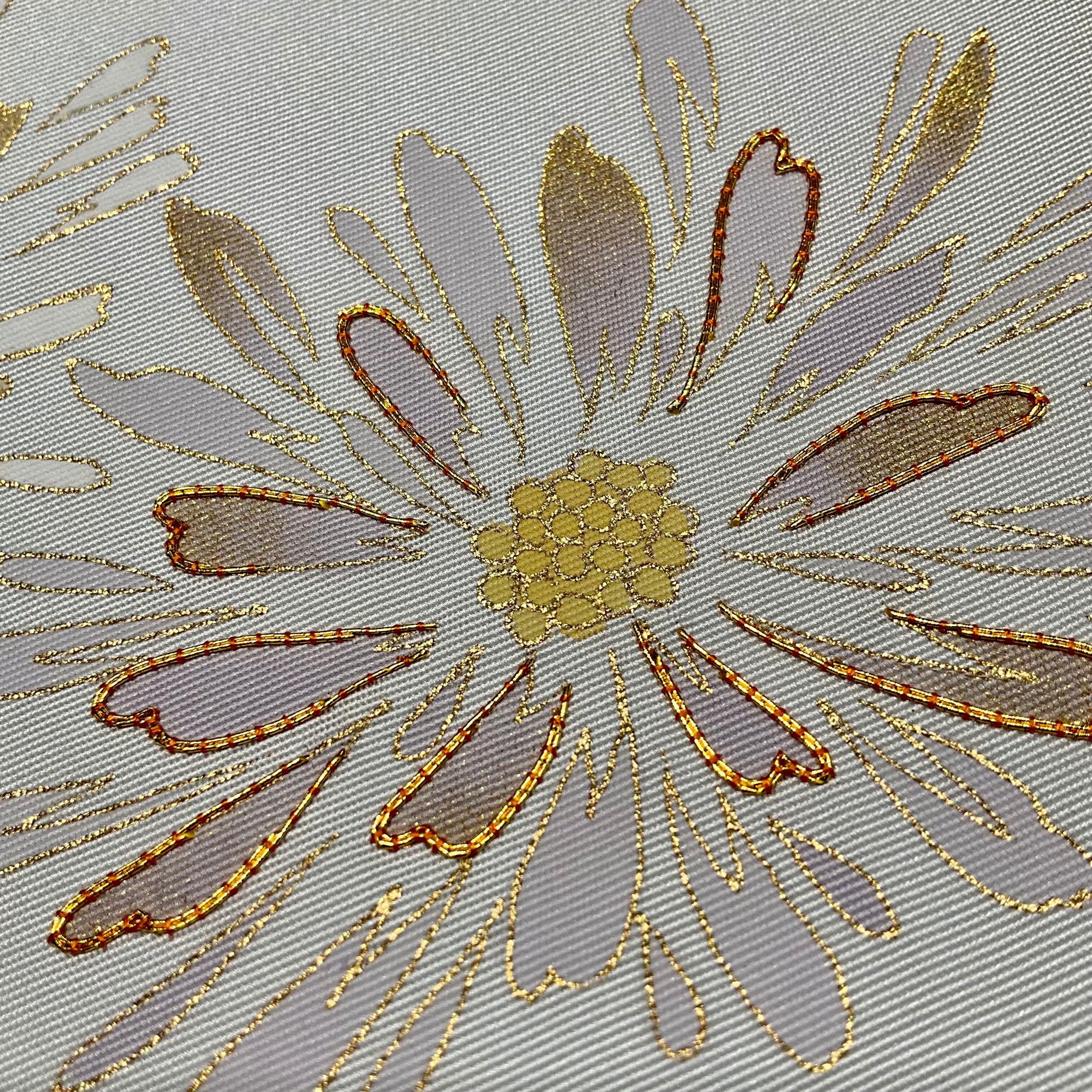 シルバーホワイトの地色に華やかに咲き誇るお花が美しい塩瀬の名古屋帯です