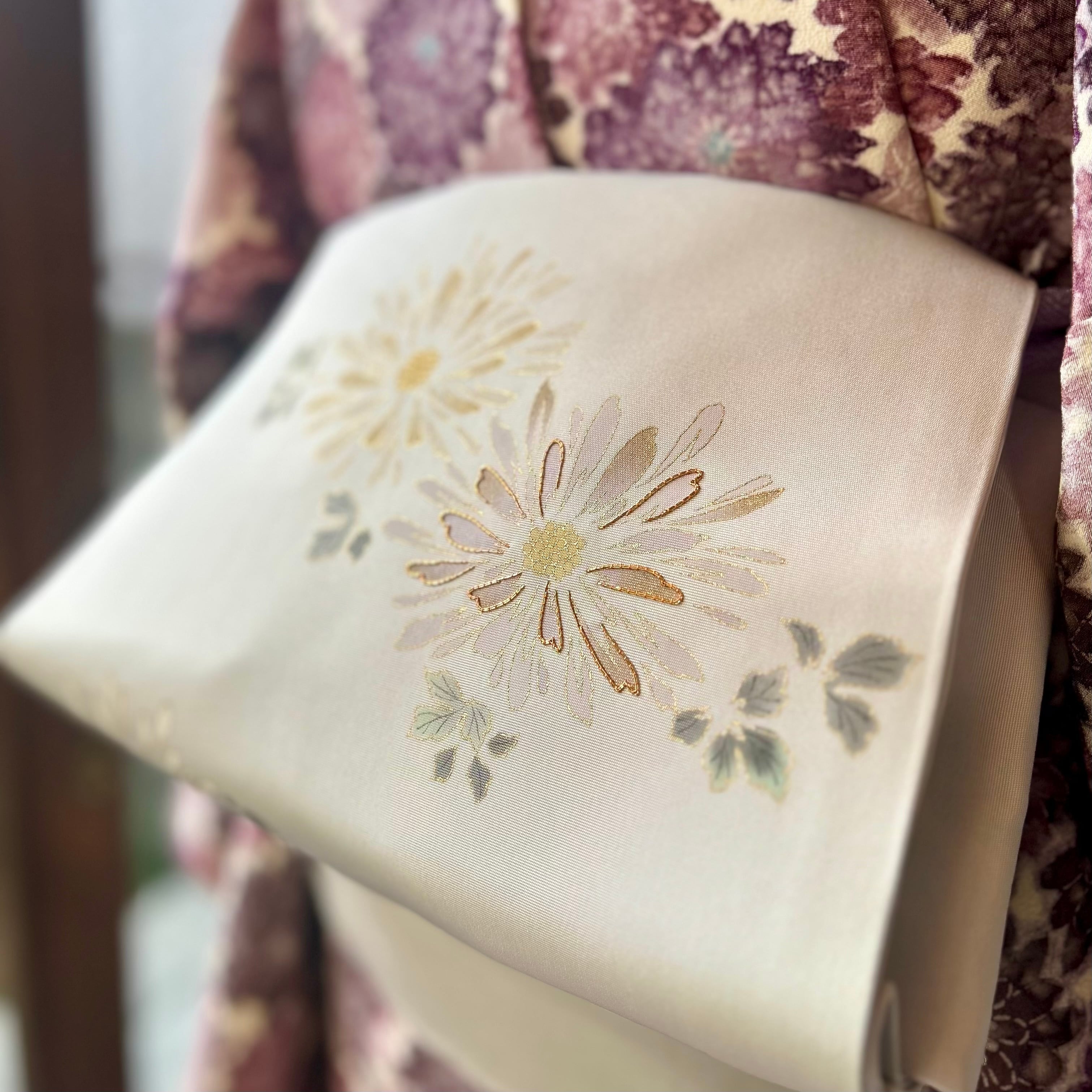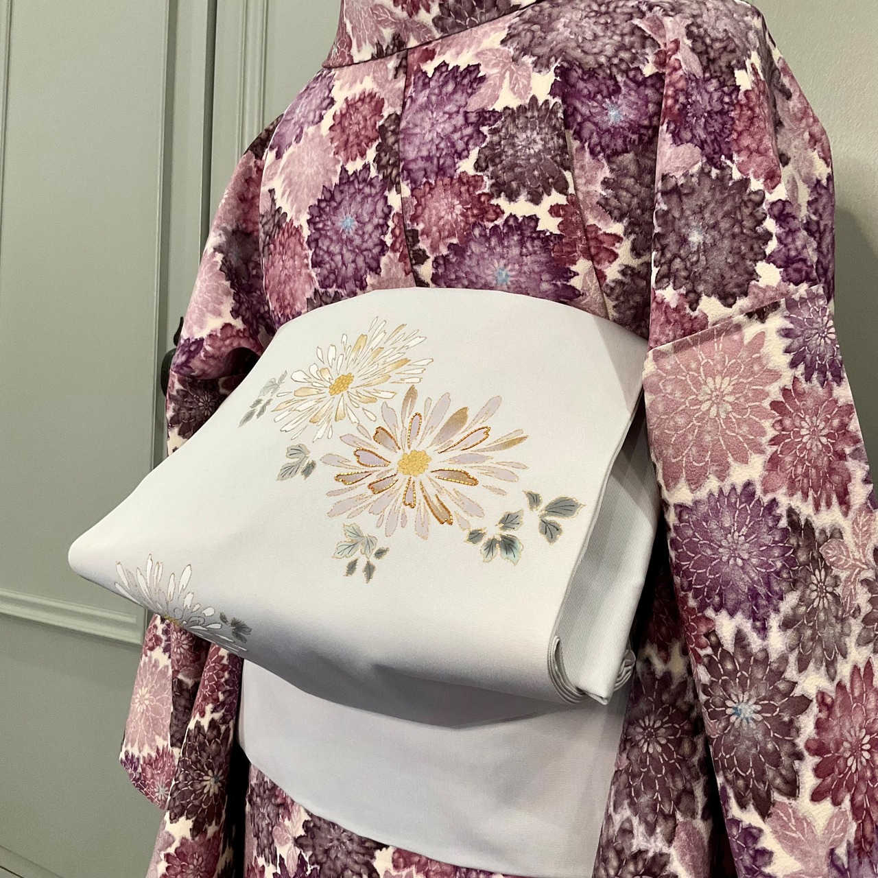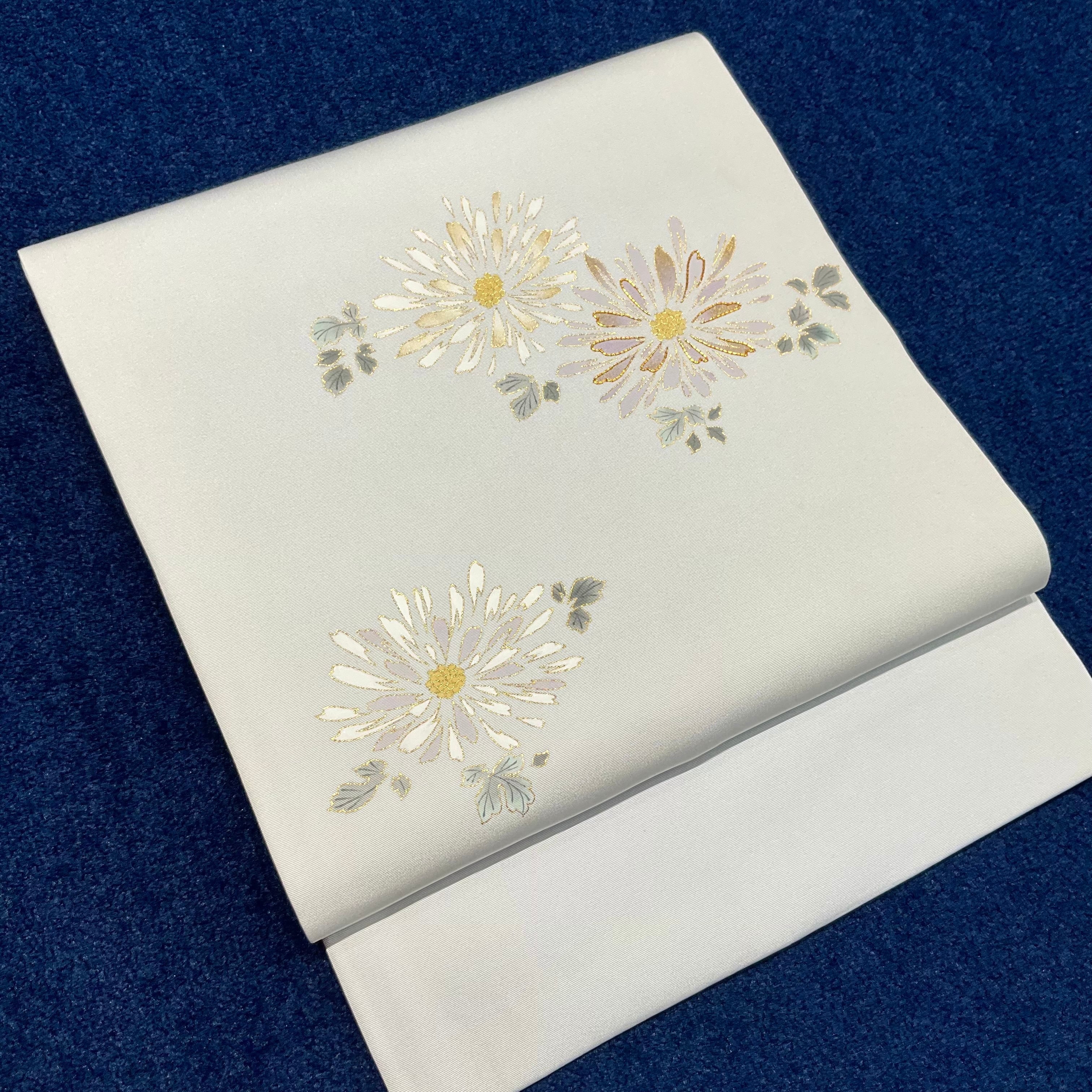 少しクールなホワイトの地色が表情をキリッと引き締め、お太鼓と胴前に美しくも可憐に描かれたお花が華やかに咲く姿は、背中の表情を豊かにしてくれていますね✨