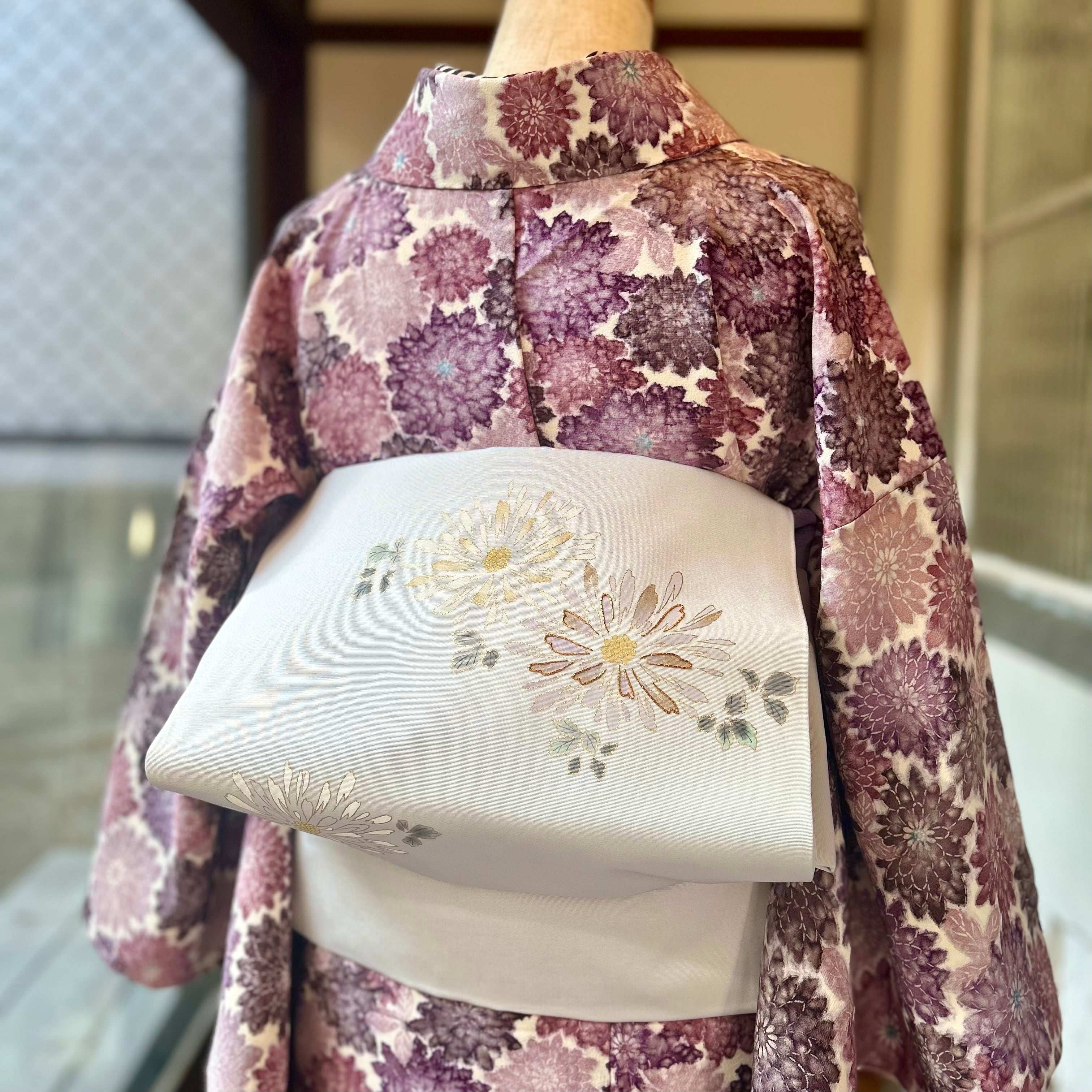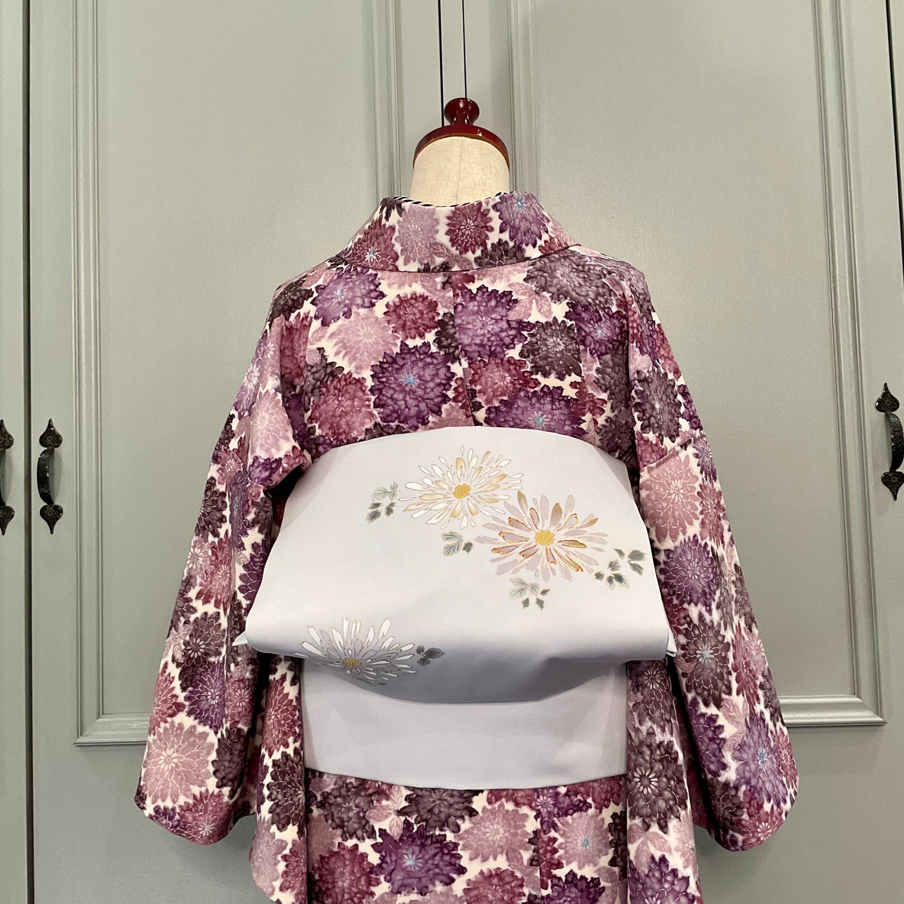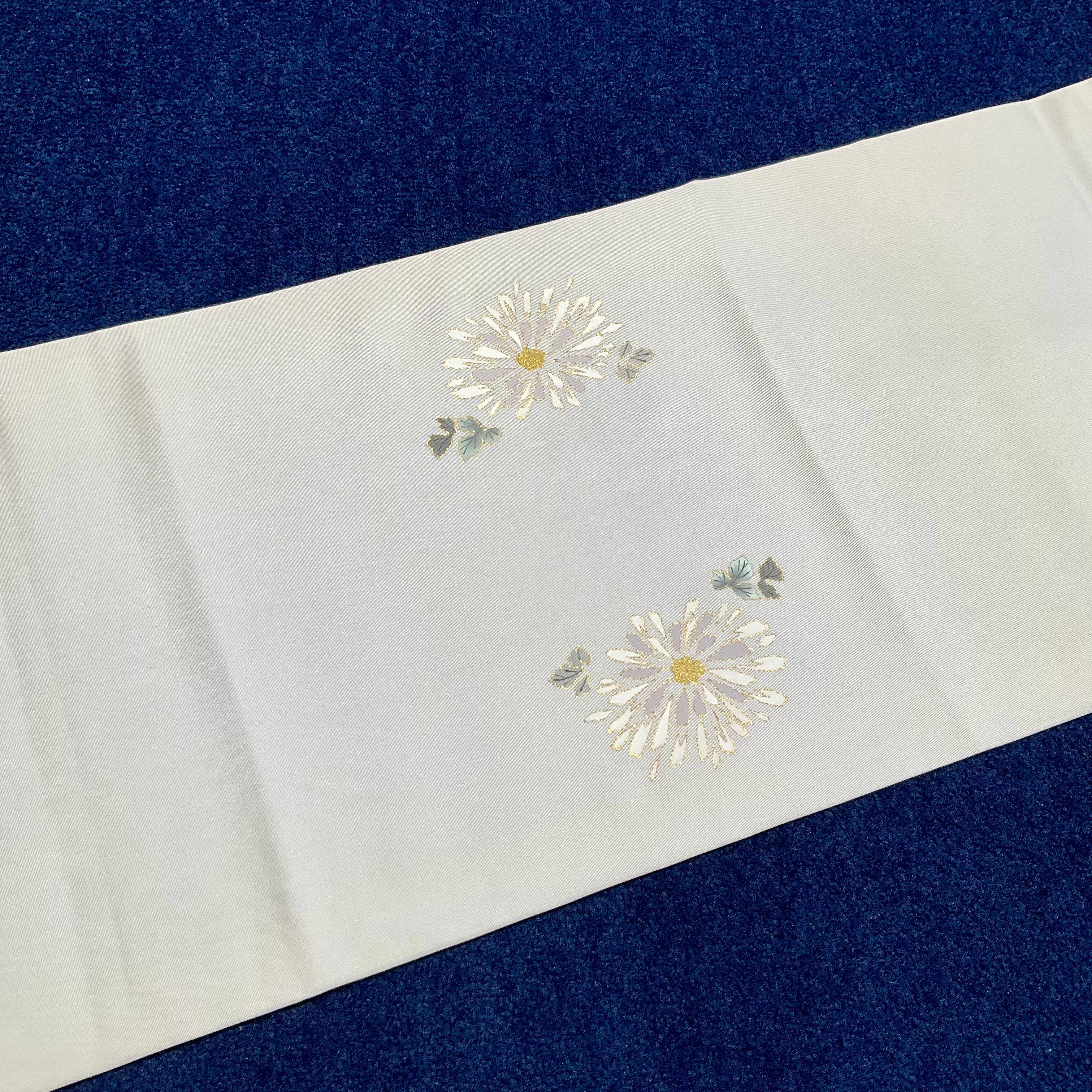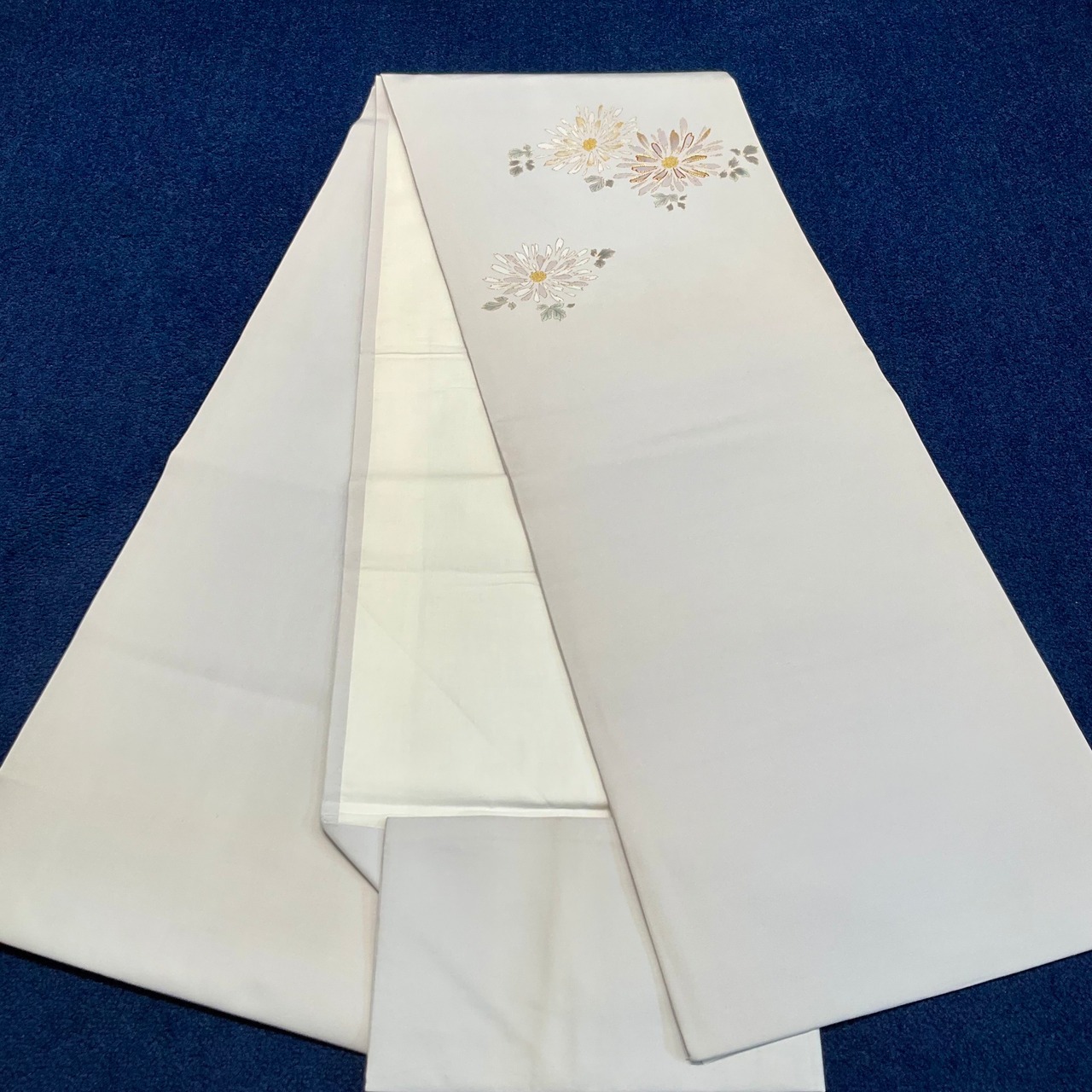 少しクールなホワイトの地色が表情をキリッと引き締め、お太鼓と胴前に美しくも可憐に描かれたお花が華やかに咲く姿は、背中の表情を豊かにしてくれていますね✨