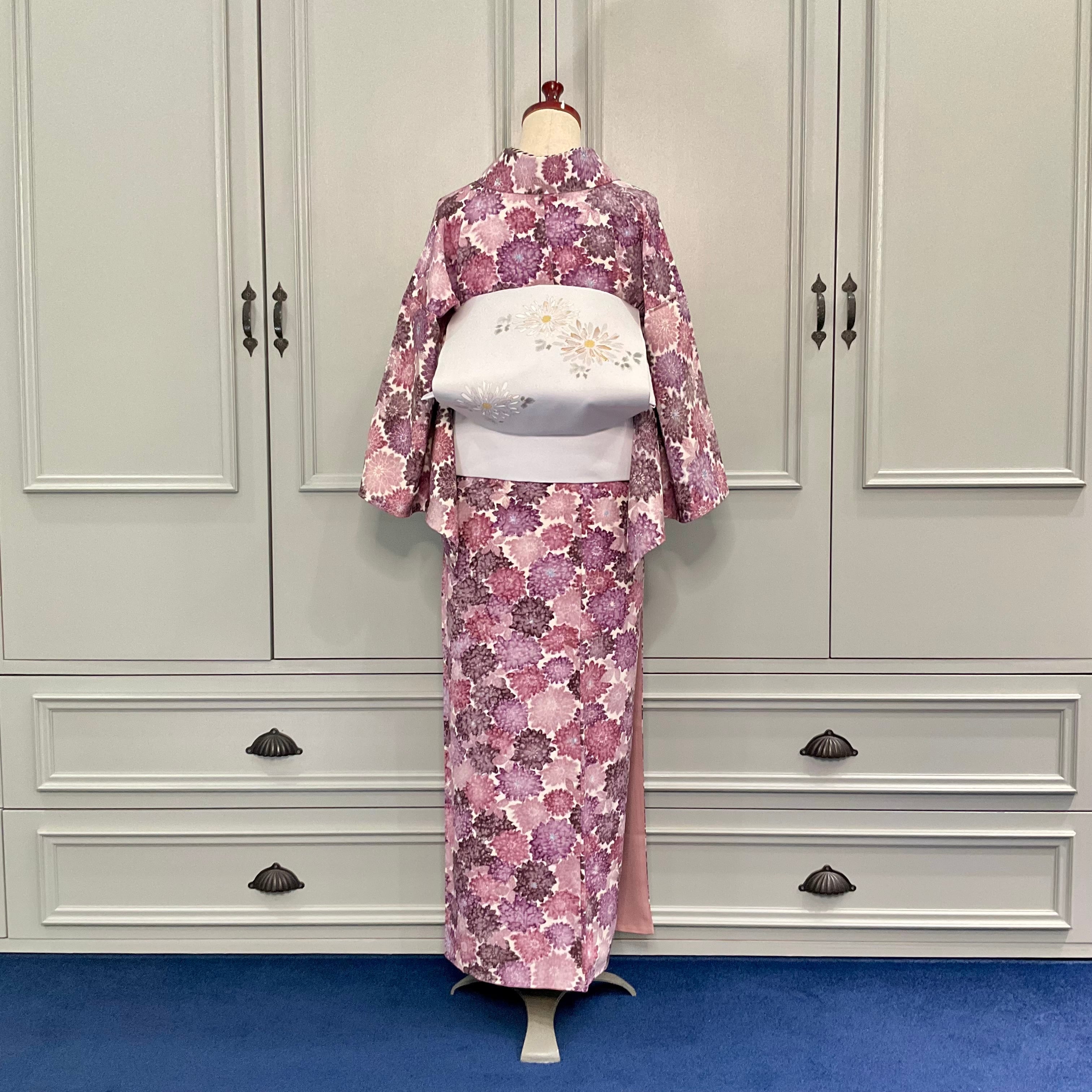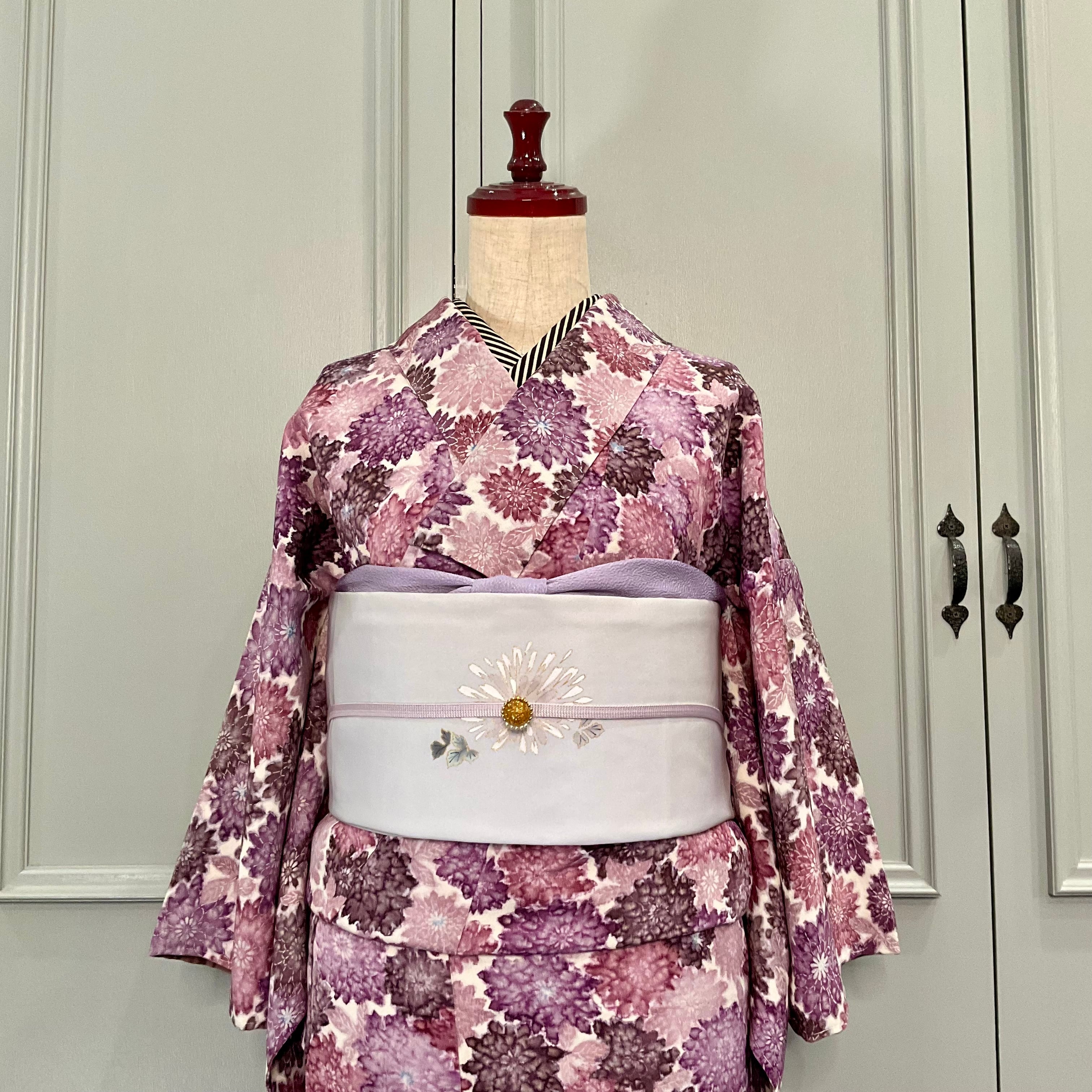 ○ 合わせた着物とオリジナル帯揚げラベンダー、オリジナル三分紐ラベンダー×ミモザはWebshop掲載品です♪