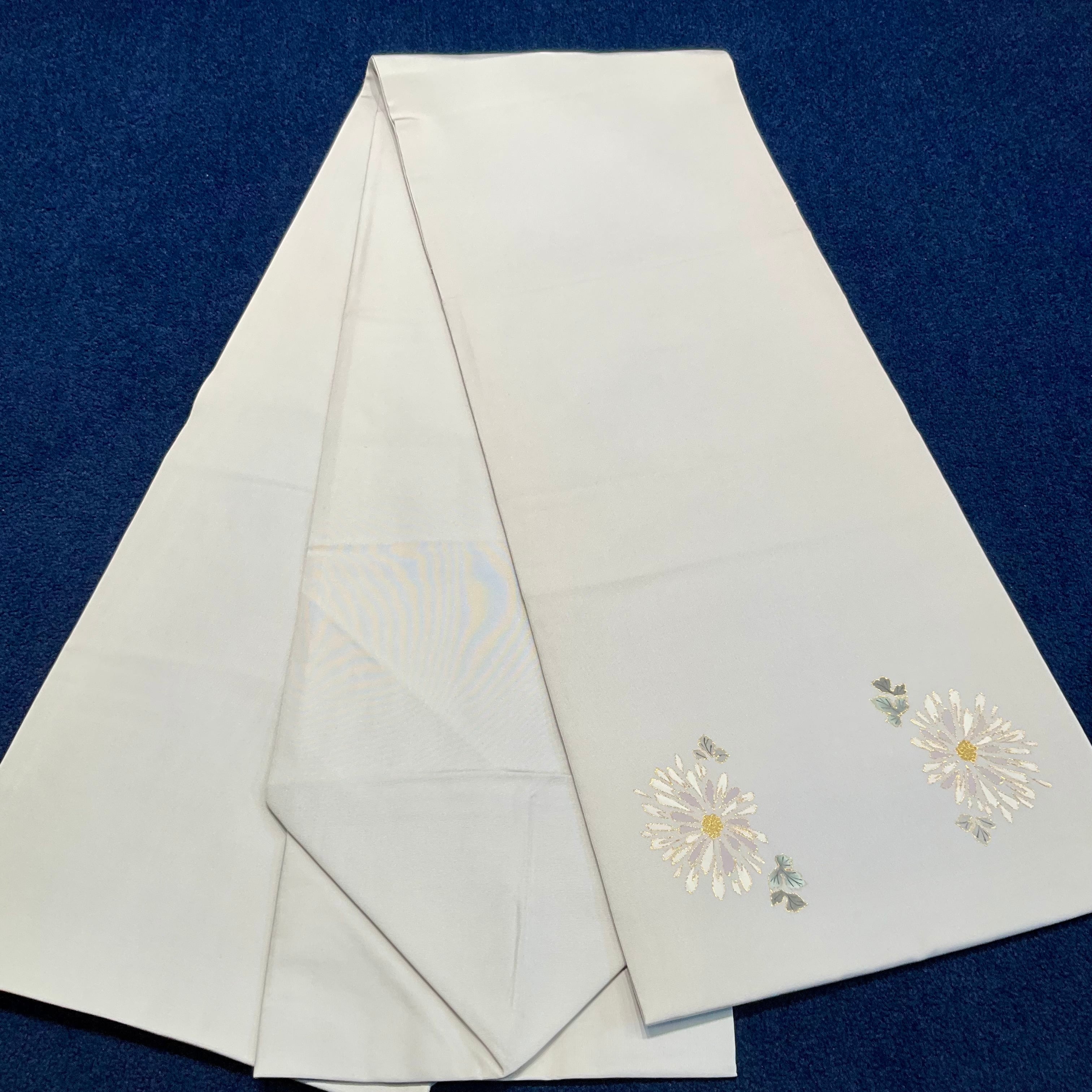 Moonlit Ivory*染め帯 花 グレーホワイト 塩瀬帯 名古屋帯 B545
