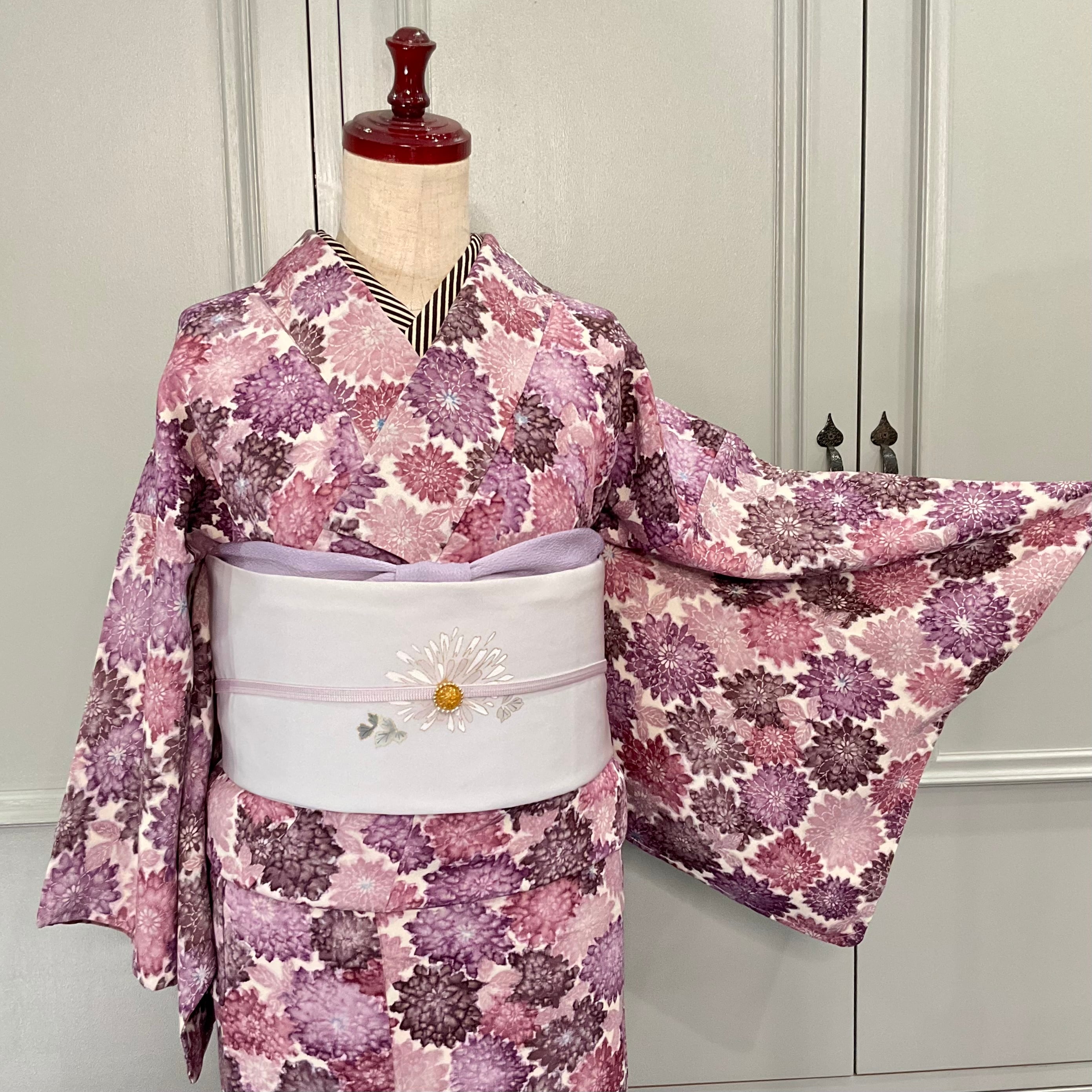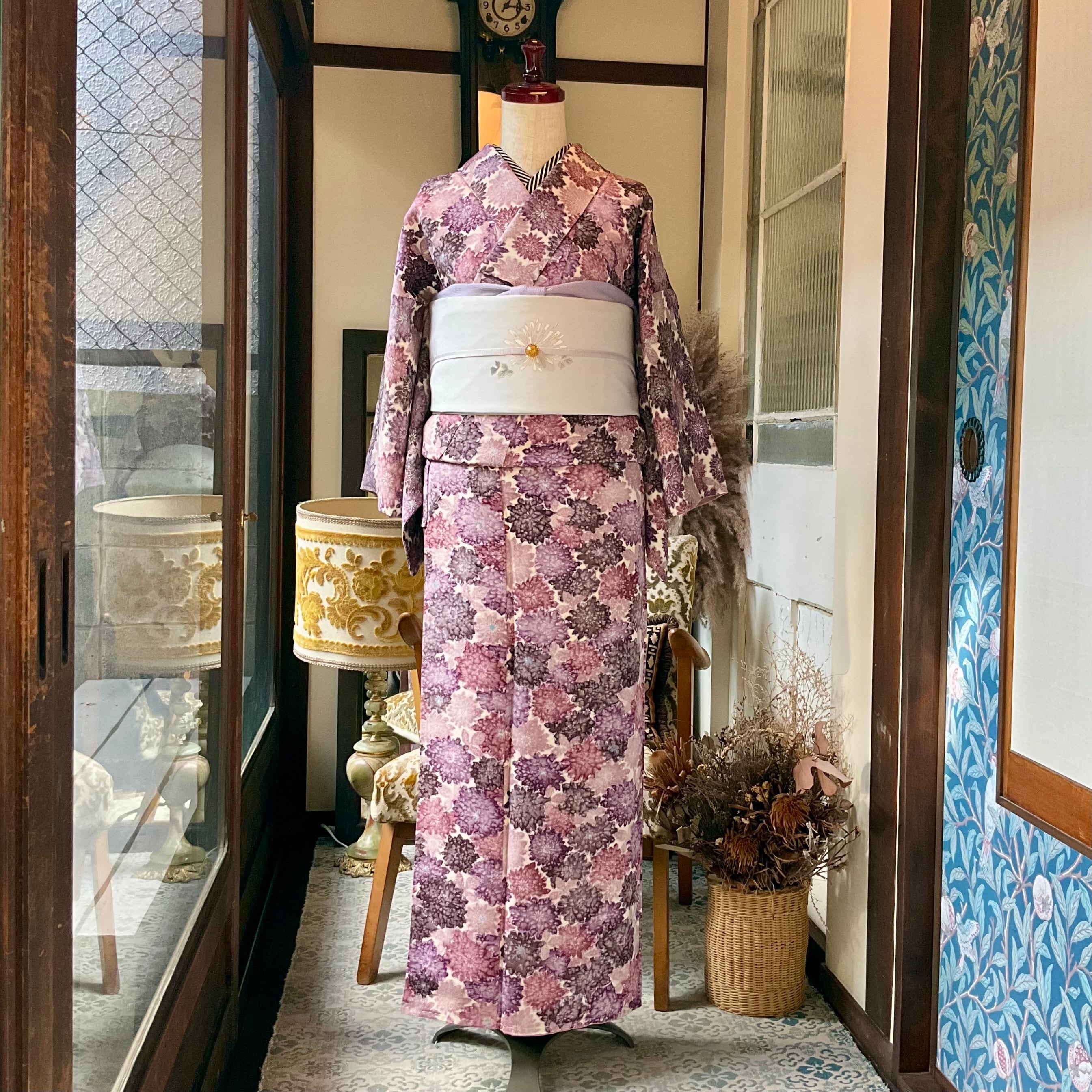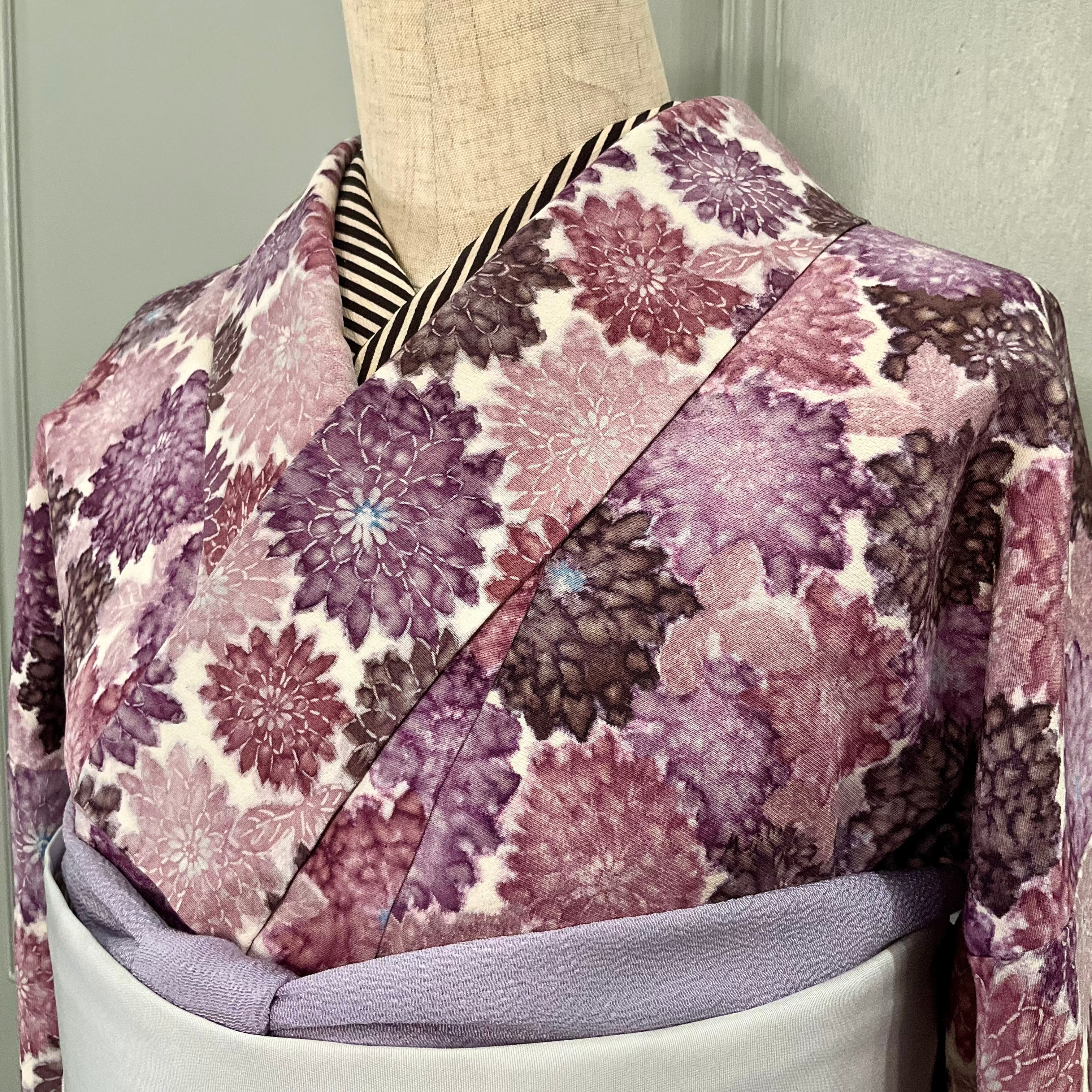 生成りの地色に、紫系の様々なカラーでボタニカルな花模様がデザインされた大人カワイイ小紋着物です