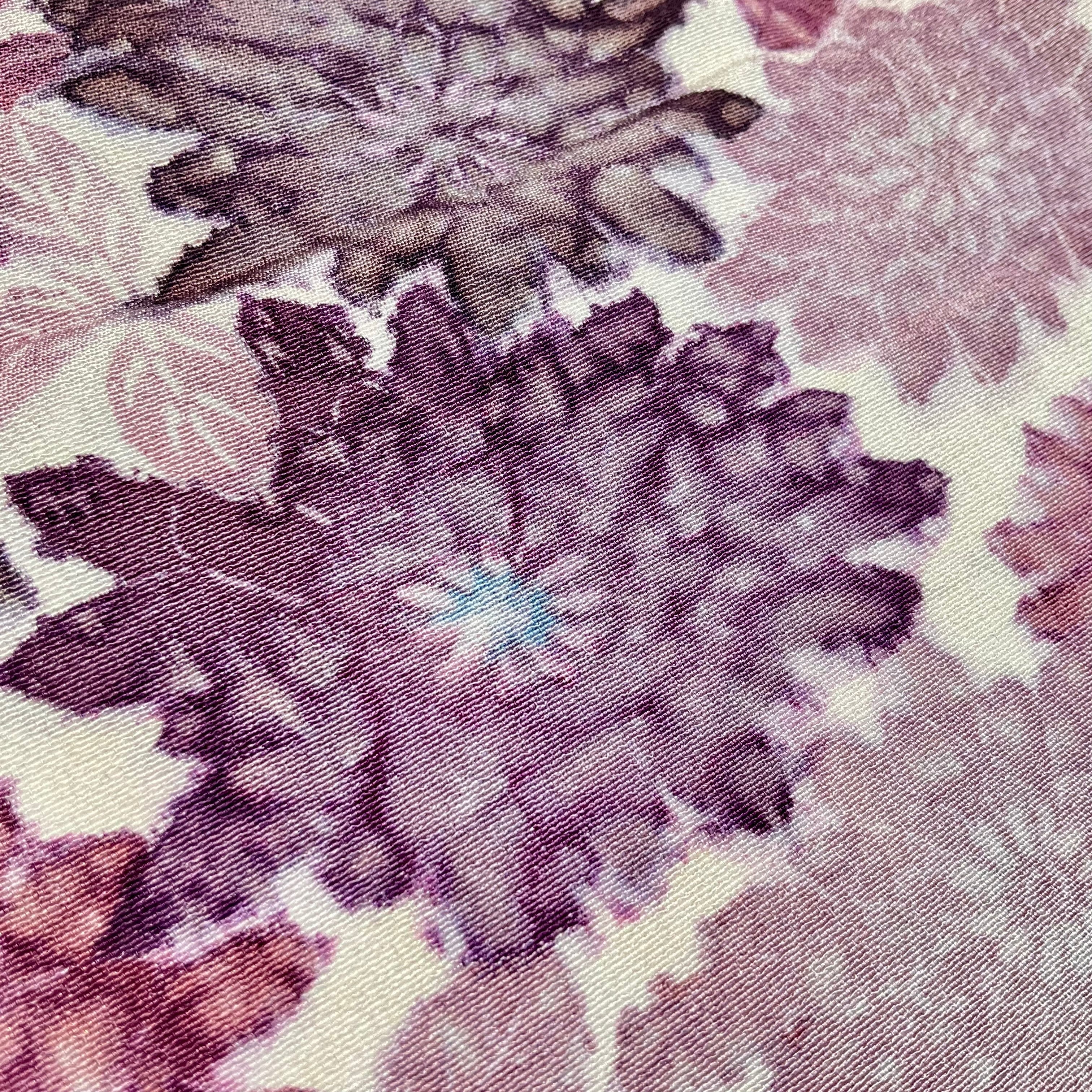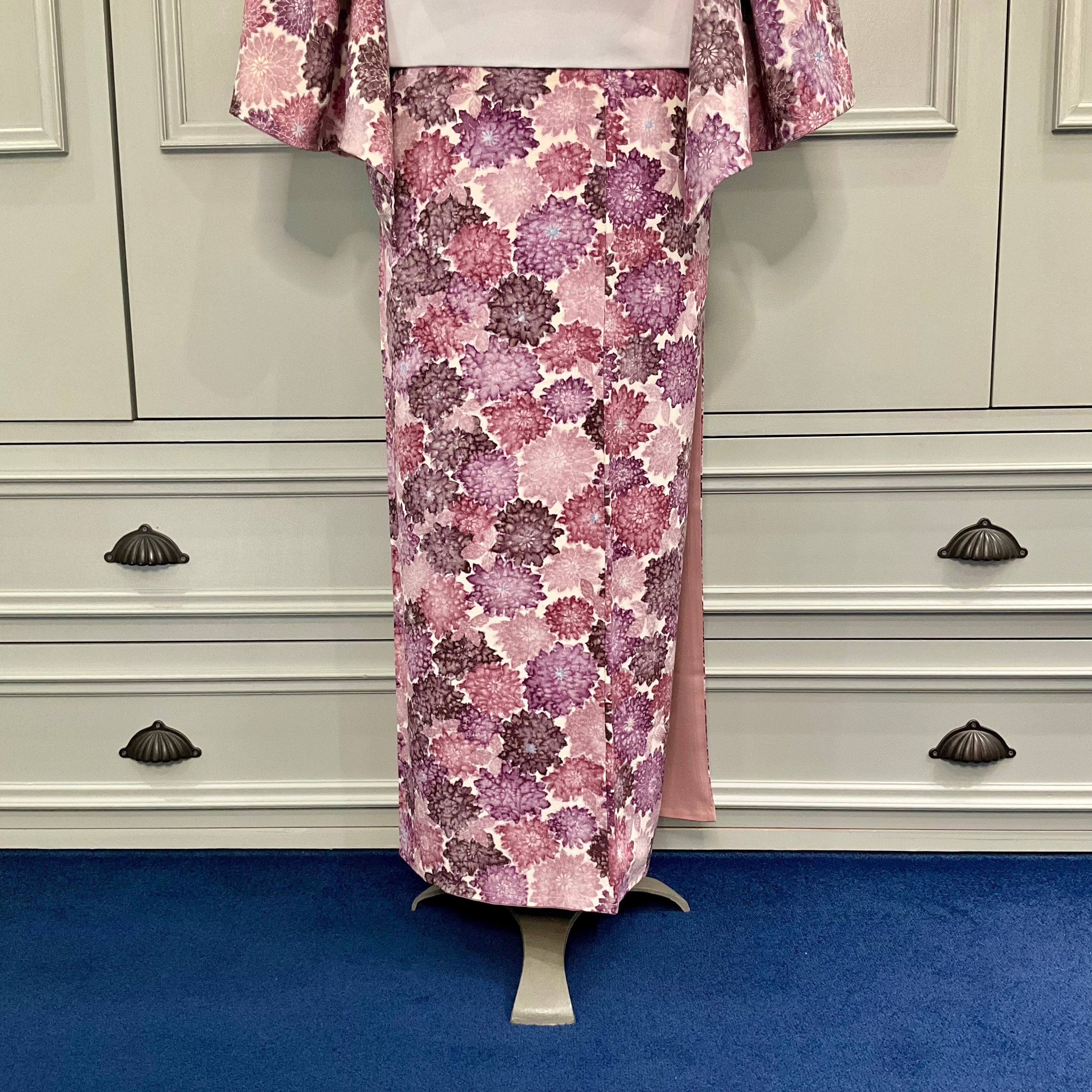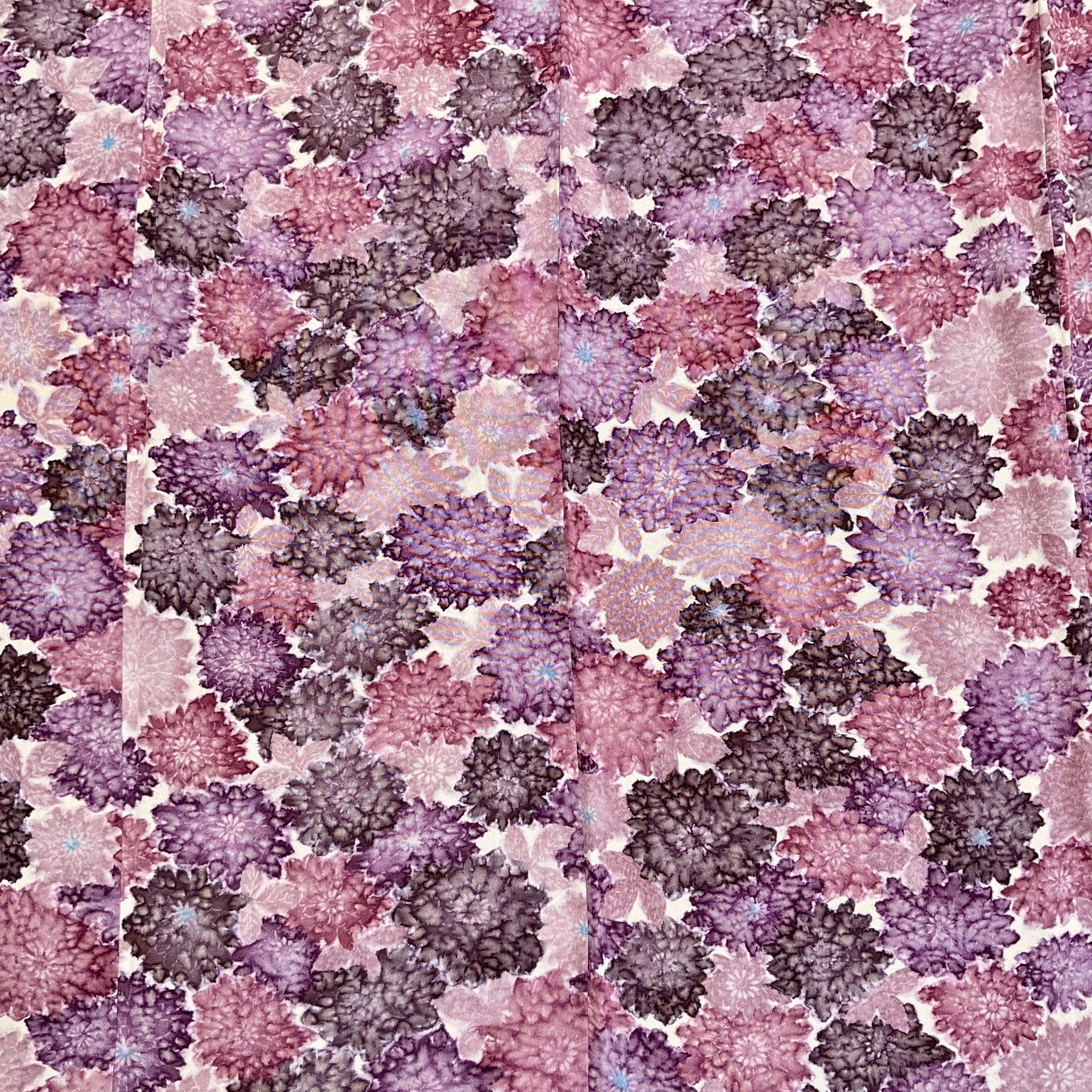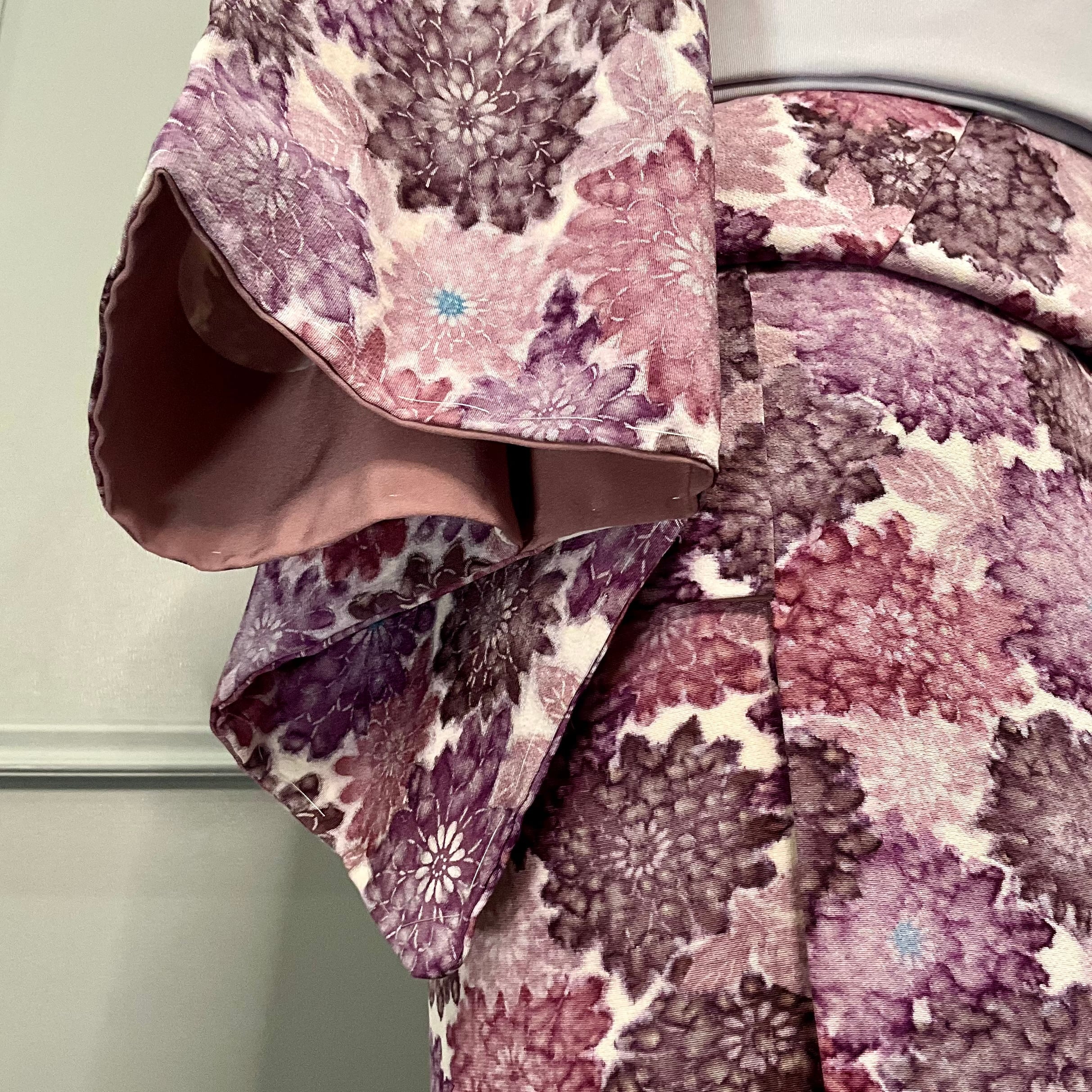 ちょっぴりくすみのある紫や葡萄色、梅鼠、オールドローズで水彩画のように描かれた花模様が個性的で、お洒落な色使いがステキな一着!