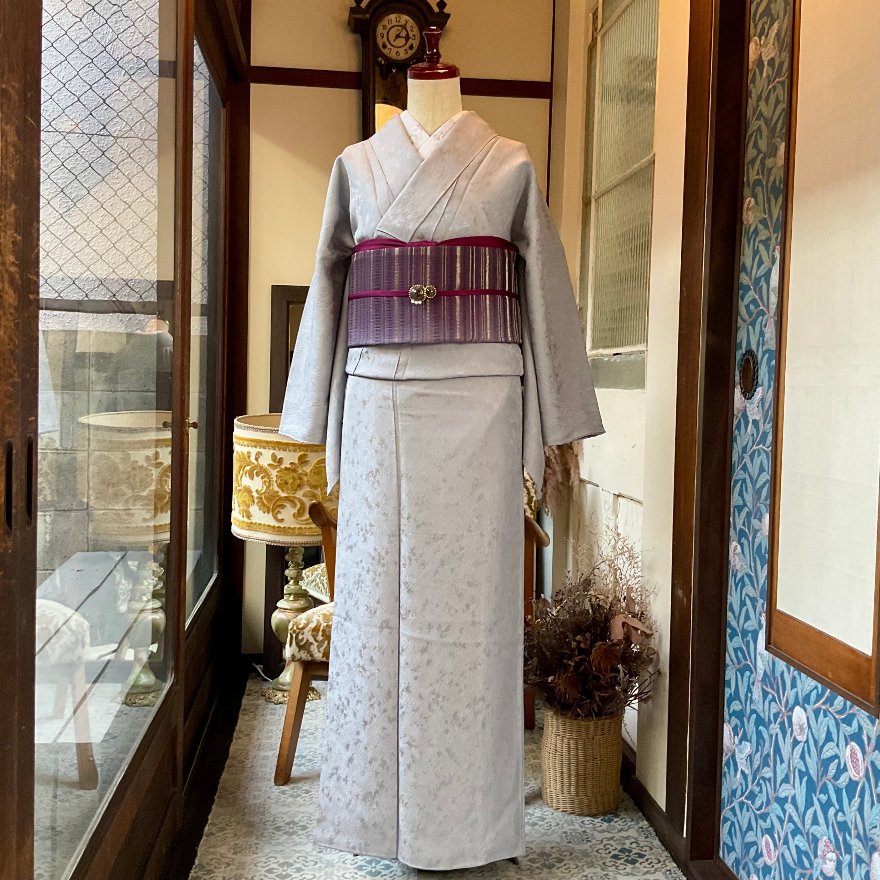 ○合わせた着物とオリジナル帯揚げプラム、オリジナル三分紐ミント×プラムはweb shop掲載品です