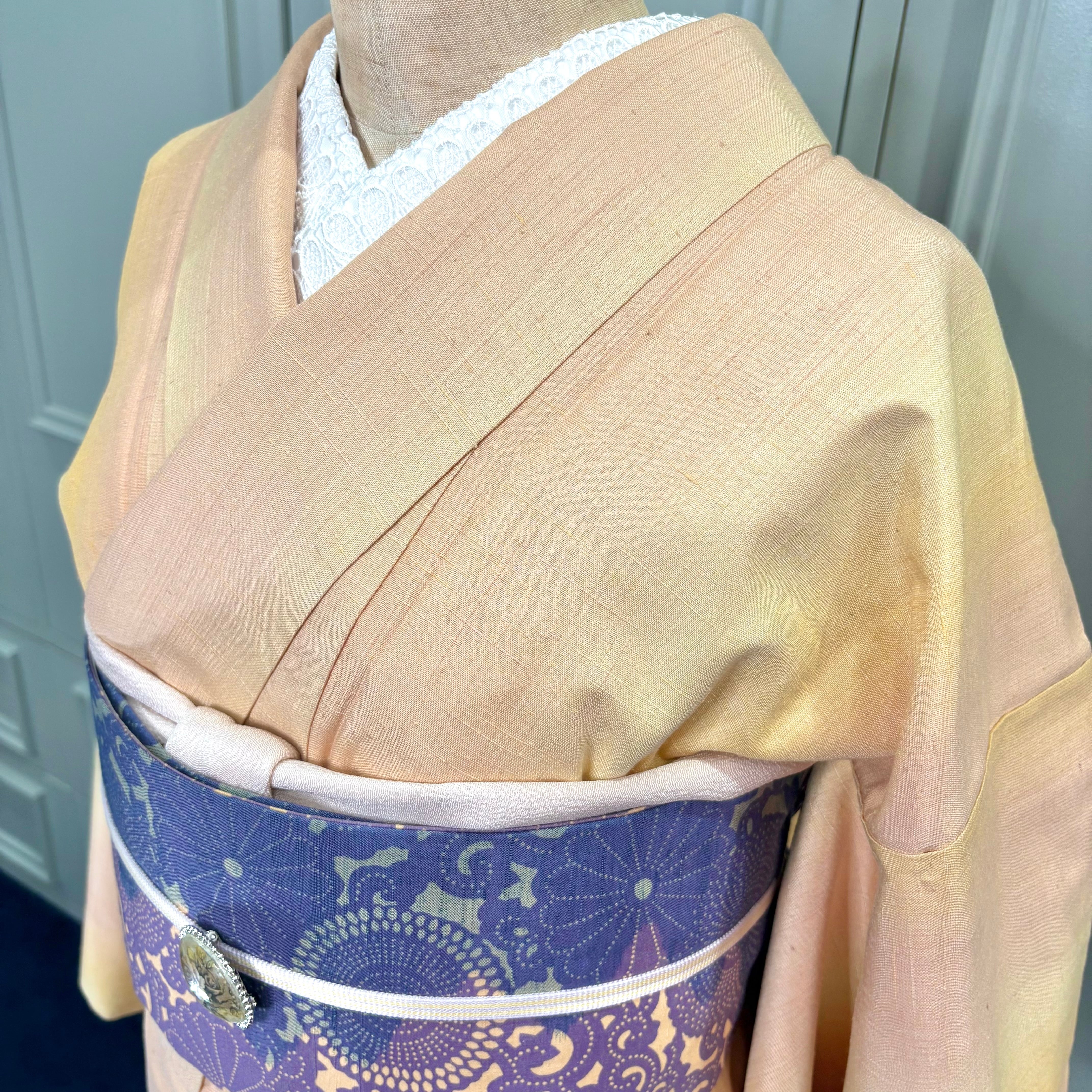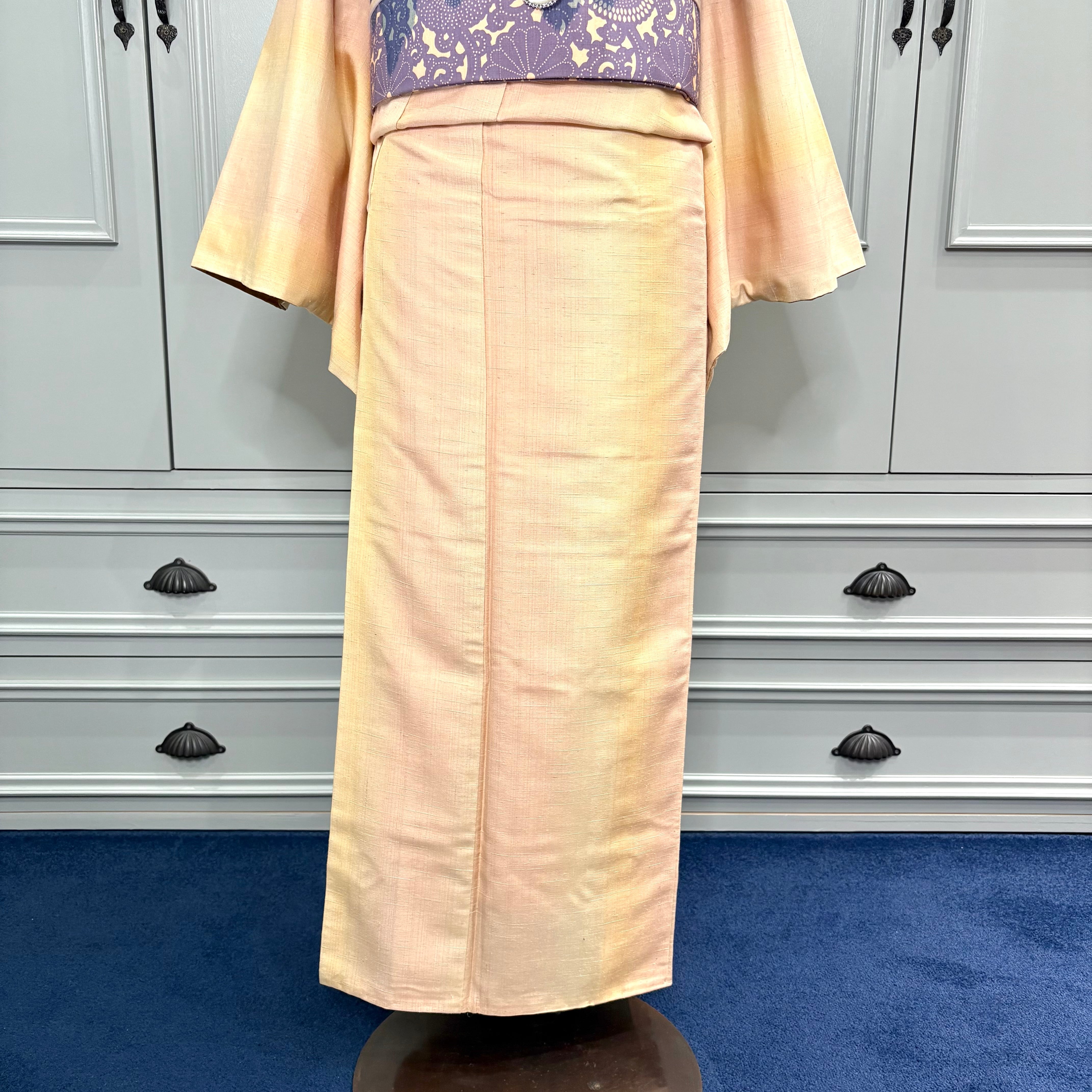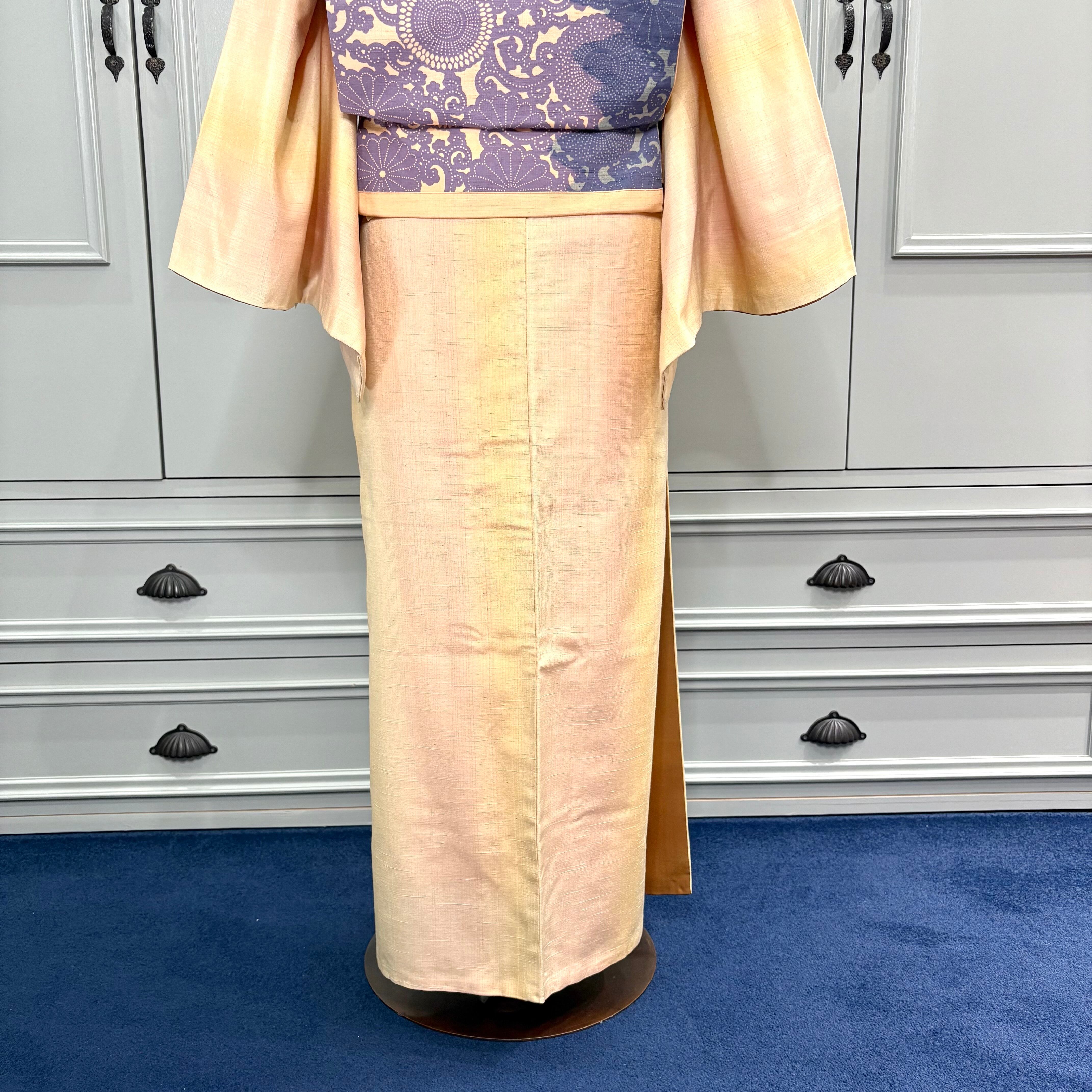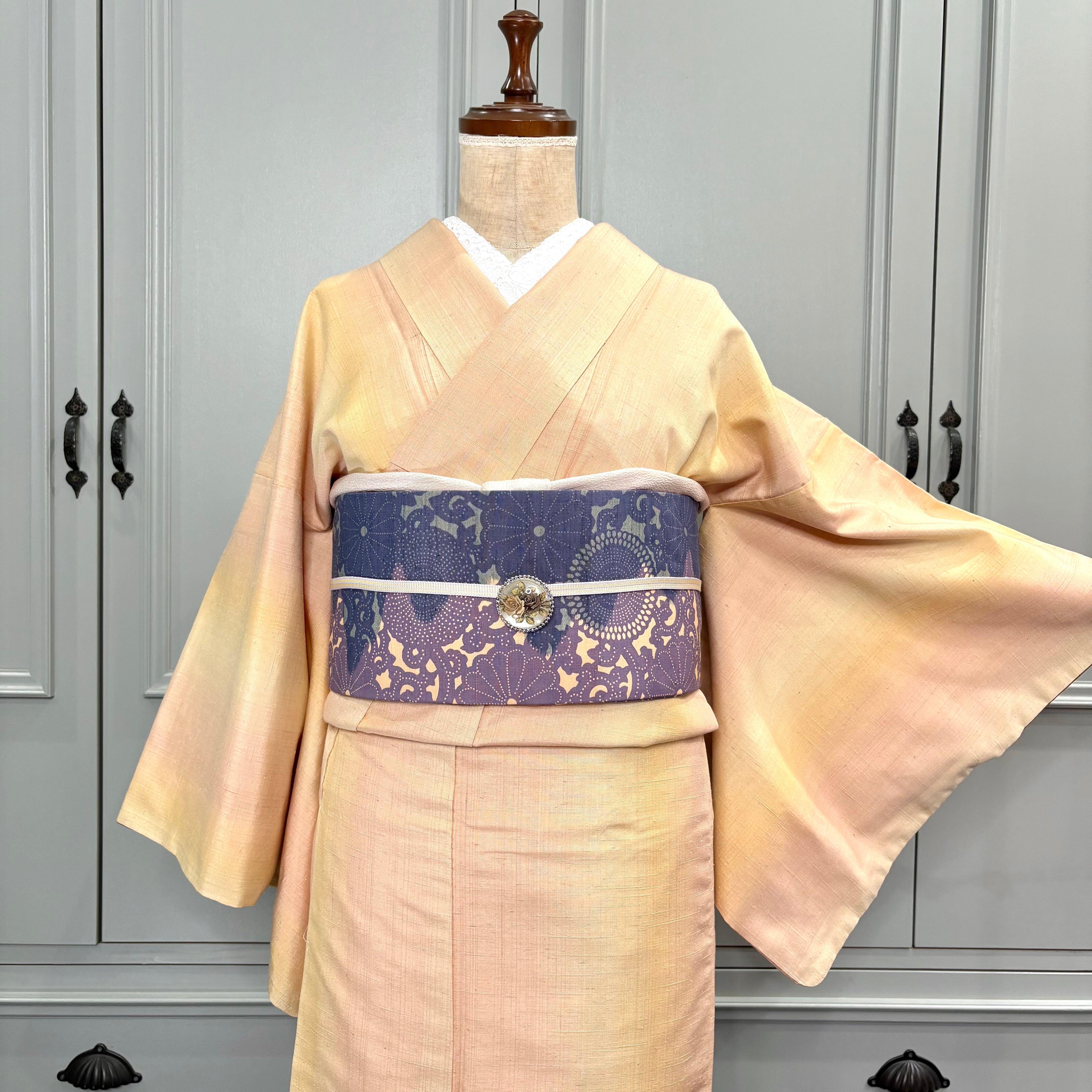 淡光のゆらぎ*薄橙 黄色 暈し グラデーション オレンジベージュ シャーベットオレンジ ピンクイエロー 紬着物 B560