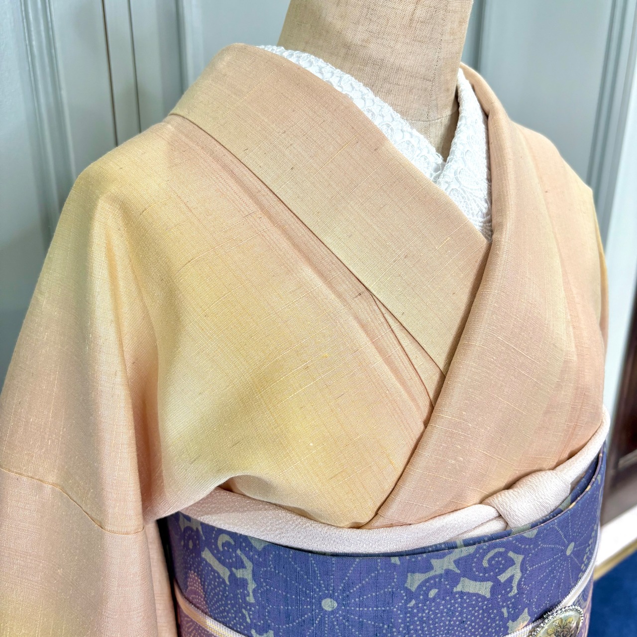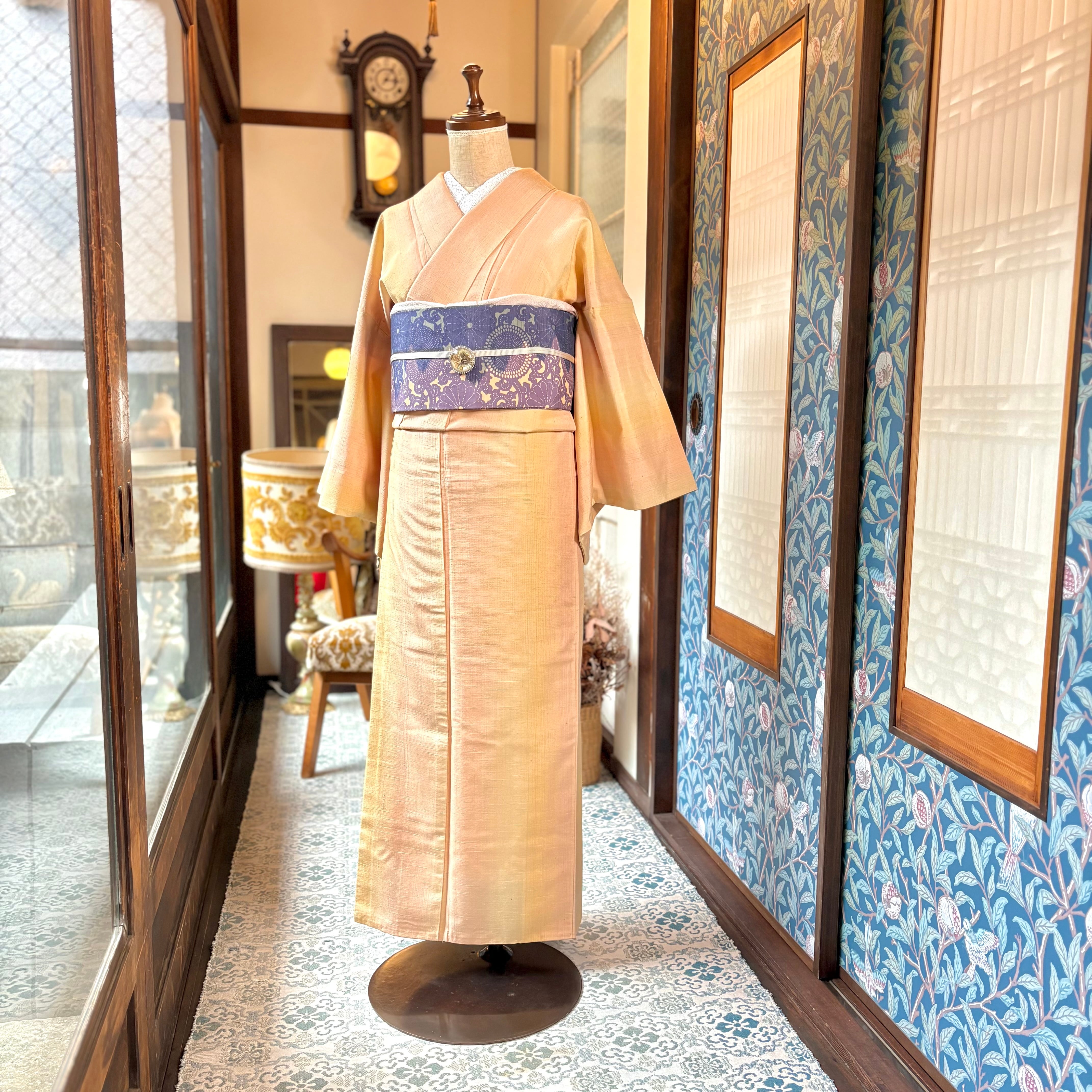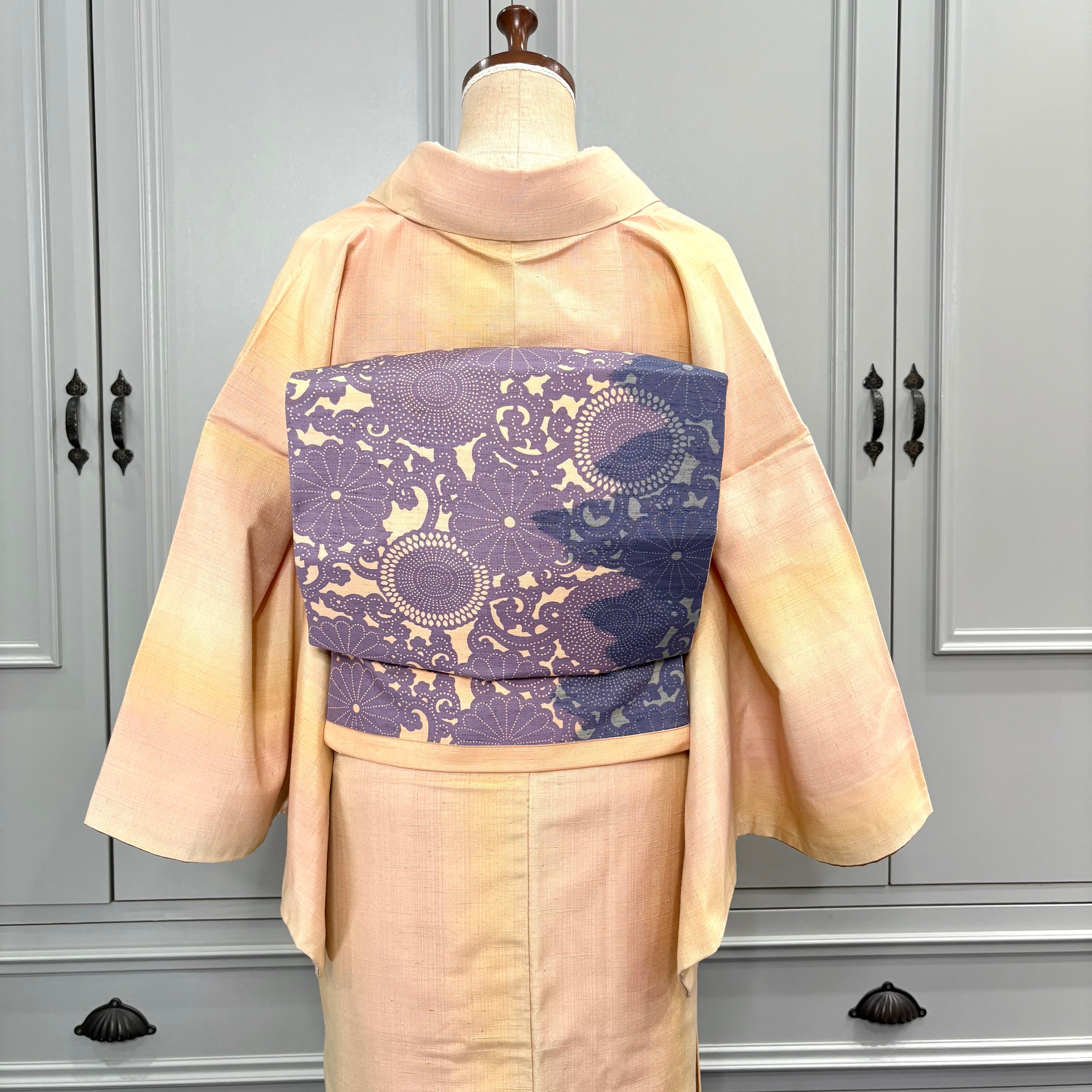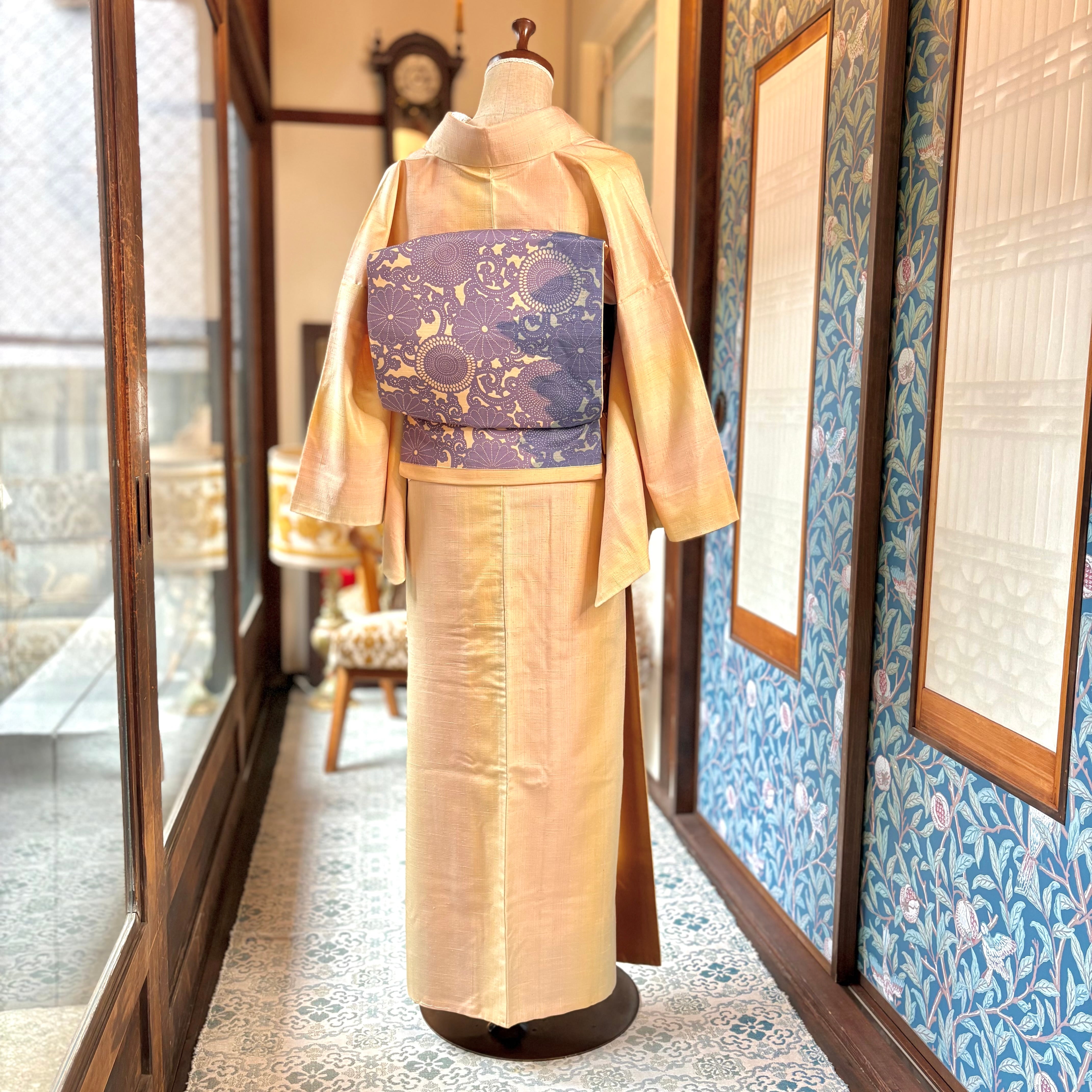 ○合わせた名古屋帯、オリジナル帯揚げミルクティベージュ、オリジナル三分紐ラベンダー×ミモザはwebshop掲載品です♪