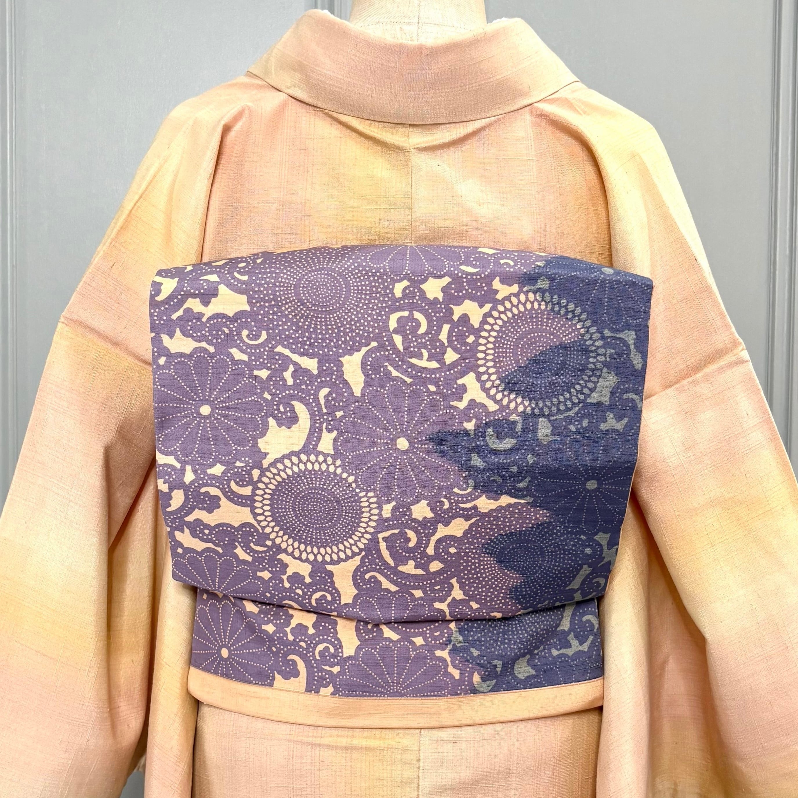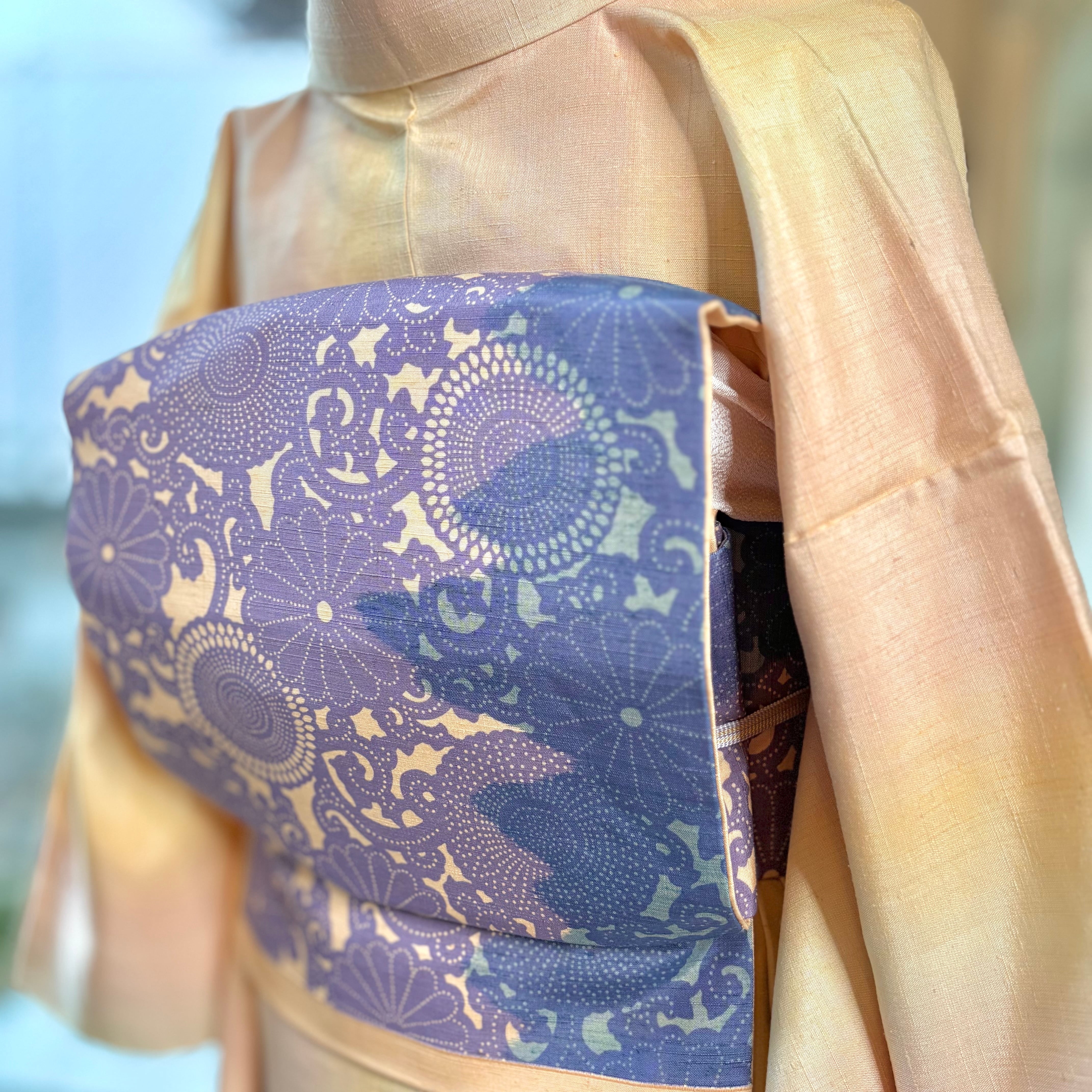 薄橙色の地色に、薄い青紫色のお花の型染め模様の紬の名古屋帯です
