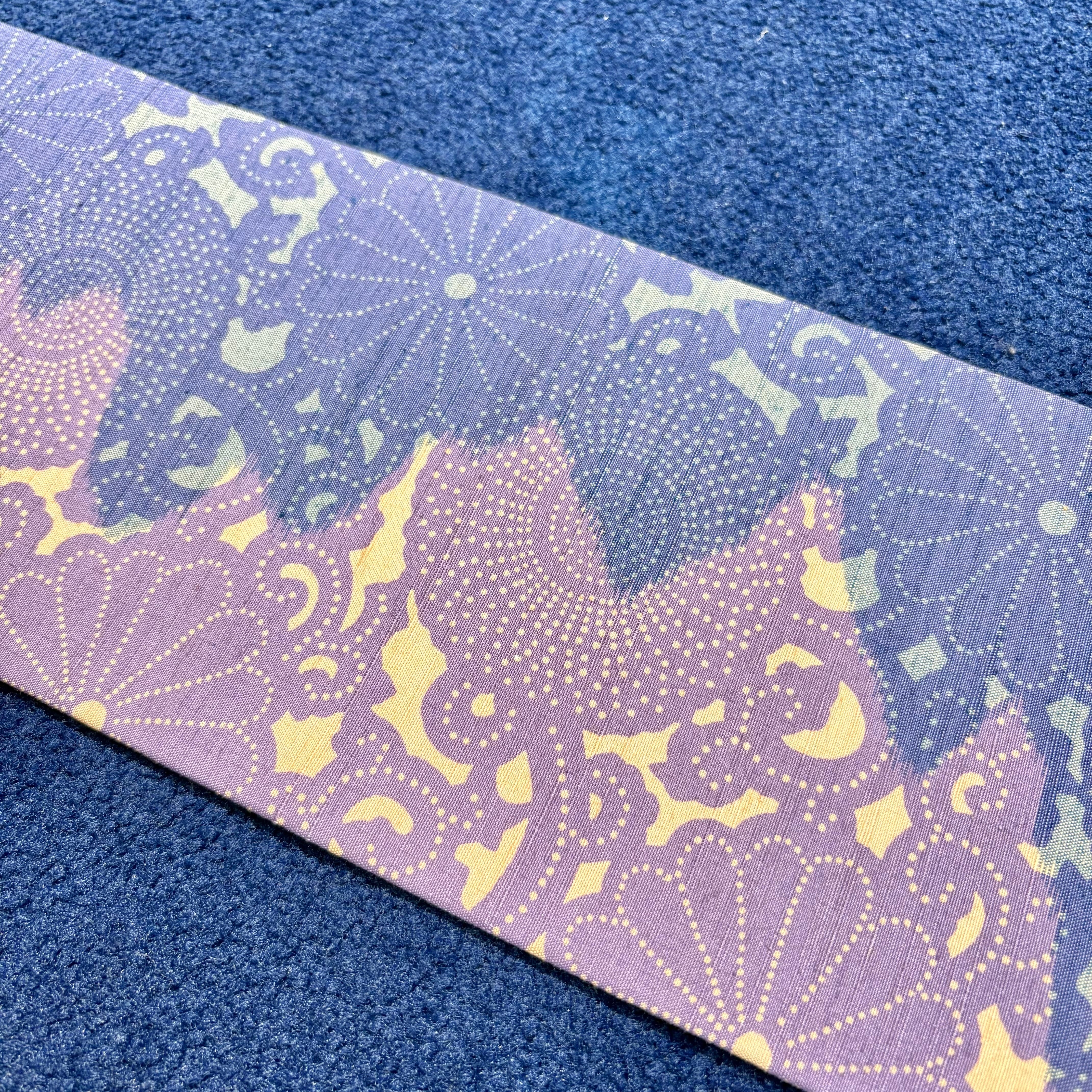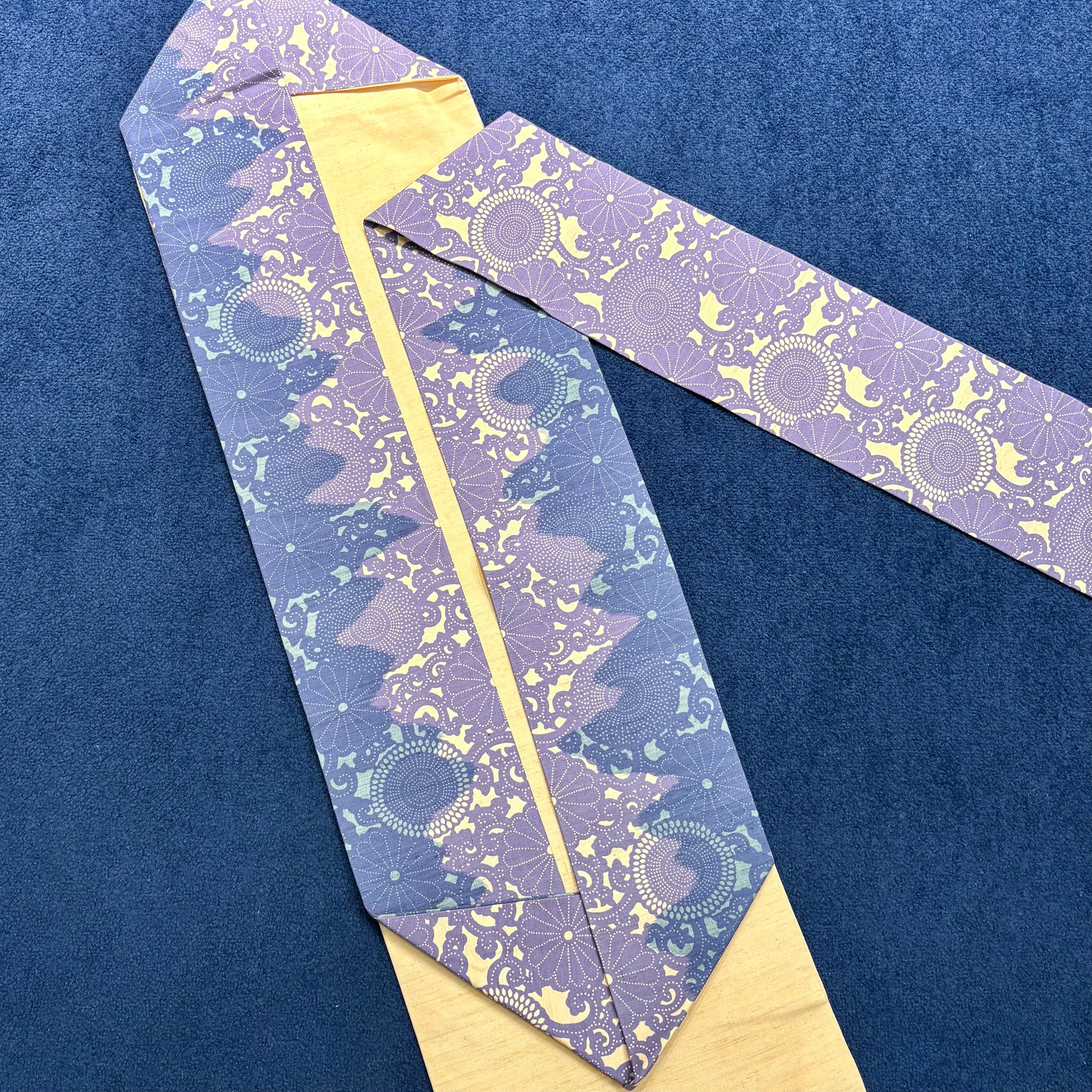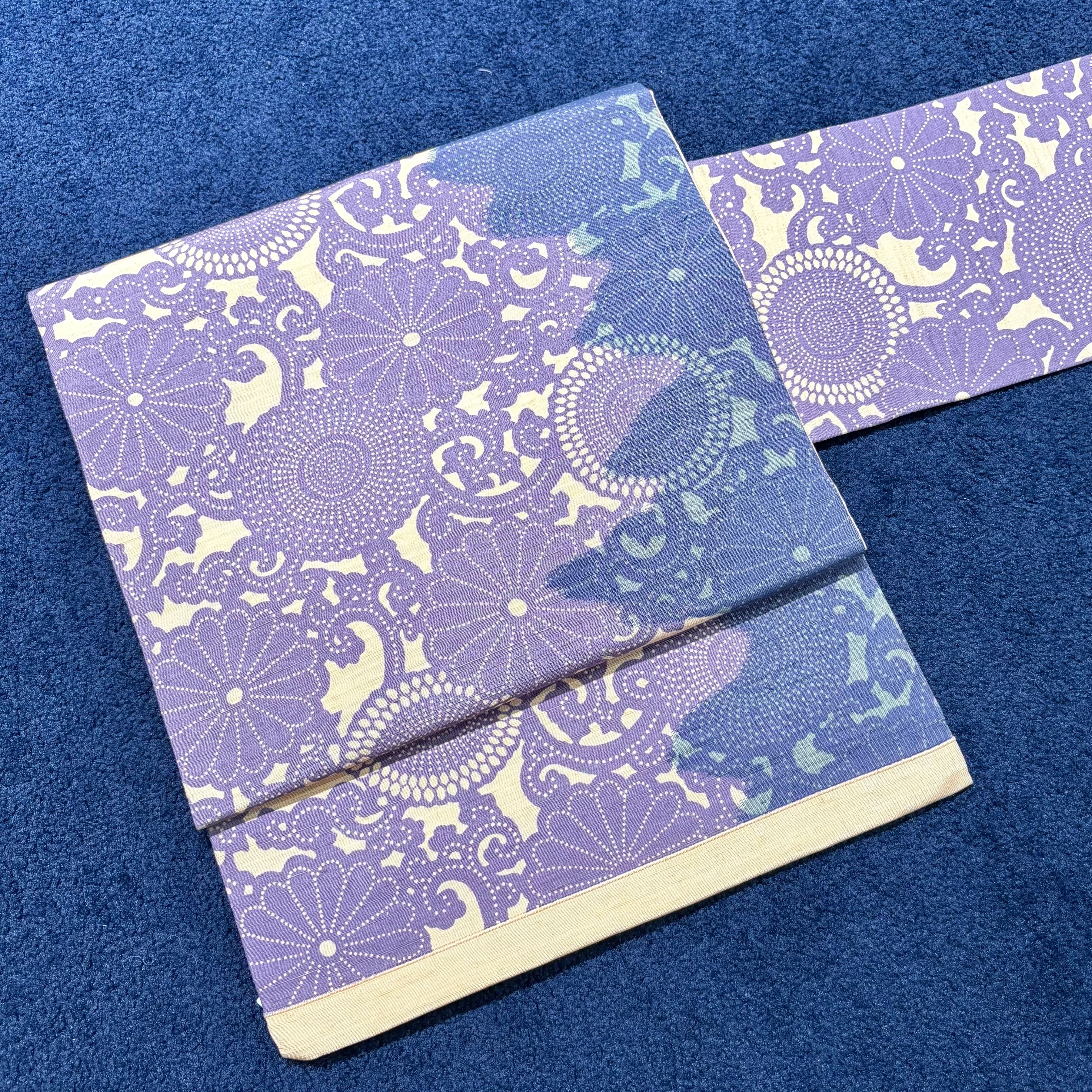 紫影のモノローグ*薄紫 青紫 薄橙 型染め パープル 菊文 唐草 花 華 紬 名古屋帯 B561