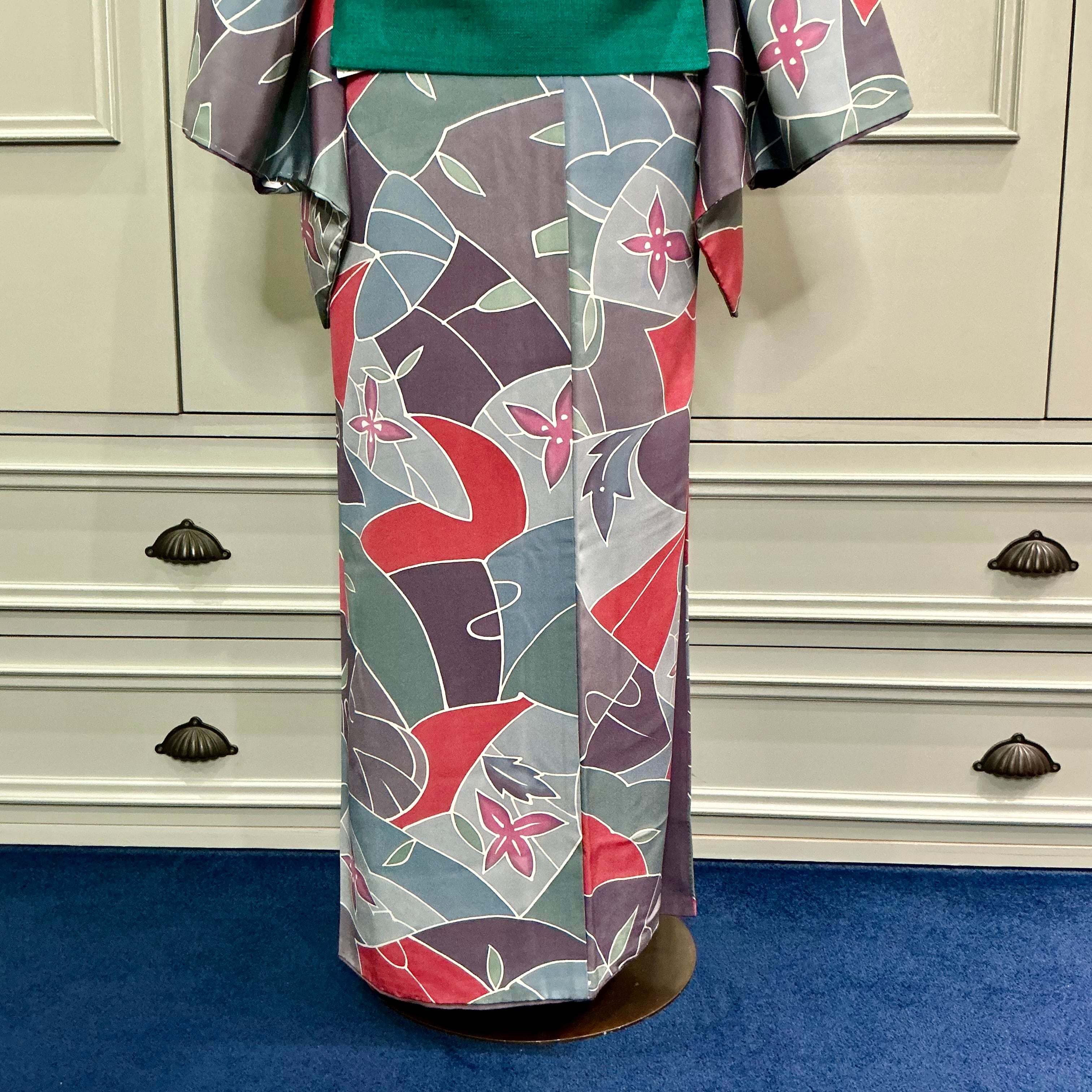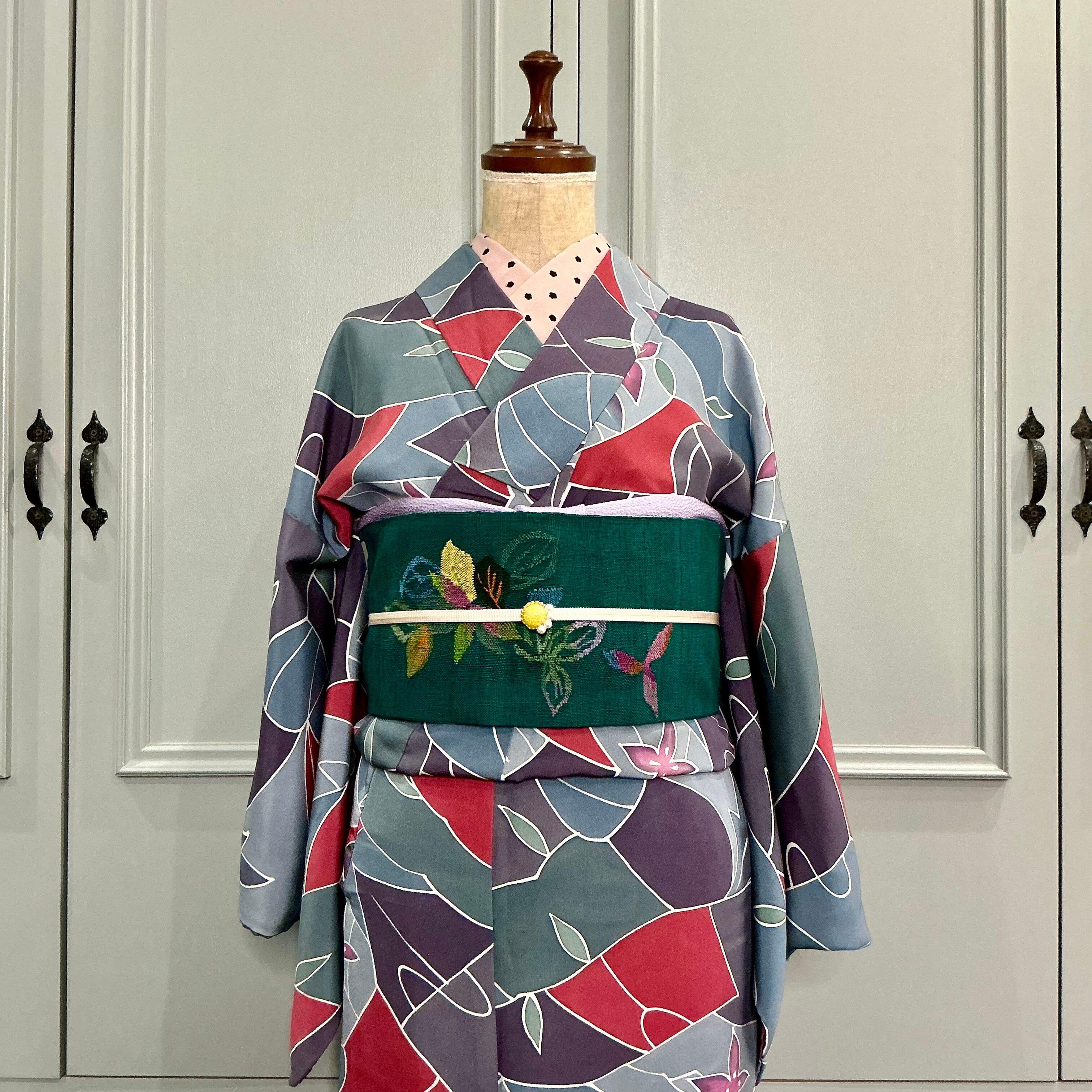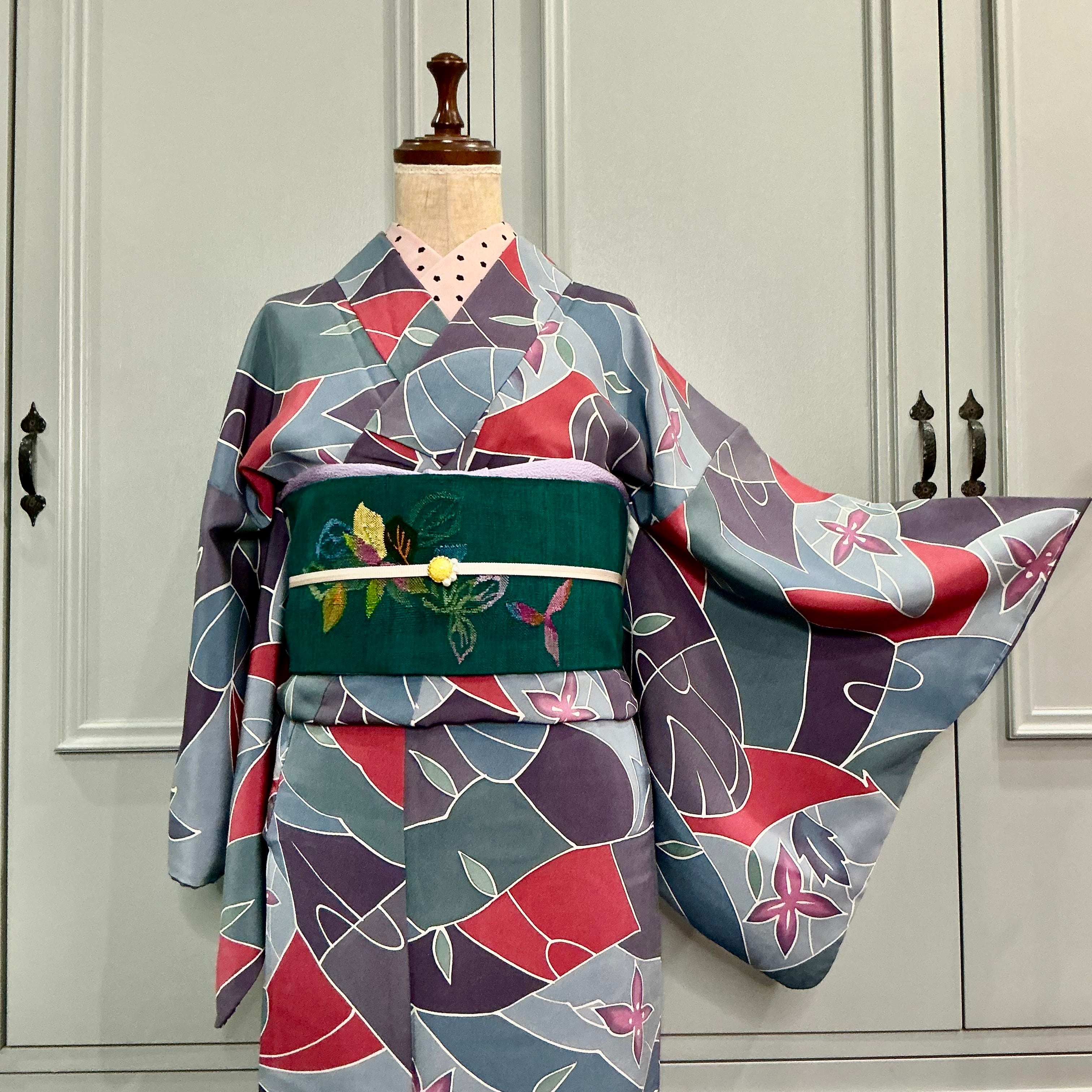 塩瀬のような素材感の正絹地に描かれたアートなデザインはモダンでポップだけれども、明度を抑えたニュアンスカラーがお洒落で目を惹く一着✨
