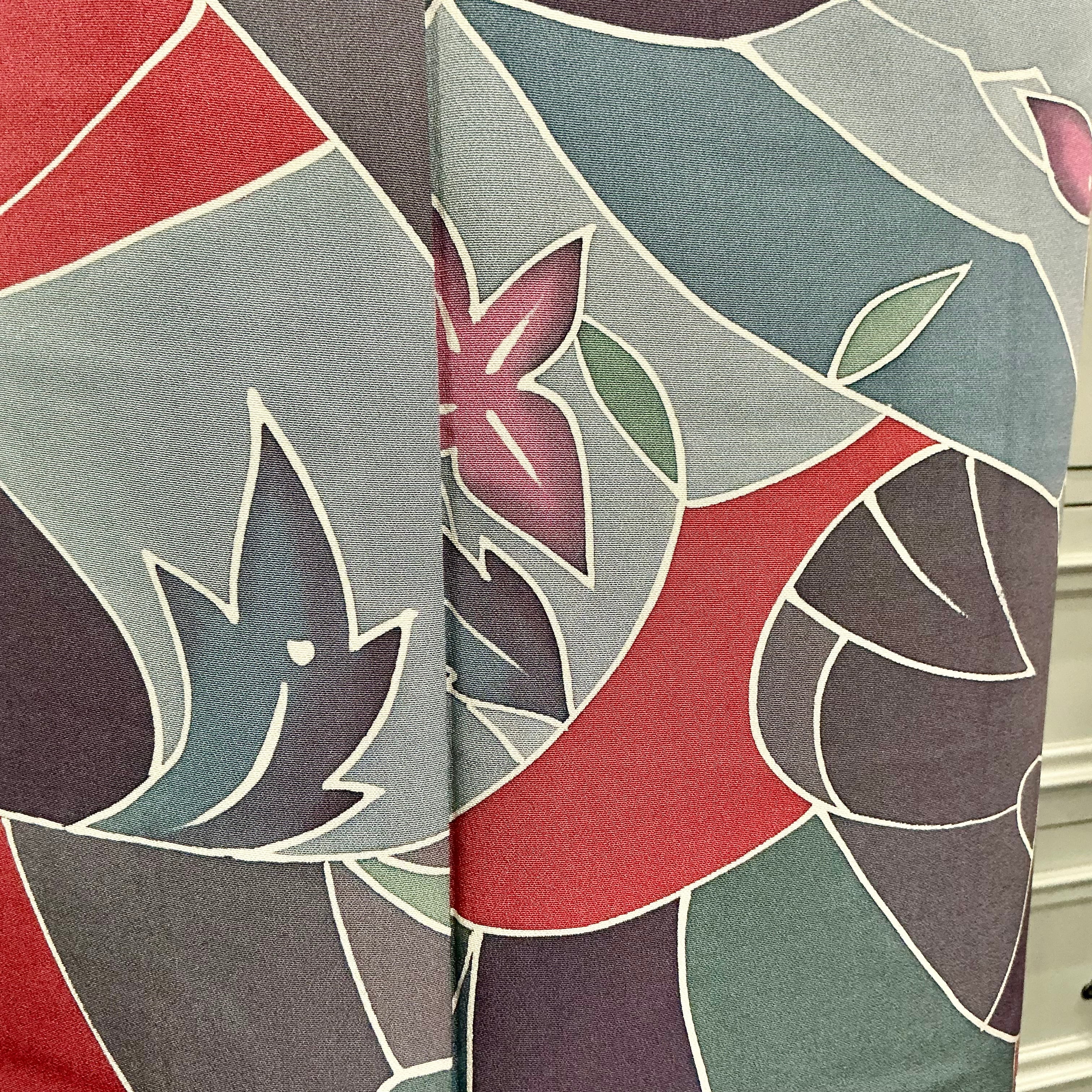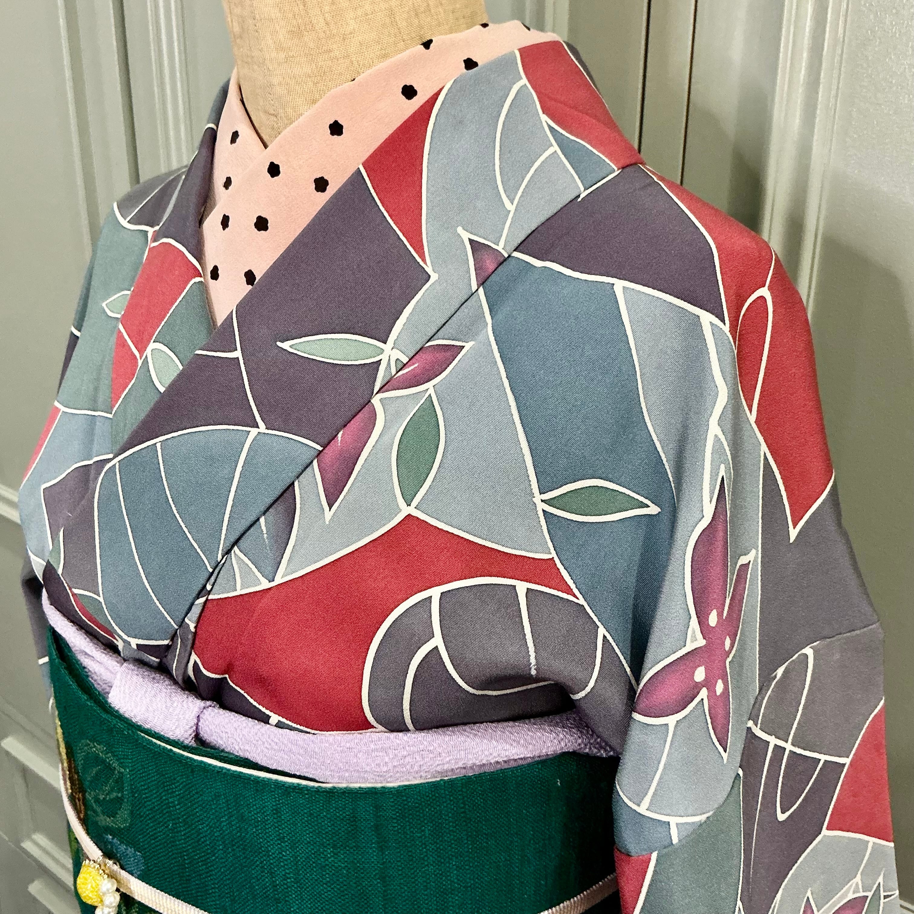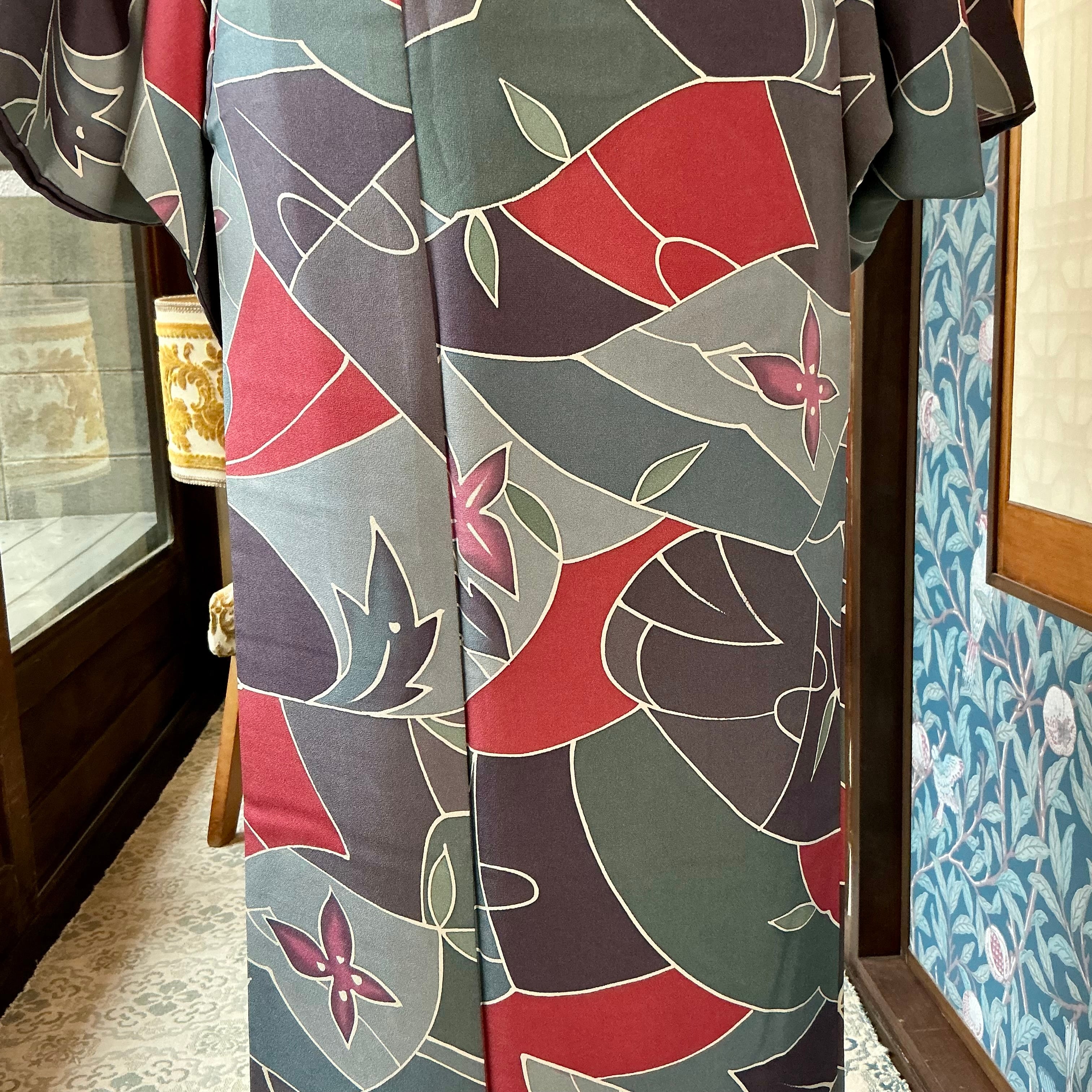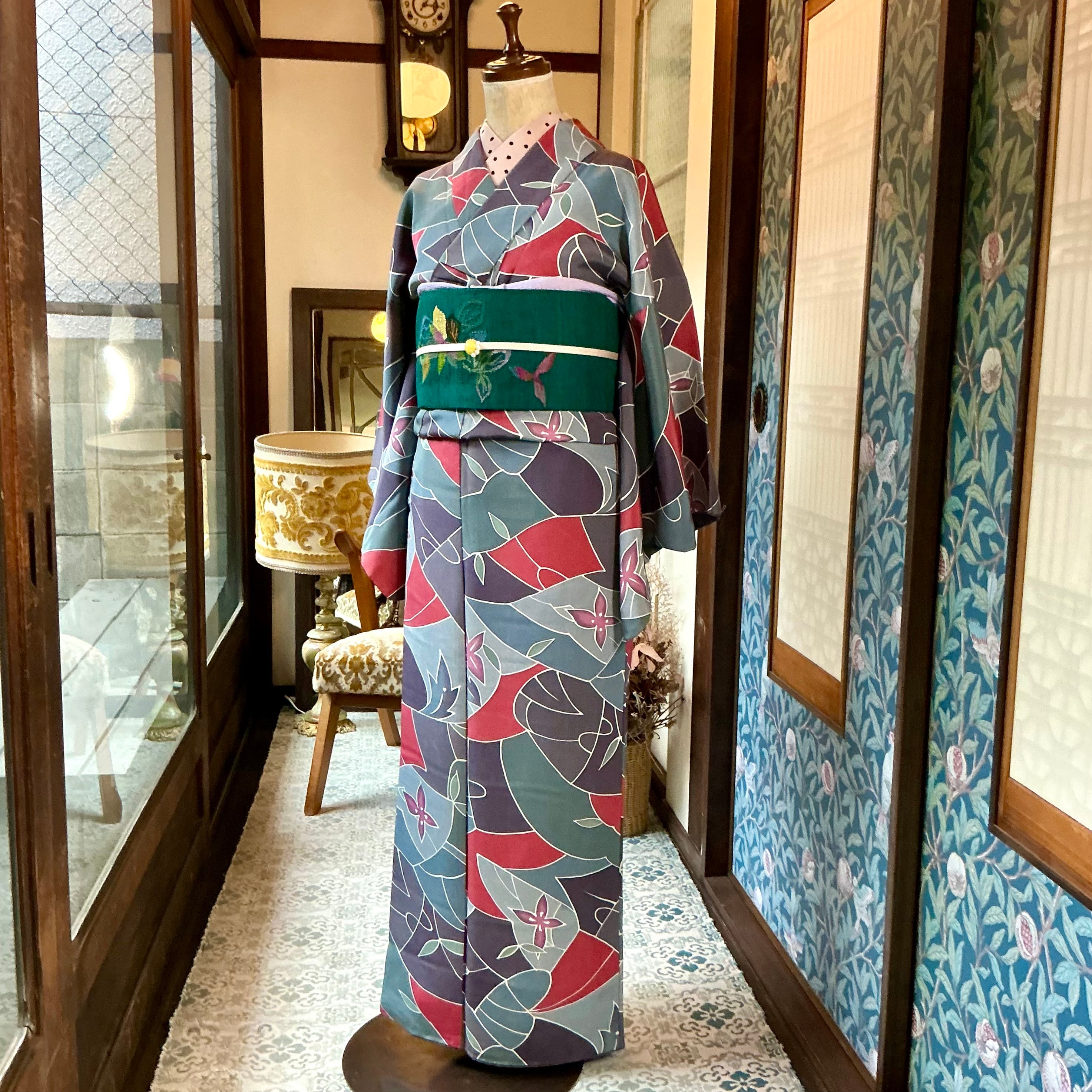 塩瀬のような素材感の正絹地に描かれたアートなデザインはモダンでポップだけれども、明度を抑えたニュアンスカラーがお洒落で目を惹く一着✨