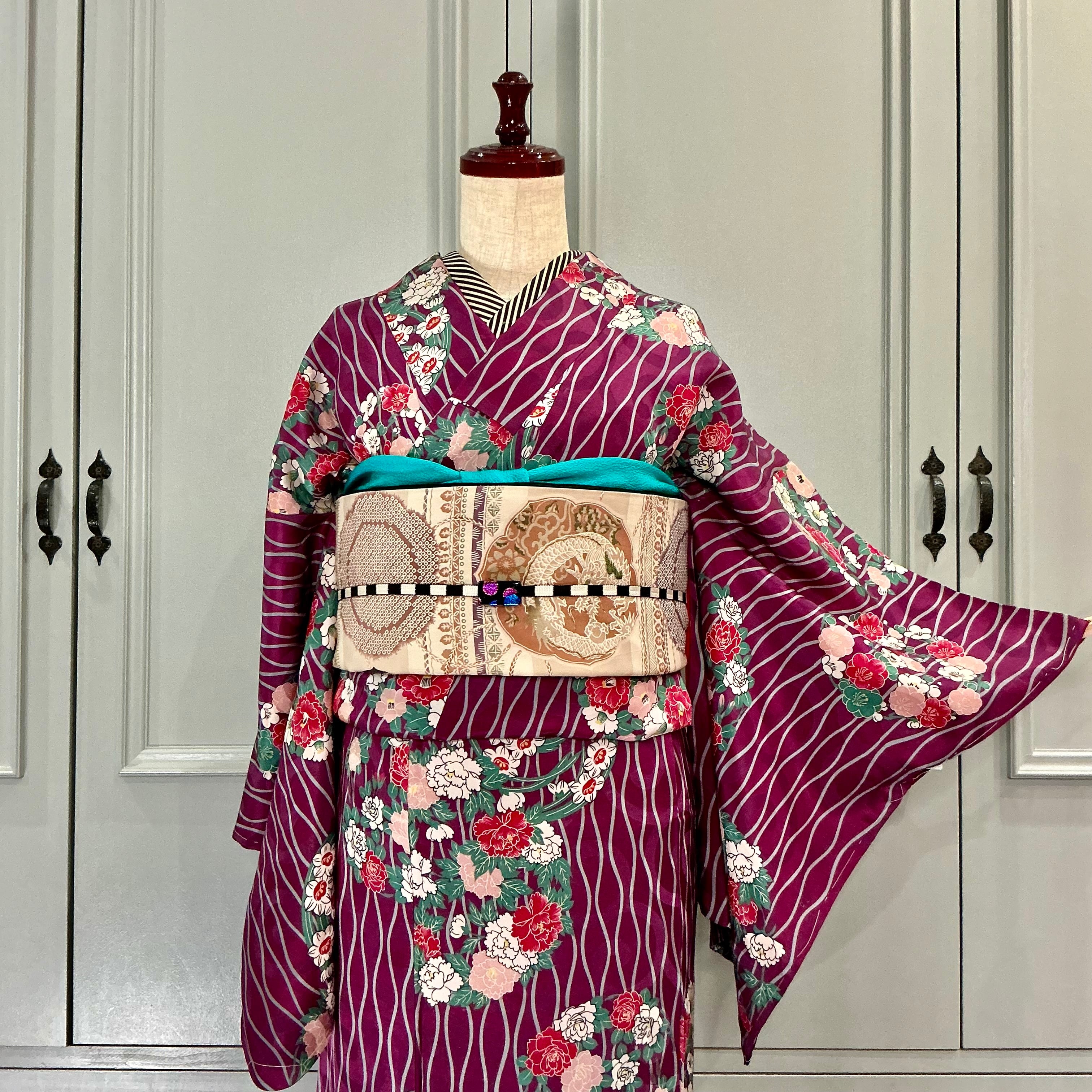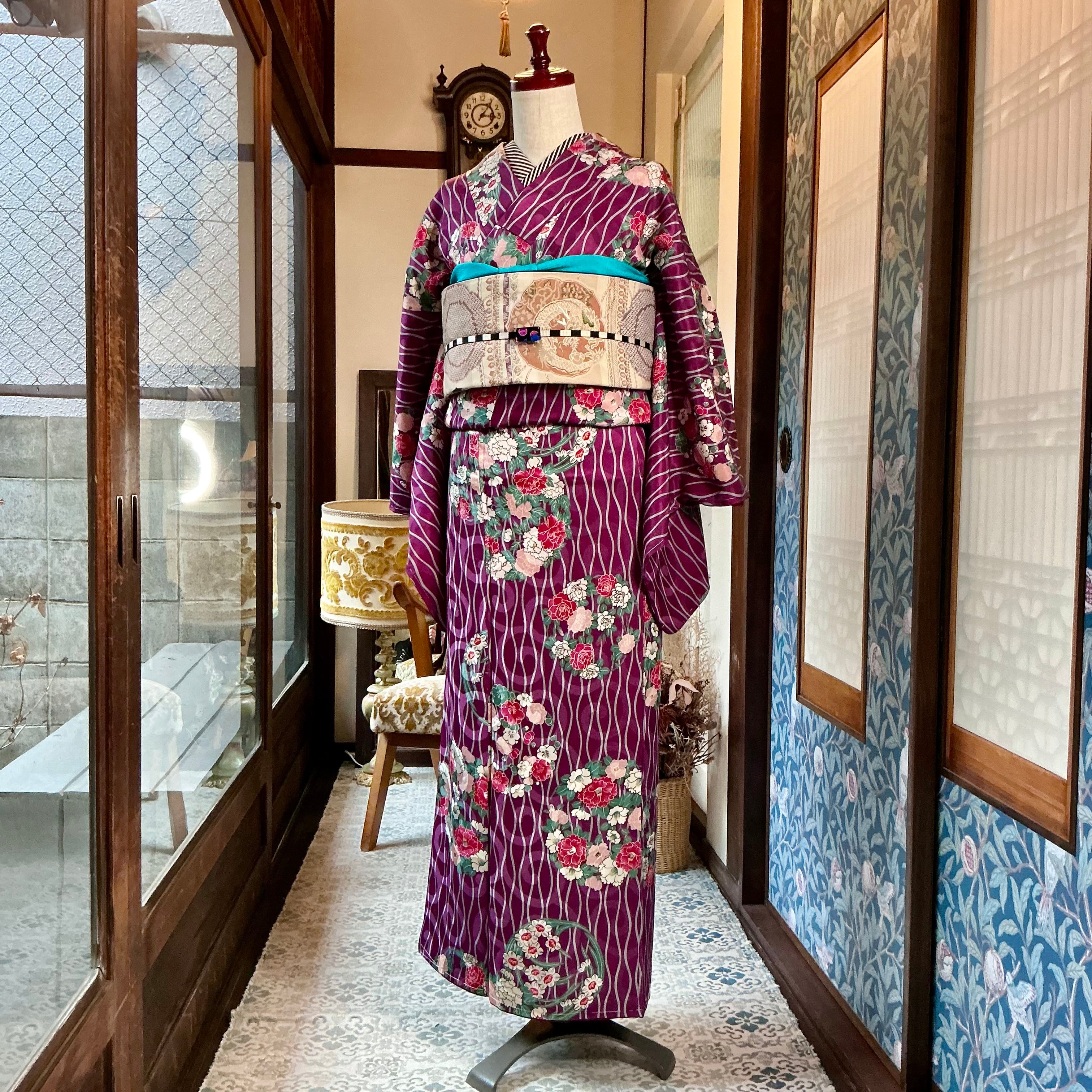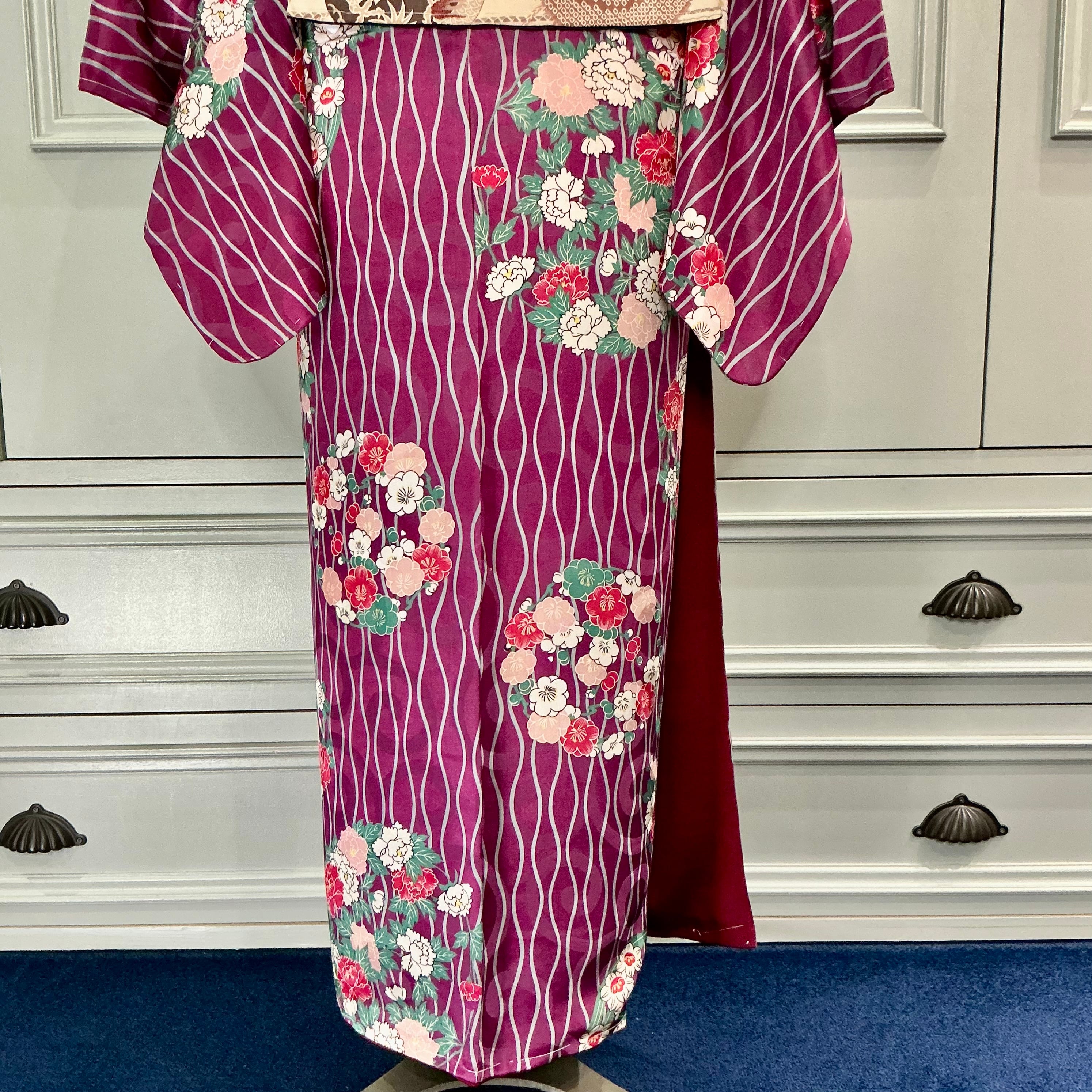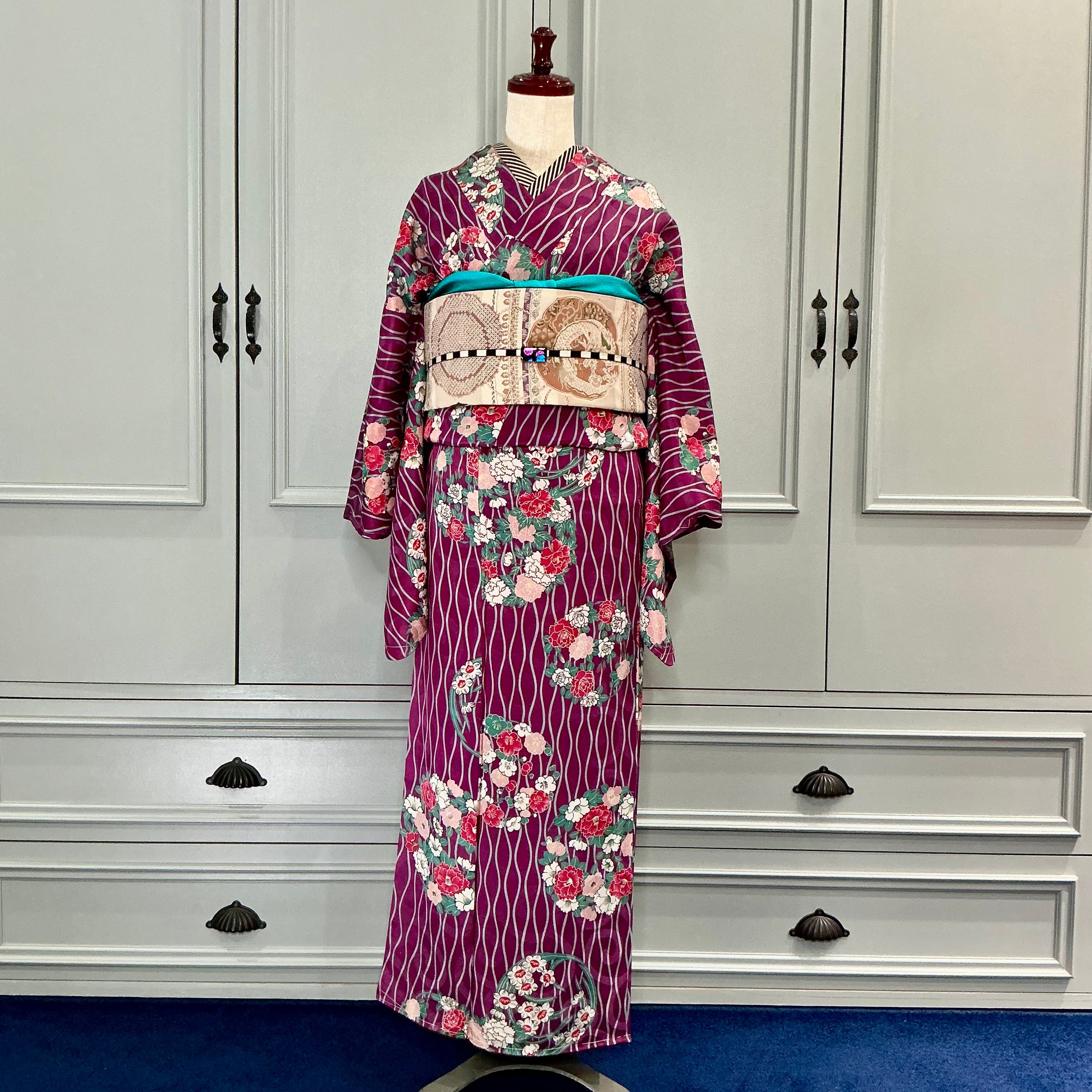 紫紅の波と花しぐれ*花丸 梅 椿 牡丹 水仙 薔薇 花 紫 プラム 立涌 唐草 アンティーク小紋着物 B559