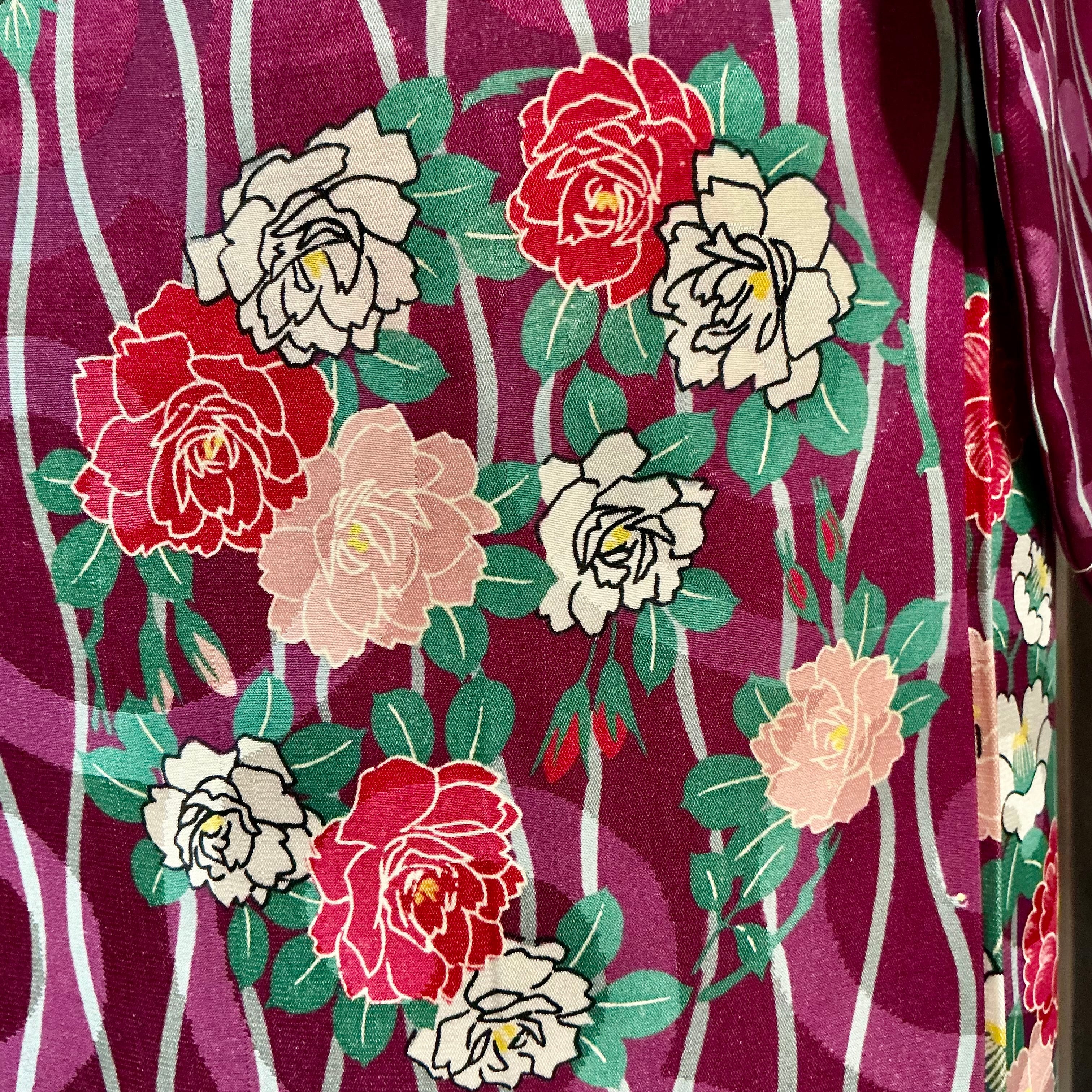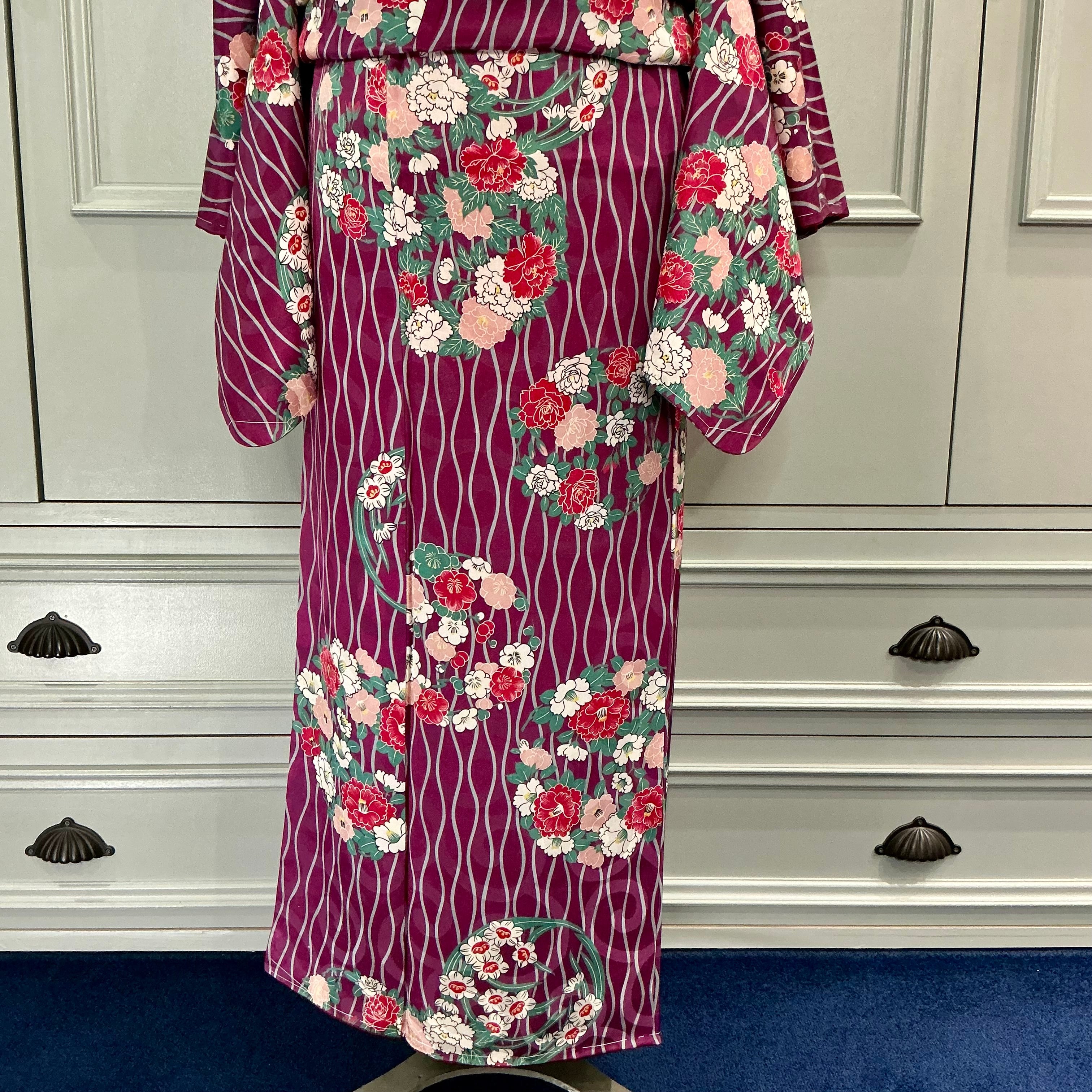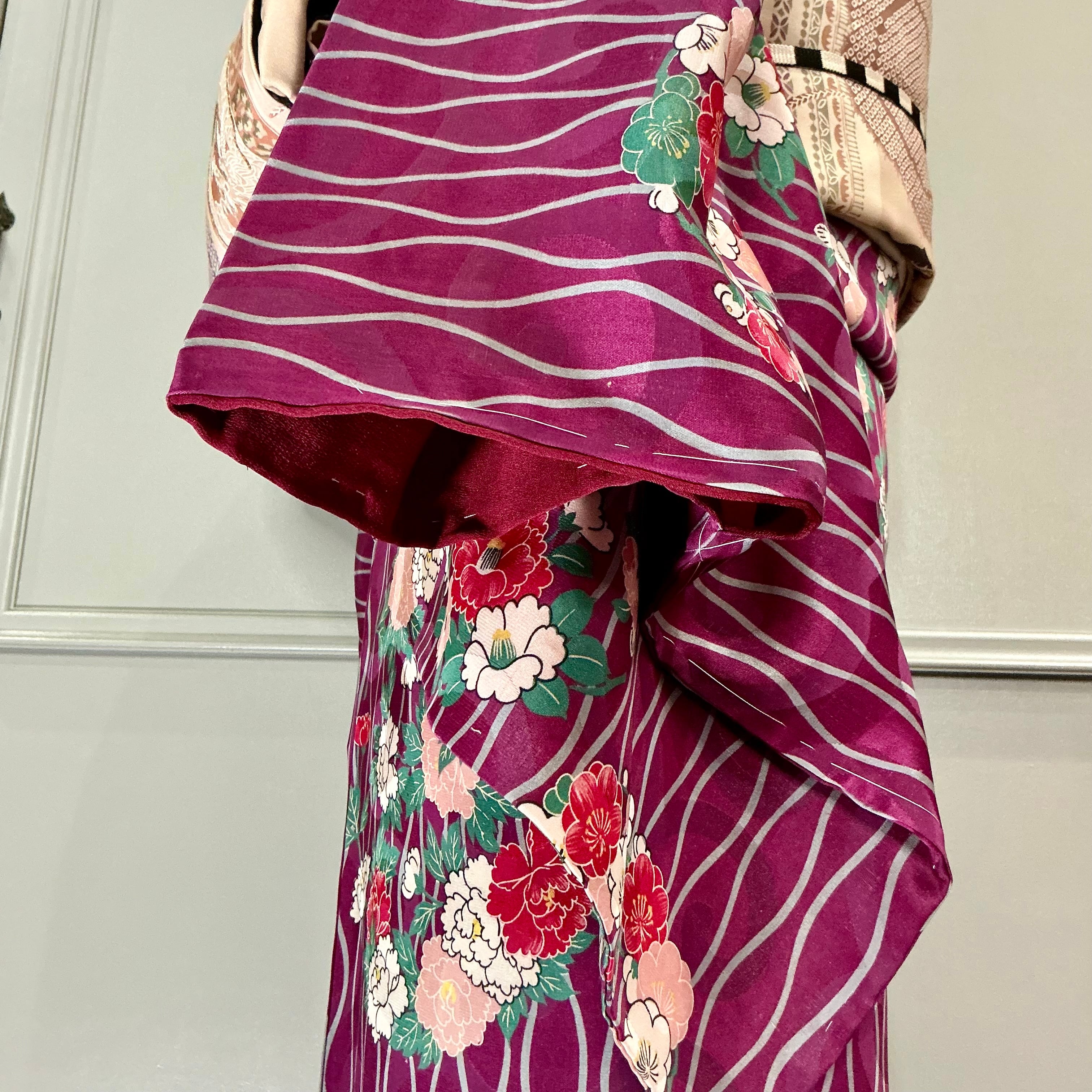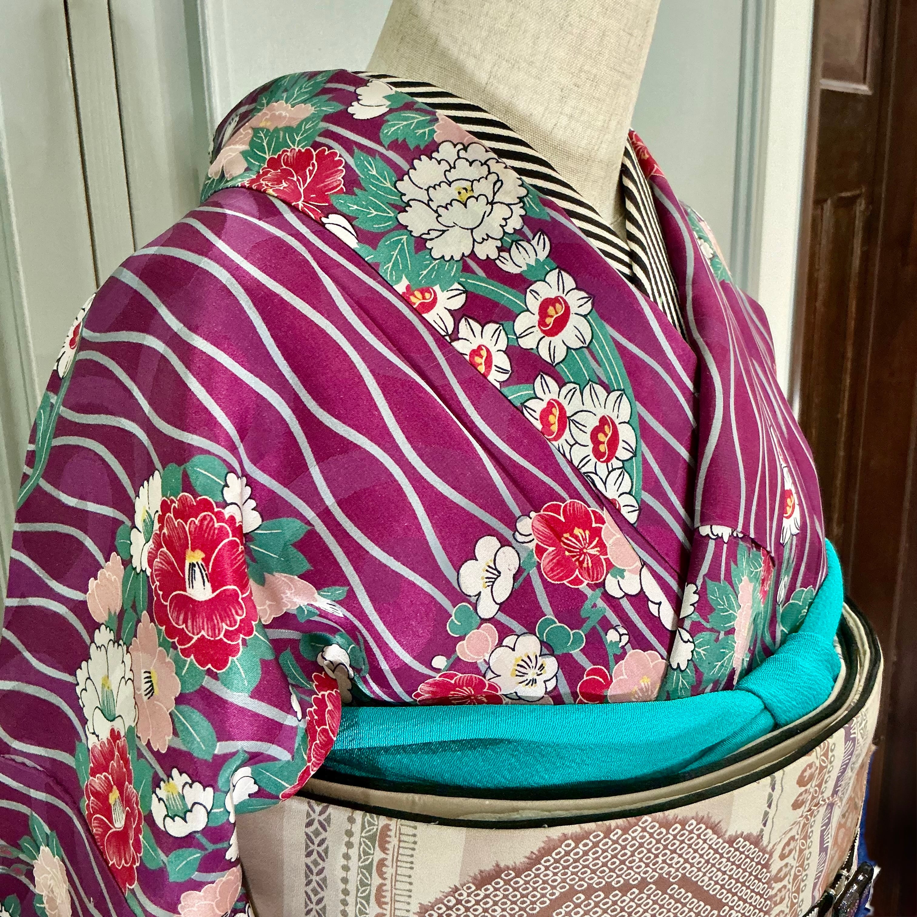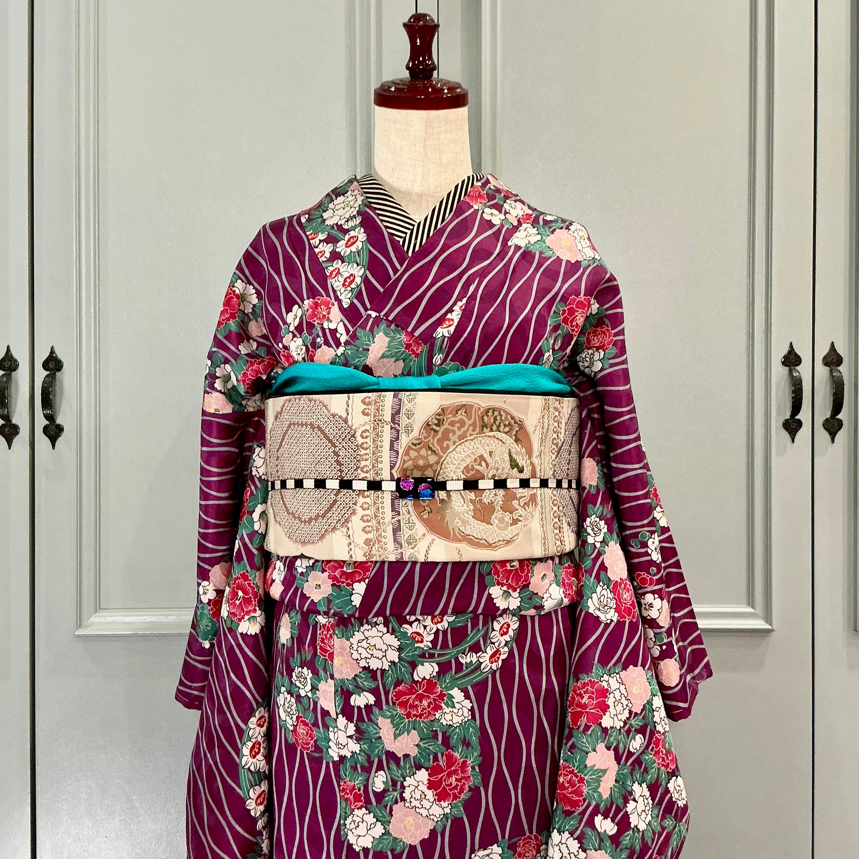 紫紅の波と花しぐれ*花丸 梅 椿 牡丹 水仙 薔薇 花 紫 プラム 立涌 唐草 アンティーク小紋着物 B559
