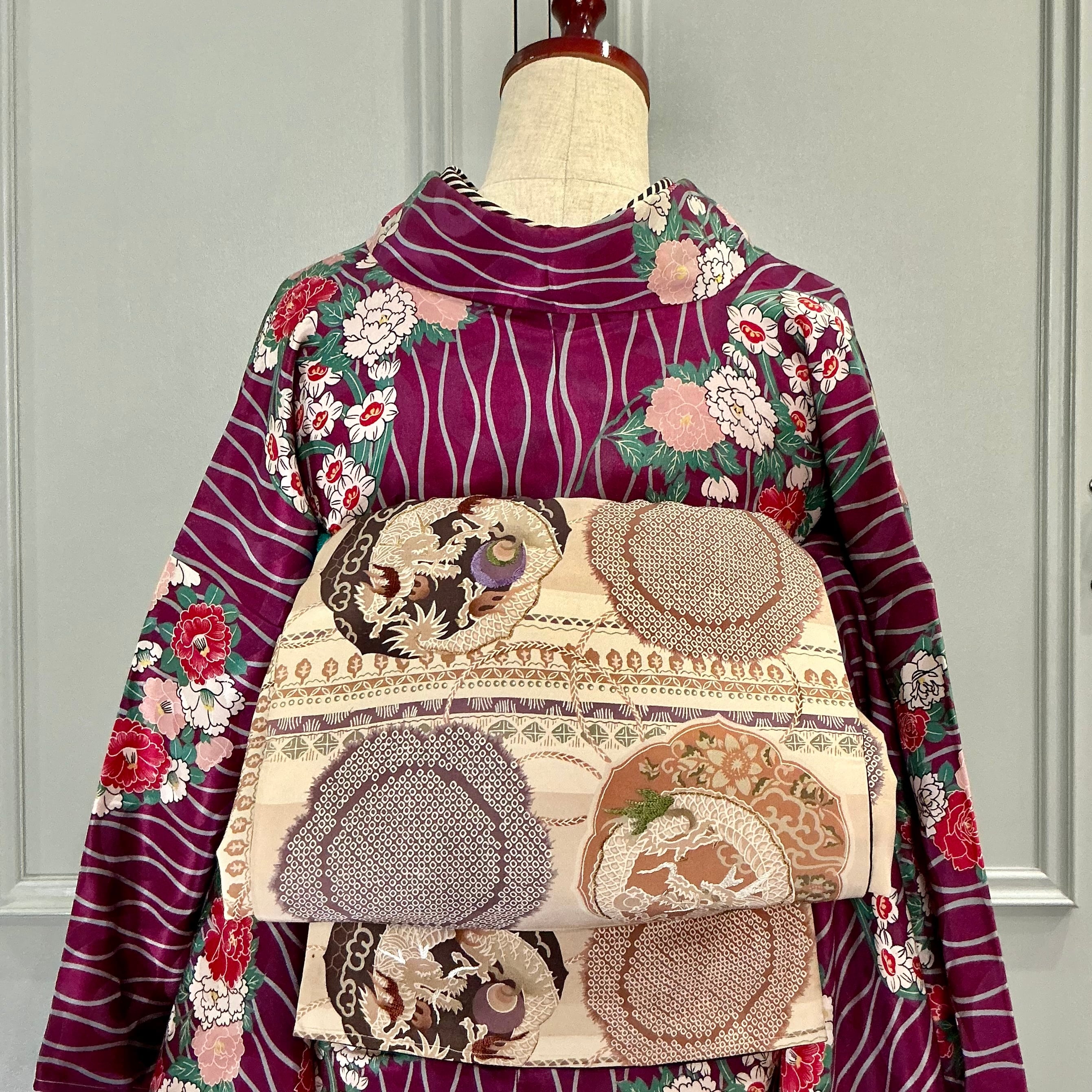 プラム地に、立涌模様と花丸紋が描かれた袷のアンティーク小紋着物です