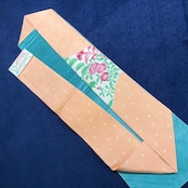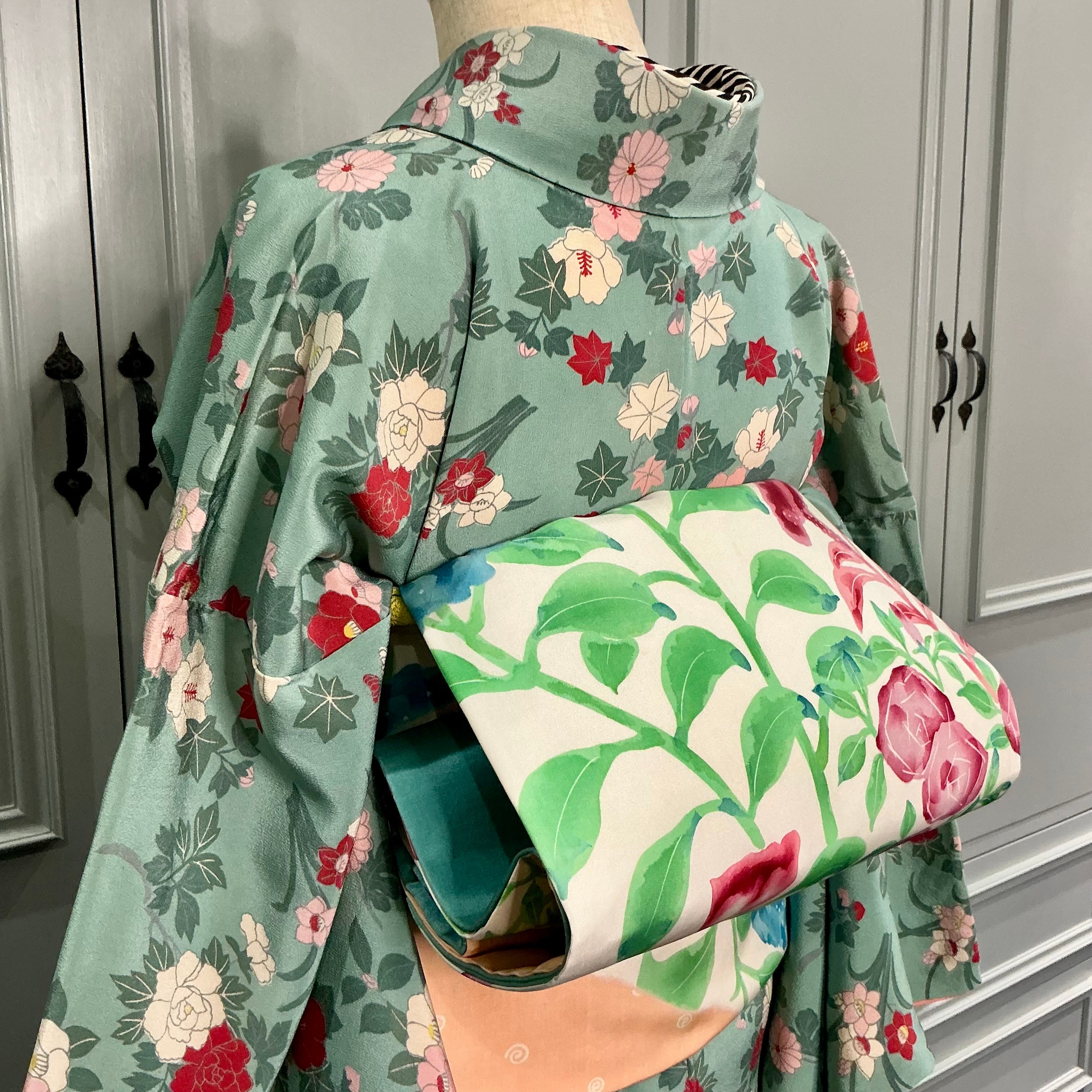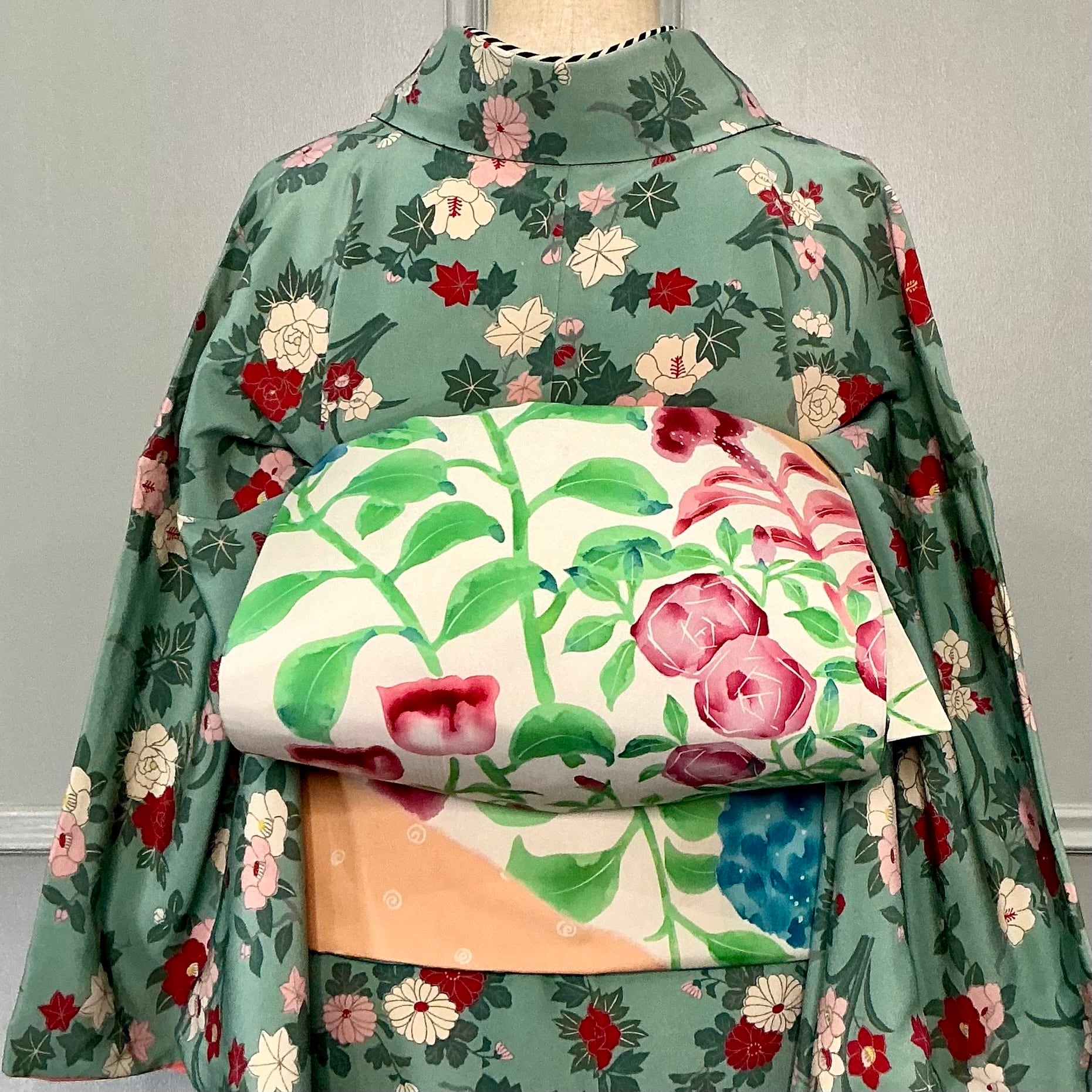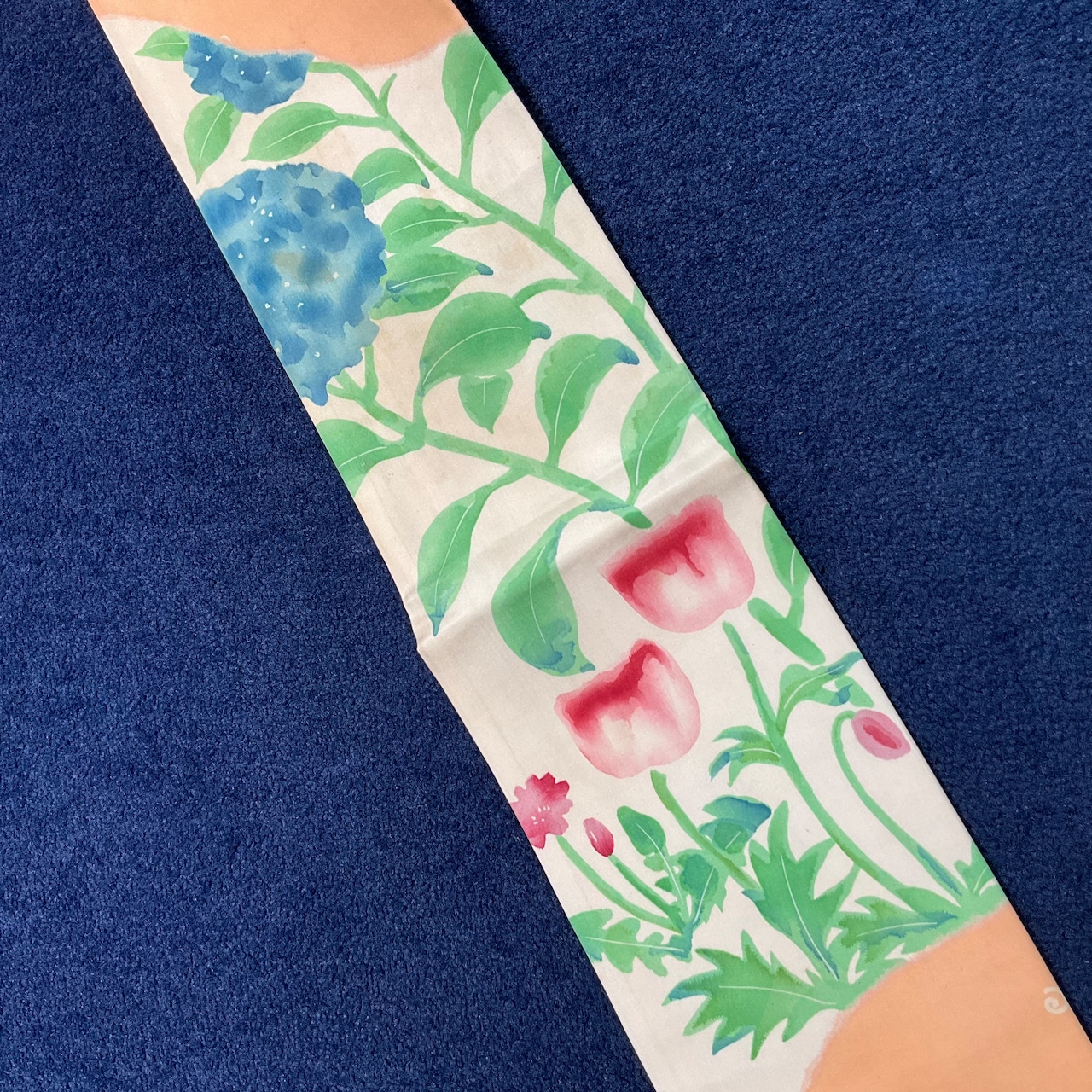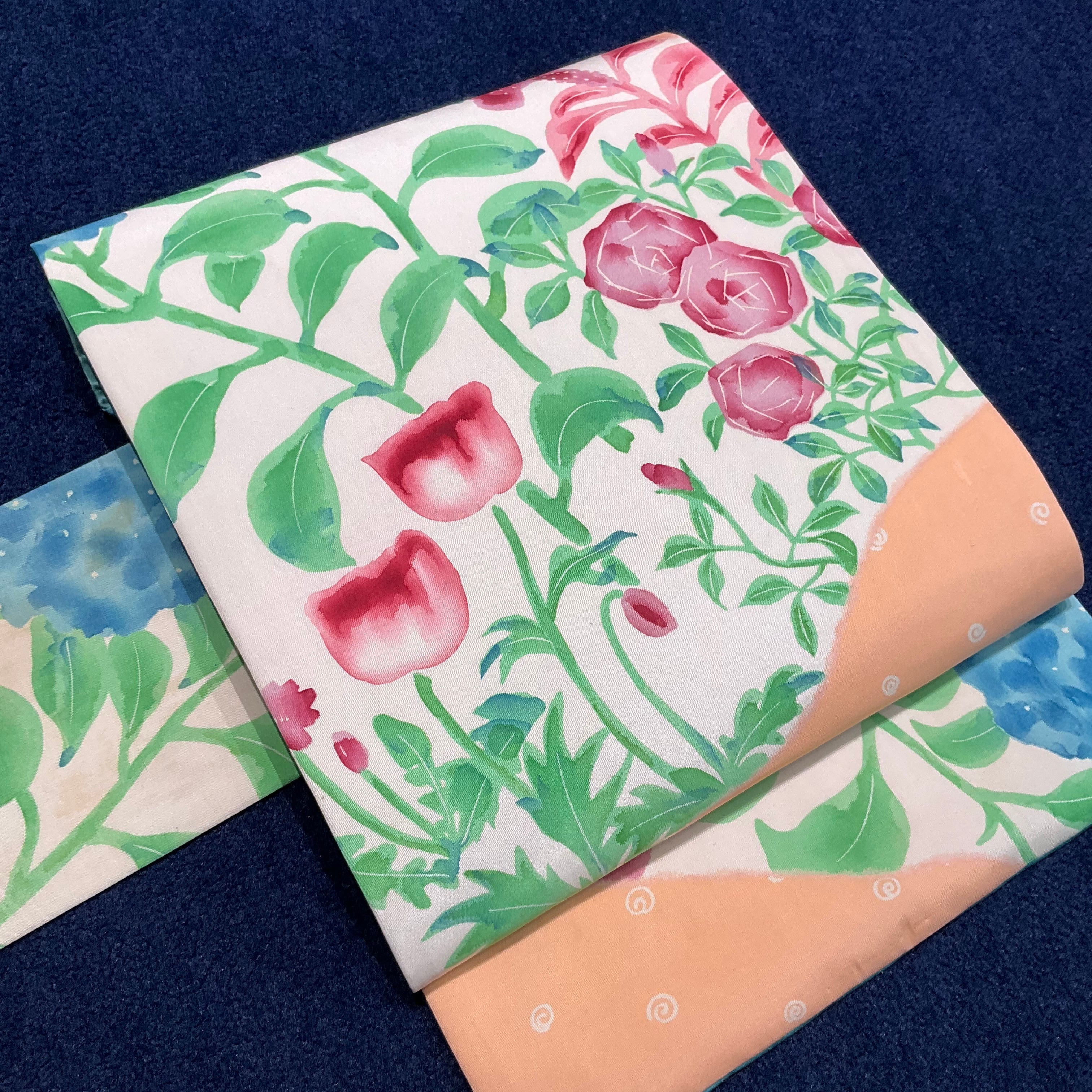 水彩のワルツ*チューリップ 薔薇 鶏頭 紫陽花 サーモンピンク 染め帯 アンティーク名古屋帯 B565