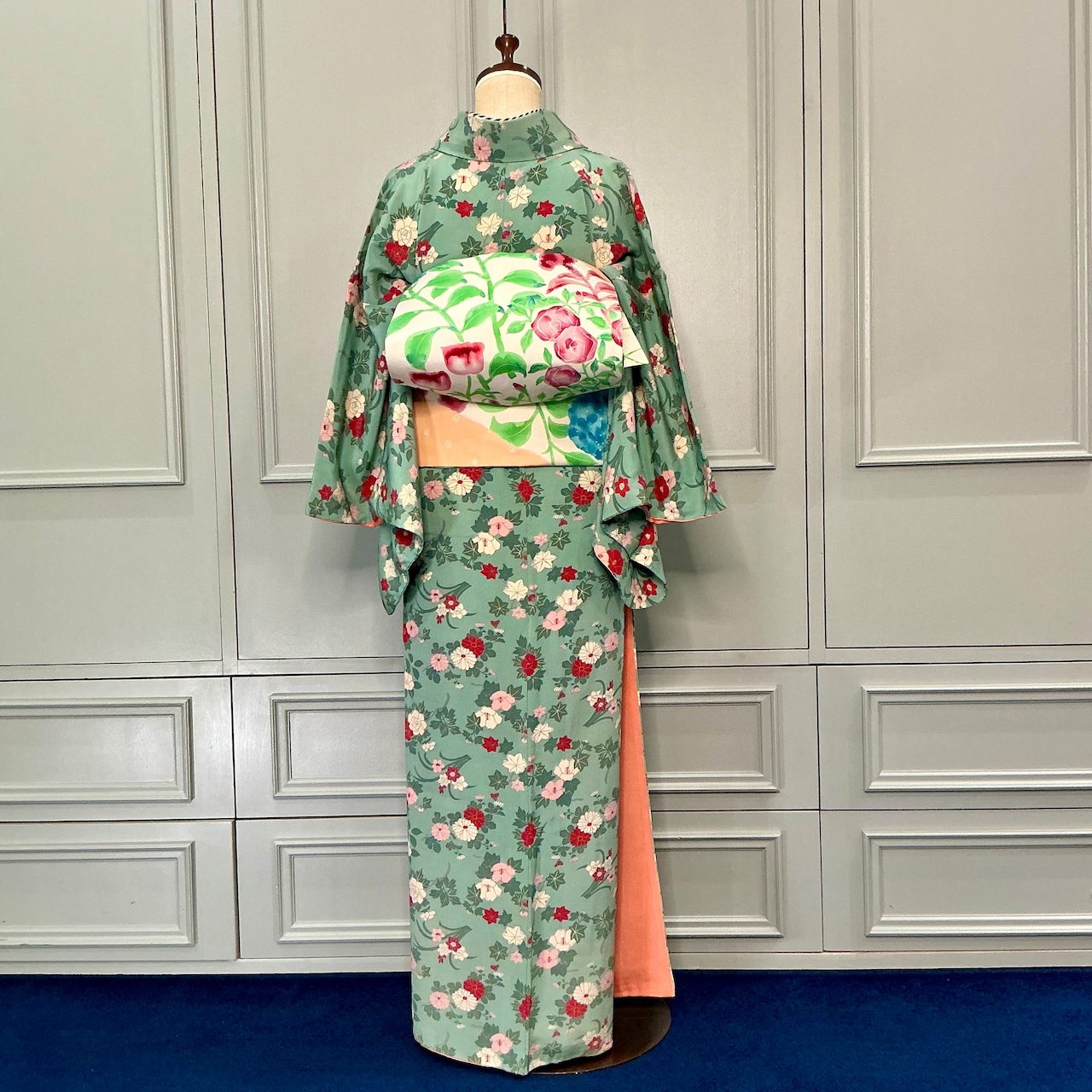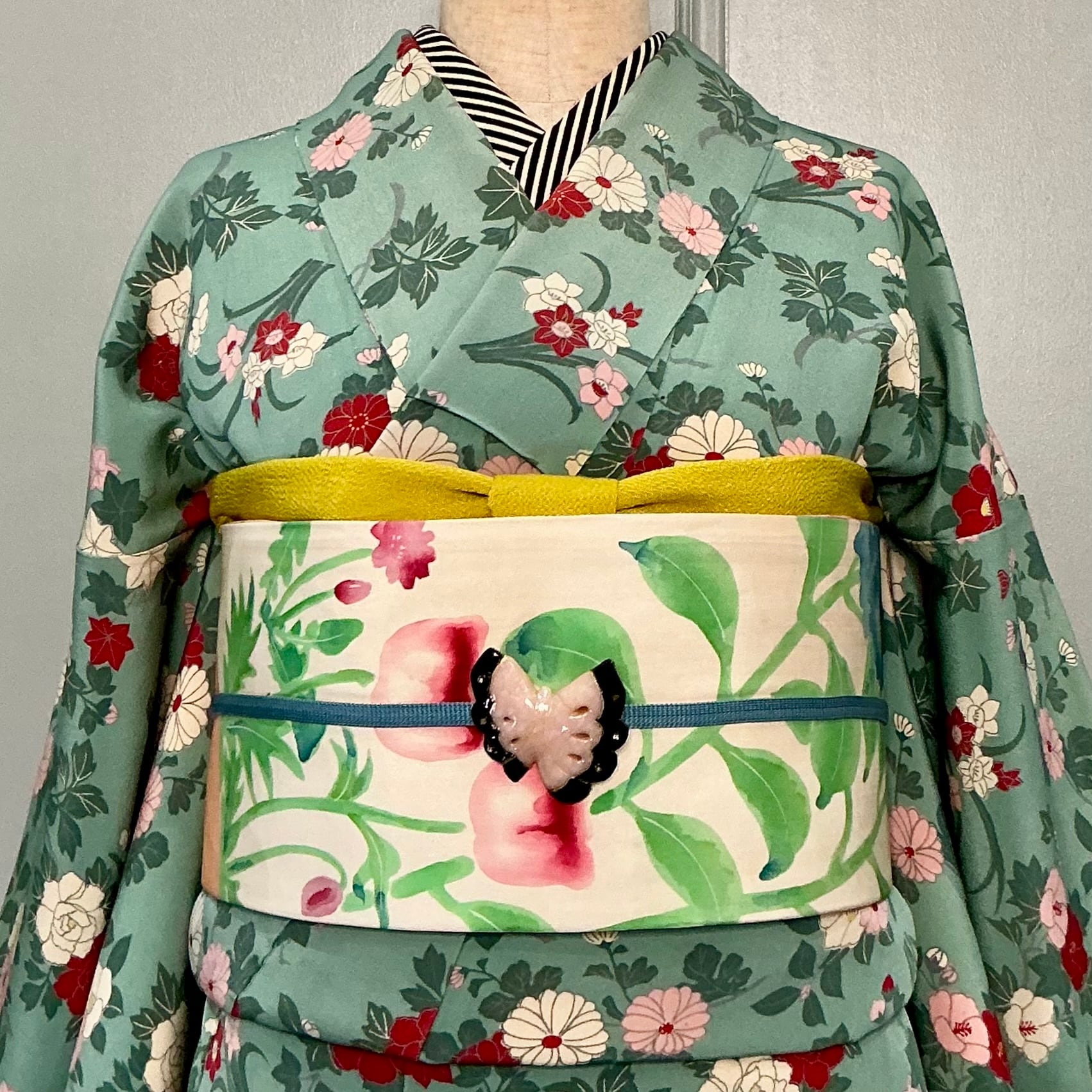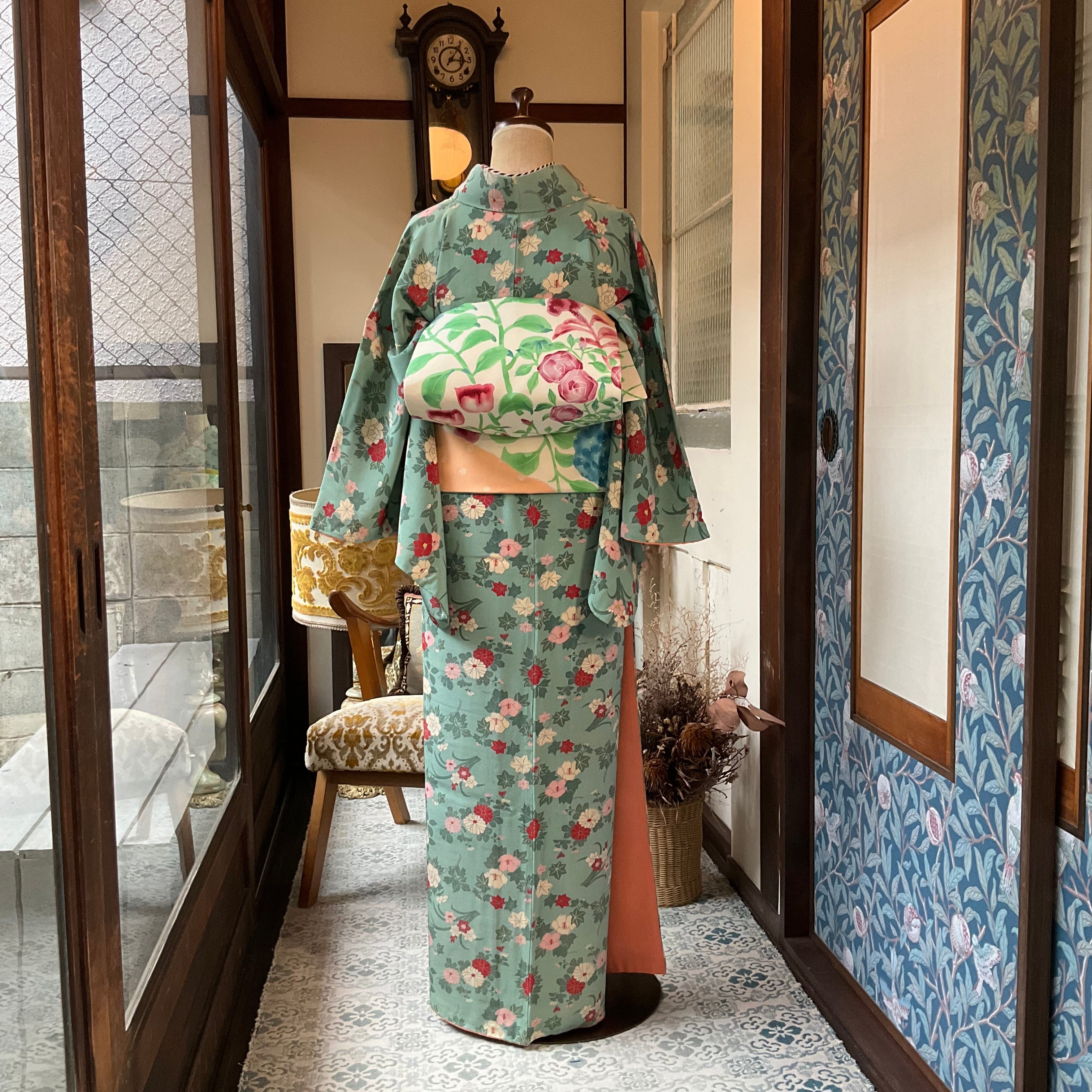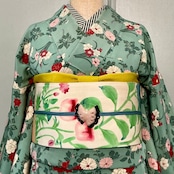 ○合わせたアンティーク小紋着物、オリジナル帯揚げライムグリーン、オリジナル三分紐ラインアプリコット×アッシュターコイズもwebshop掲載品です♪